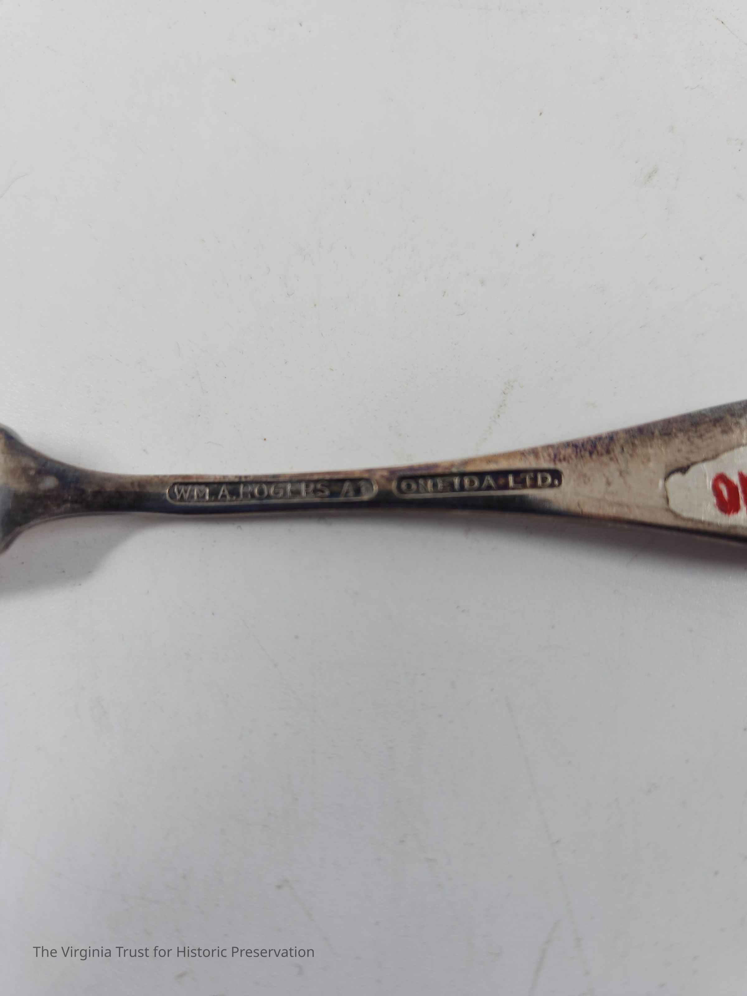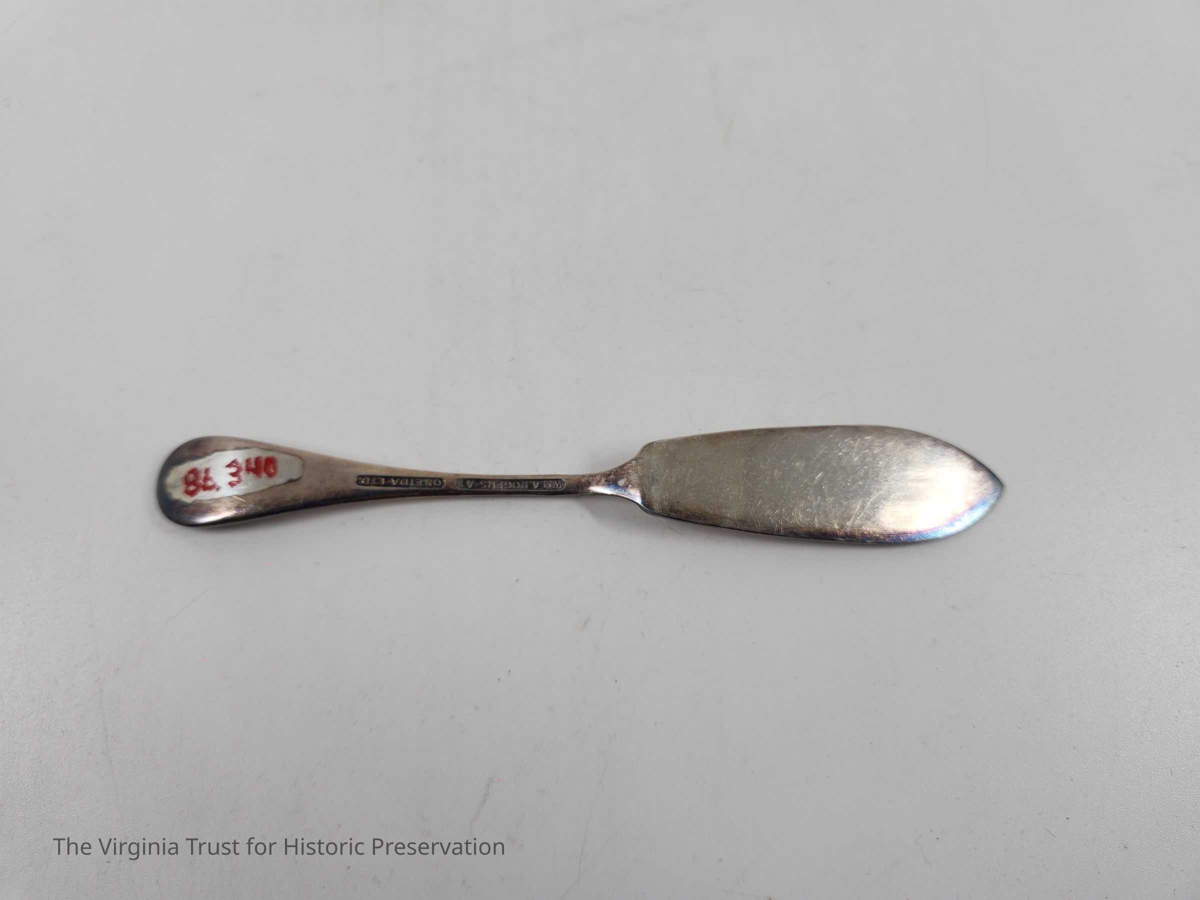 Part of set of two small silver plated butter knives. Flat handle butter spreader with shell pattern on handle. Marked on reverse "W.M.A ROGERS A1" "ONEIDA LTD."