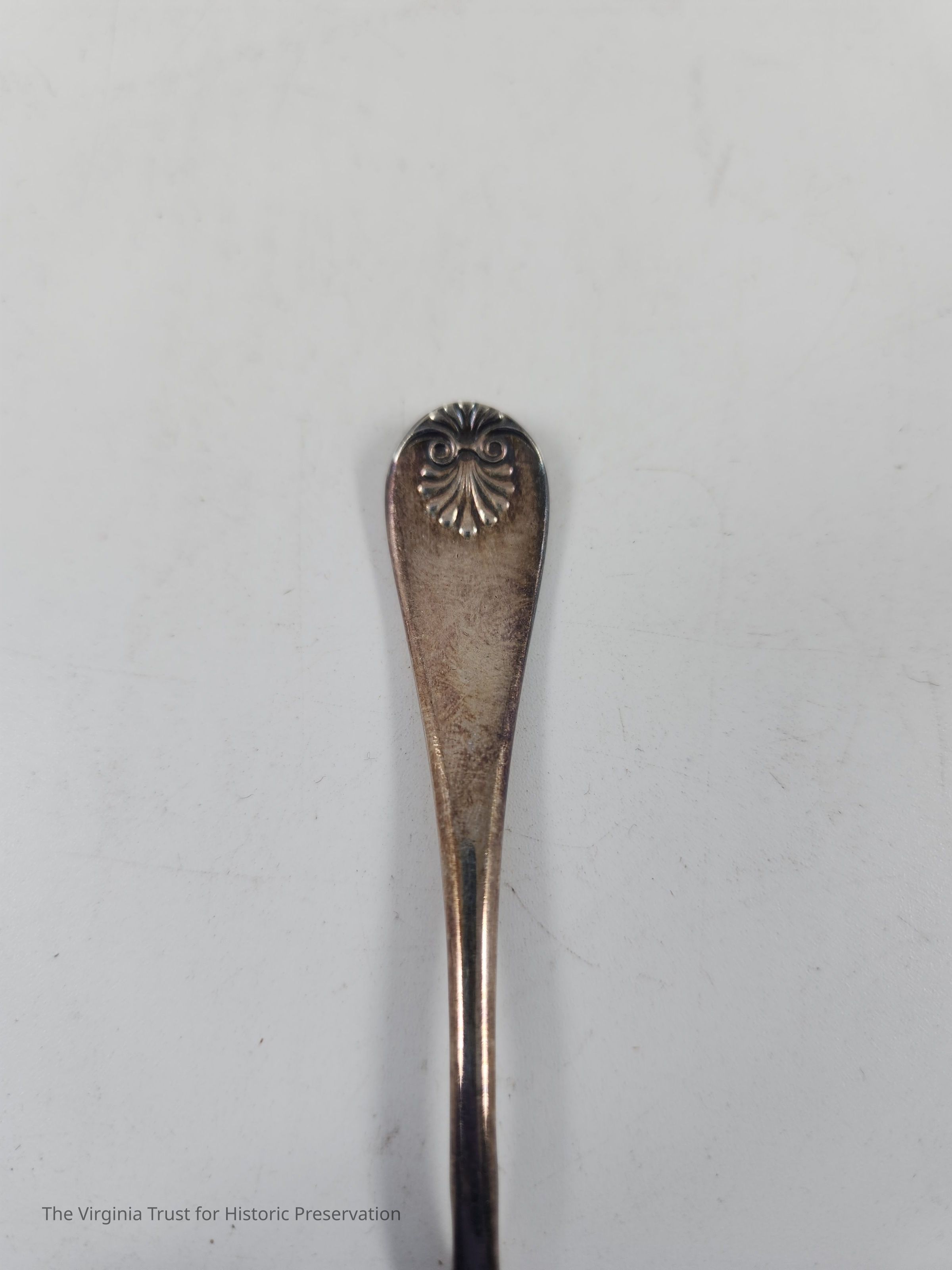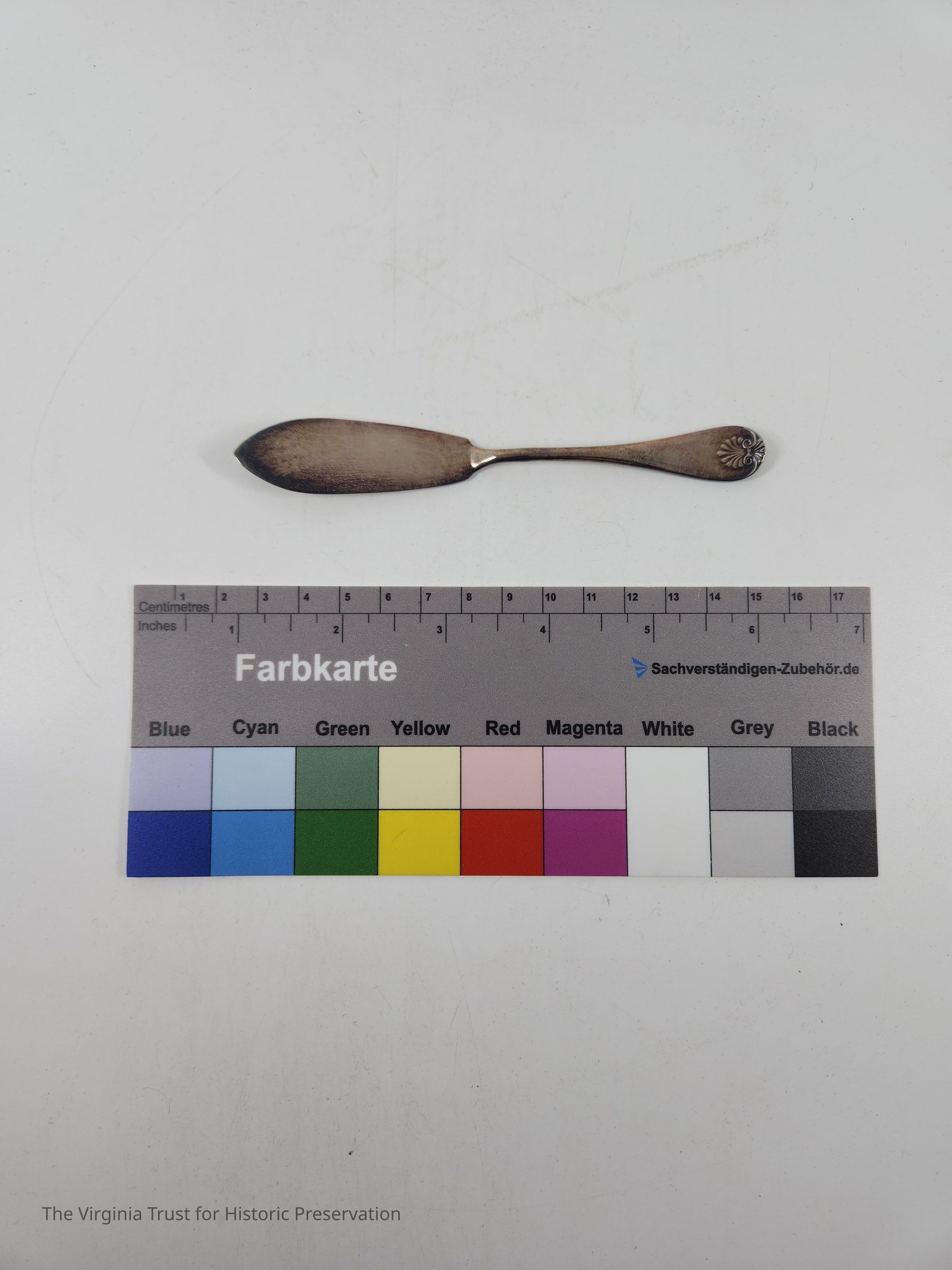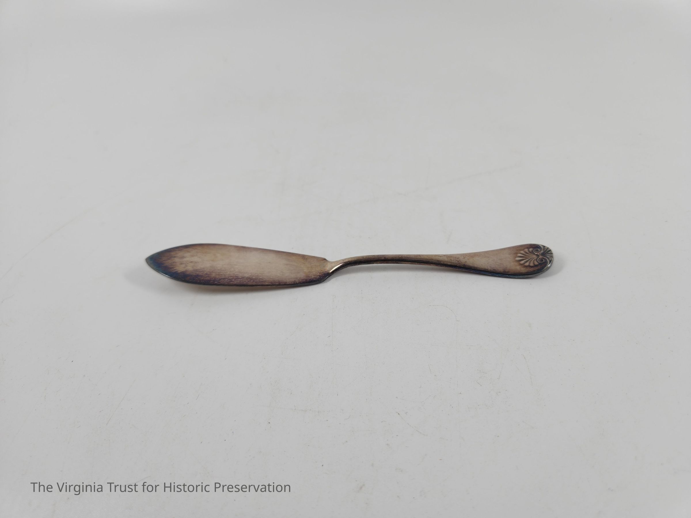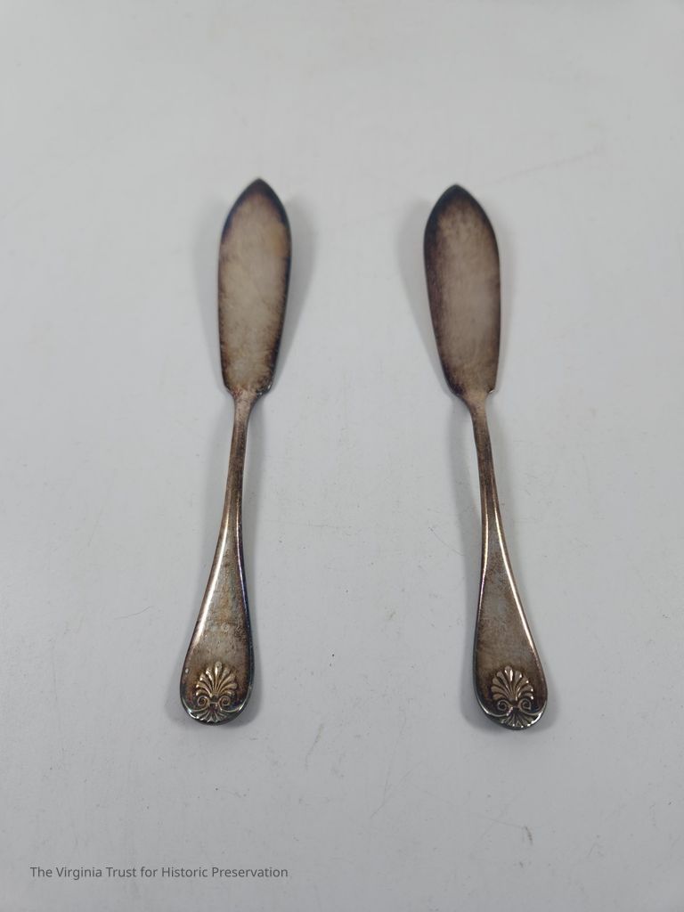 One of two silver butter knives with shell pattern on handle