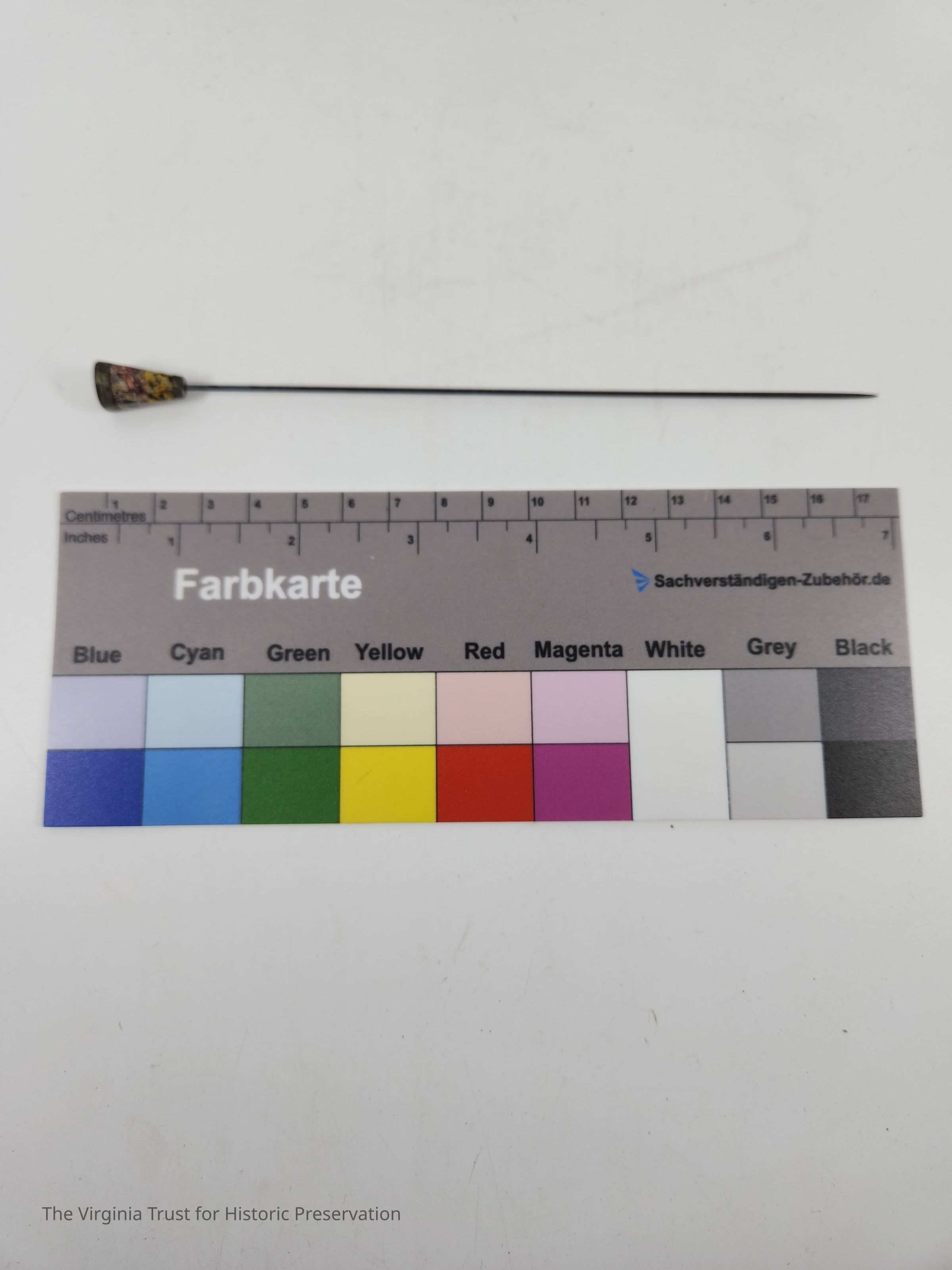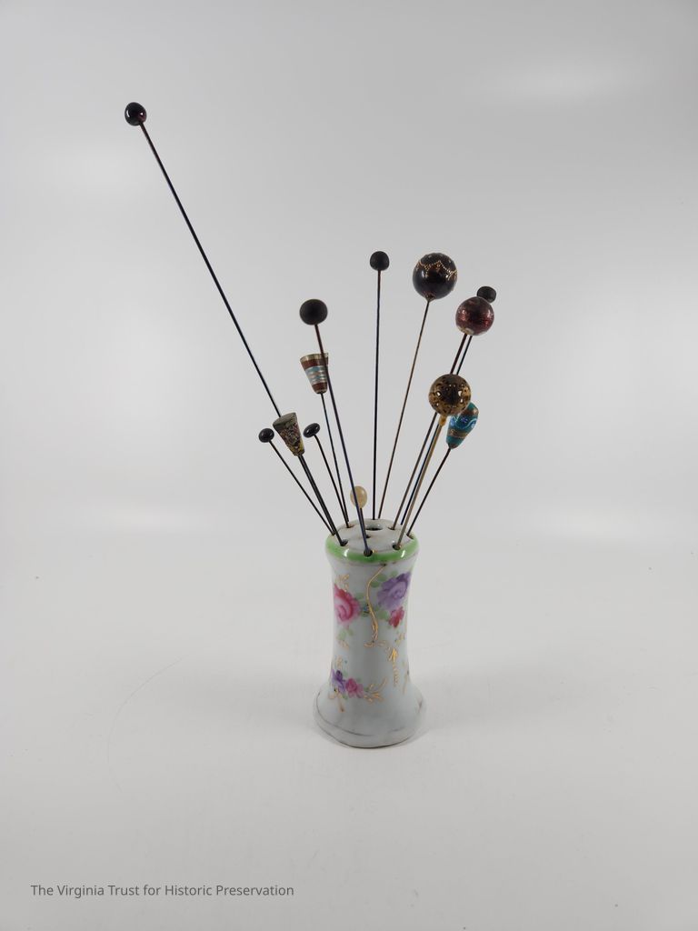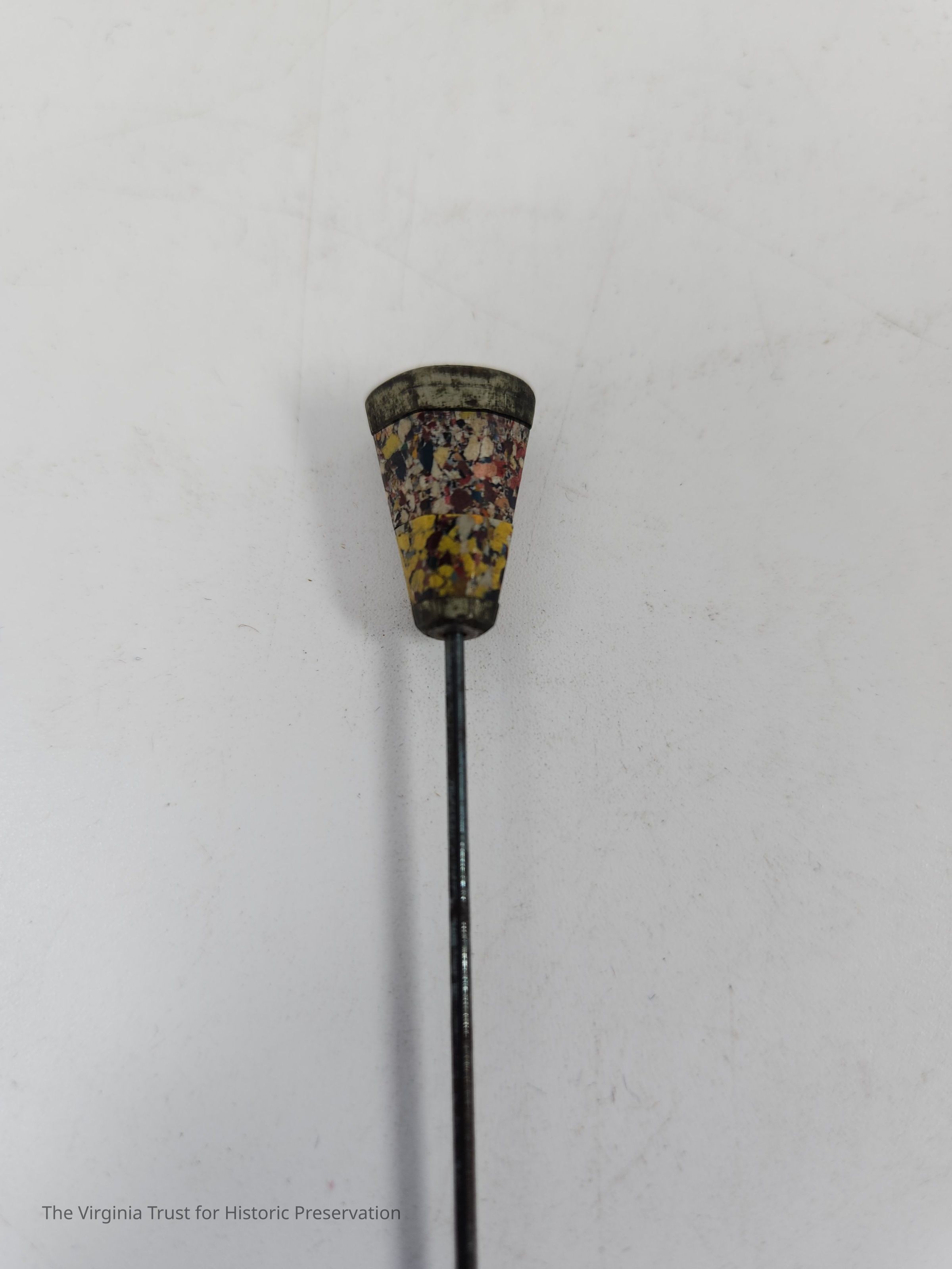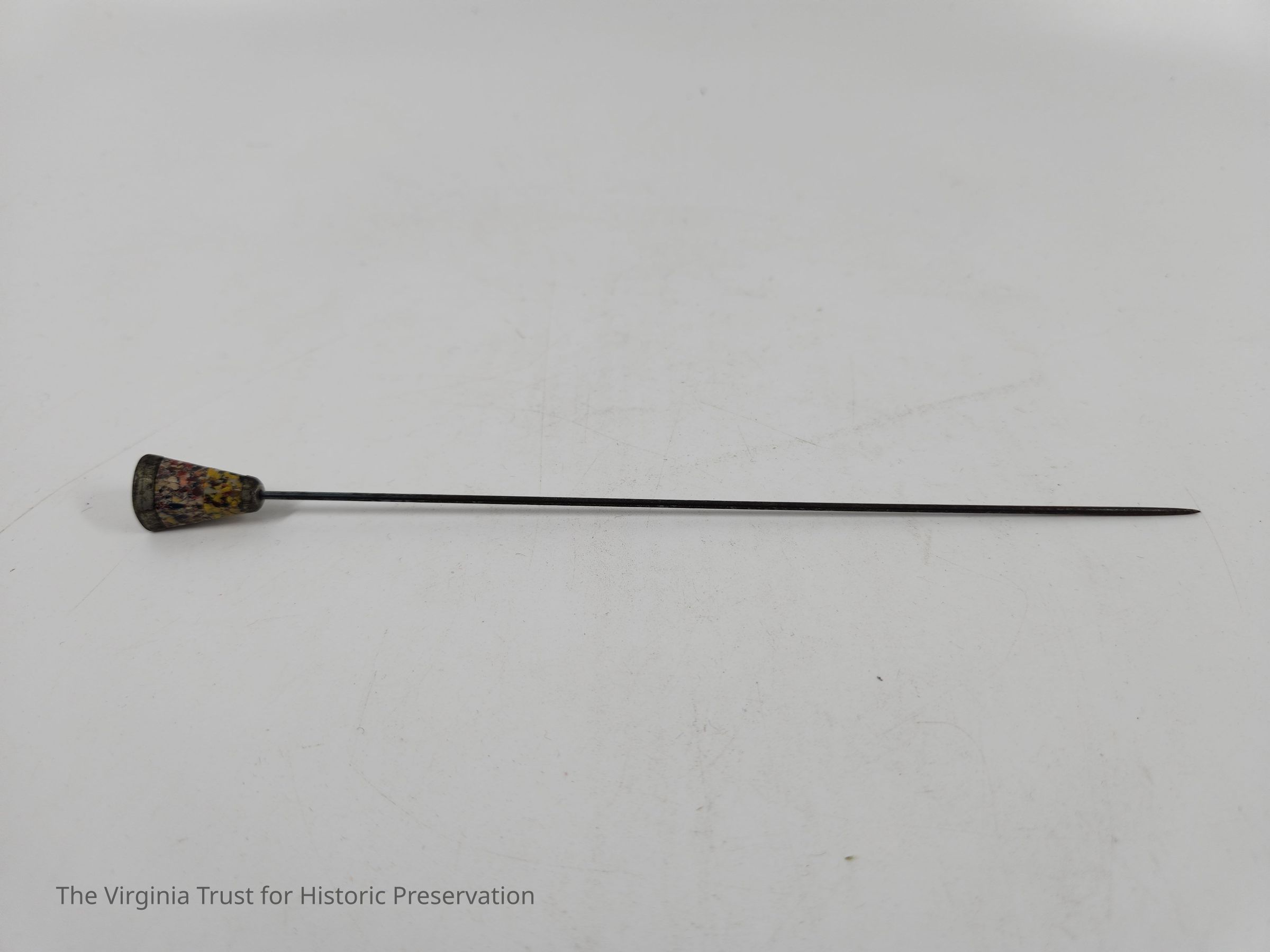 Multicolored patterned hatpin with gold top and metal pin. One of a set of thirteen hat pins of assorted sizes and heads.Dimensions