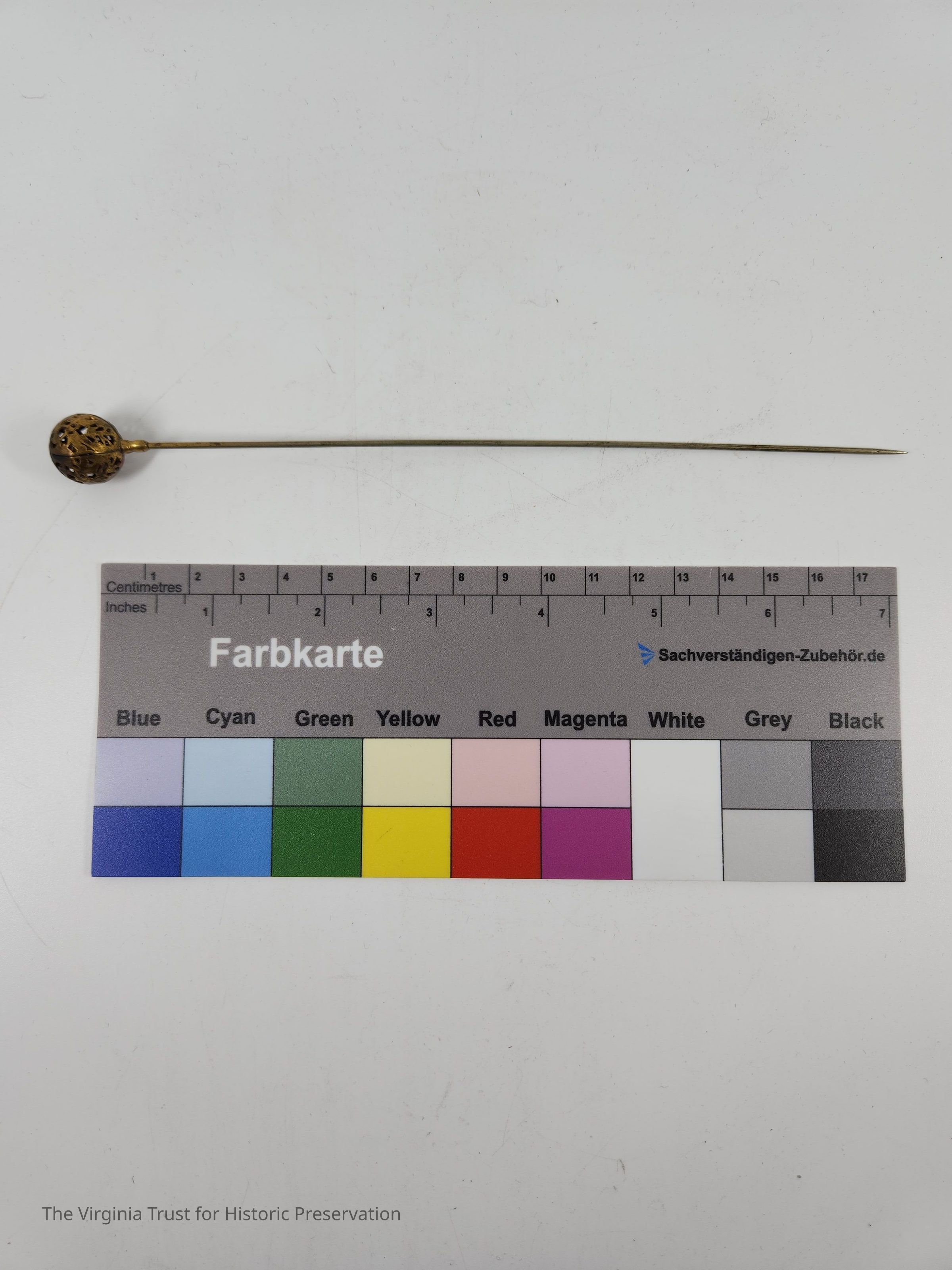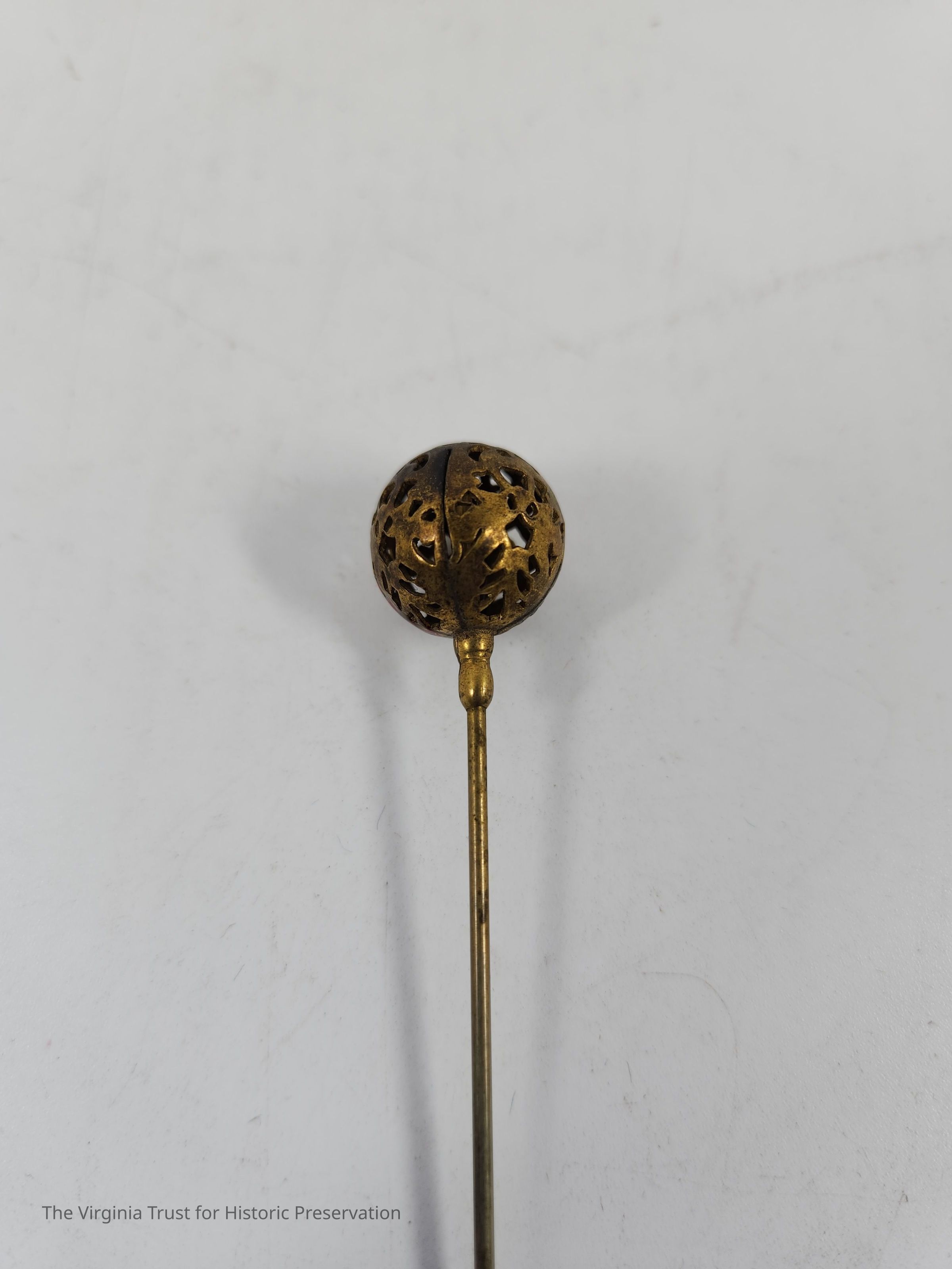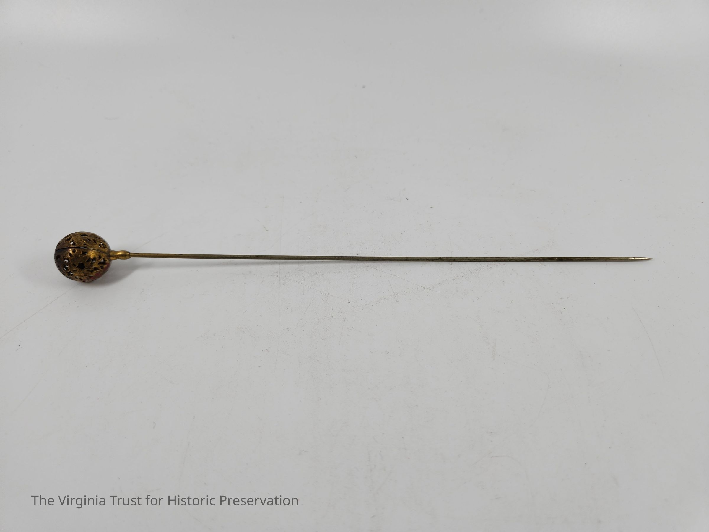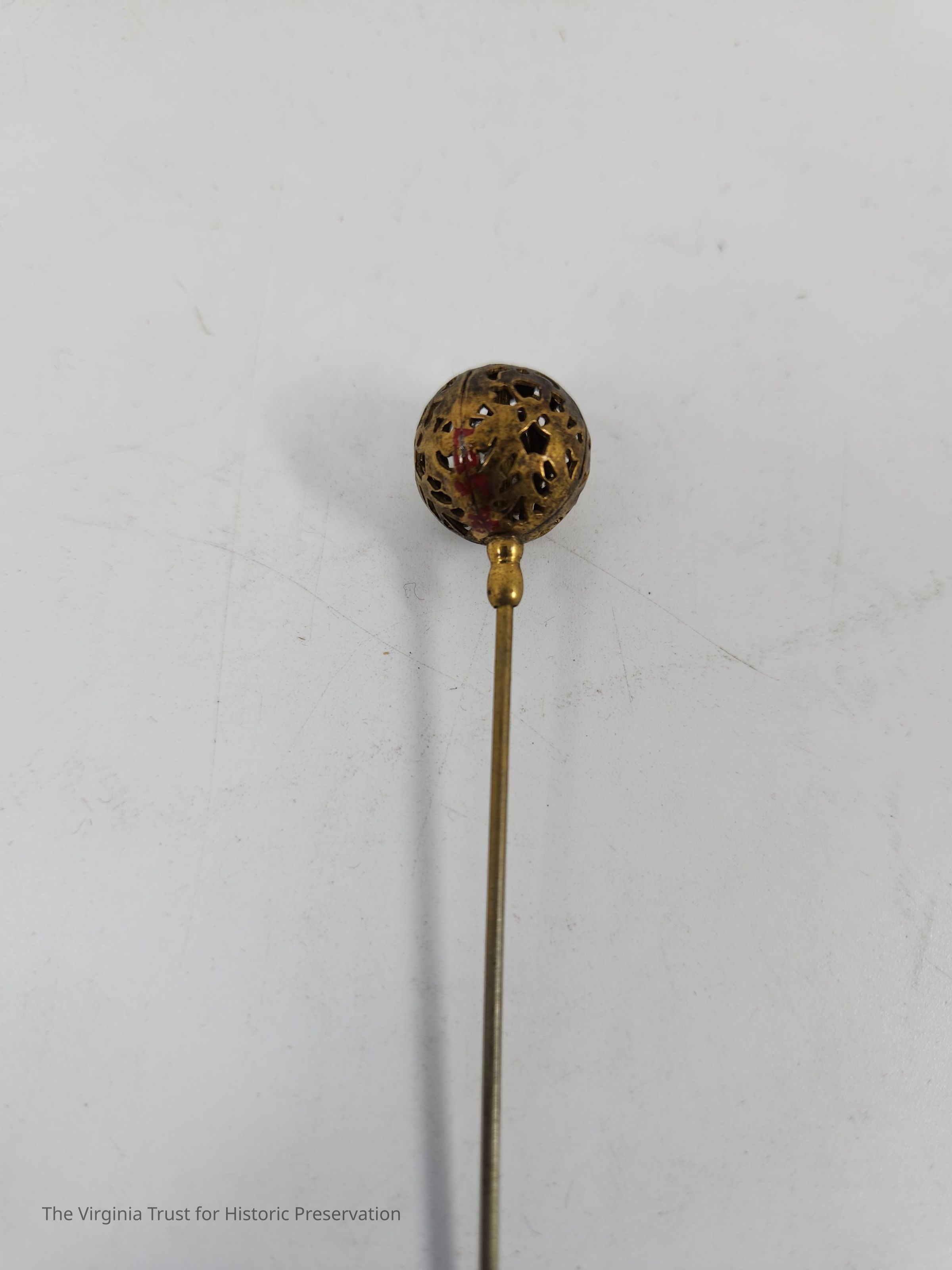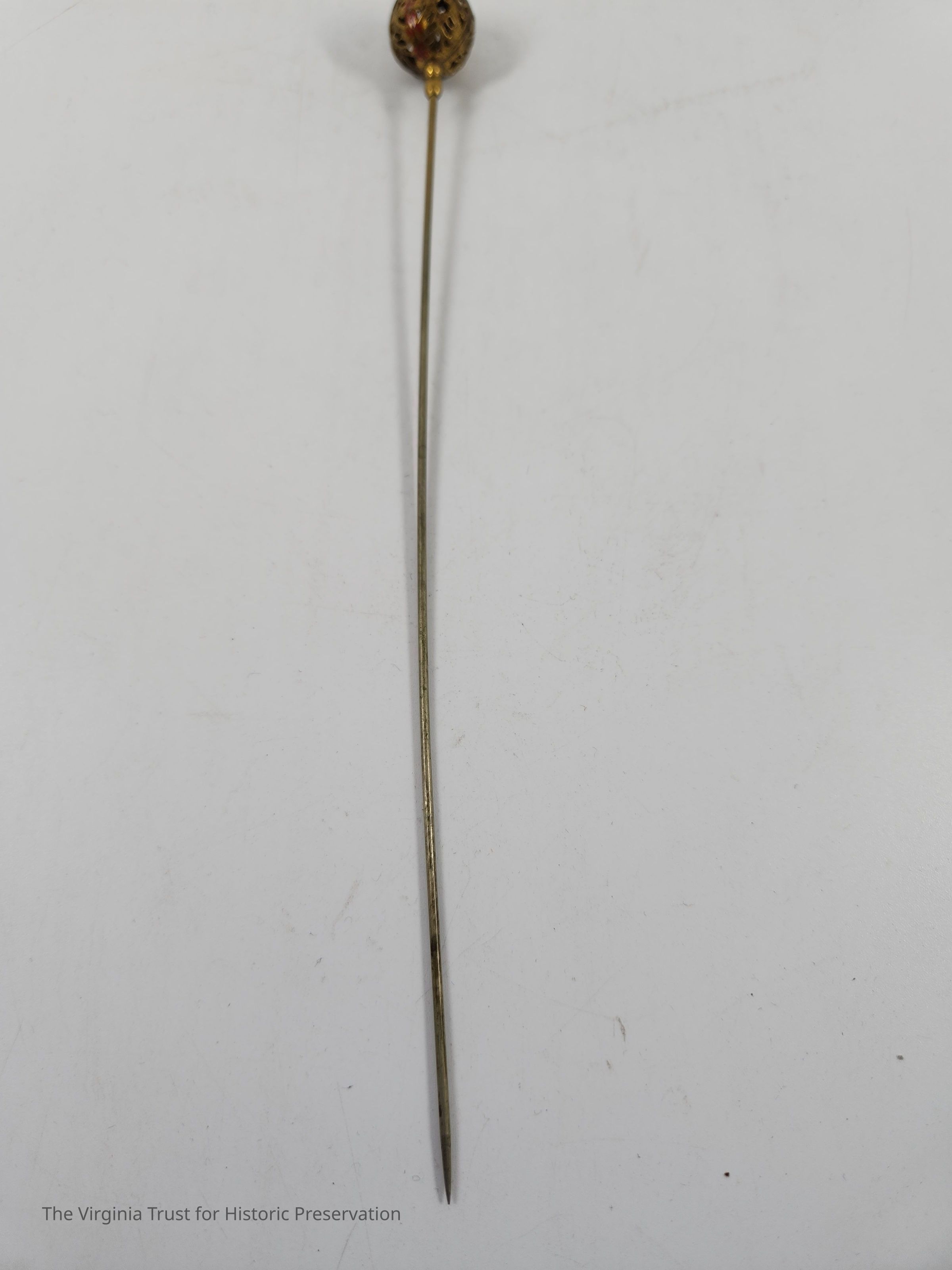 Gold colored hatpin with geometric pattern carved out and a gold colored pin. One of a set of thirteen hat pins of assorted sizes and heads.Dimensions