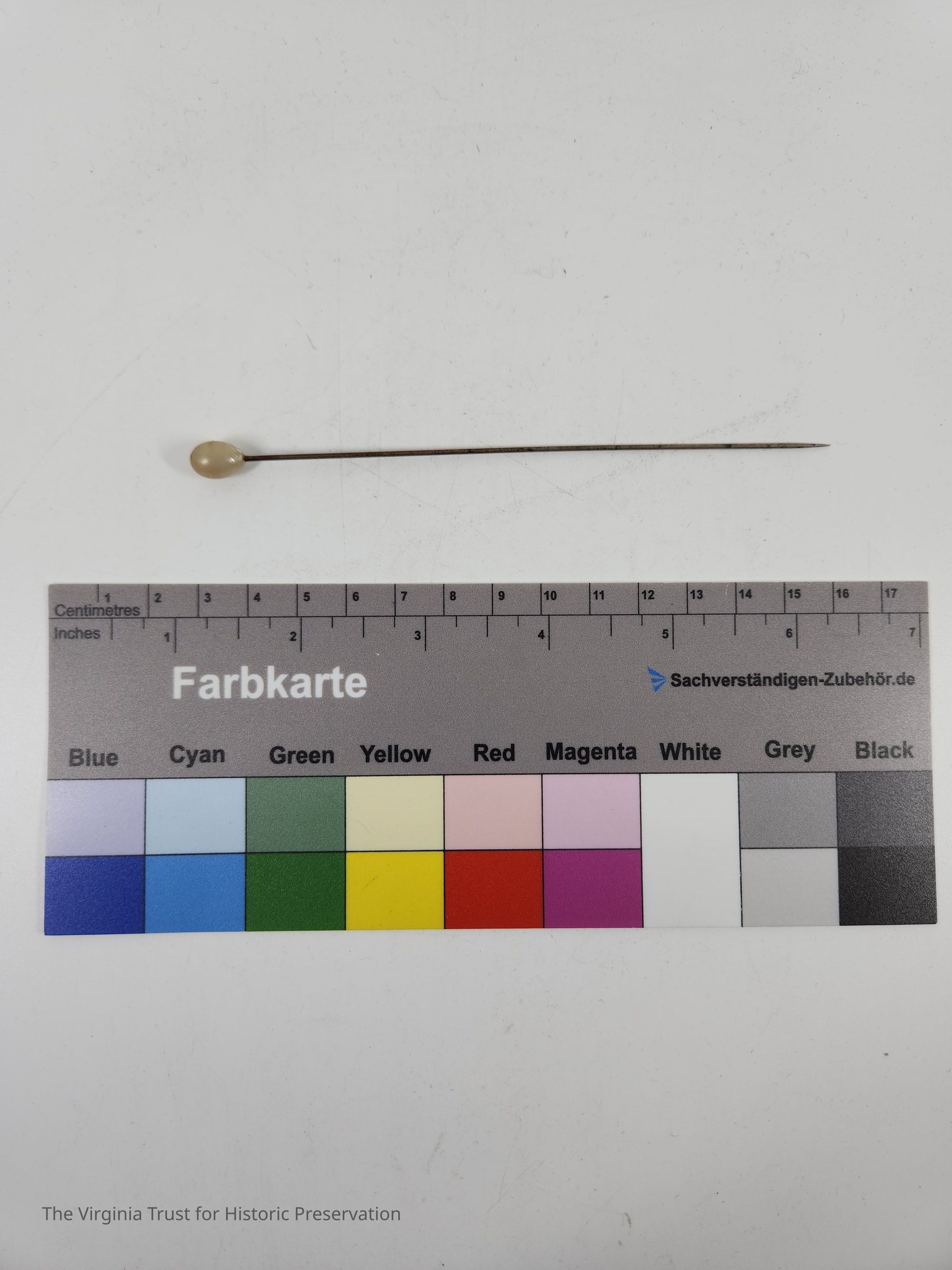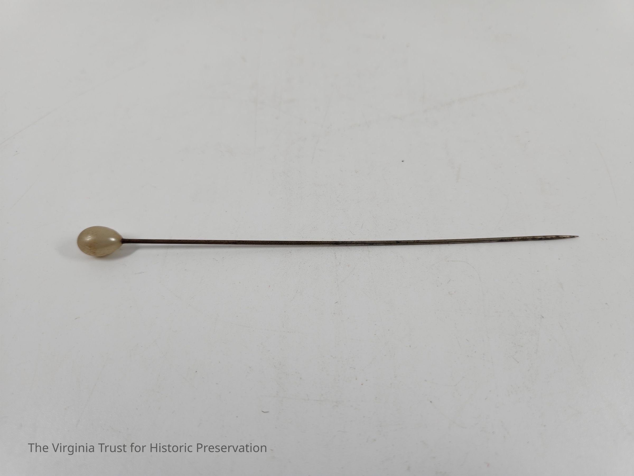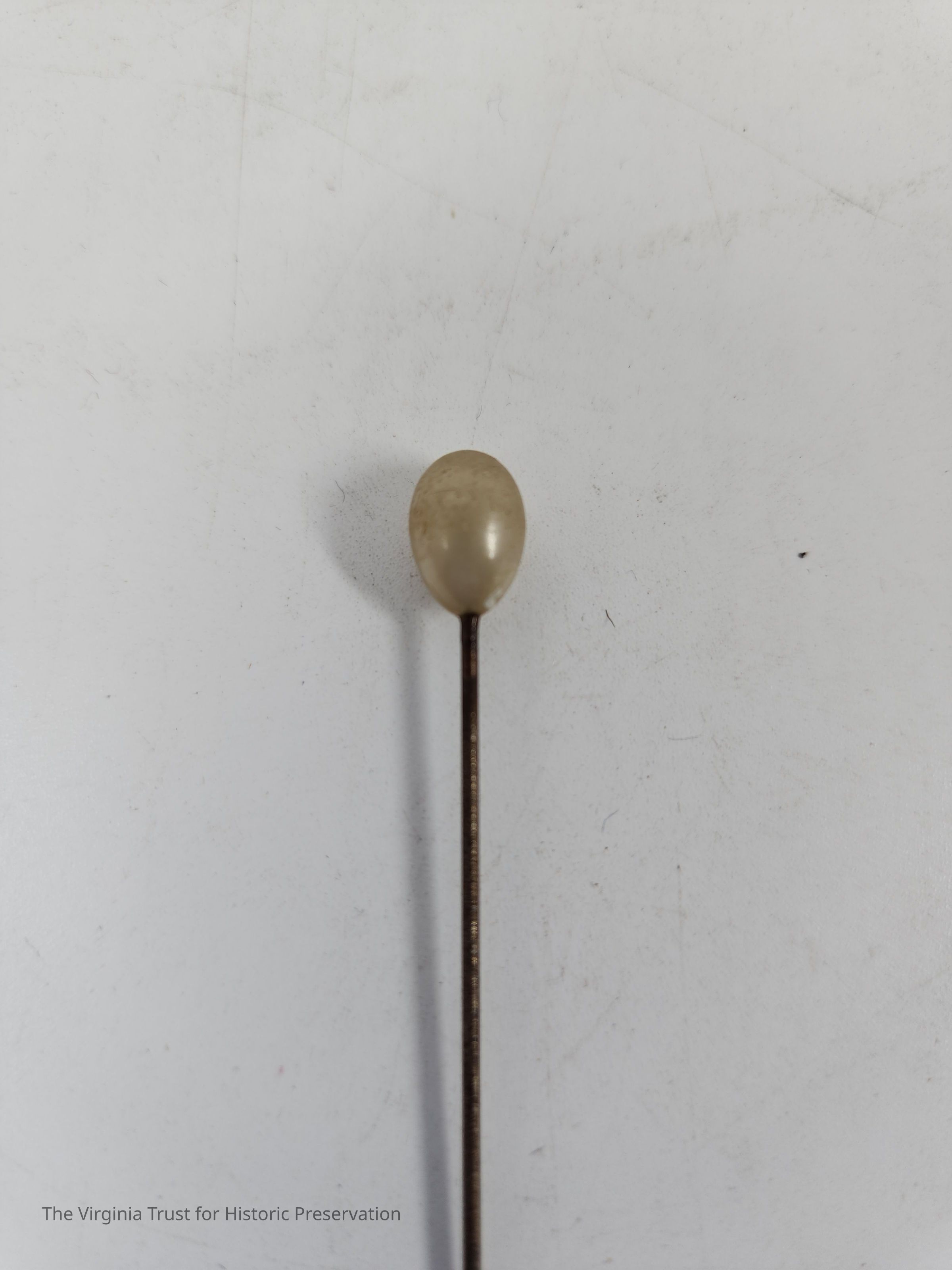 Oval, cream pearl colored hatpin with metal pin. One of a set of thriteen hat pins of assorted sizes and heads.