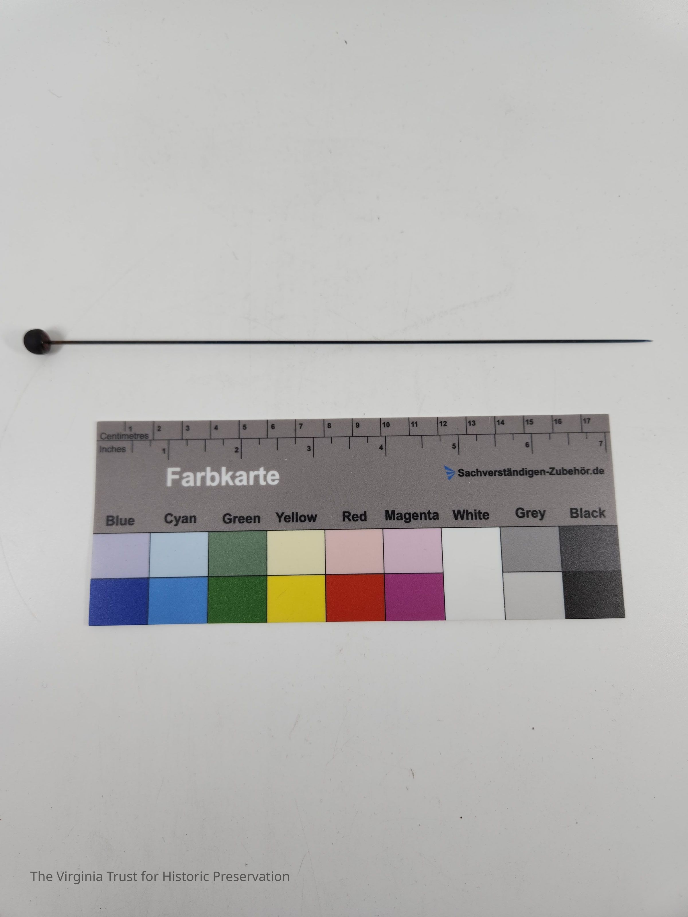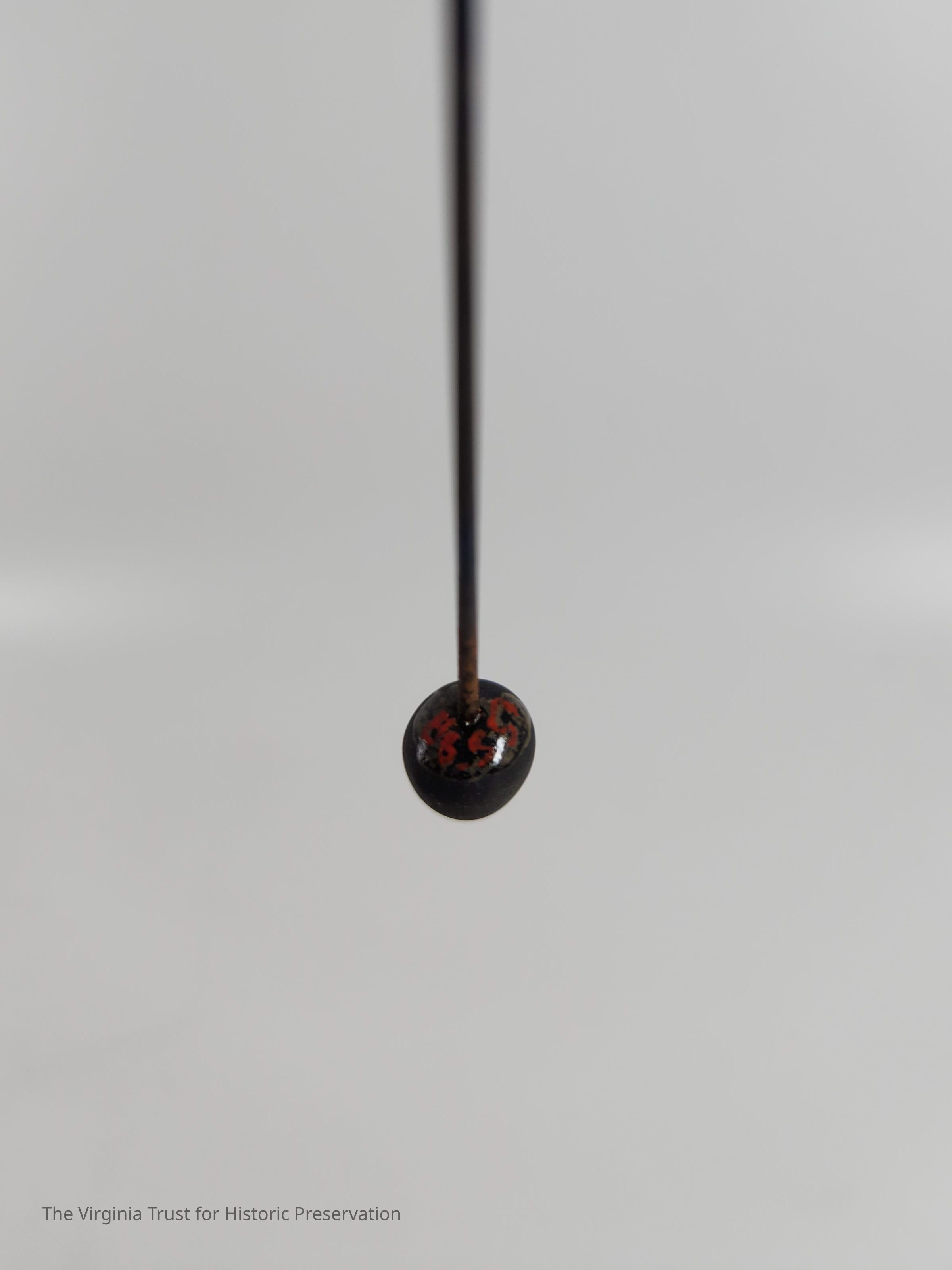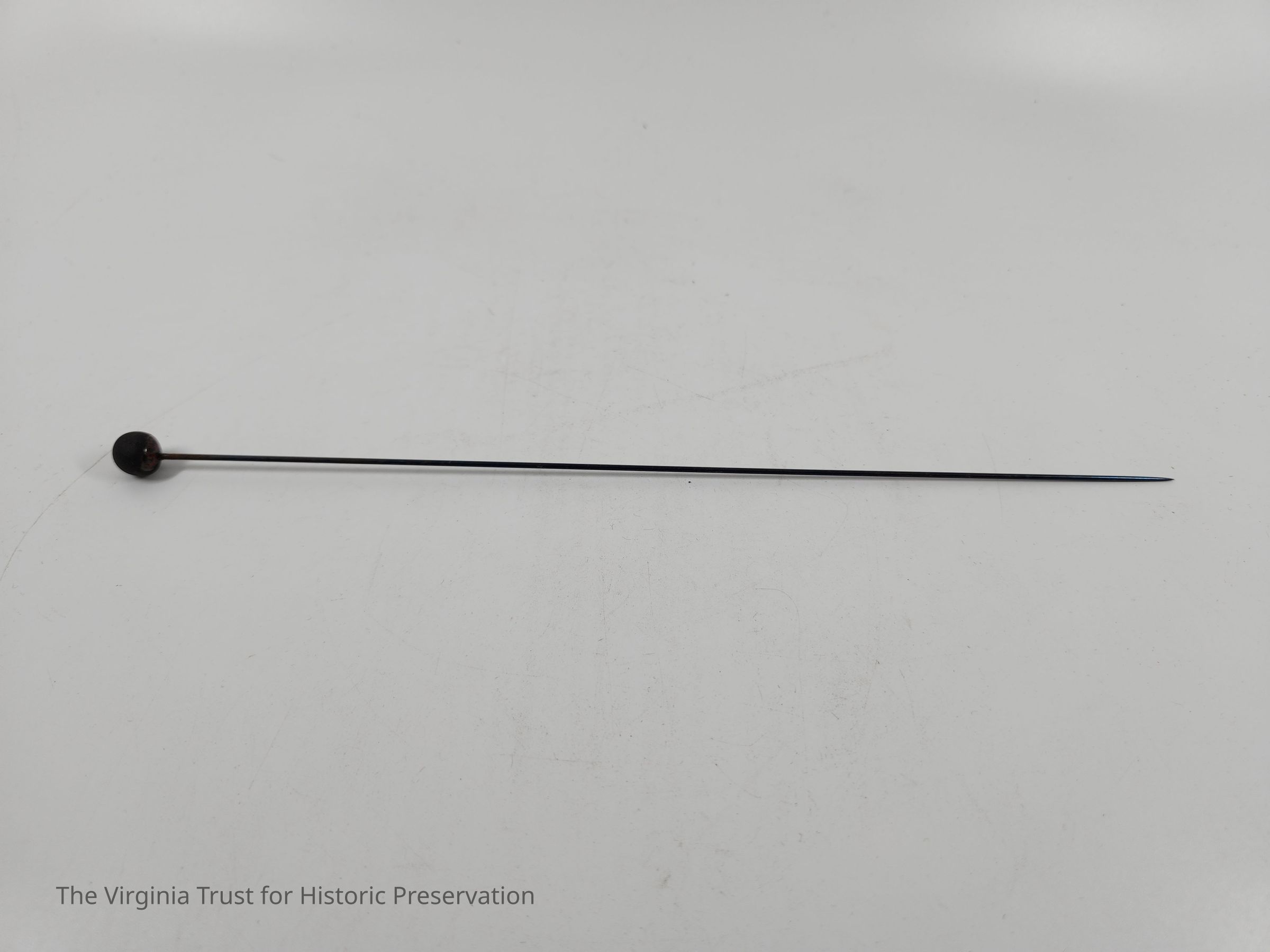 Hatpin with a black round pin head and a metal pin. One of a set of thirteen hat pins of assorted sizes and heads.Dimensions
