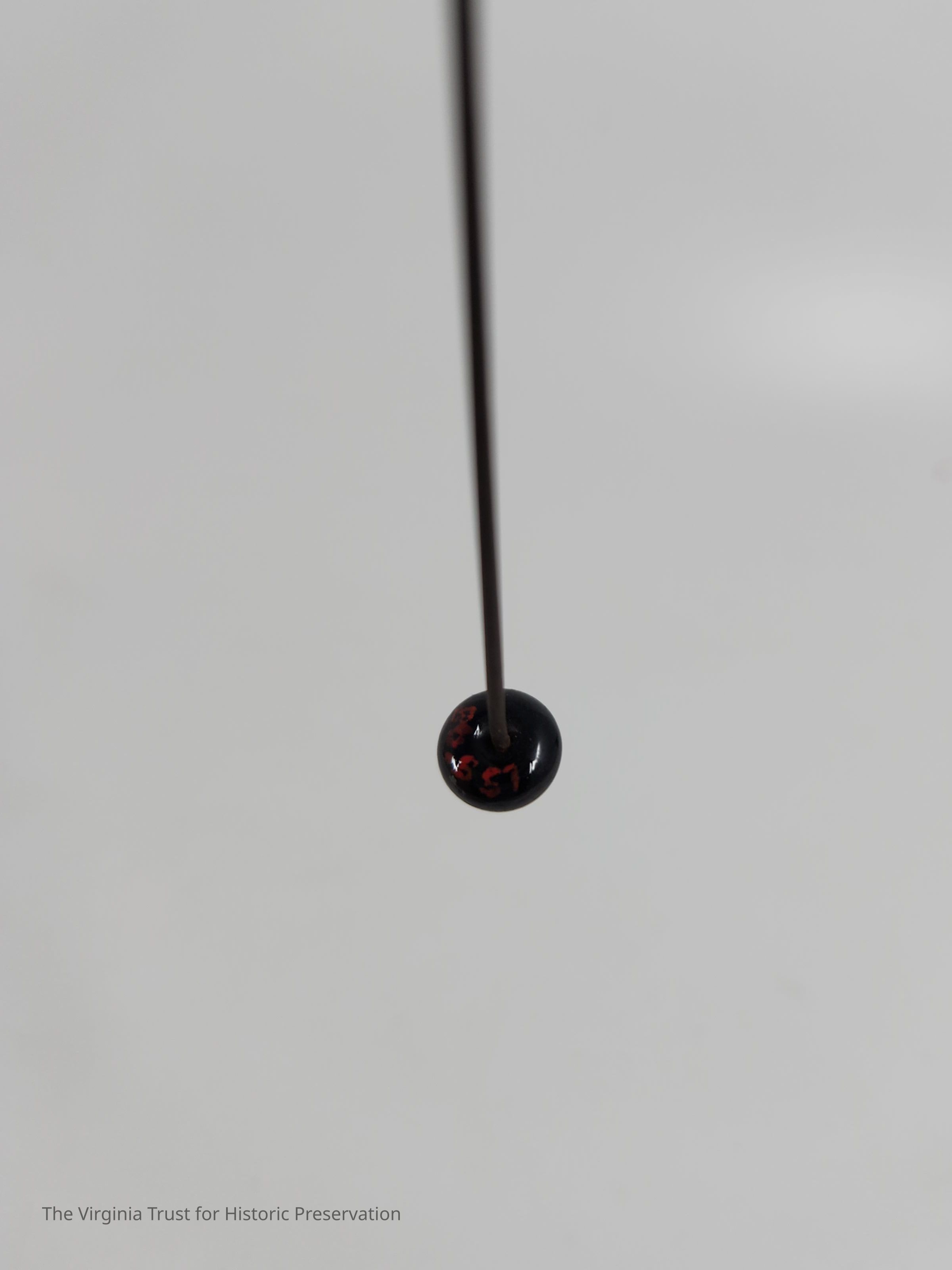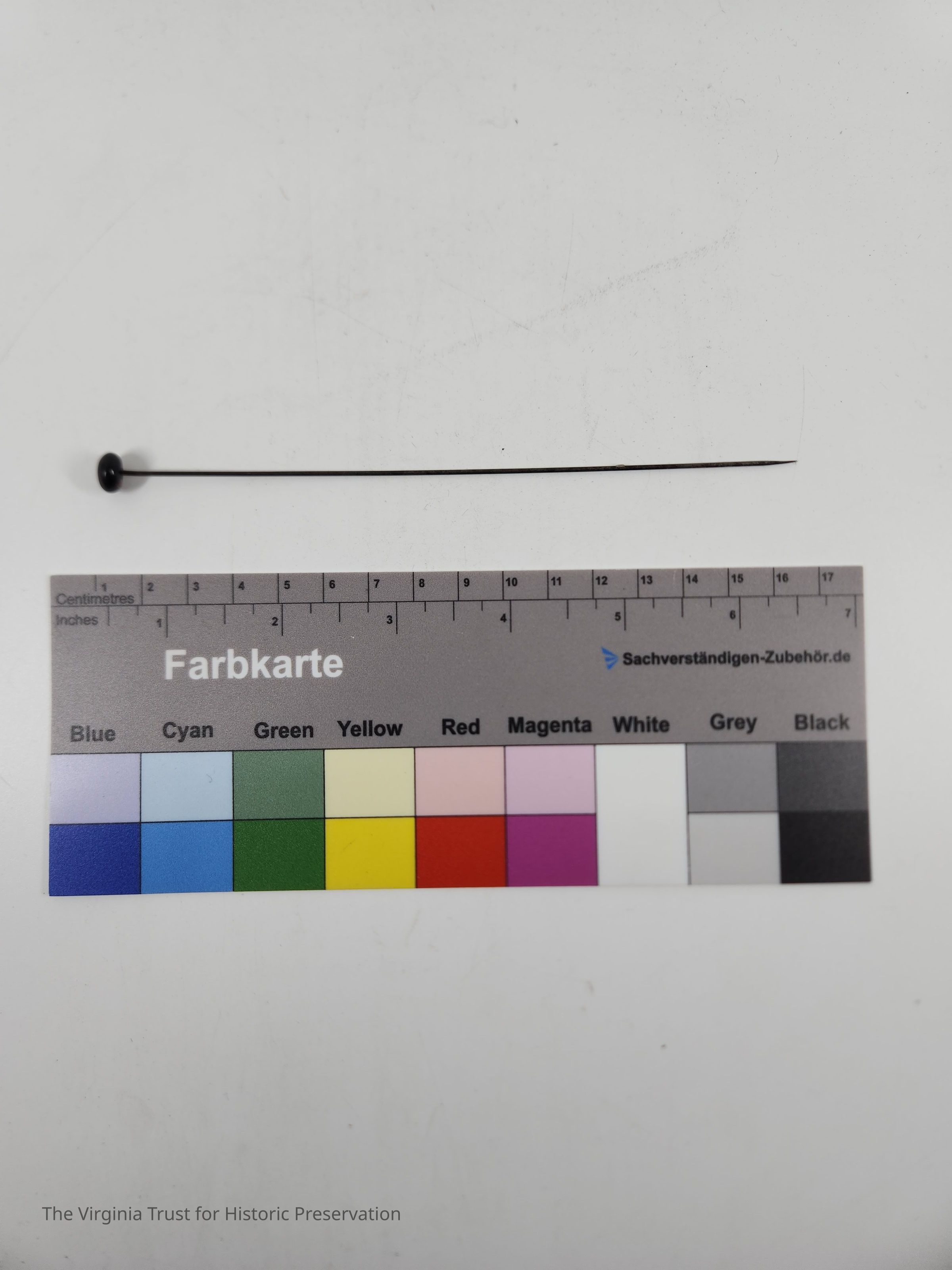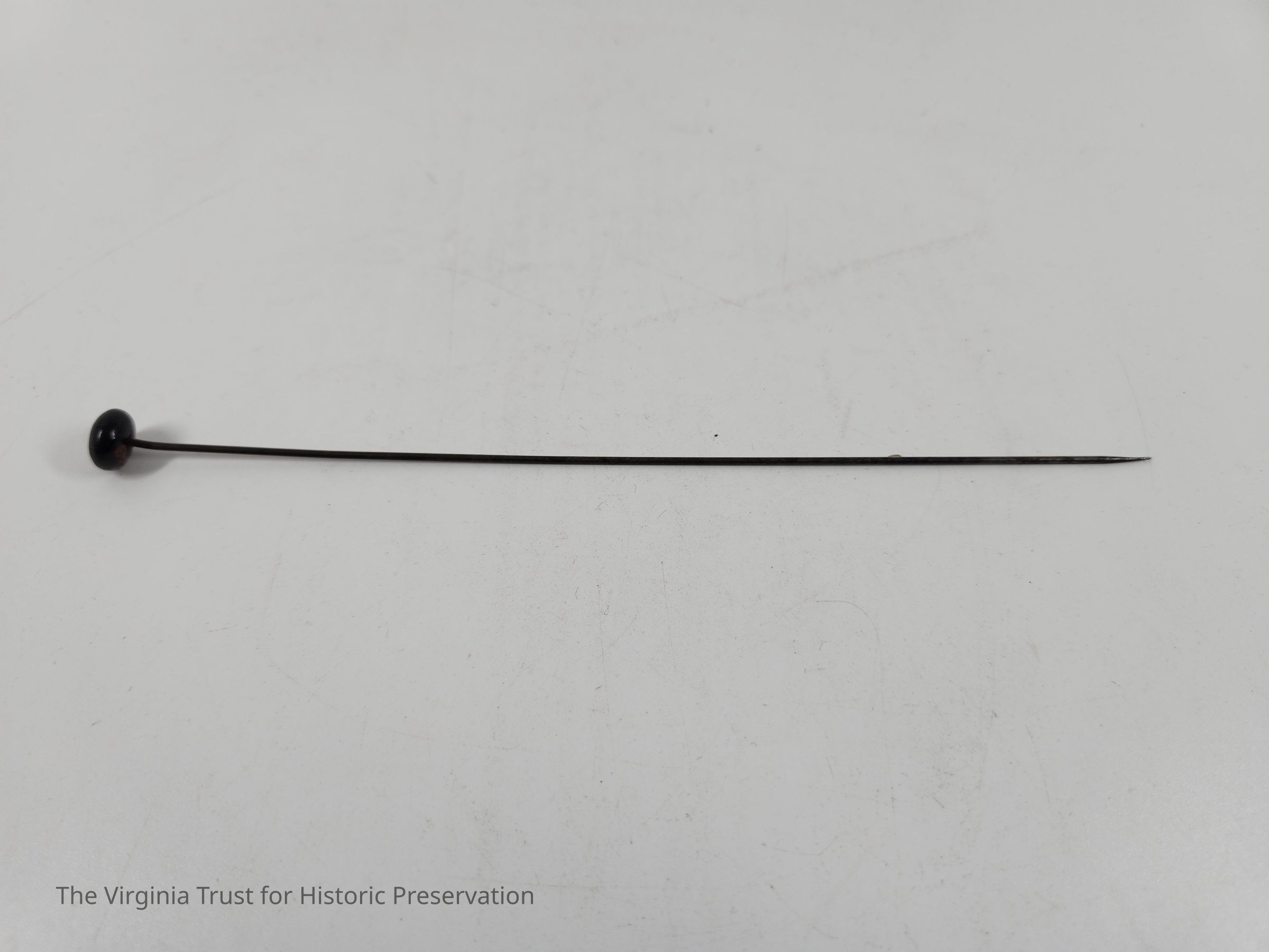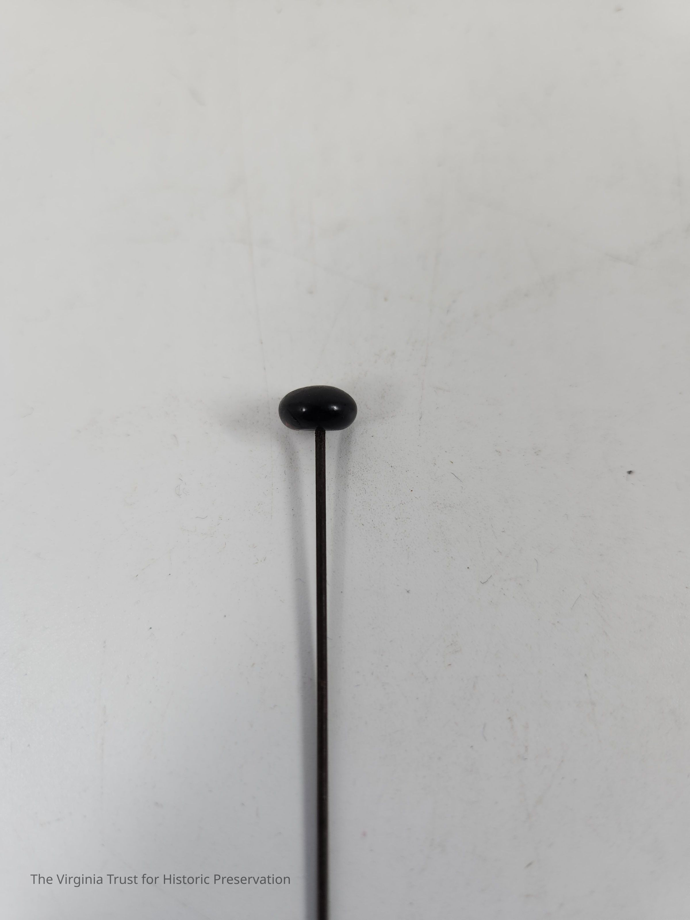 Hatpin with flat, black, oval shaped pinhead and metal pin. One of a set of thirteen hat pins of assorted sizes and heads.Dimensions