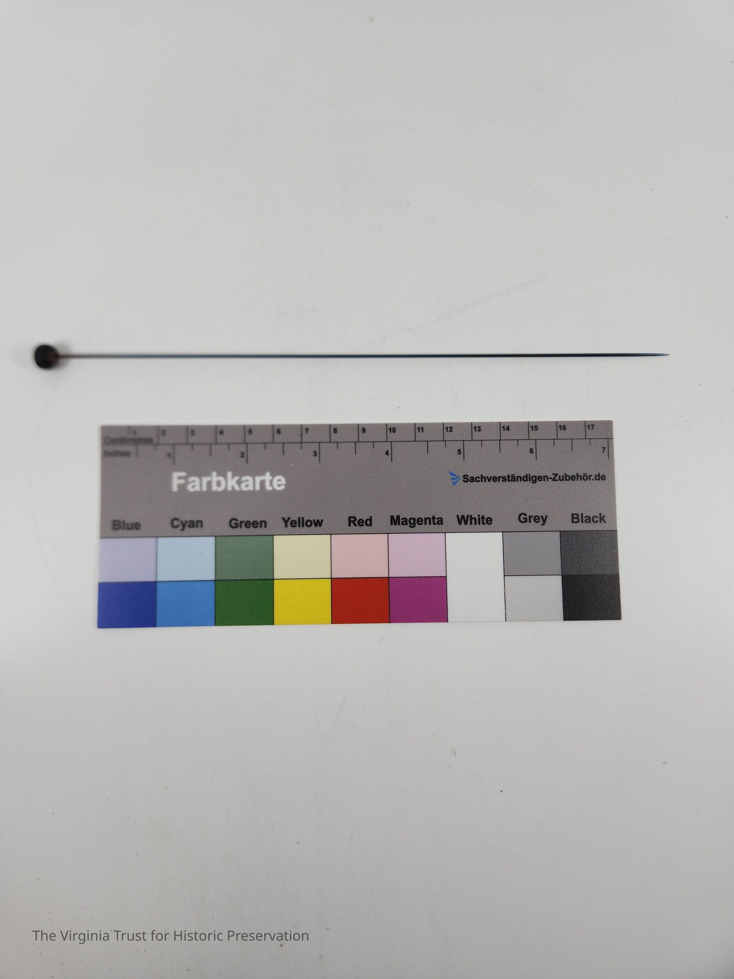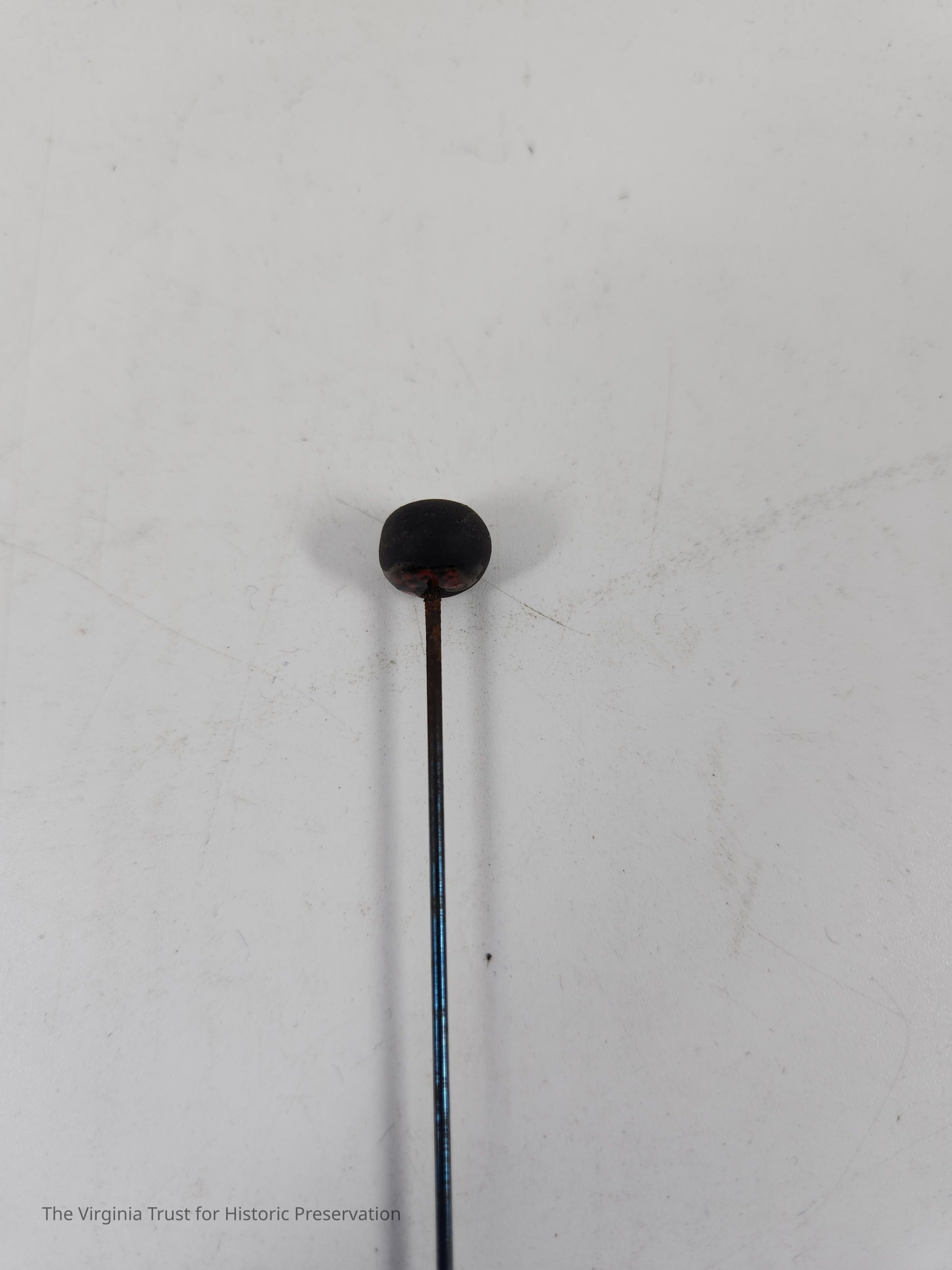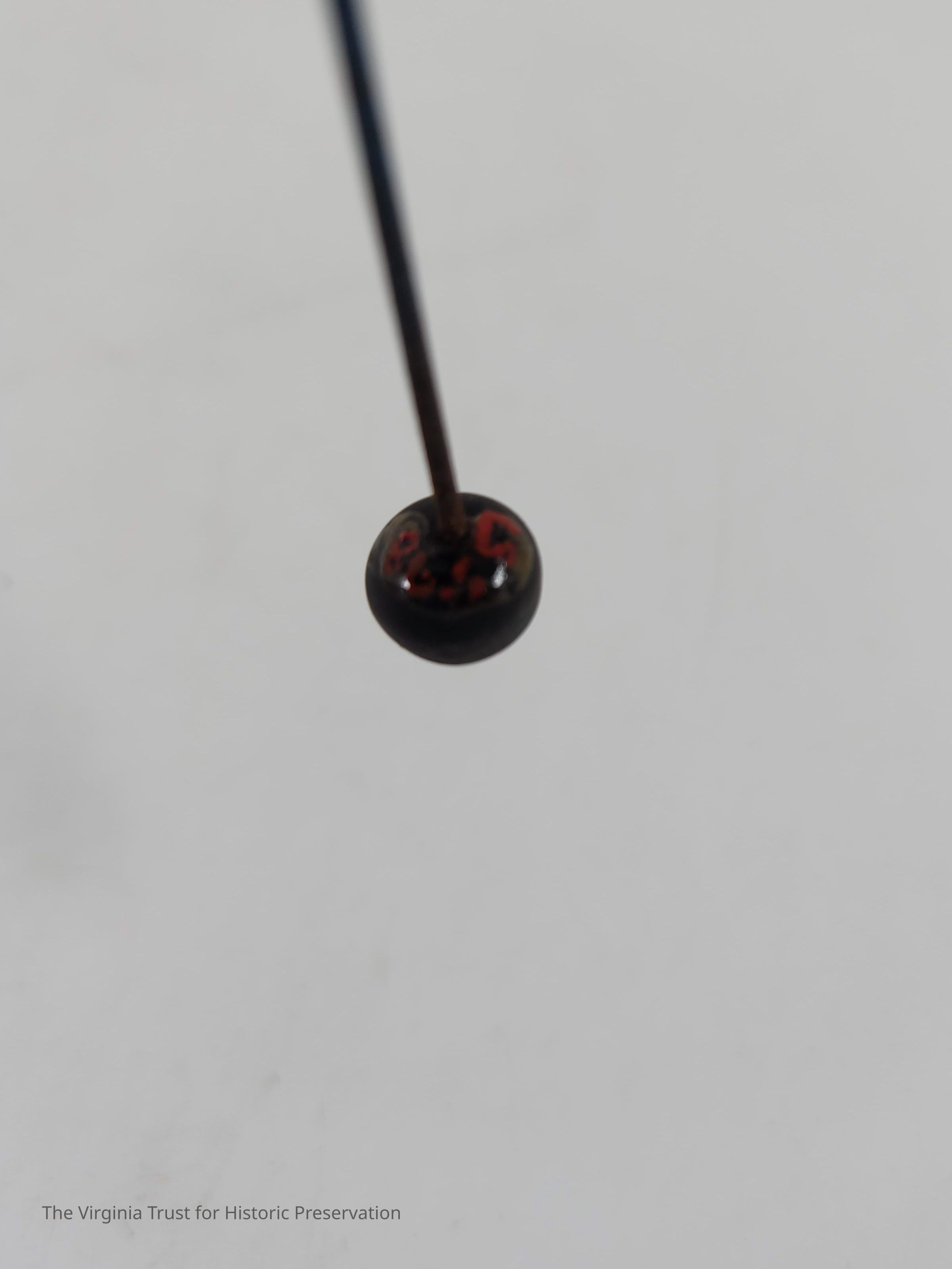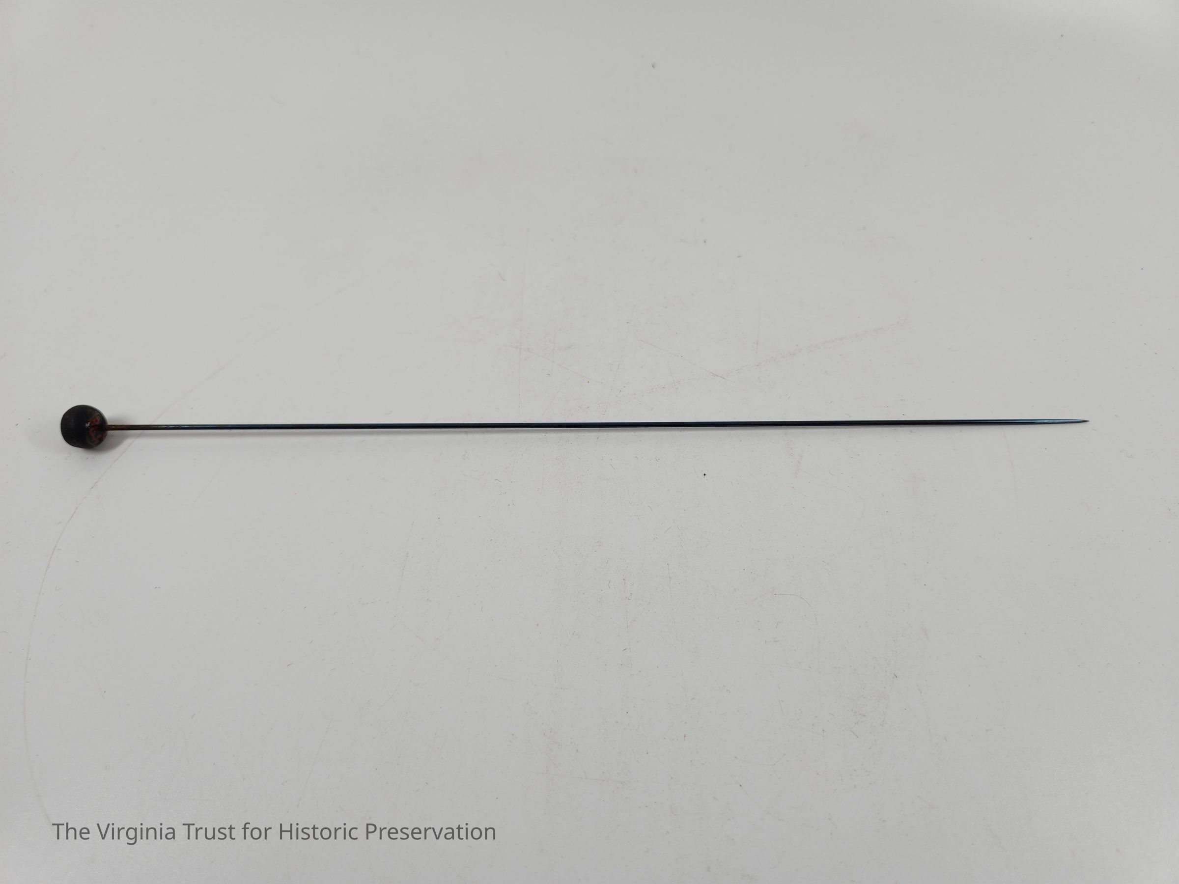 Hatpin with black, circular pinhead and a metal pin. One of a set of thirteen hat pins of assorted sizes and heads.Dimensions