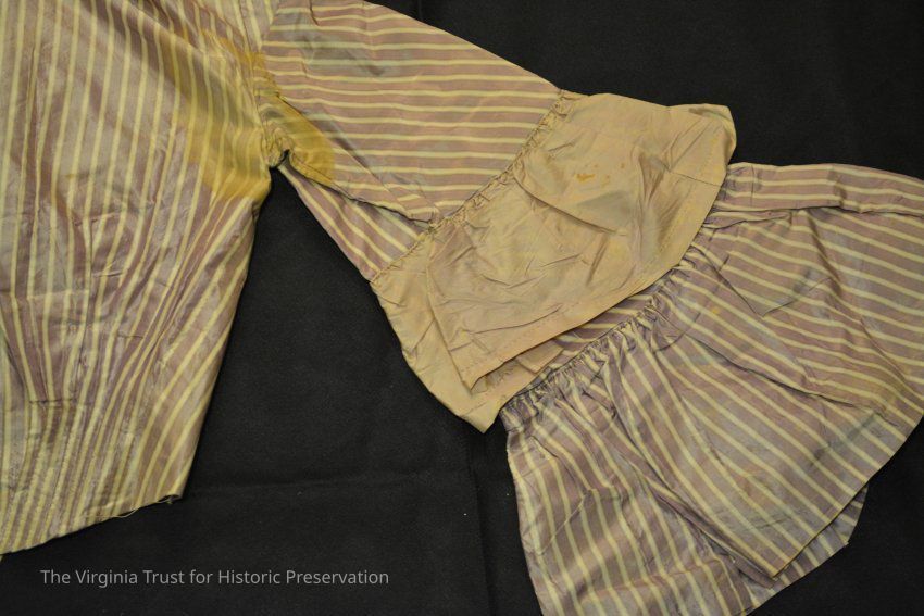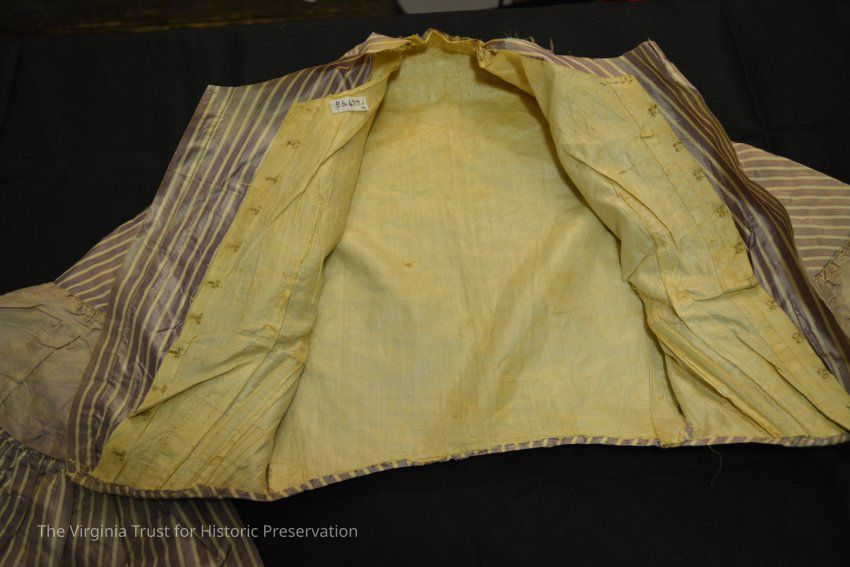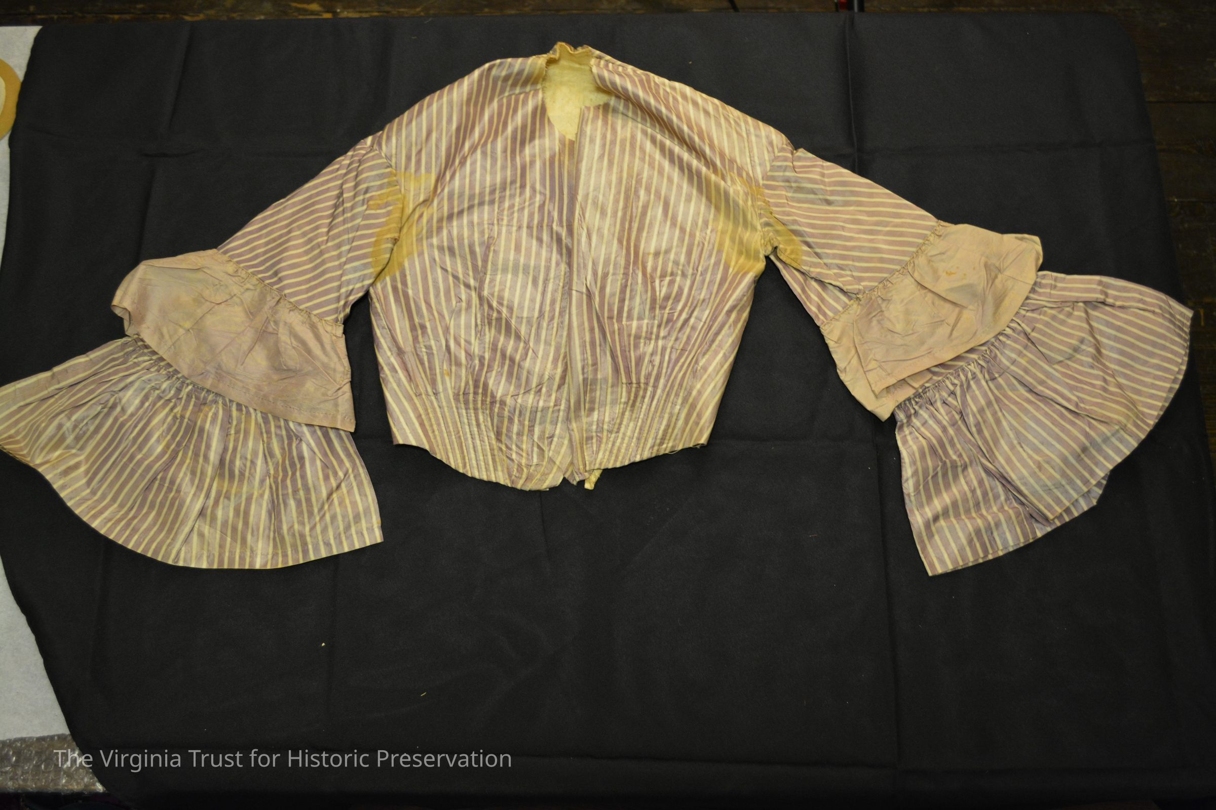 Day dress bodice of lavendar silk, plain bodice with ruffled bell sleeves. Has been altered, front closure missing. Collar missing.