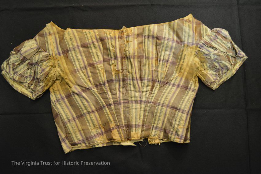 Silk bodice with short sleeevs and wide neckline. Silk is shattered, not possible to repair. Possibly remade in a larger size, neck altered. There was an attempt to mend the shattering, possibly at time of alteration.