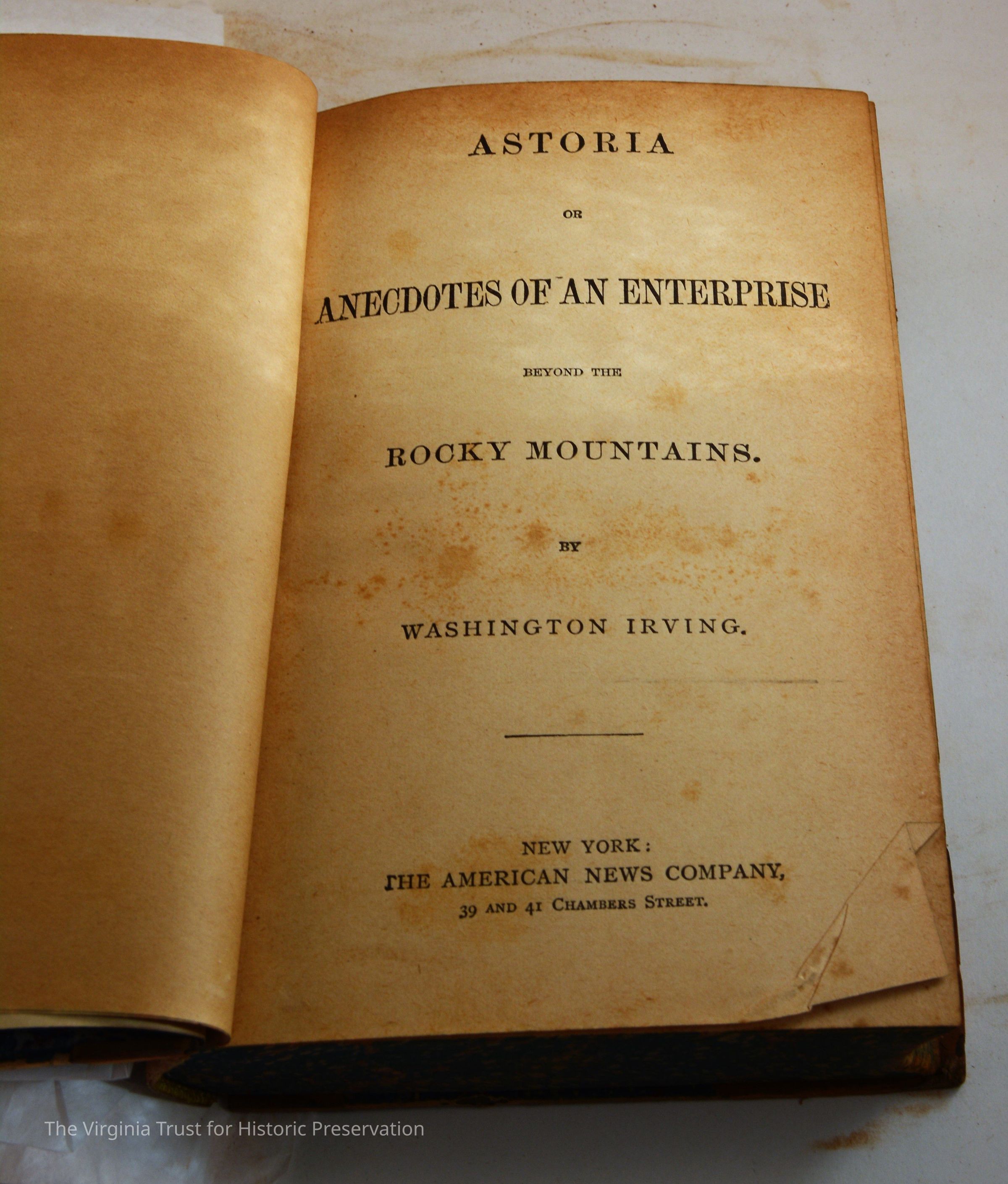 Irving, Washington. Astoria or Anecdotes of an Enterprise Beyond the Rocky Mountains. New York: The American News Company, [n.d.]. One of a set of 10 volumes by Washington Irving.