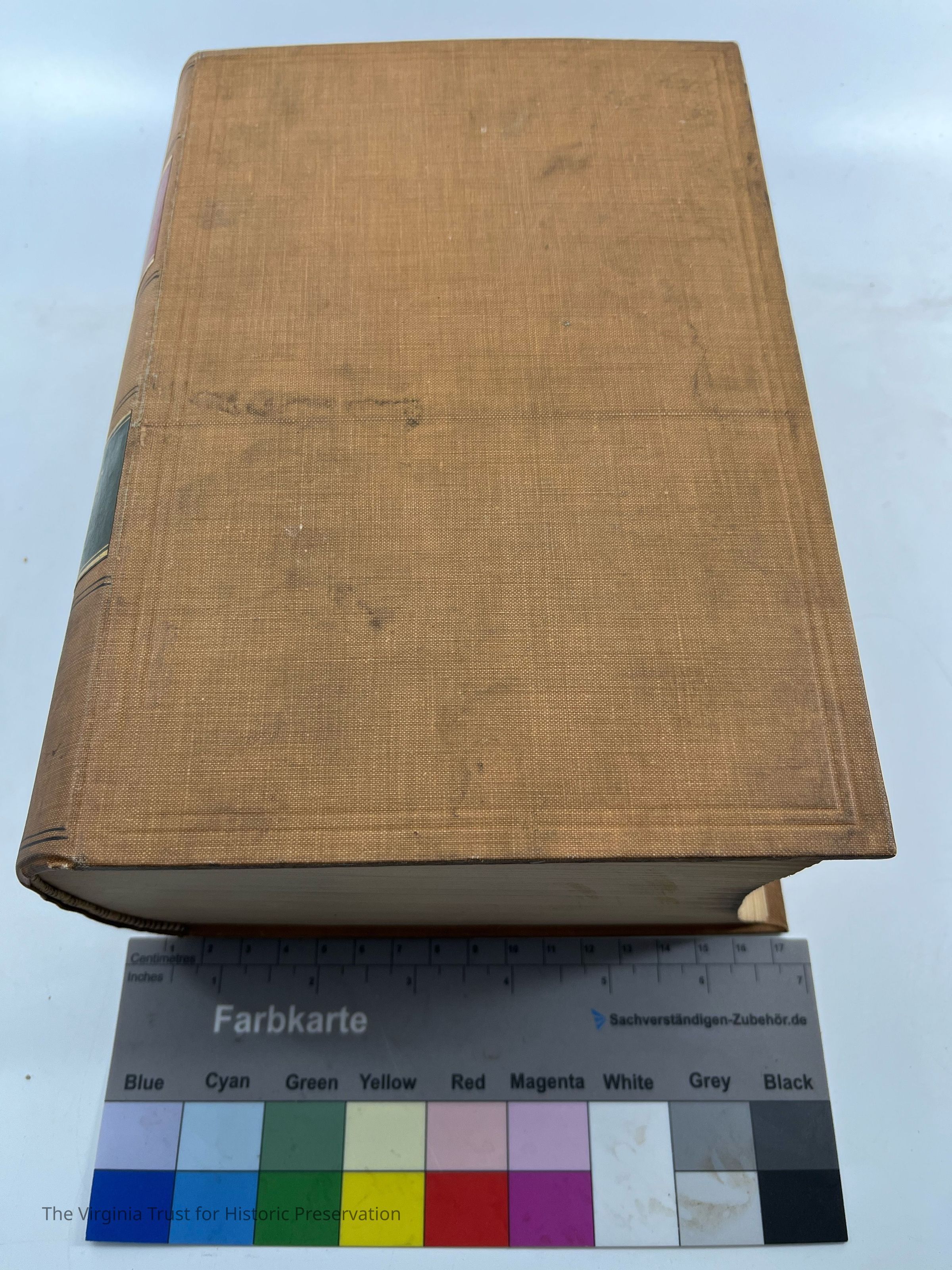 Tan colored front and back cover, excellent binding, readable/multicolored spine