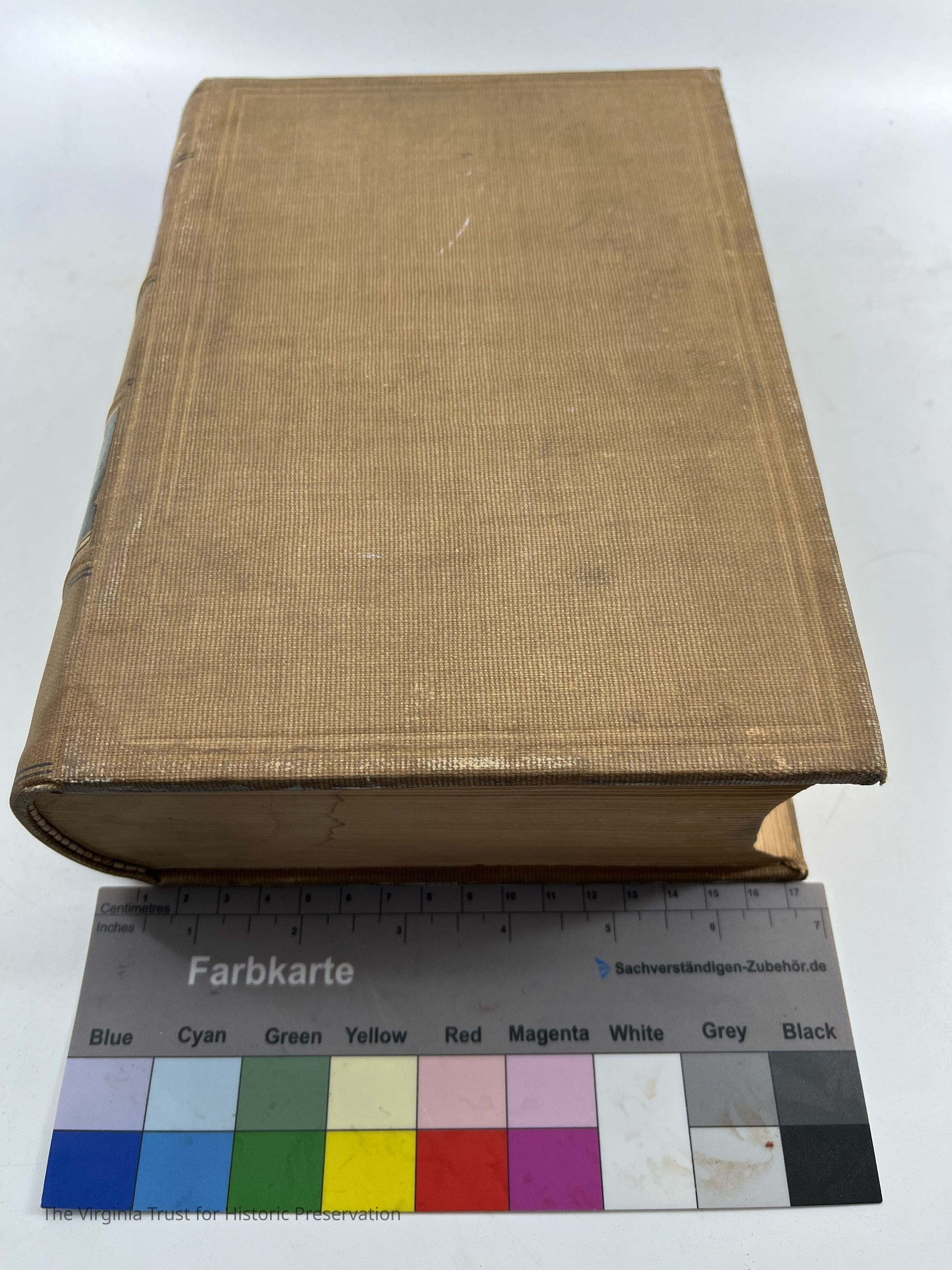 Tan colored front and back cover, excellent binding, readable/multicolored spine