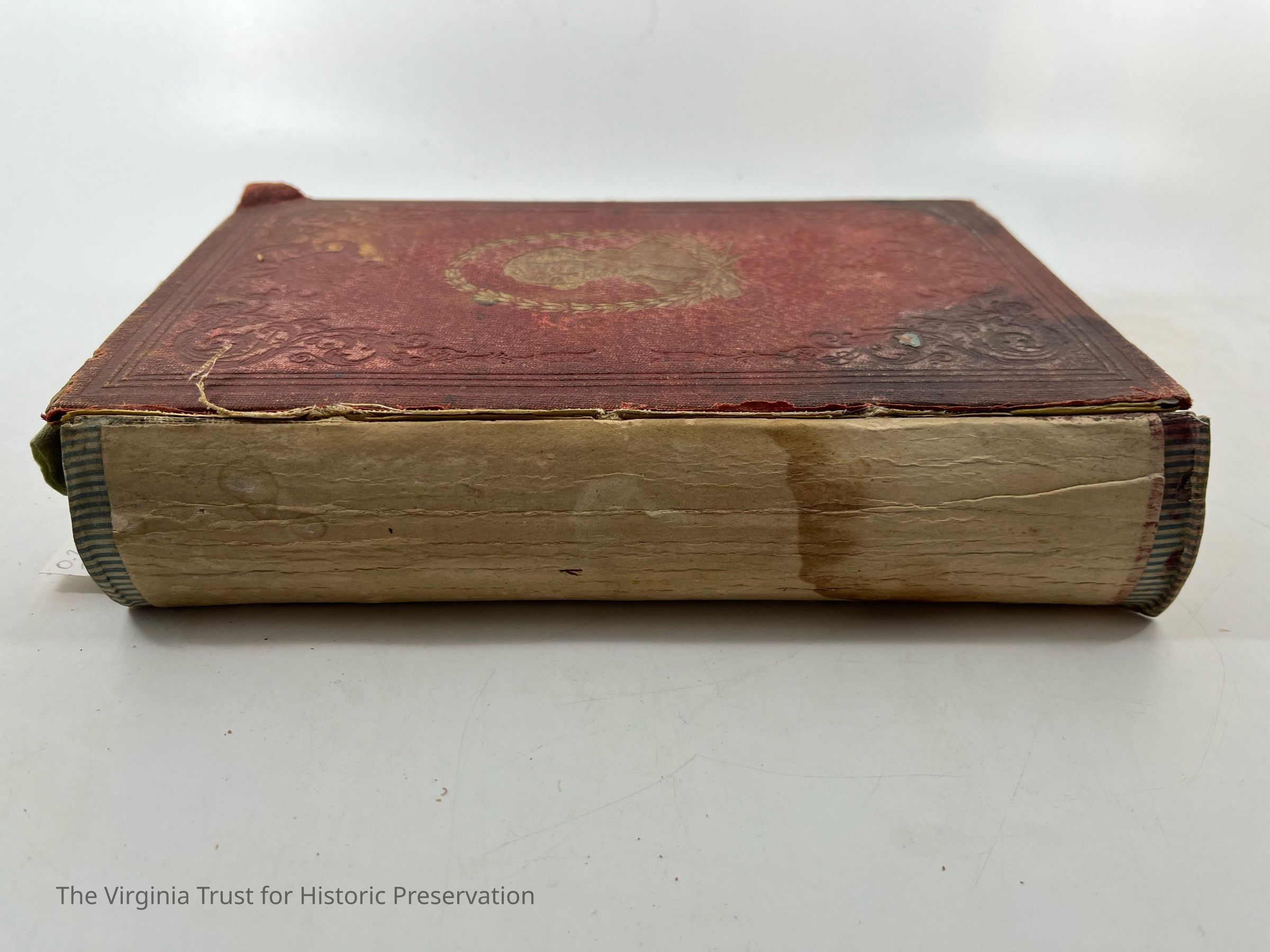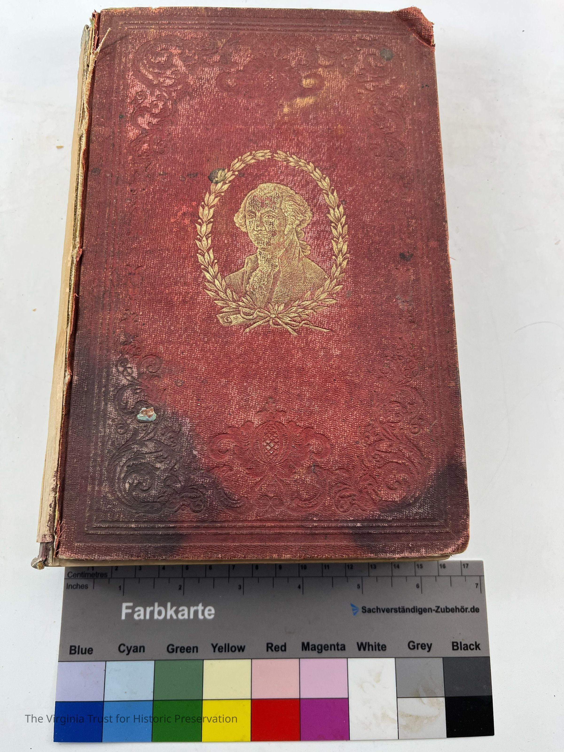 Maroon colored, face of George Washington in gold on front cover, loose back cover, fragile binding, worn/unreadable spineDimensions