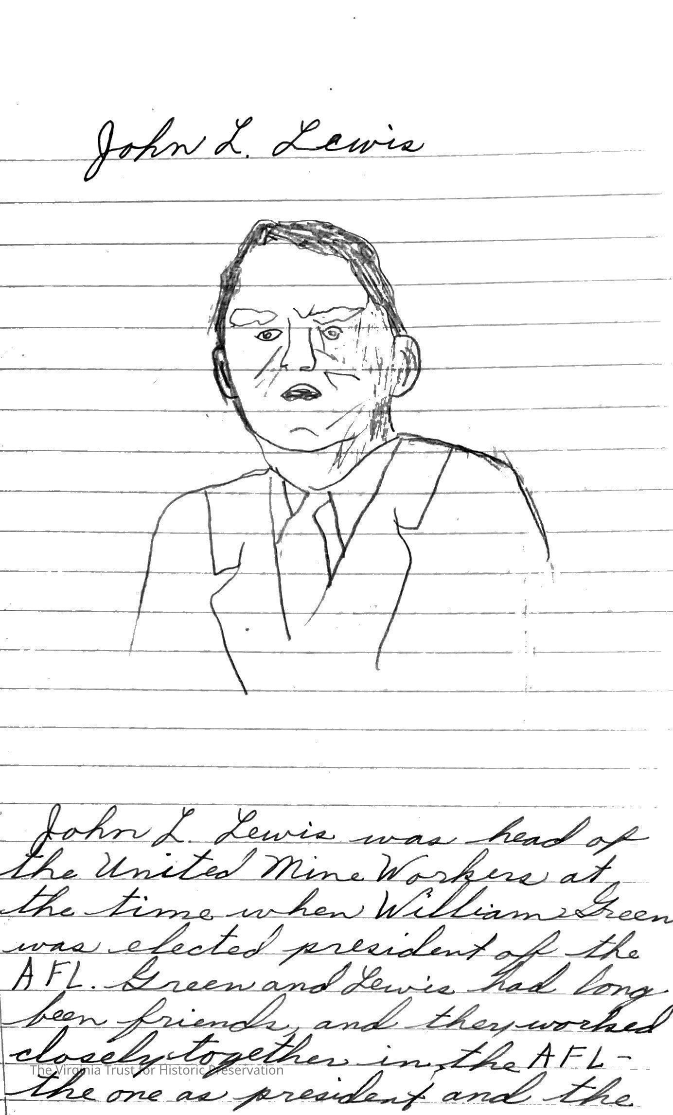 Booklet that was a school assignment. Titled "Great Americans", and includes drawings and write-ups of President Roosevelt (FDR), Harlan Stone (Associate Justice of Supreme Court), Vice President Wallace (Henry A. Wallace), Harry Hopkins (Secretary of Commerce), Cordell Hull (Secretary of State), General MacArthur, William Green (Labor Advisory Council, NLRB), Frank Knox (Secretary of Navy), John L. Lewis.