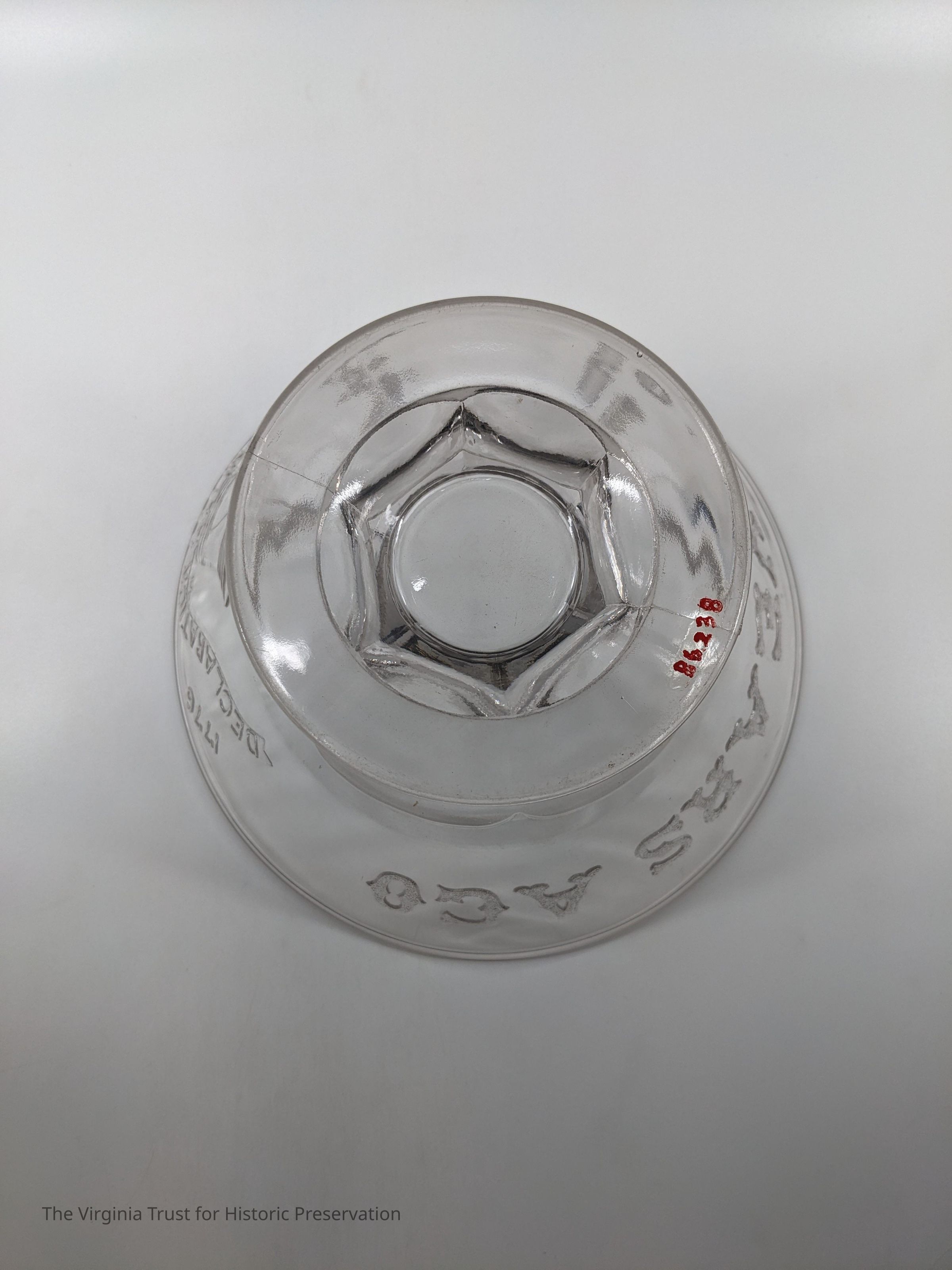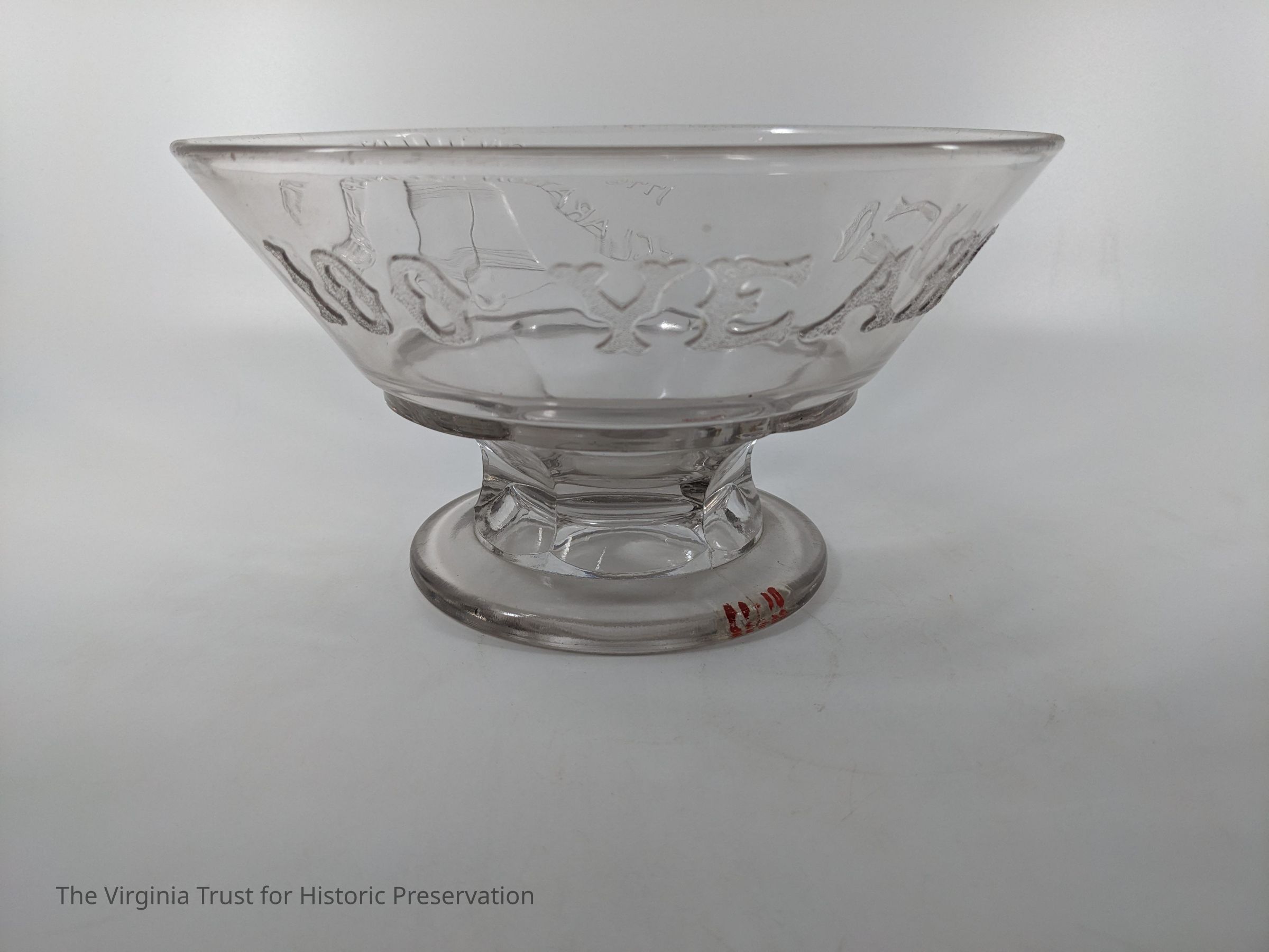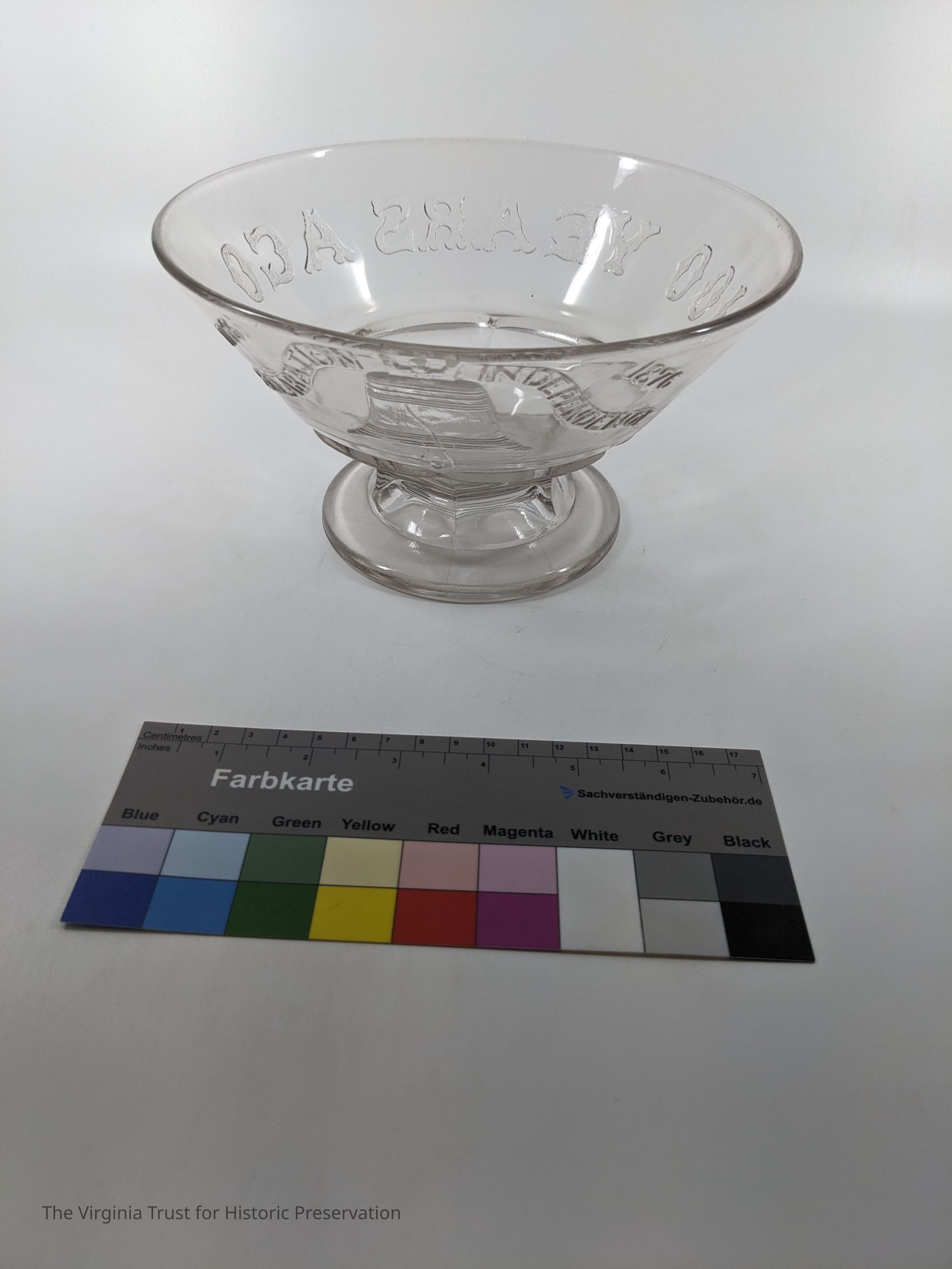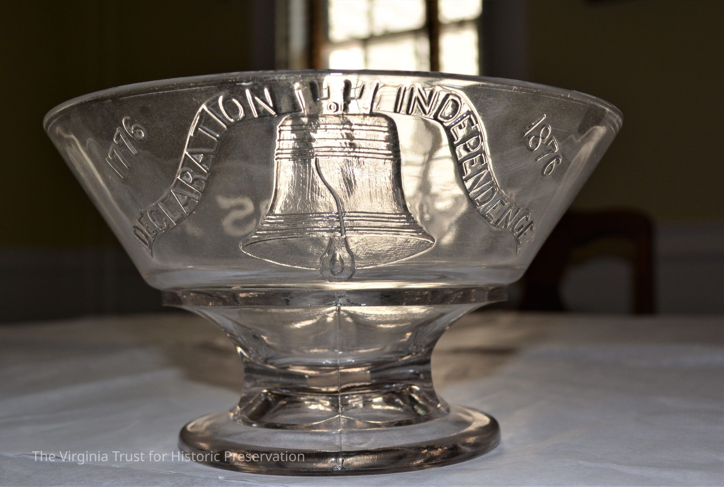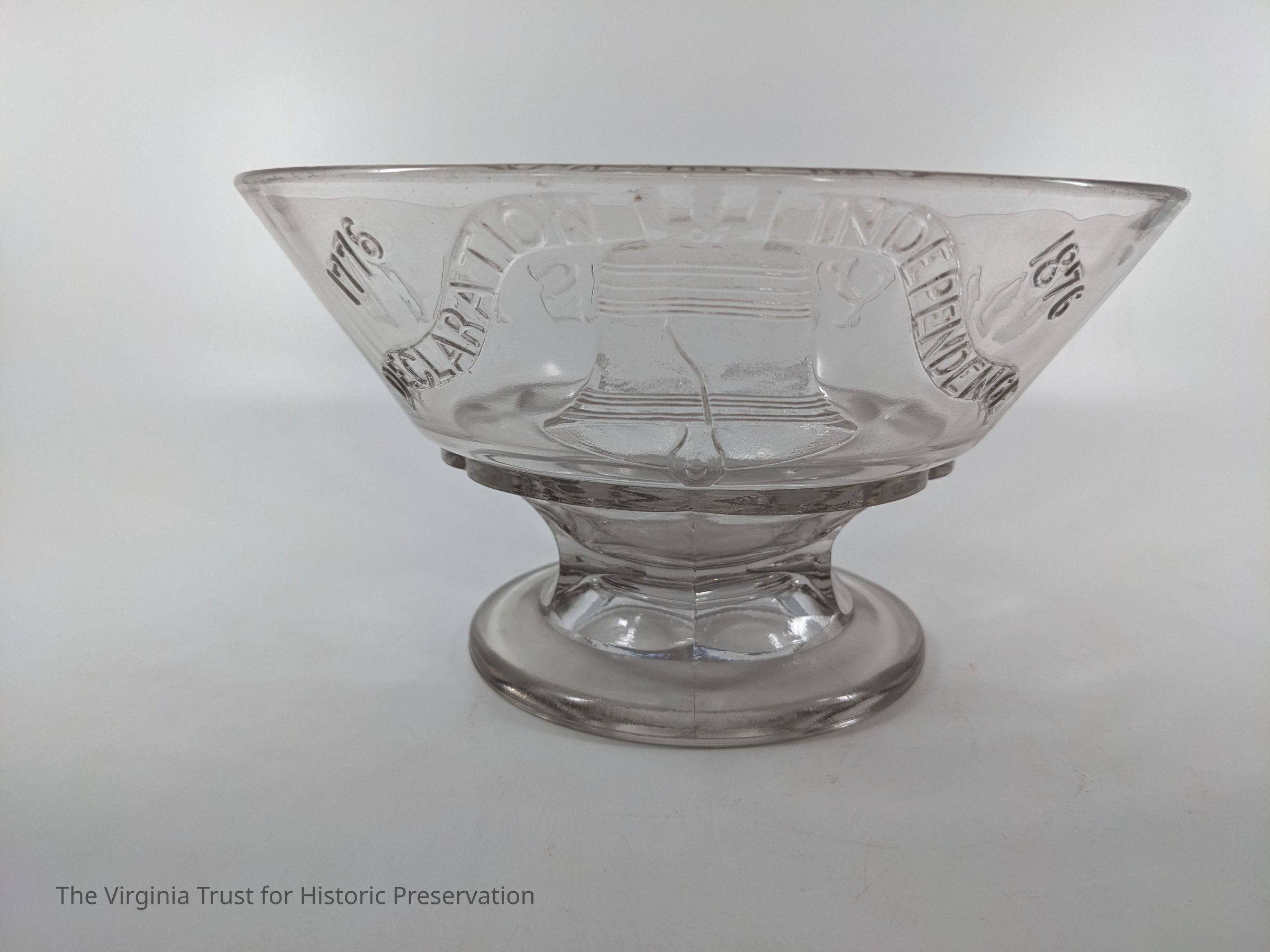 Decorative pressed glass fruit bowl, souvenir from the 1876 Philadelphia Exposition. Raised design depicts Liberty Bell with these words: "1776-1876 Declaration of Independence 100 Years Ago."Dimensions