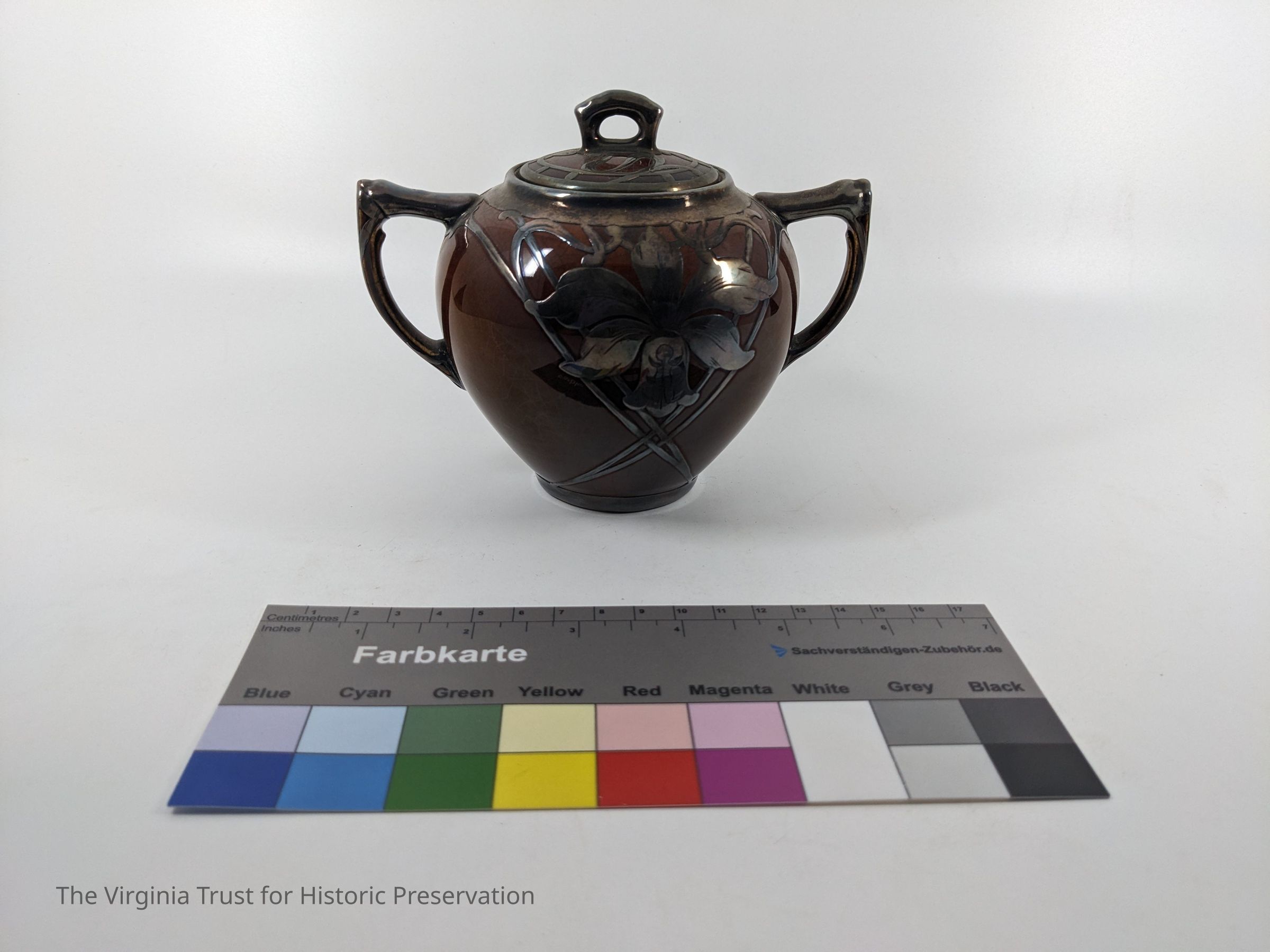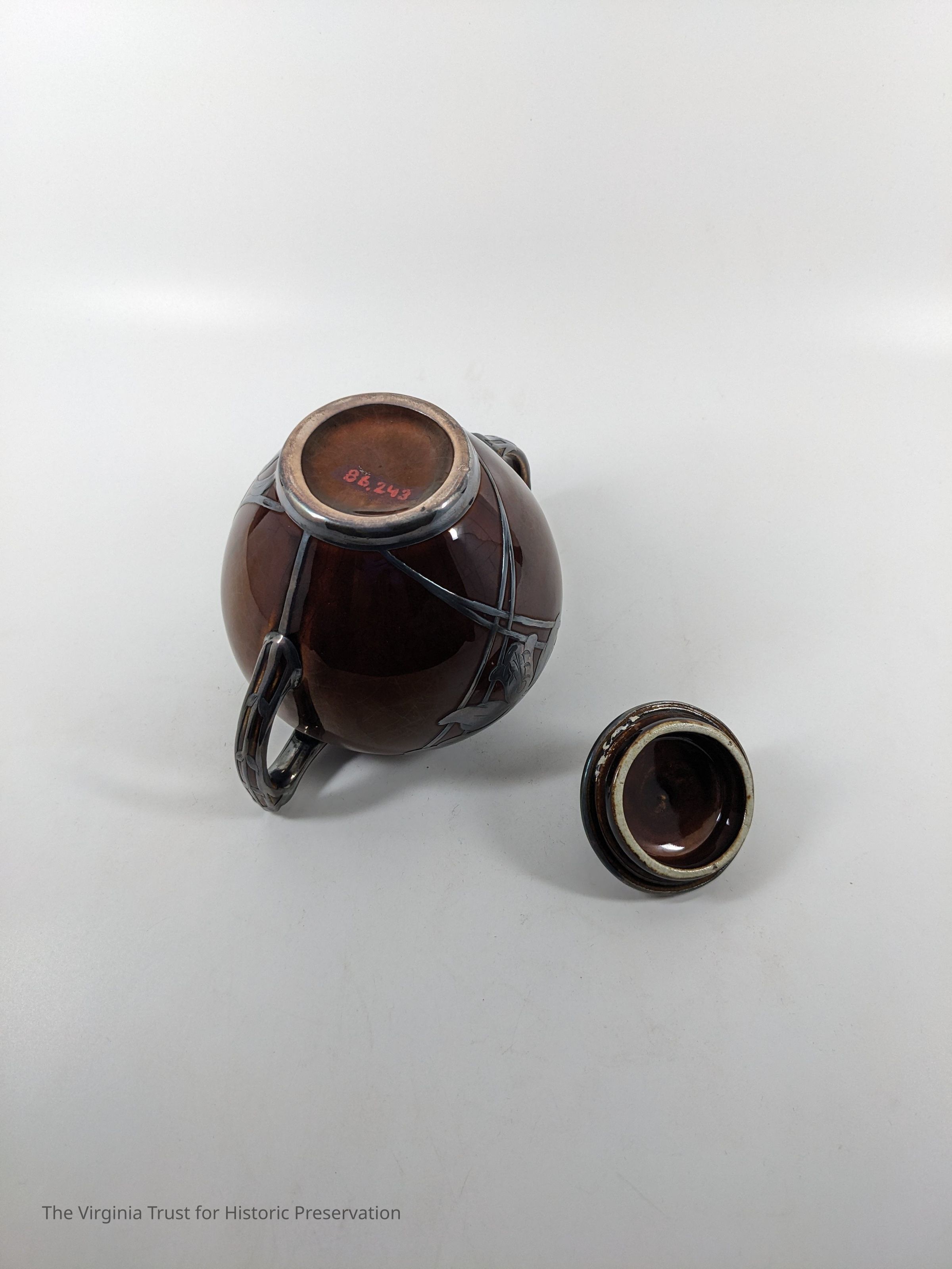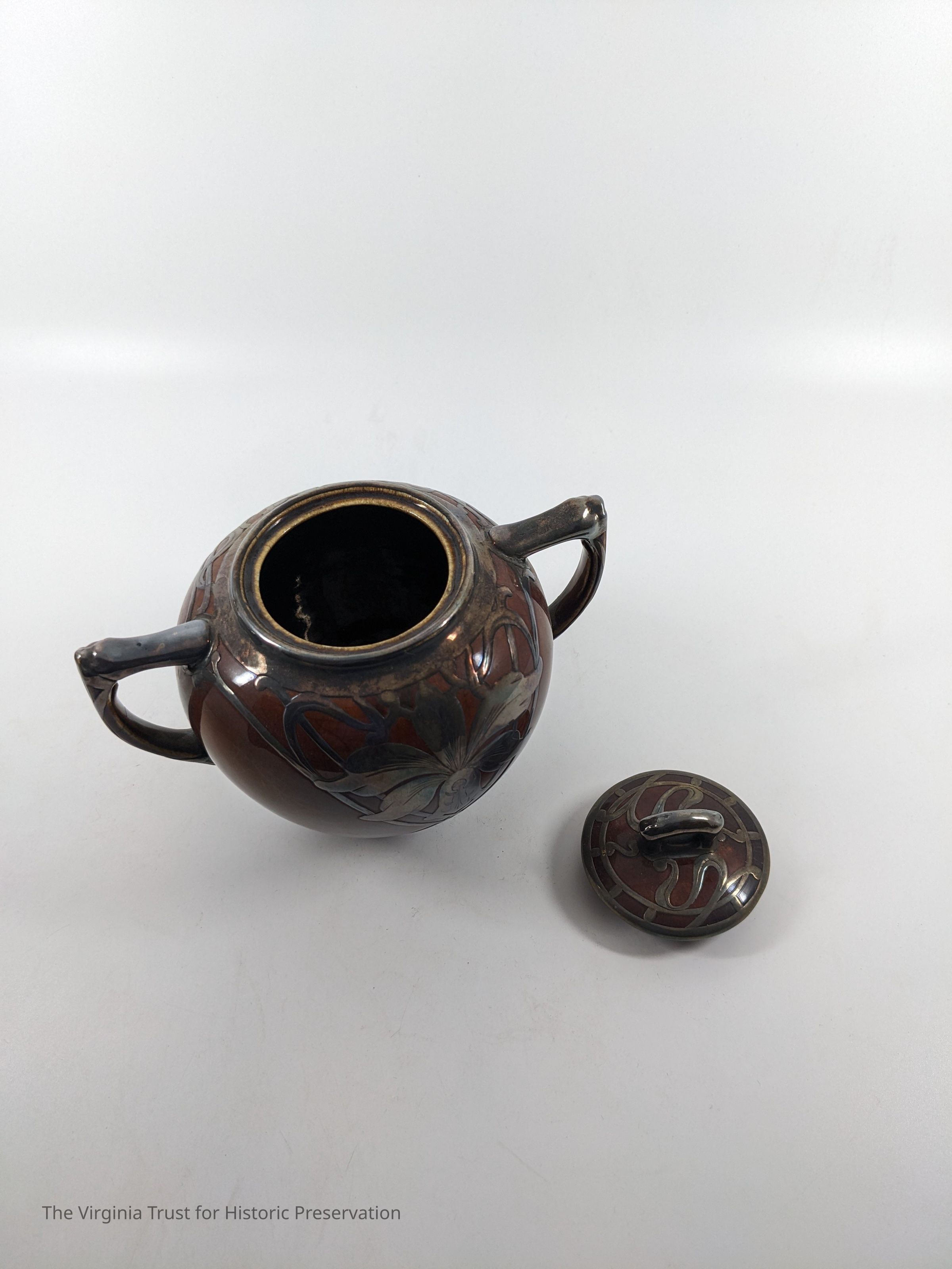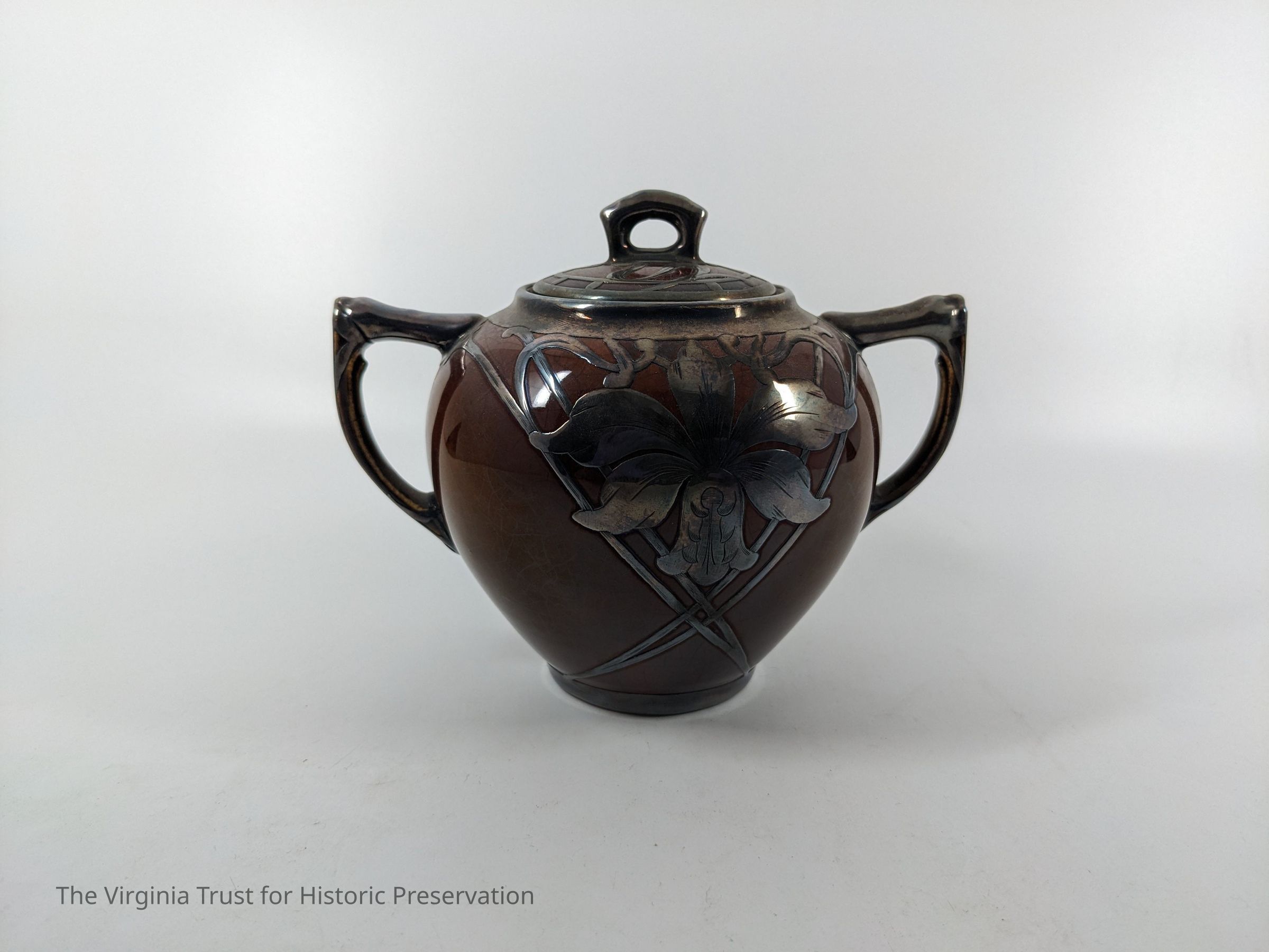 Sugar bowl, dark brown Lenox with silver overlay. Part of a 3-piece tea set (tea pot, sugar, creamer).