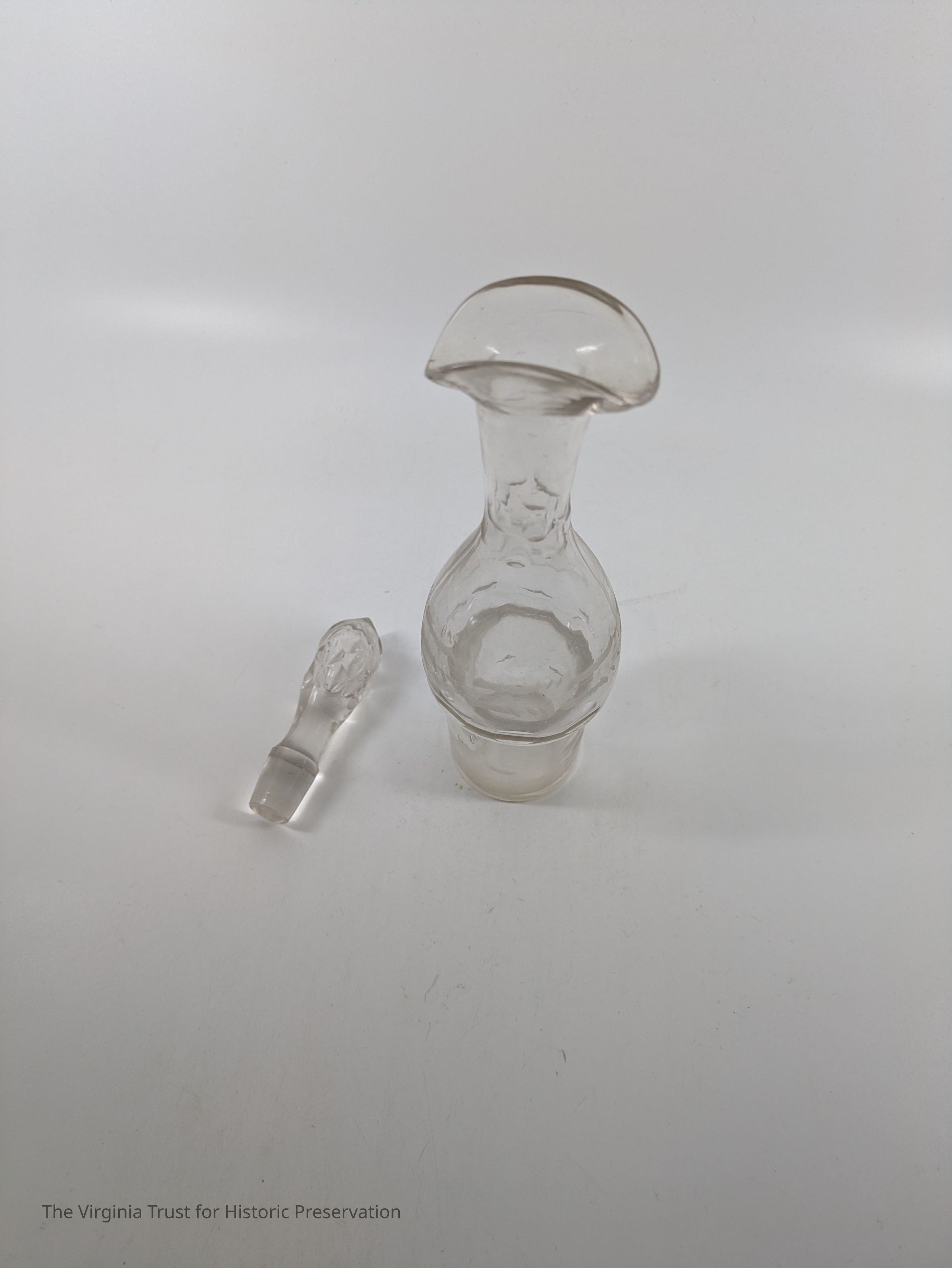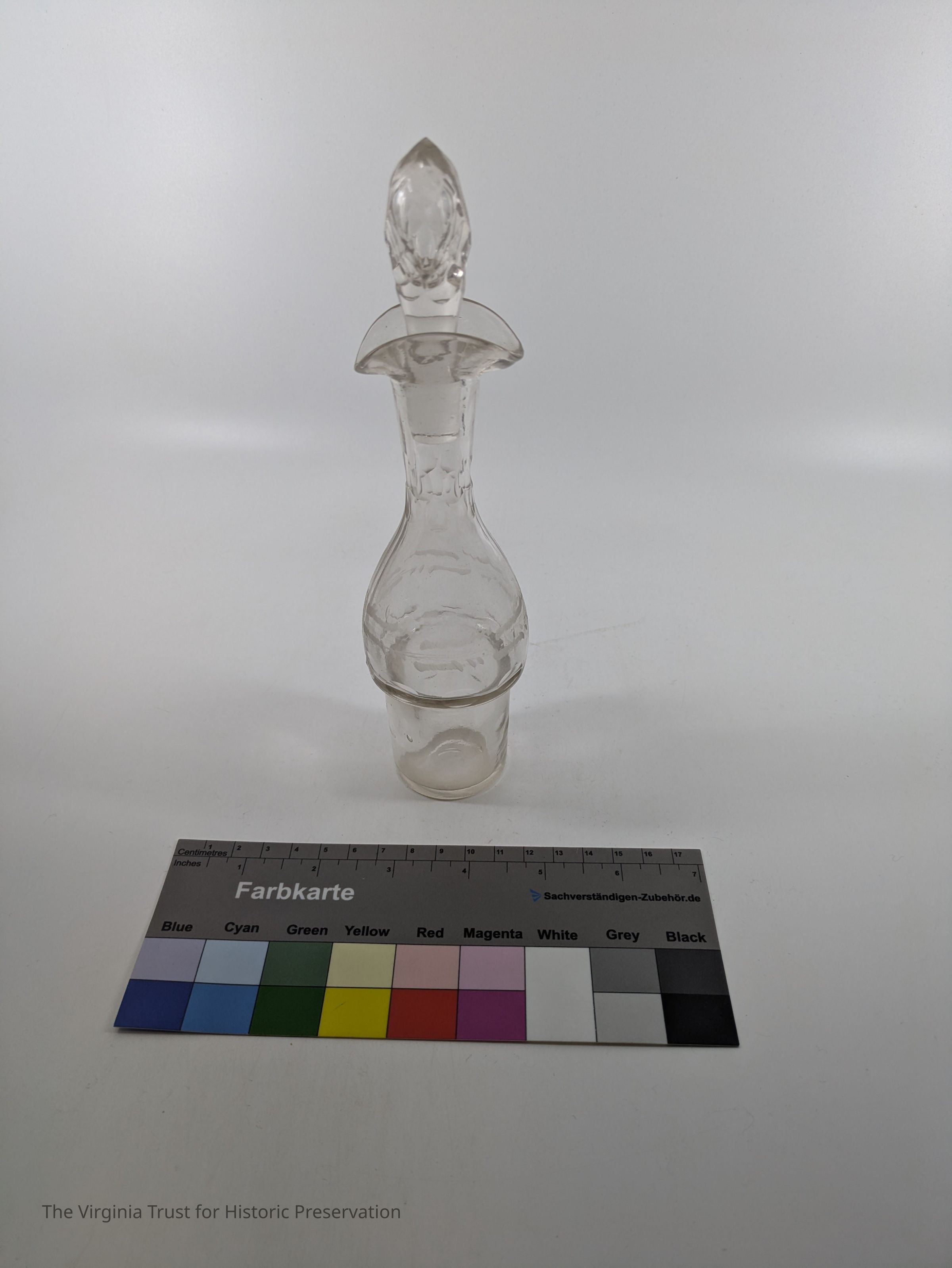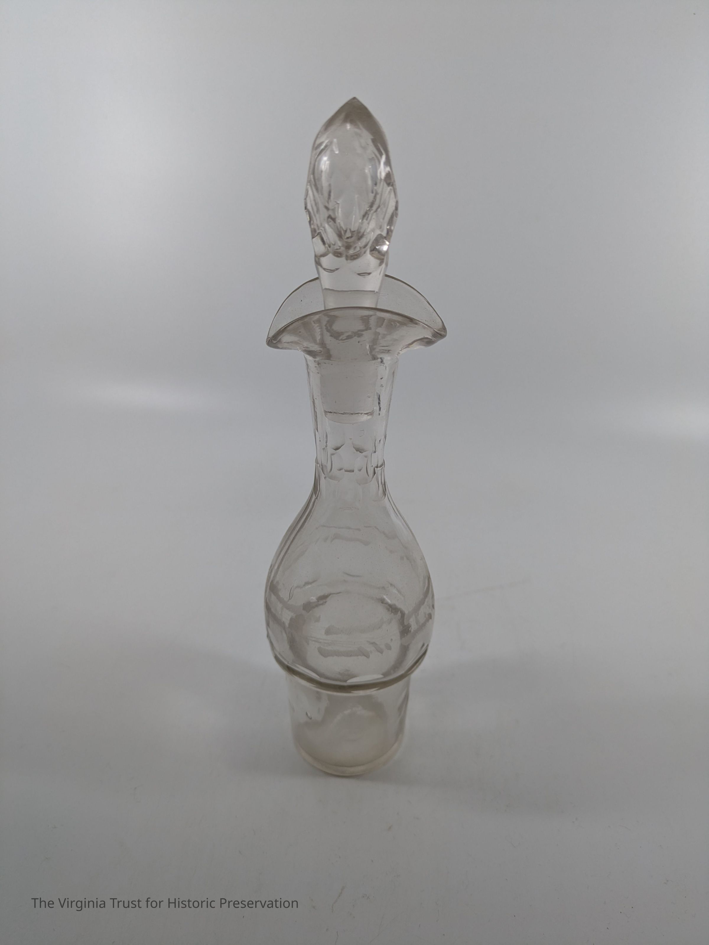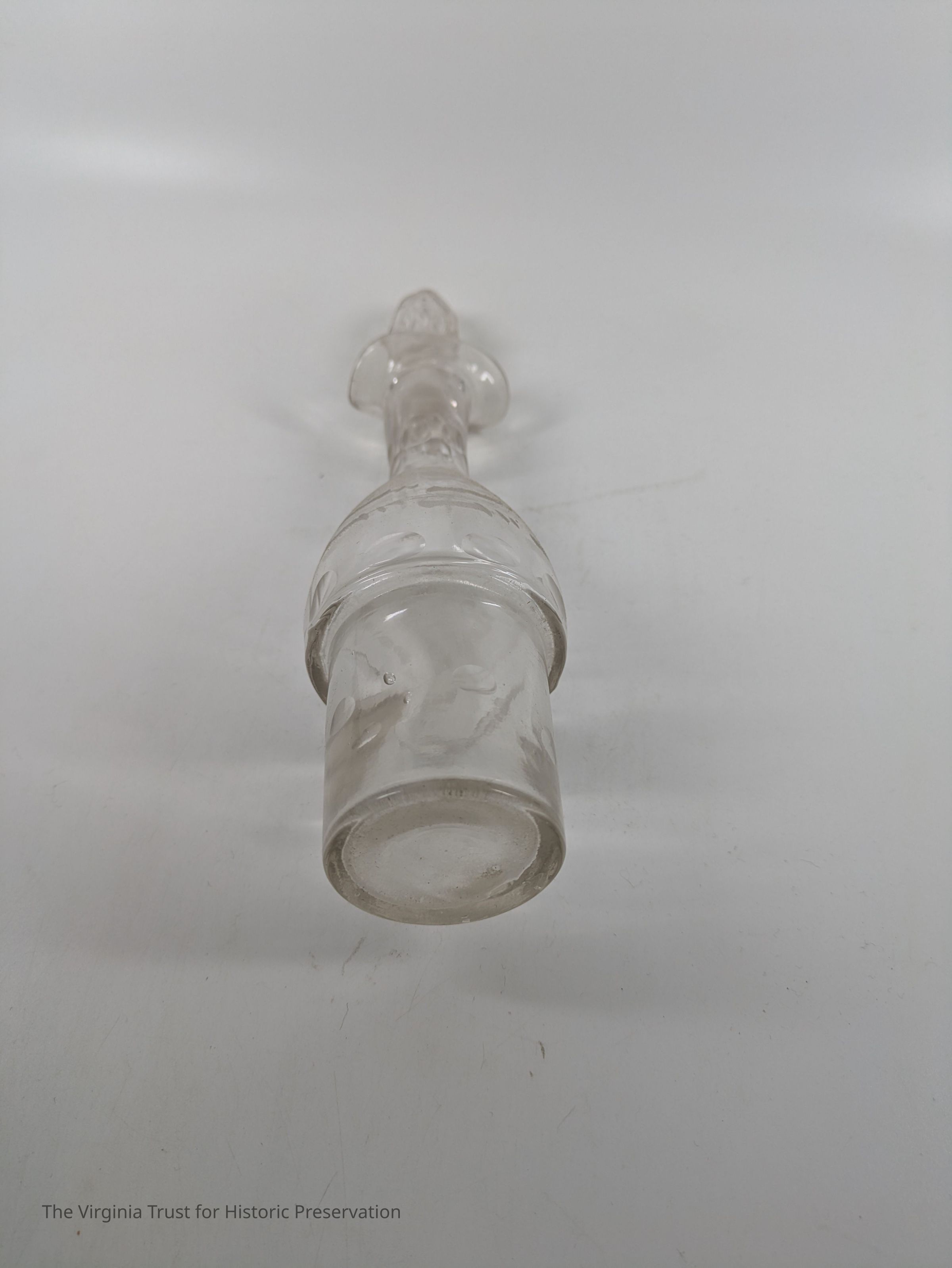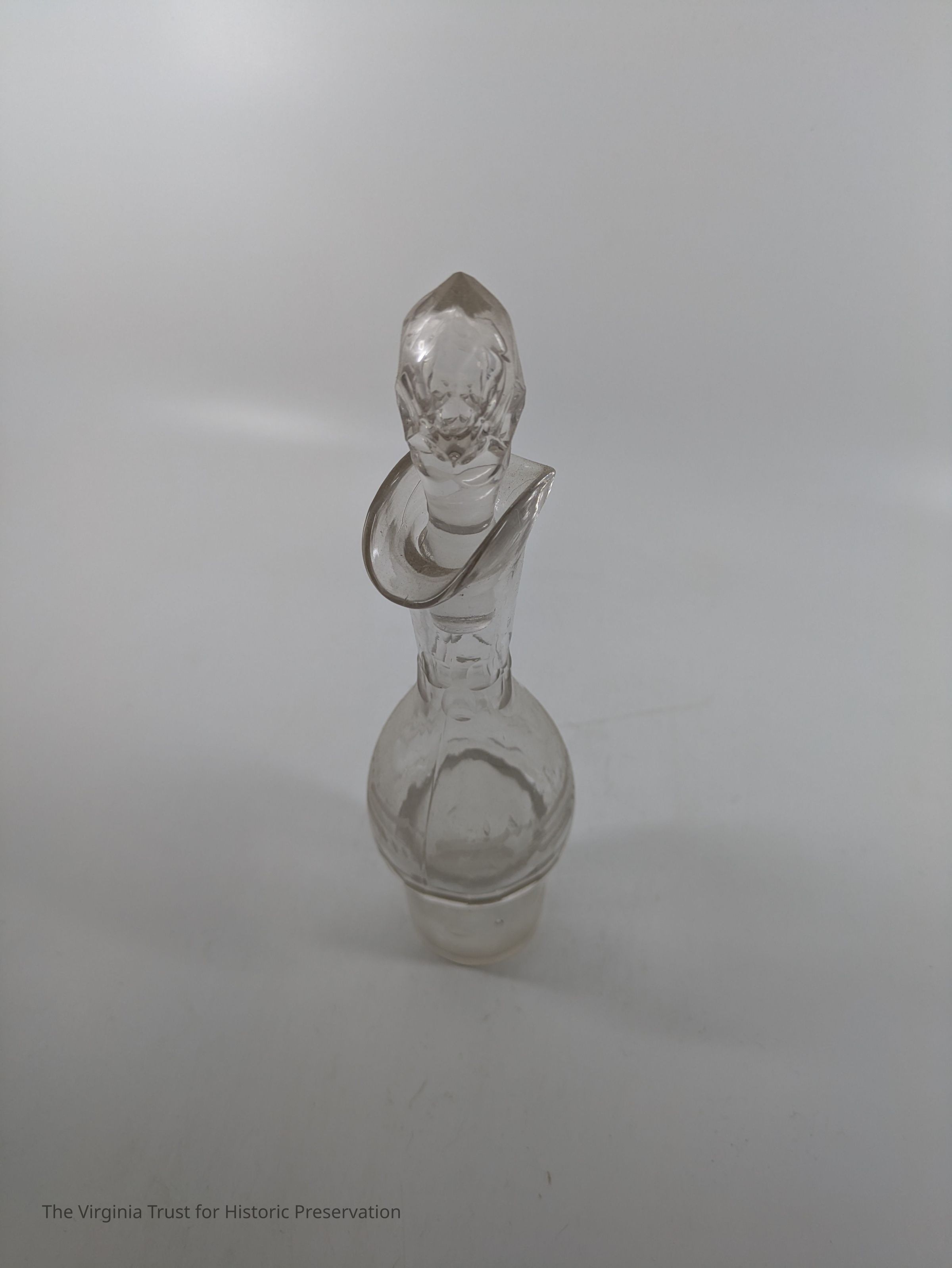 5 bottles; Four with frosted glass pattern, one plain; 3 metal tops and 2 glass stoppers. Stand marked "Rogers, Smith & Co. New Haven Conn 2037." Stand decorated with a leaf and vine pattern.