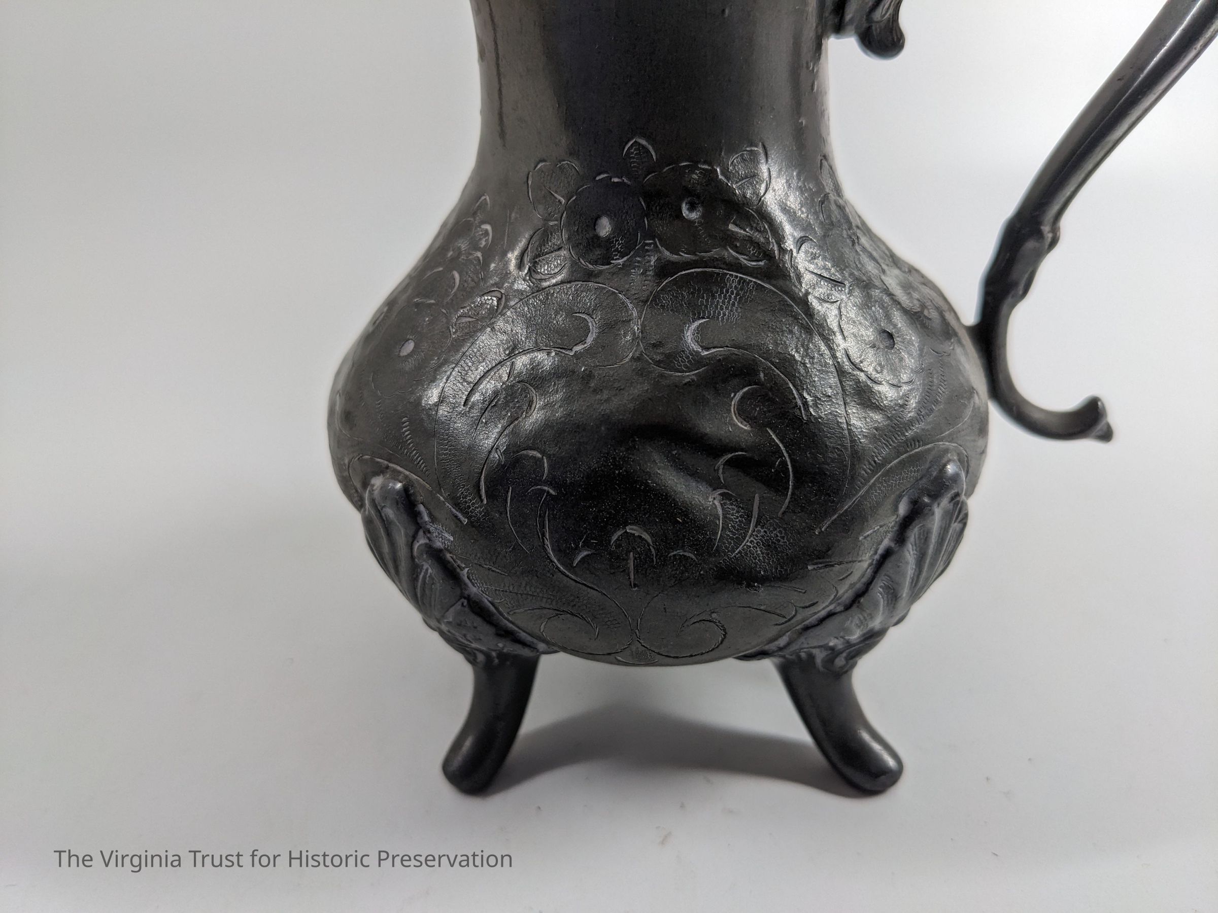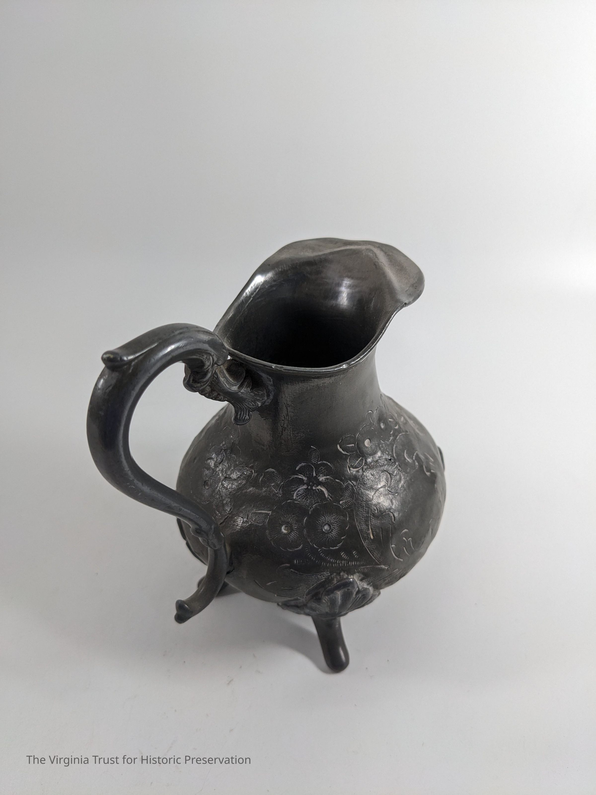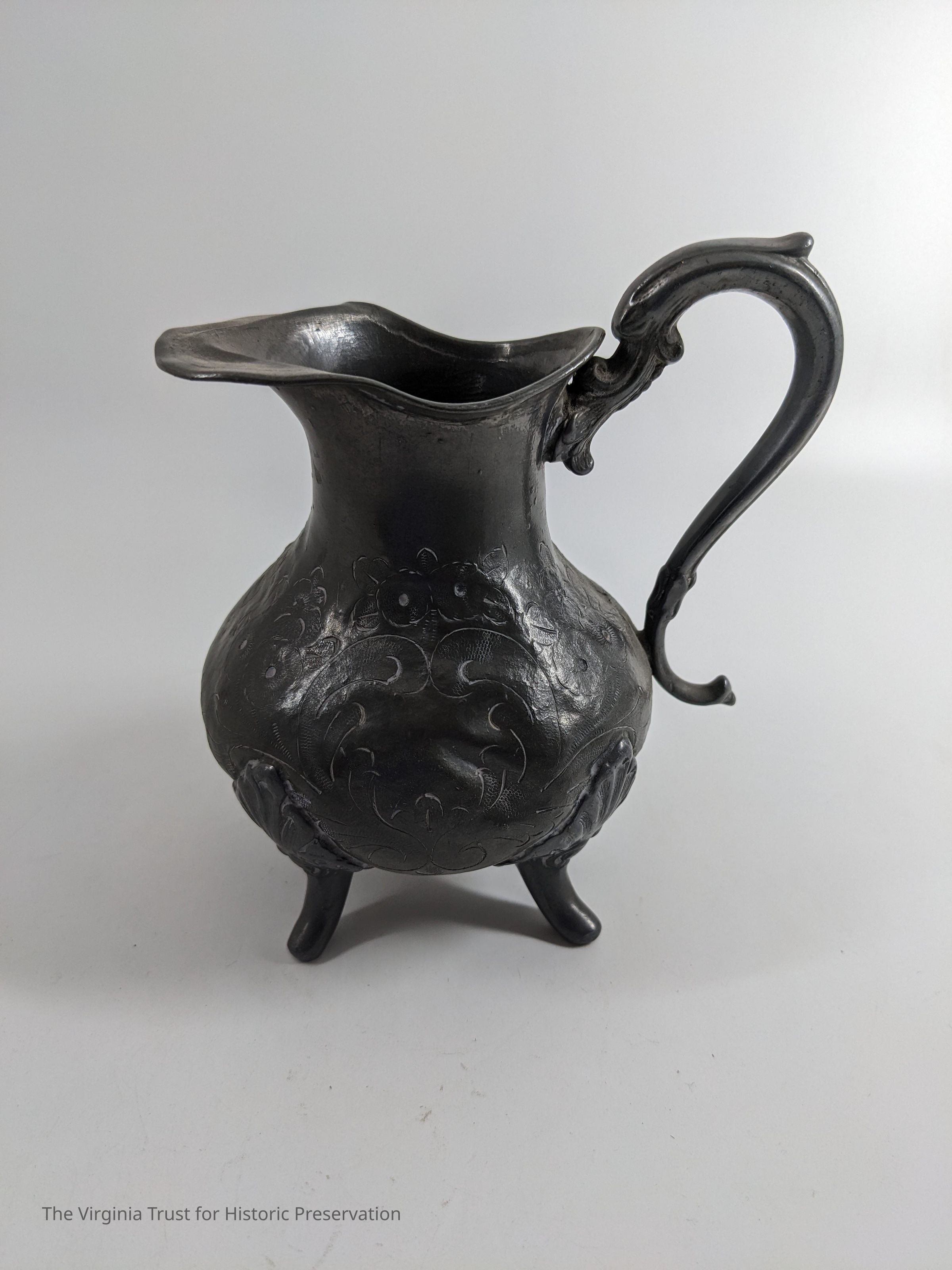 Pewter pitcher with a cut floral pattern.