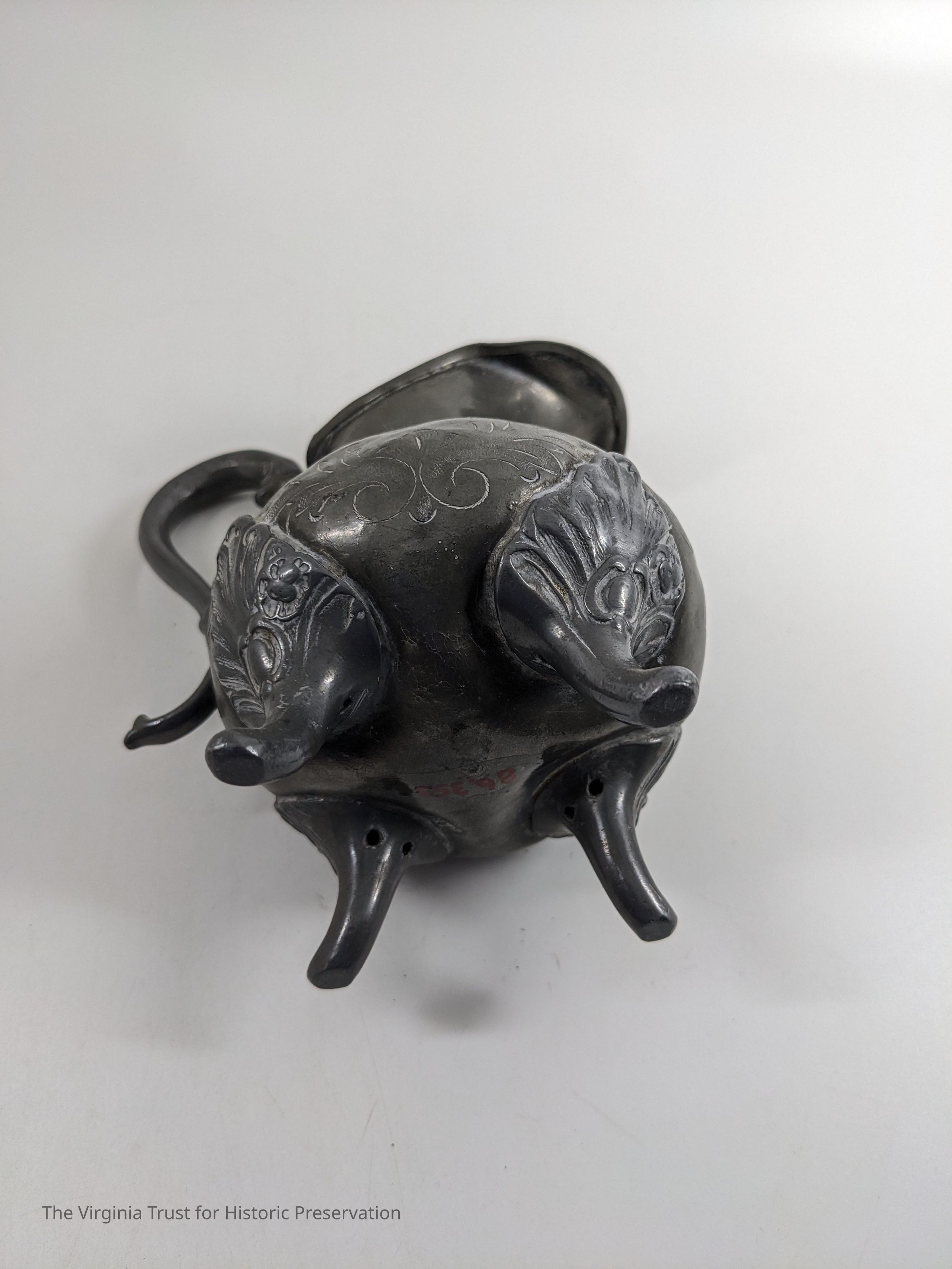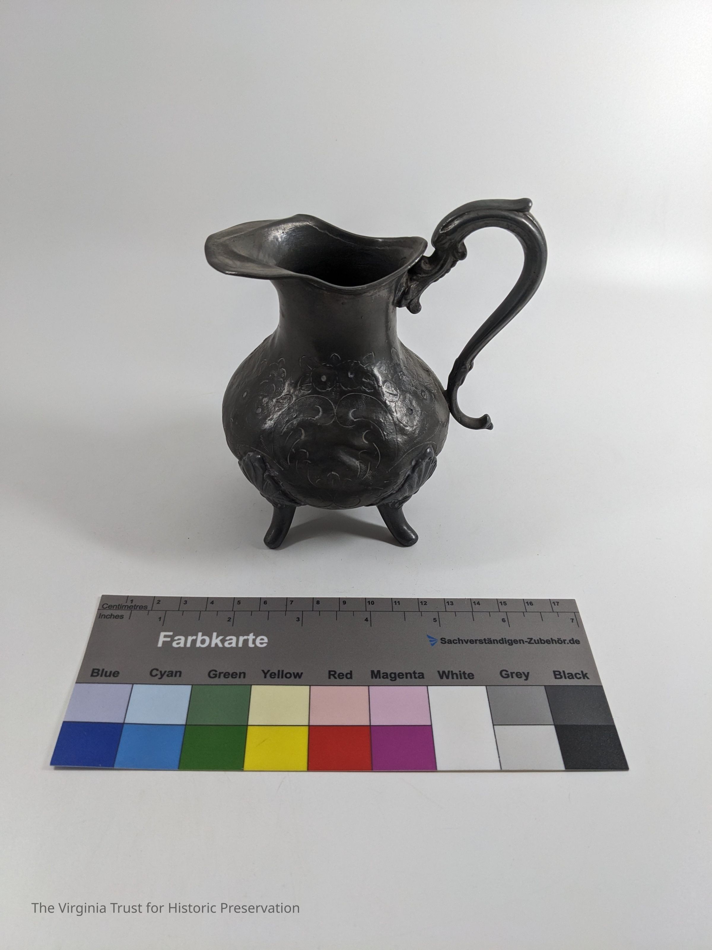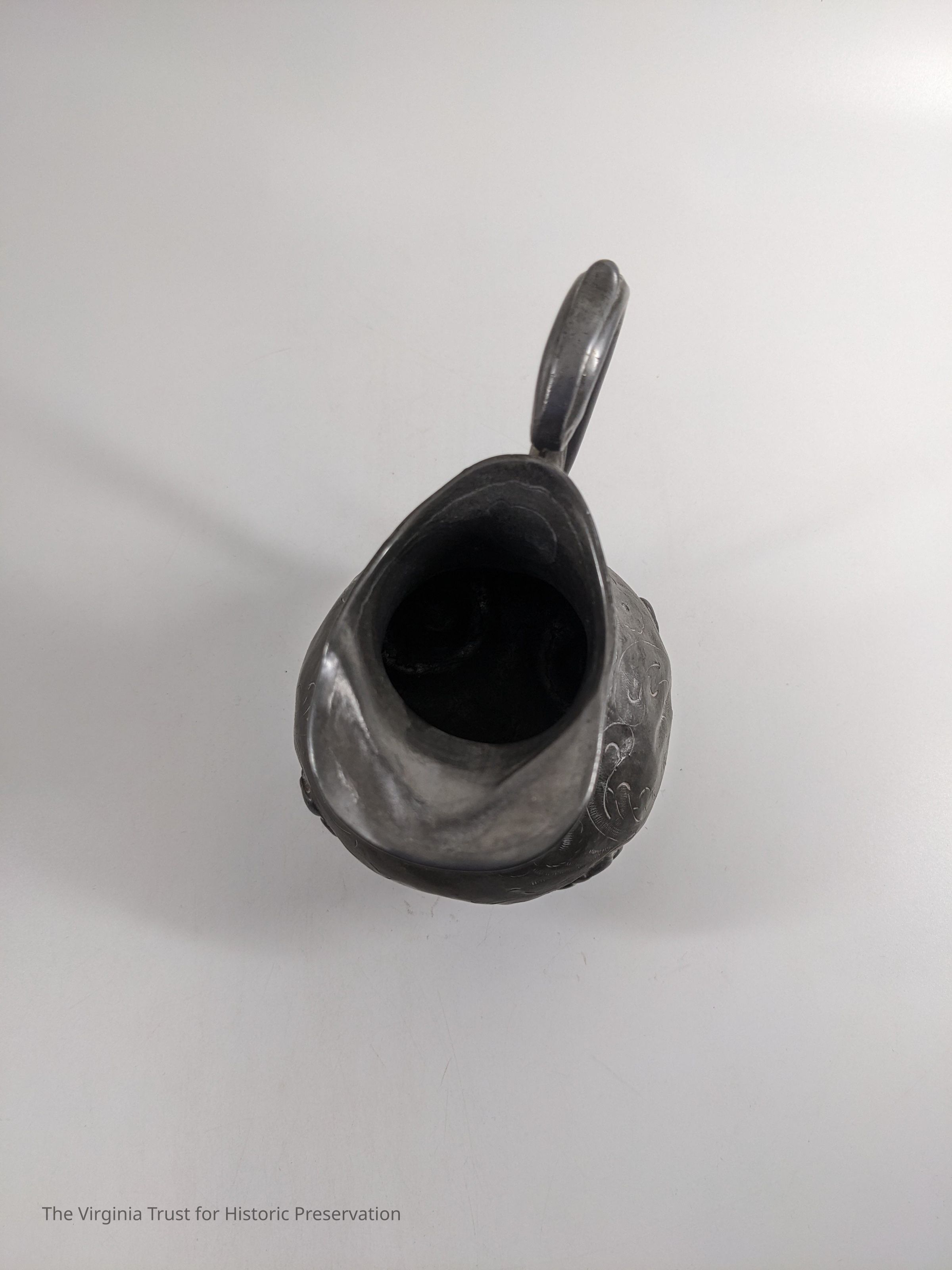 Pewter pitcher with a cut floral pattern.