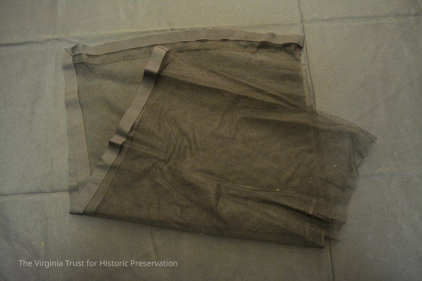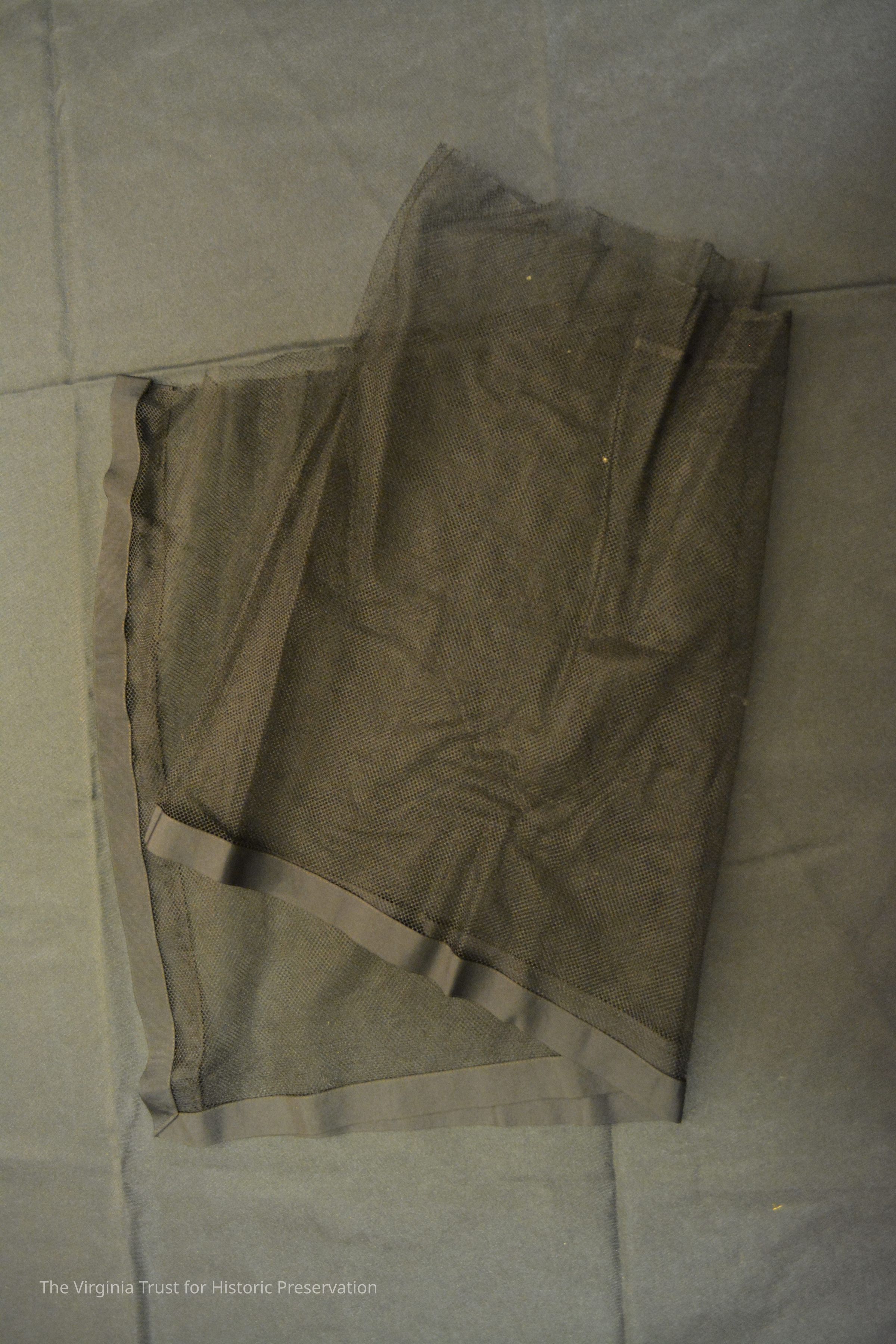 Black mourning veil made of a black netting with a black grosgrain ribbon border on three sides.