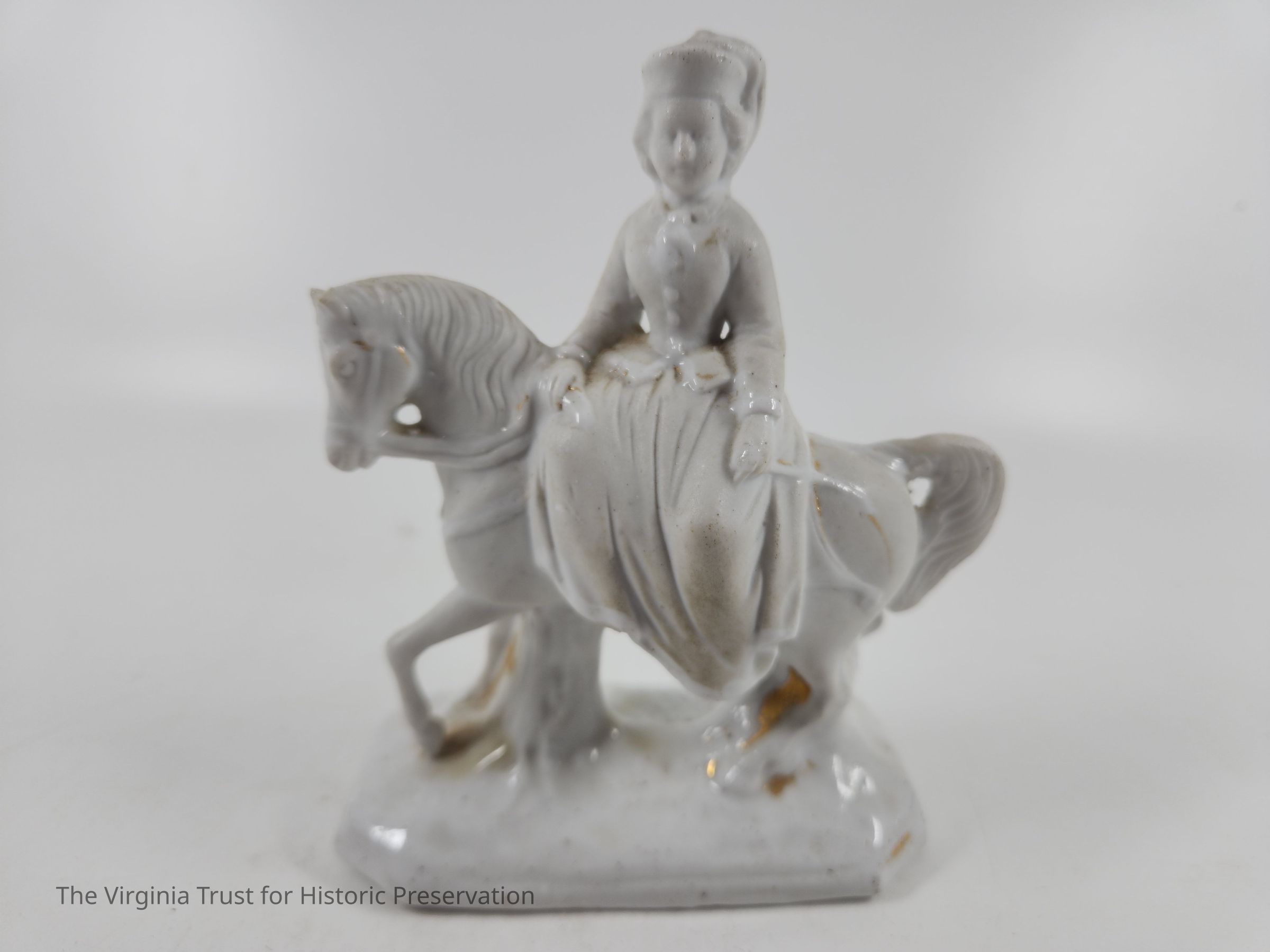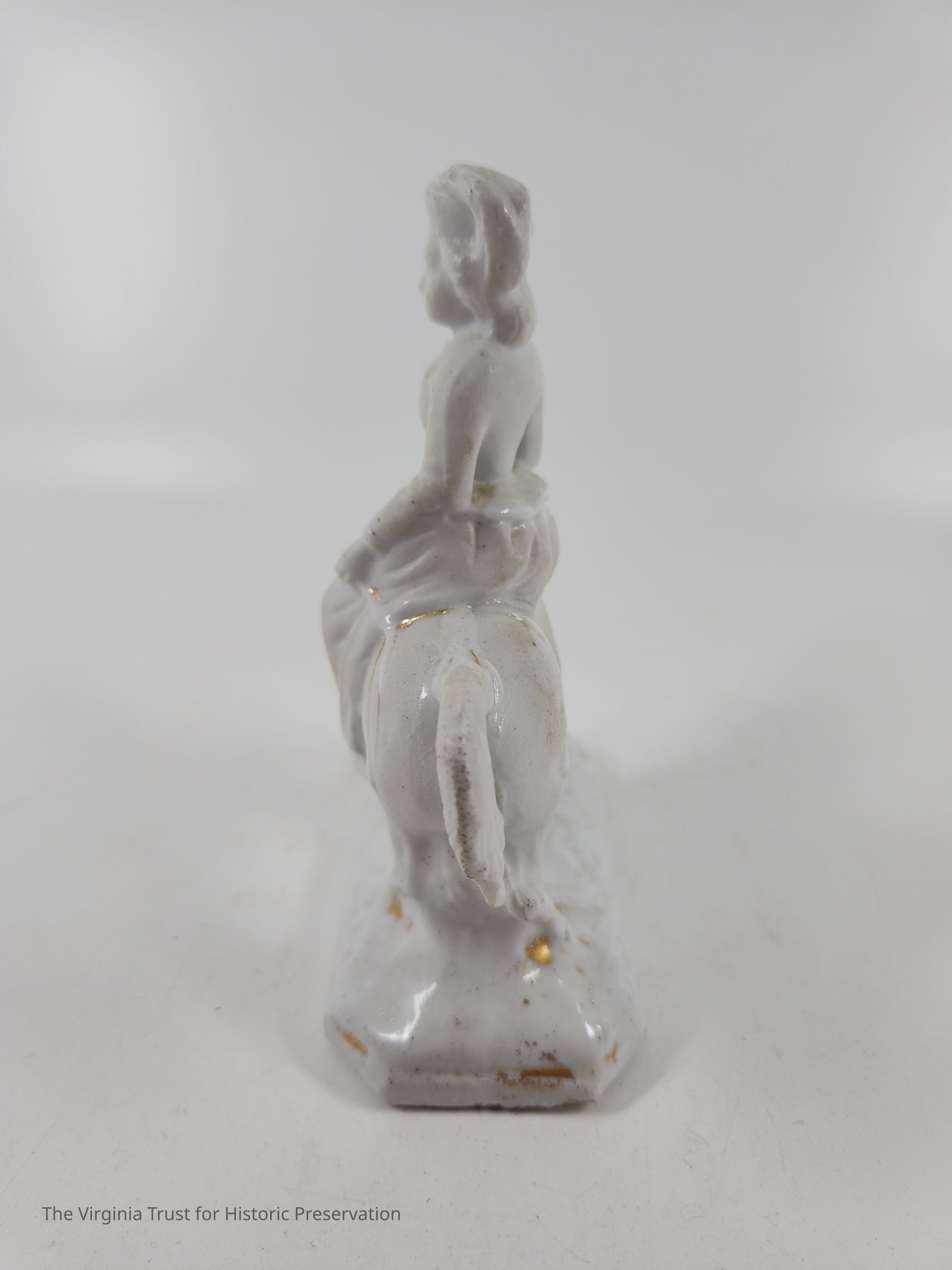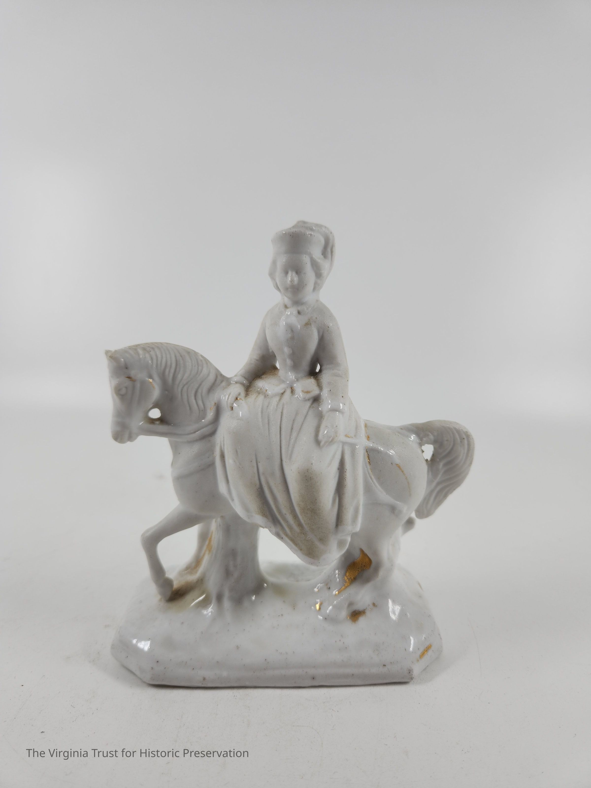 One of a pair of milk glass figurines. Female figure sitting sidesaddle in riding attire and holding a riding crop. Saddle and reins on the horse. Some gilding still present, but otherwise is faded away.Dimensions