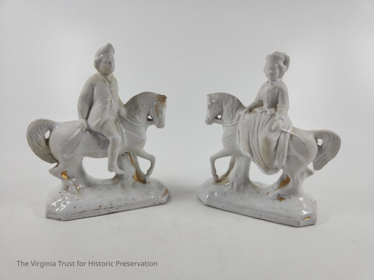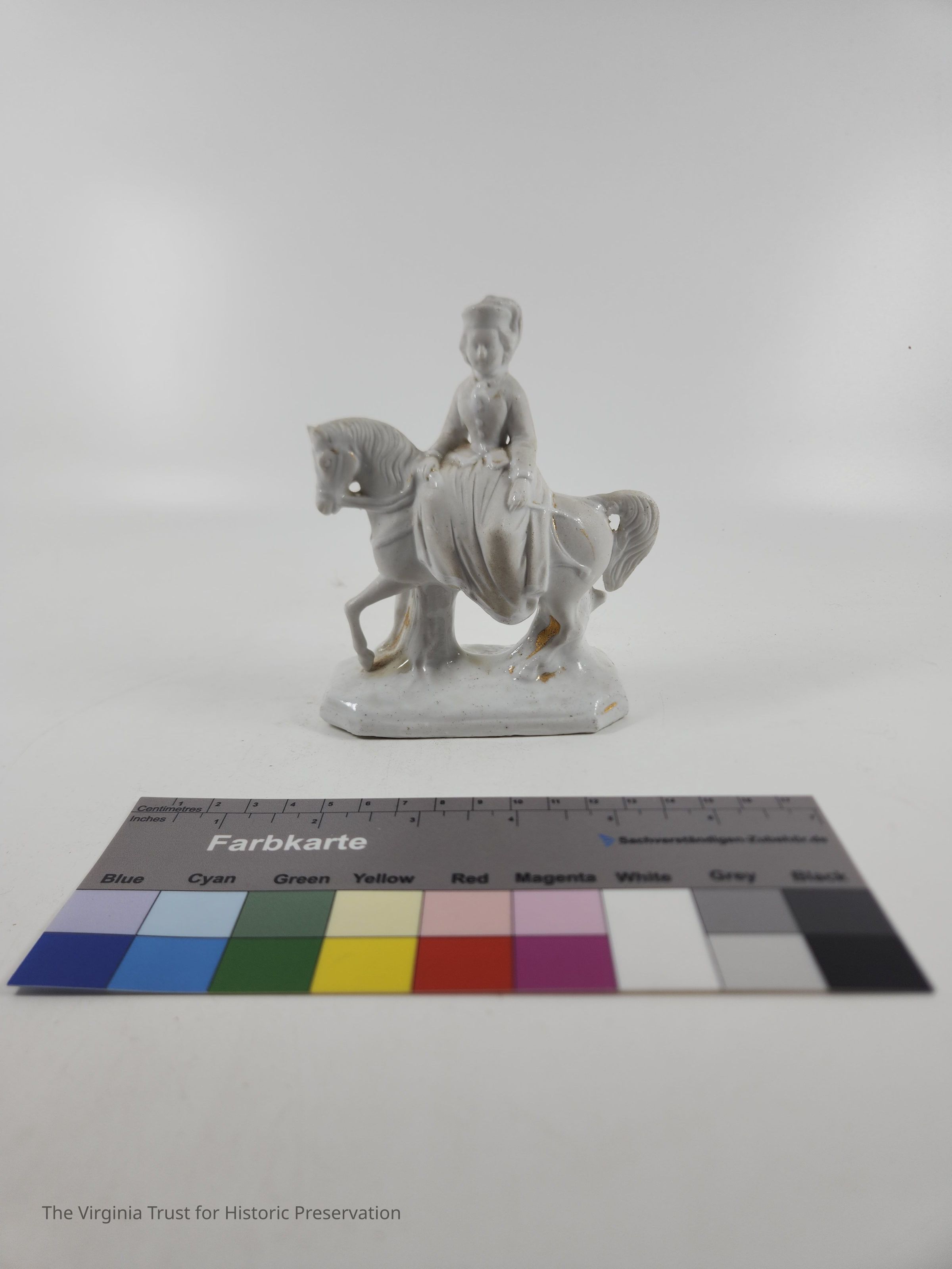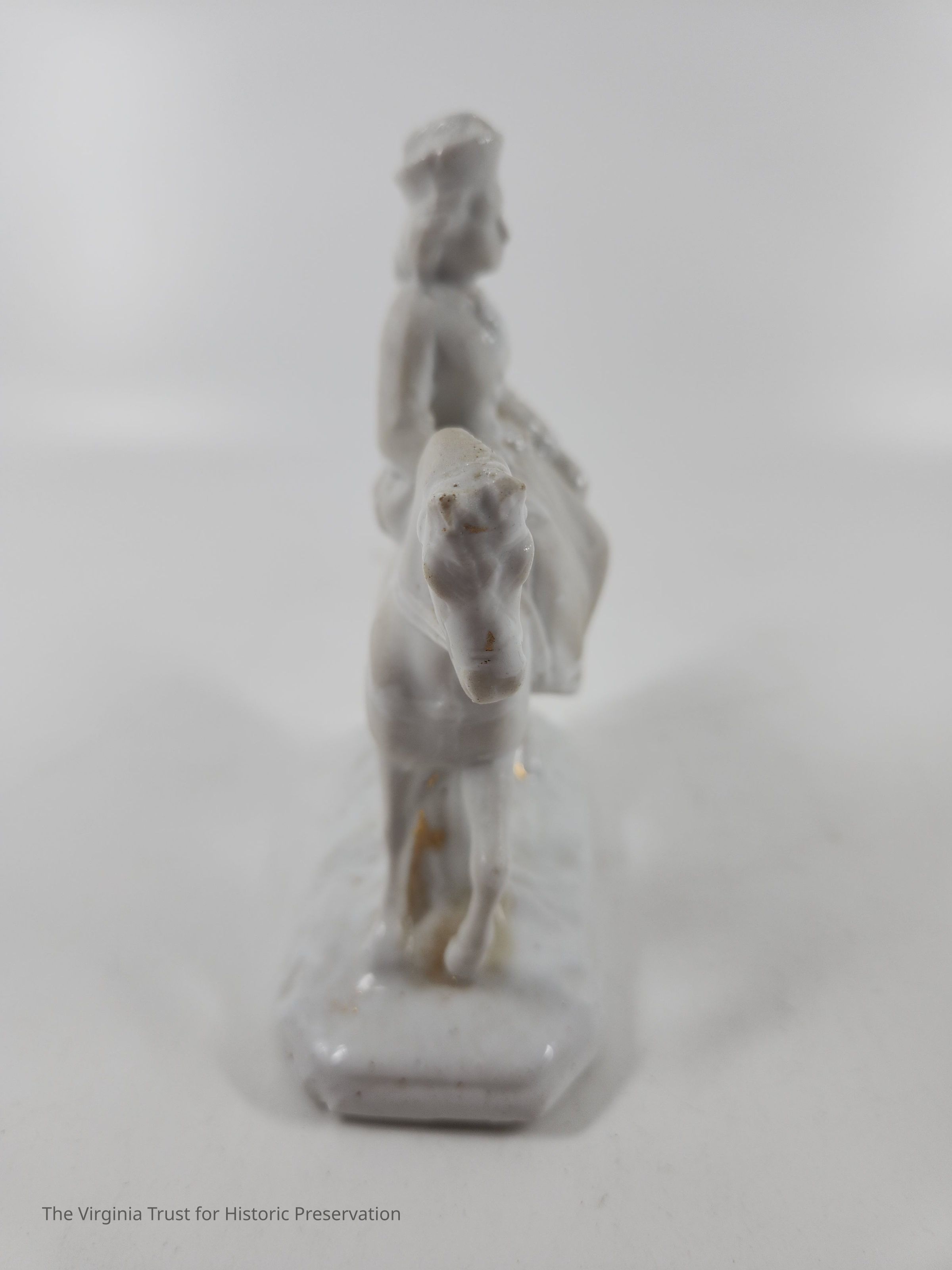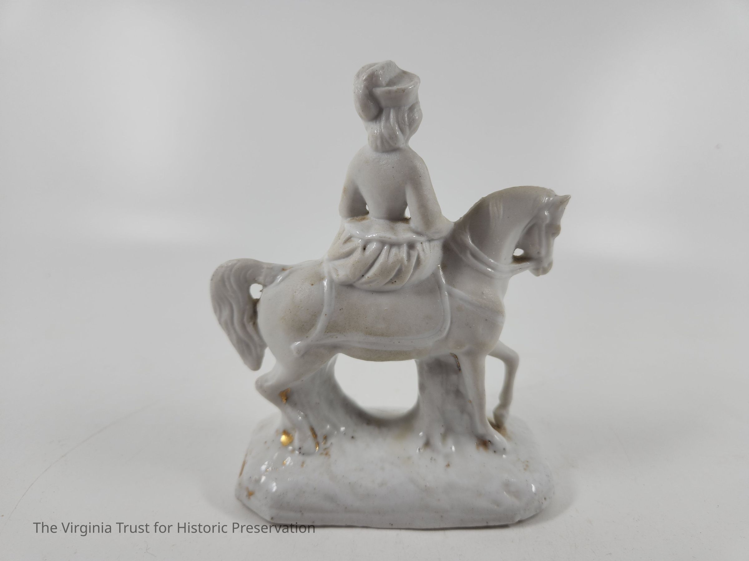 One of a pair of milk glass figurines. Female figure sitting sidesaddle in riding attire and holding a riding crop. Saddle and reins on the horse. Some gilding still present, but otherwise is faded away.Dimensions