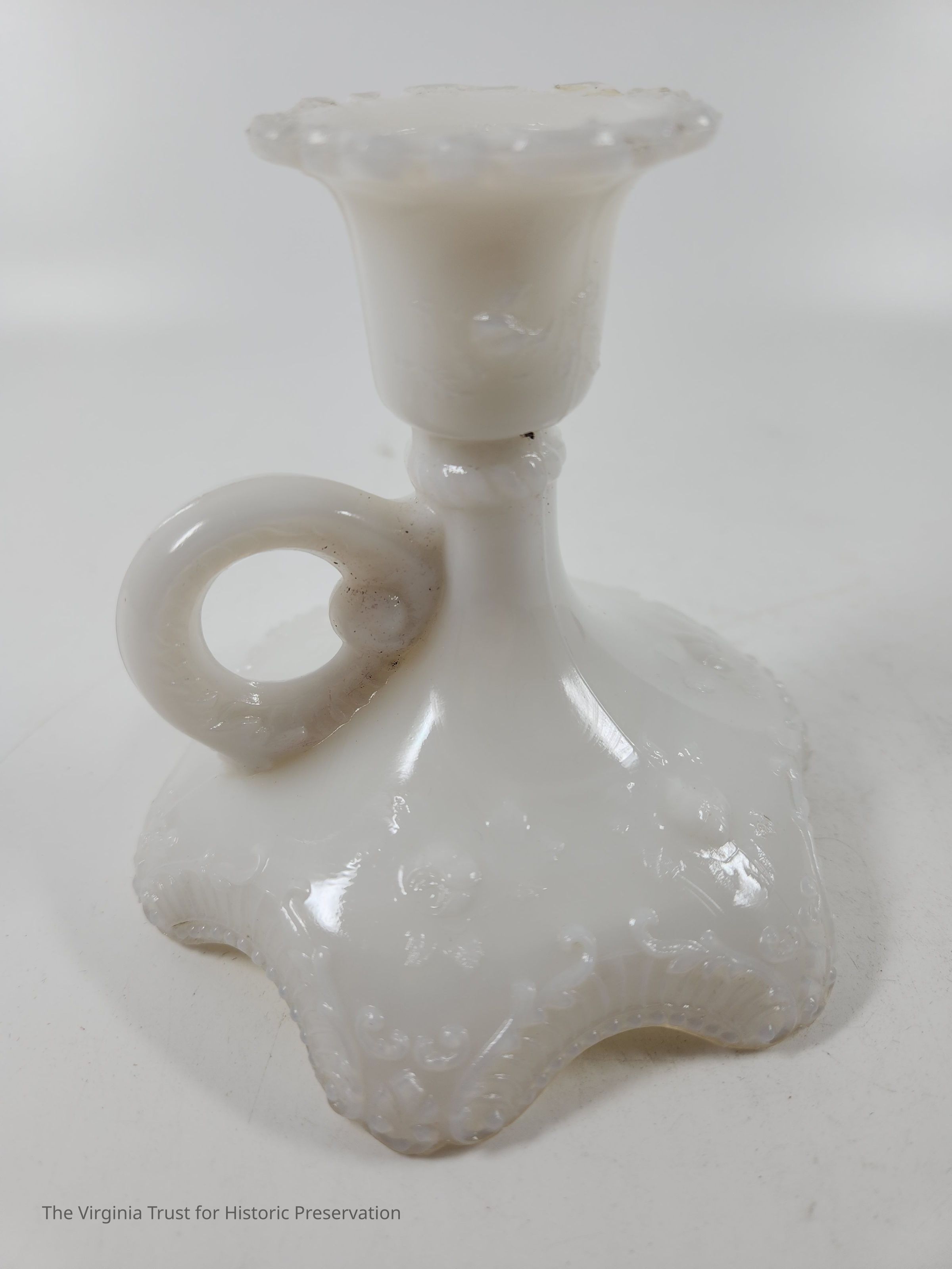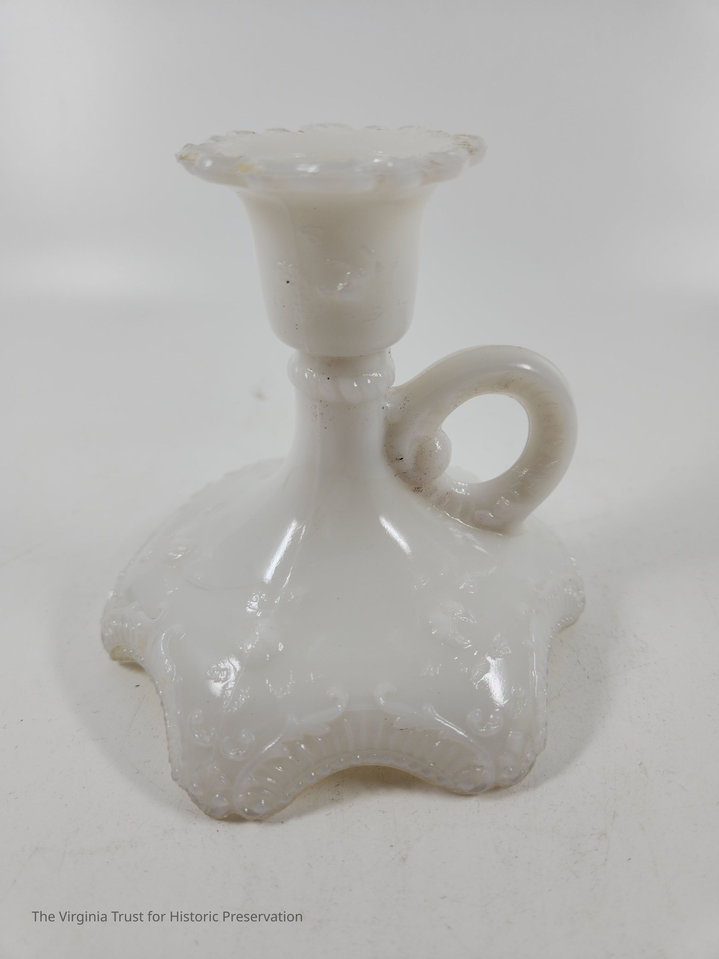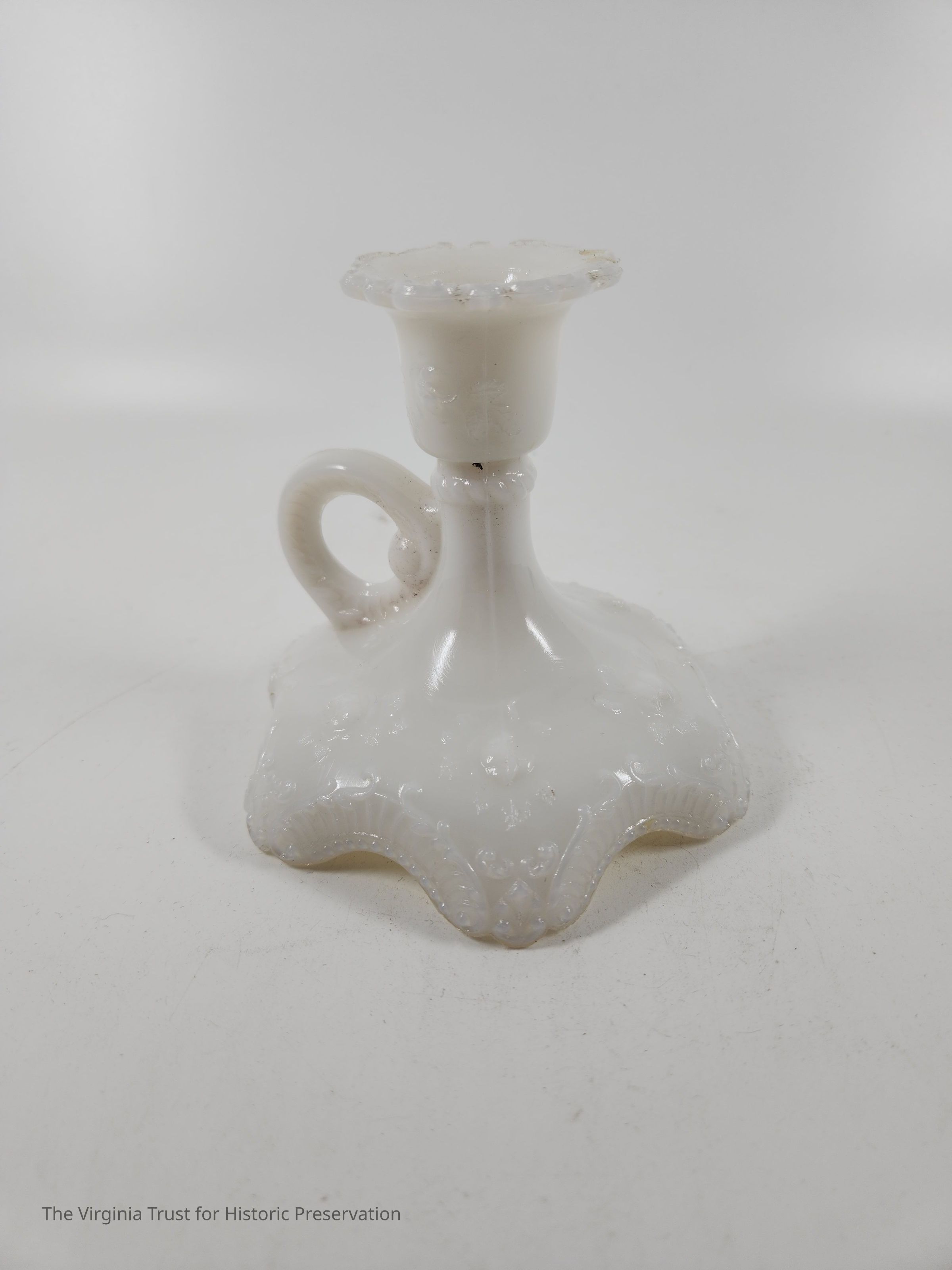 Milk glass candlestick with a finger handle. Decorative scrollwork around top and base edges. Three-piece mold. One of a pair.