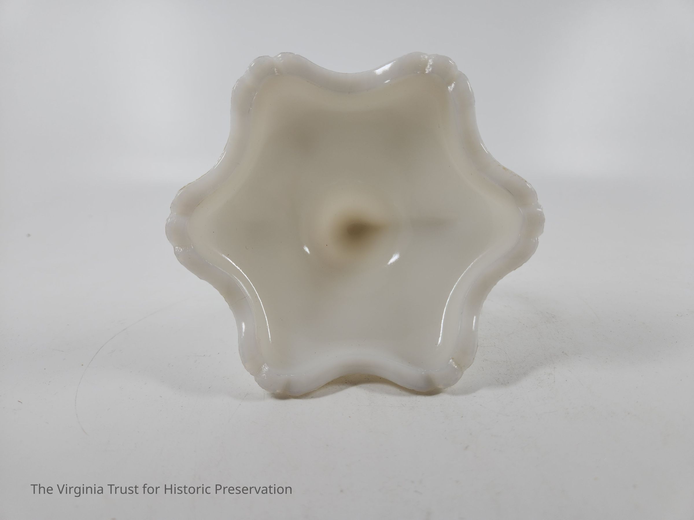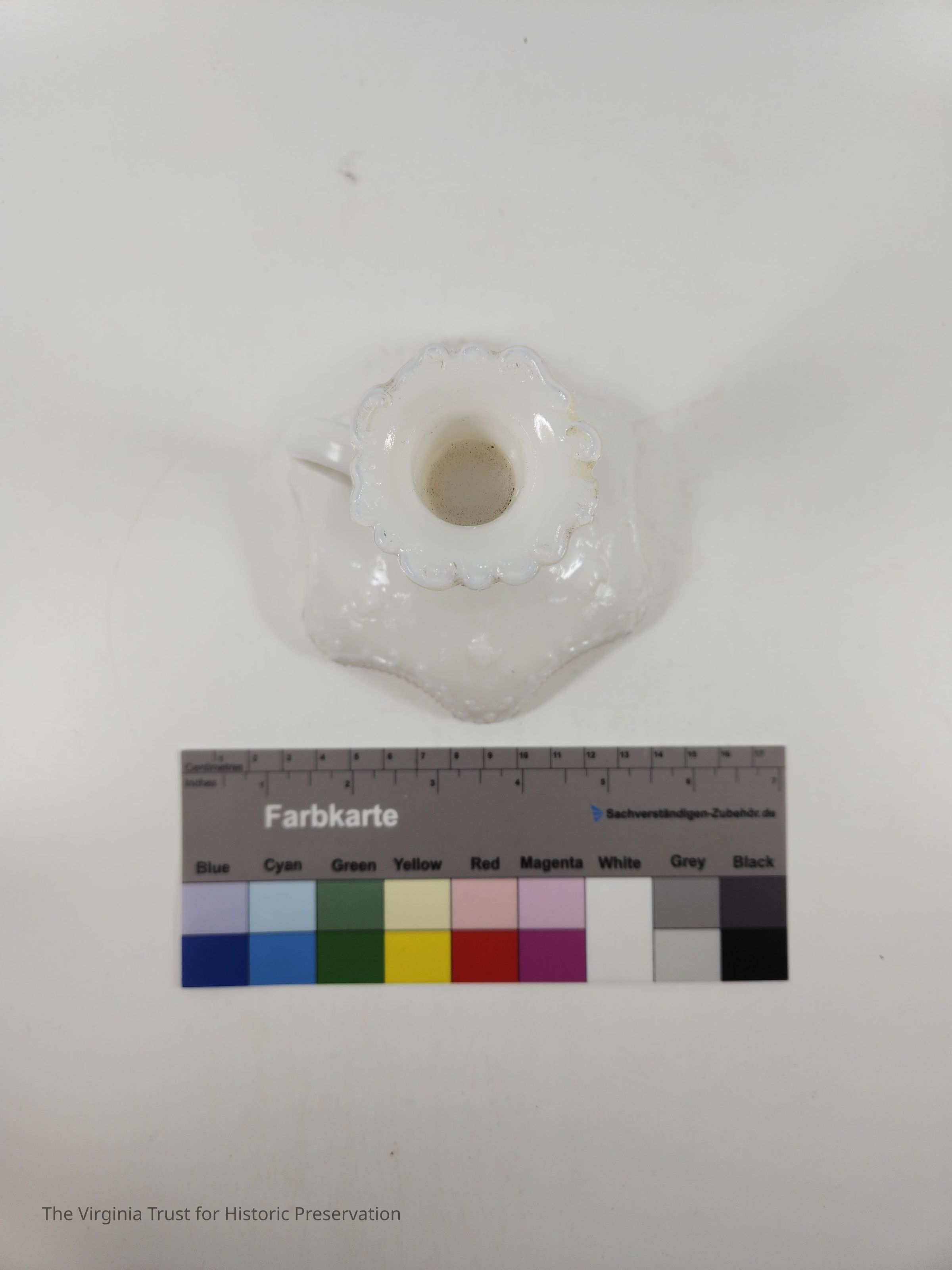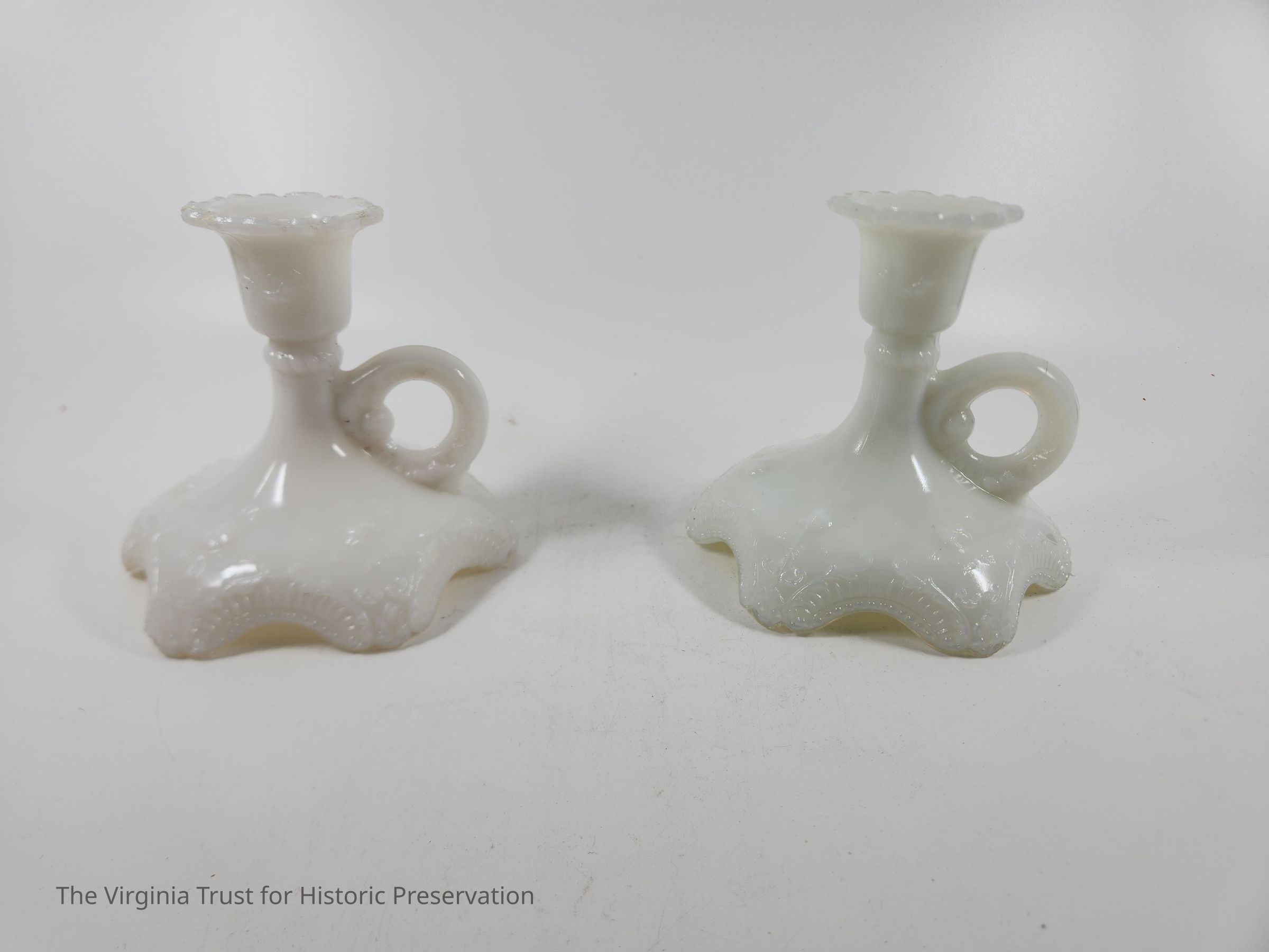 Milk glass candlestick with a finger handle. Decorative scrollwork around top and base edges. Three-piece mold. One of a pair.