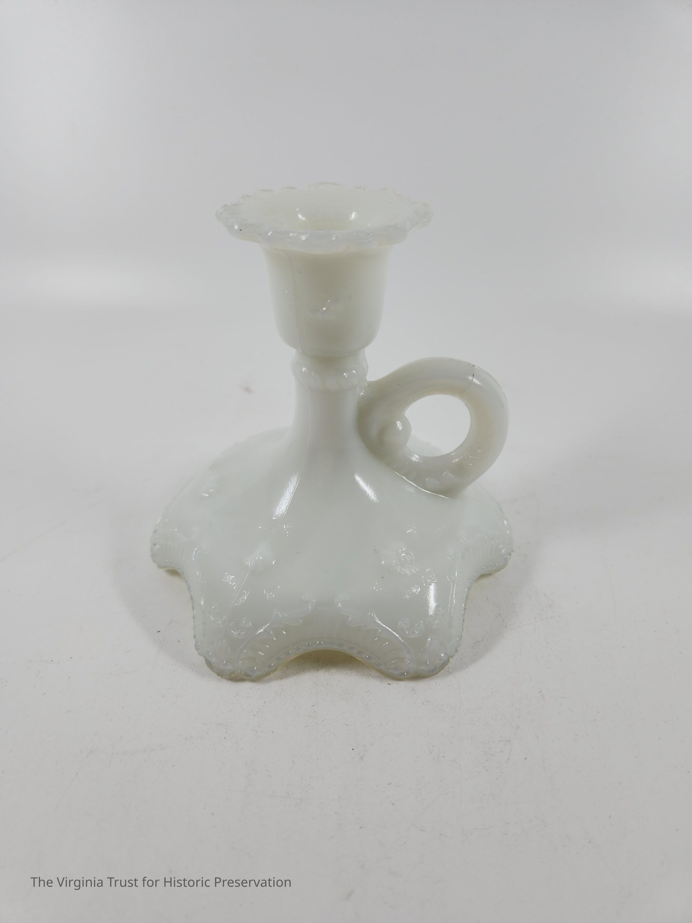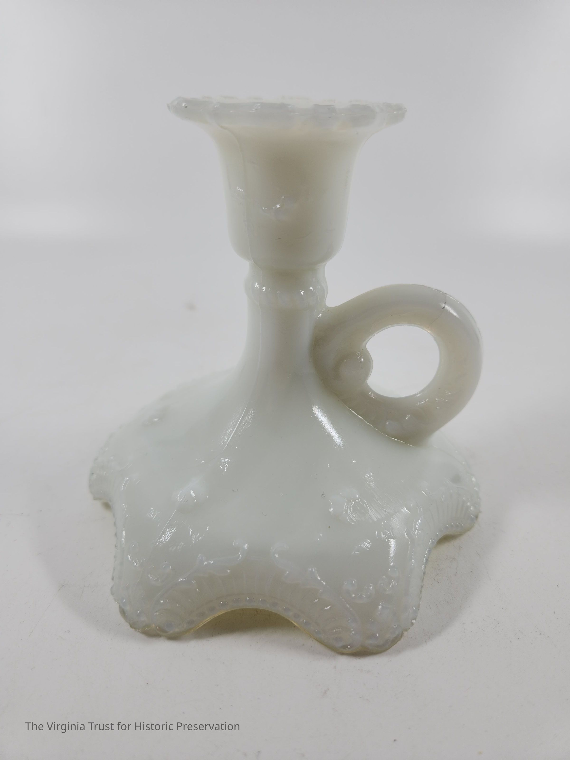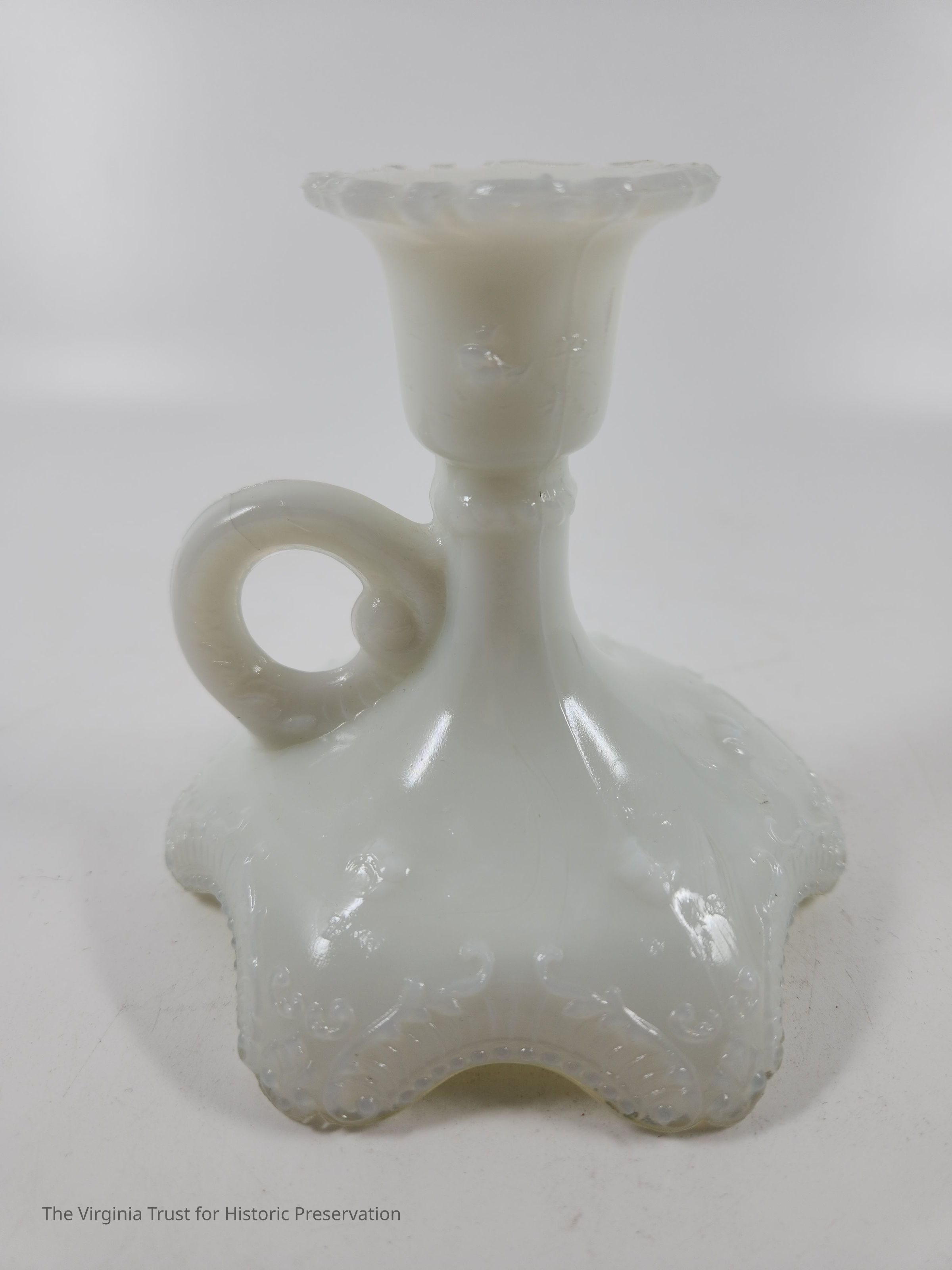 Milk glass candlestick with a finger handle. Decorative scrollwork around top and base edges. Three-piece mold. One of a pair.