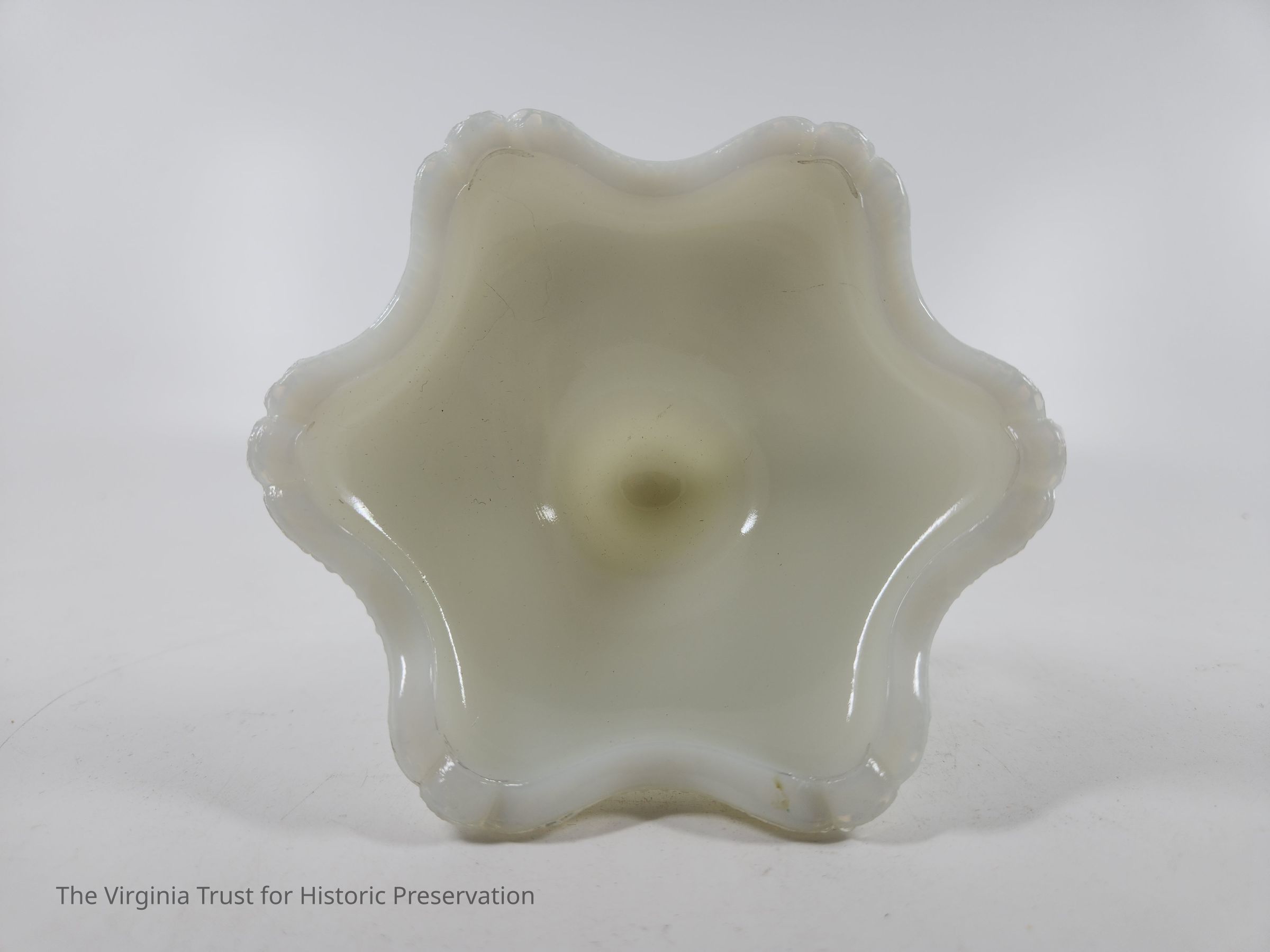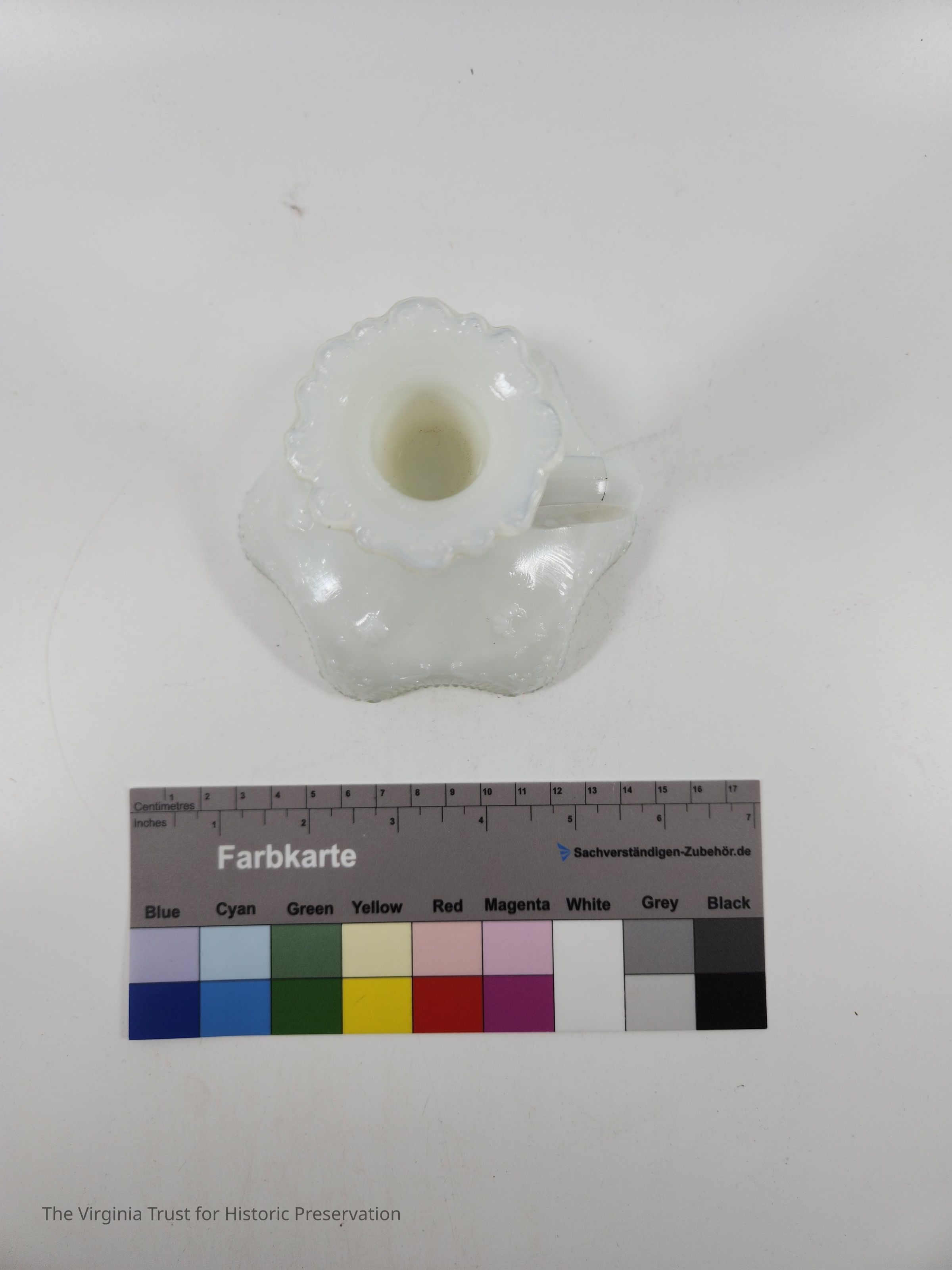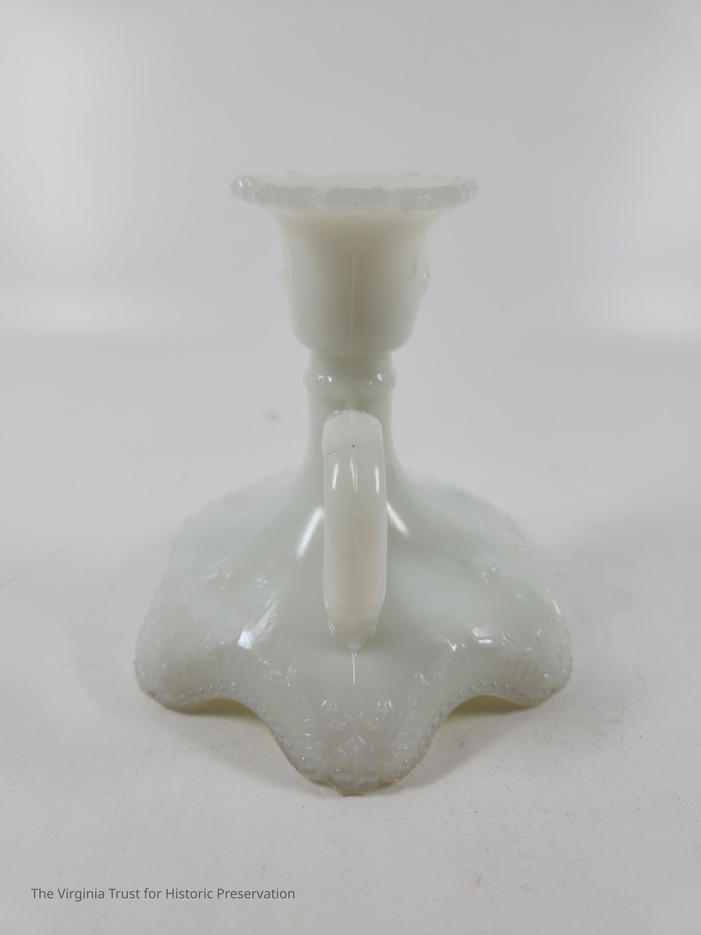 Milk glass candlestick with a finger handle. Decorative scrollwork around top and base edges. Three-piece mold. One of a pair.