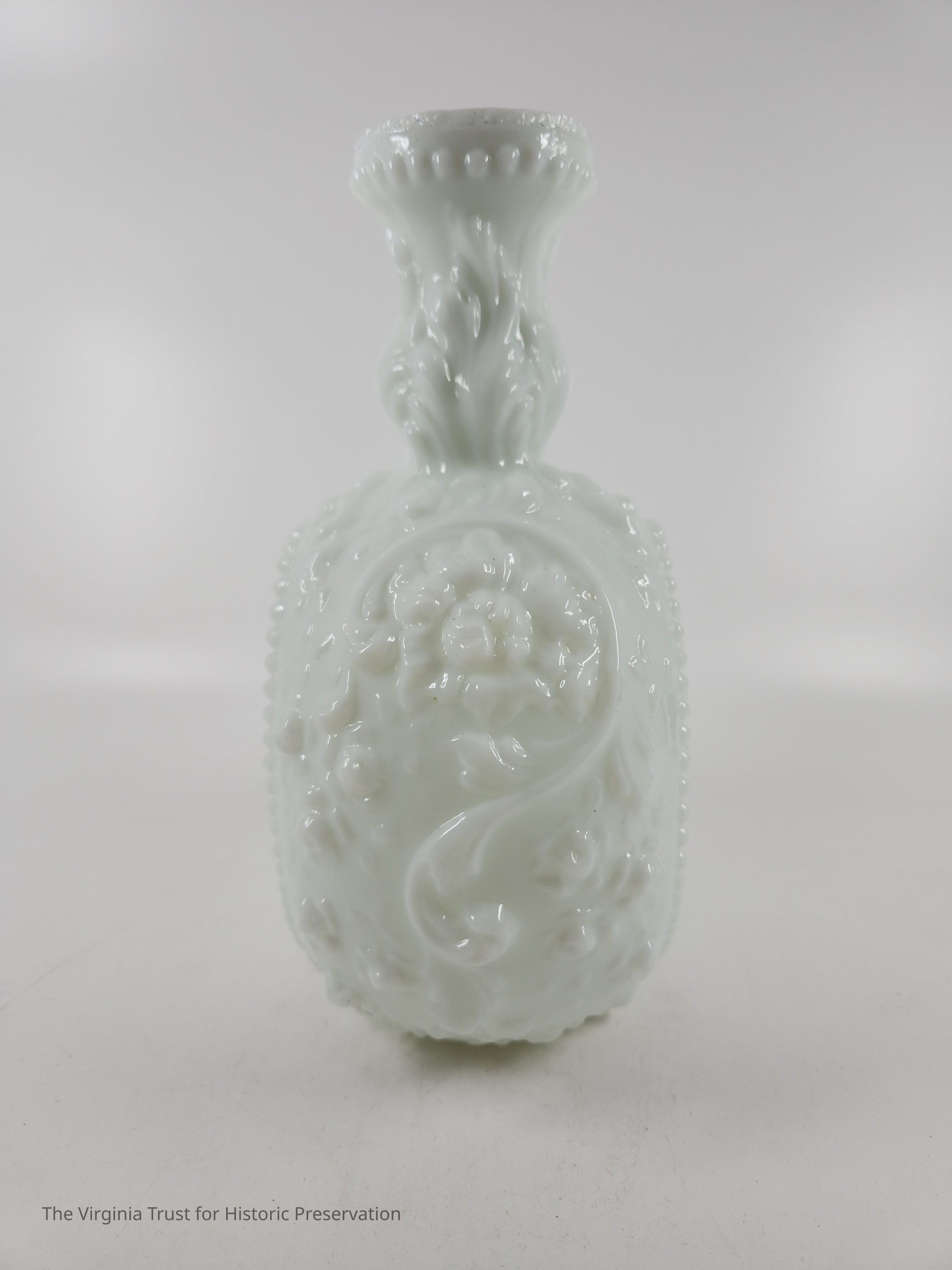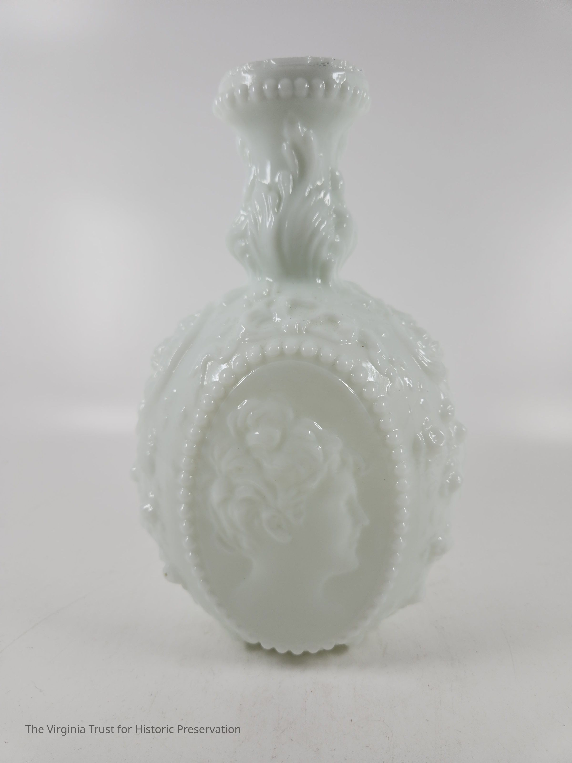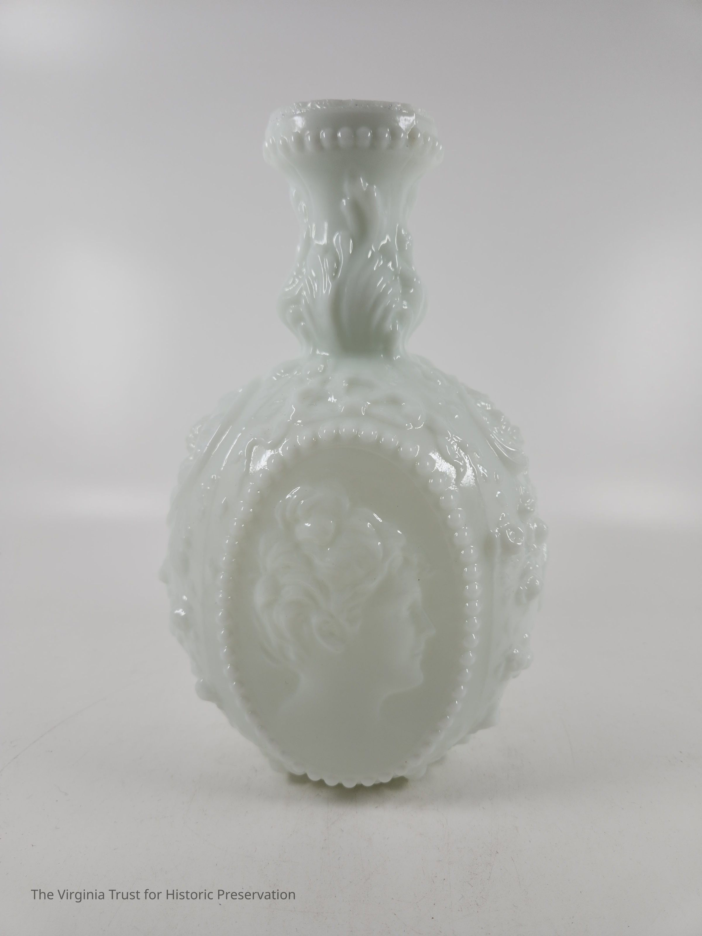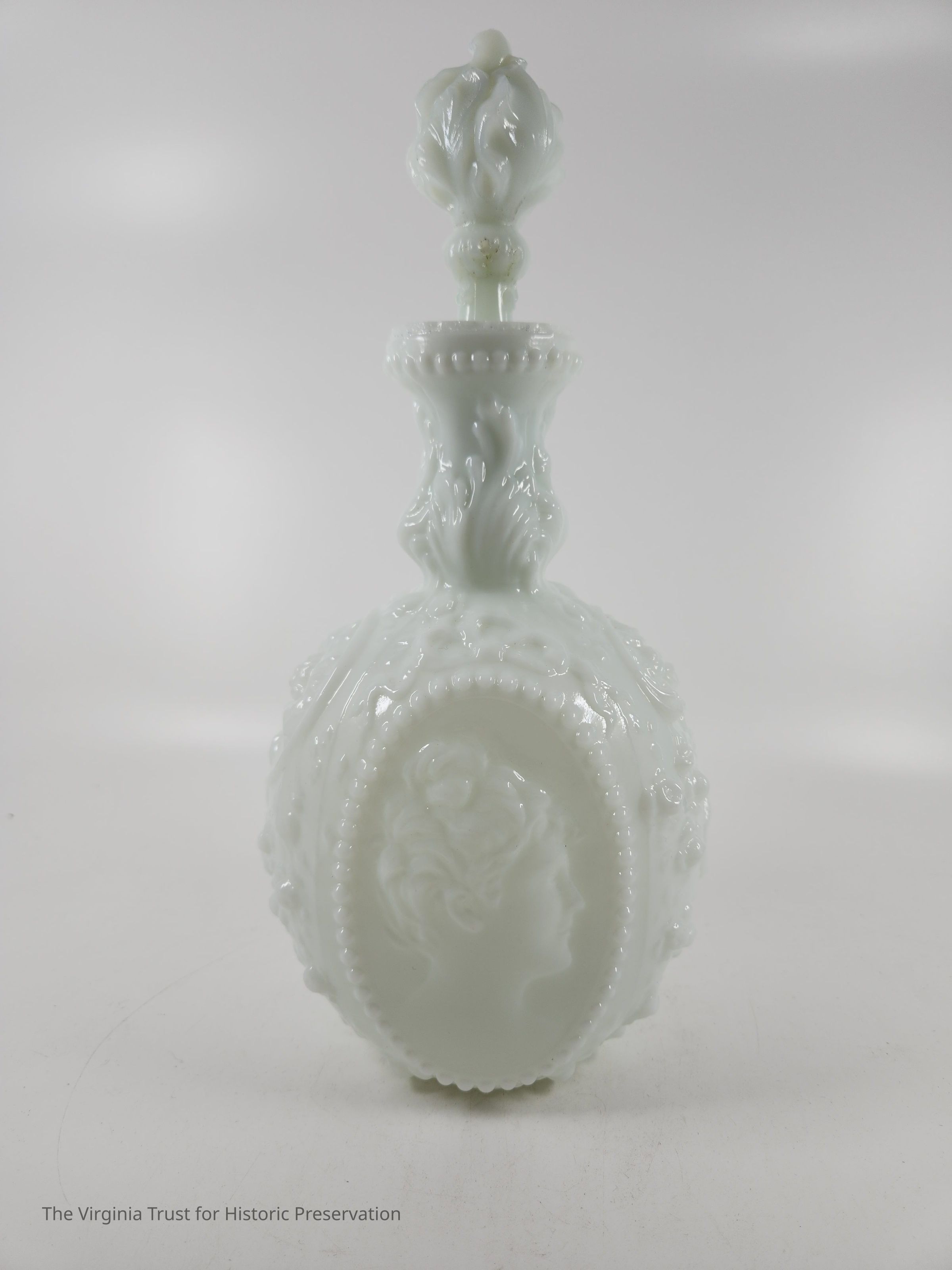 Milk glass decanter with a profile of Jenny Lind on both sides. Floral and scroll decoration all around the sides of body and stem of bottle. Made by Fostoria. Part of a six piece dresser set.Dimensions