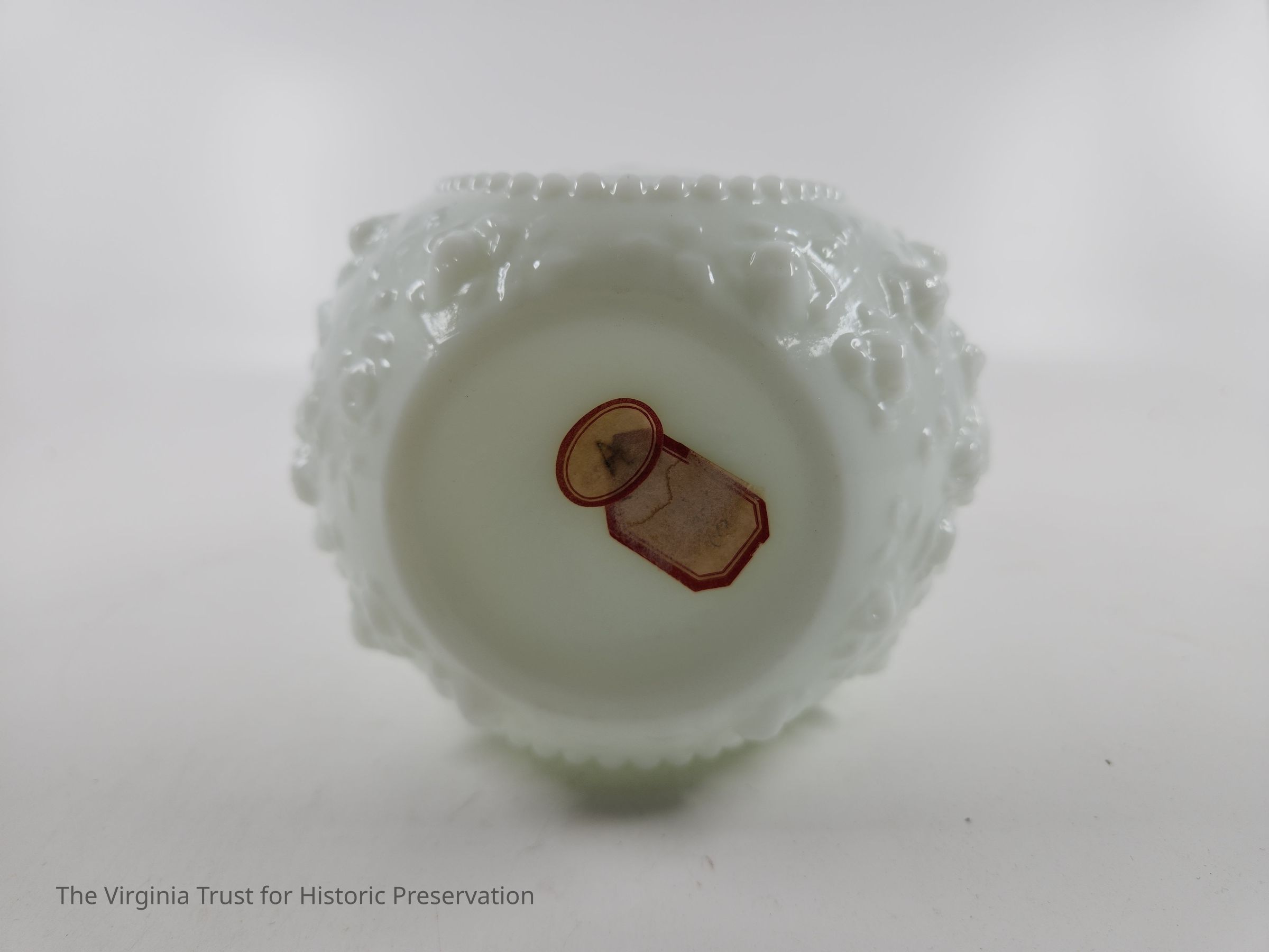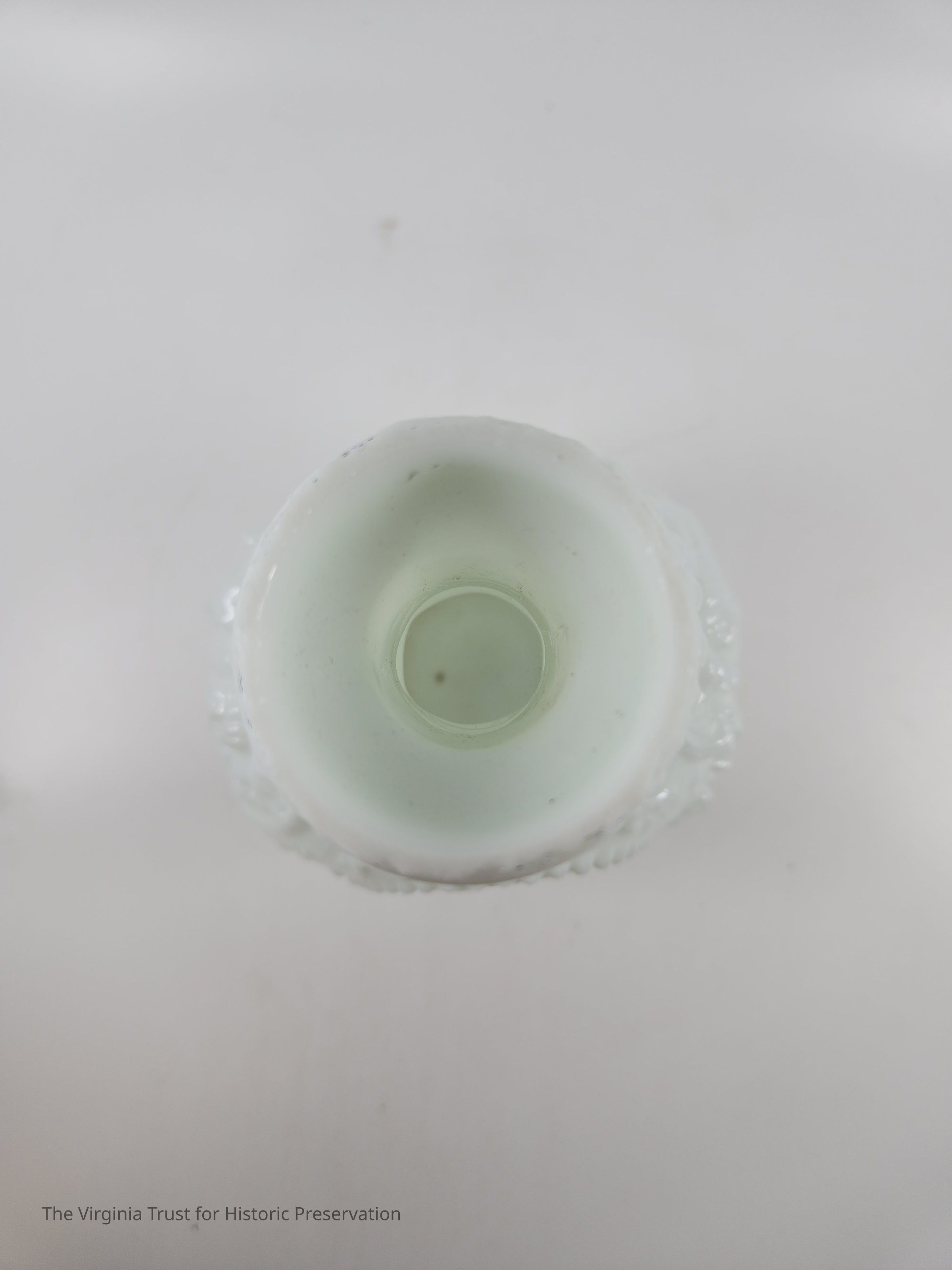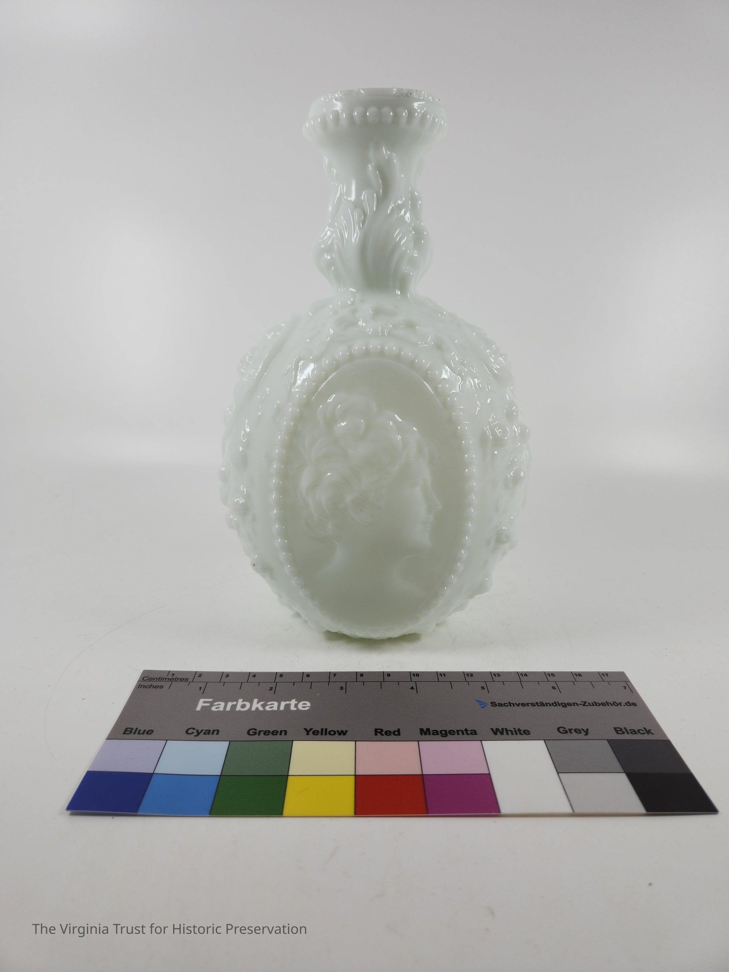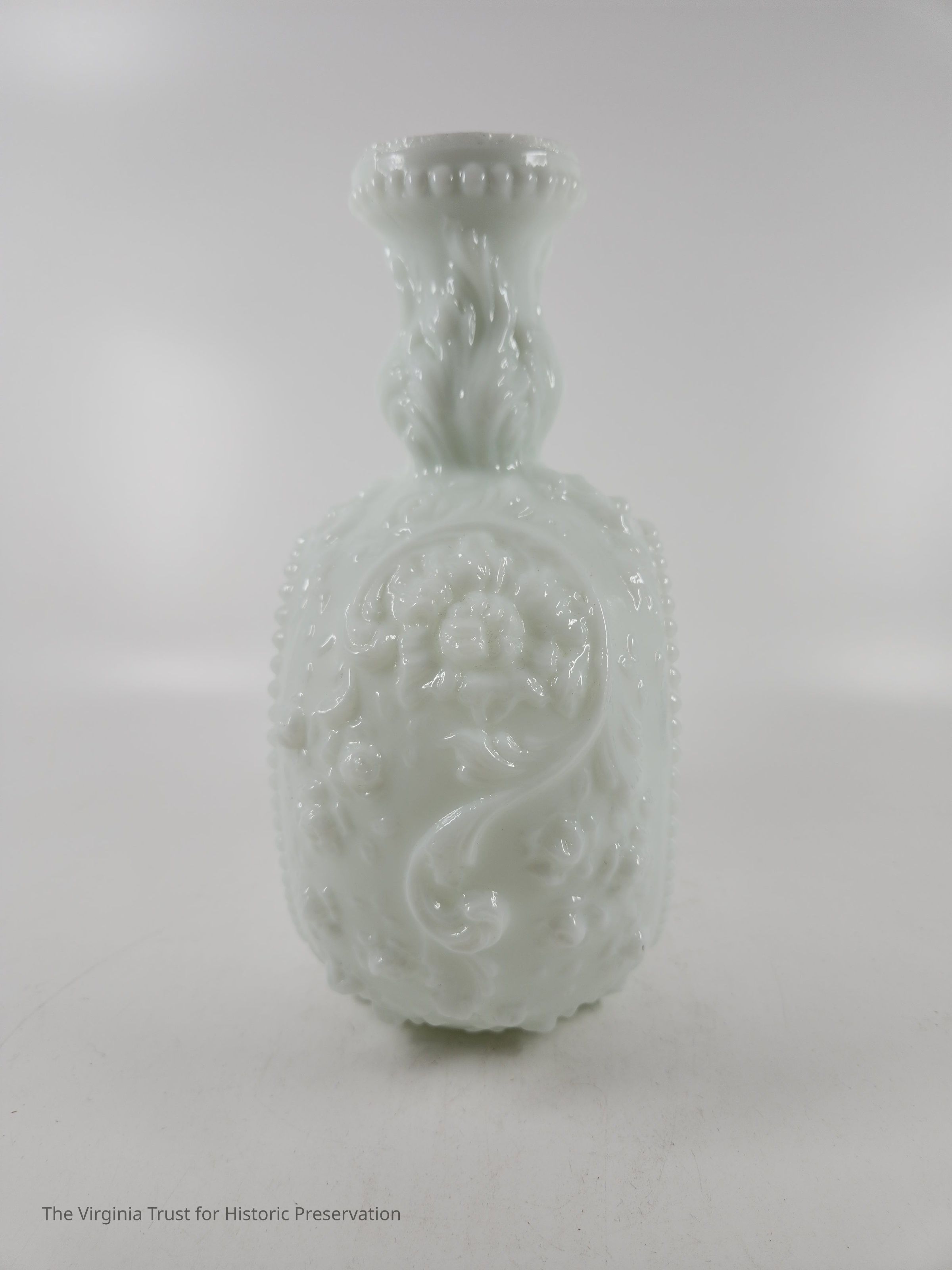 Milk glass decanter with a profile of Jenny Lind on both sides. Floral and scroll decoration all around the sides of body and stem of bottle. Made by Fostoria. Part of a six piece dresser set.Dimensions
