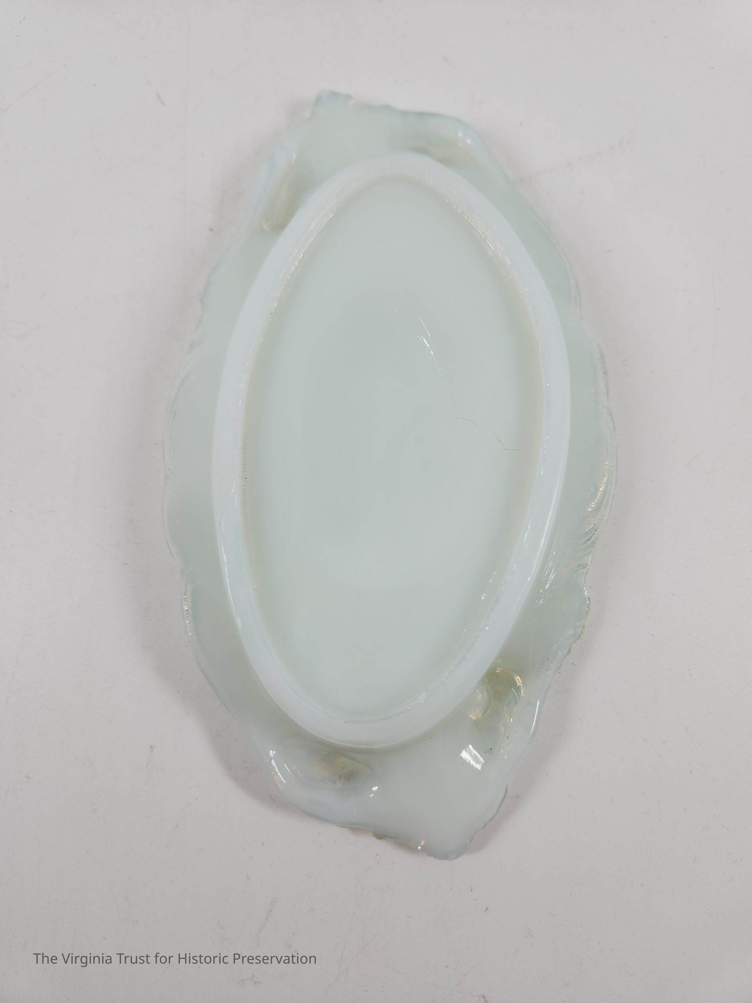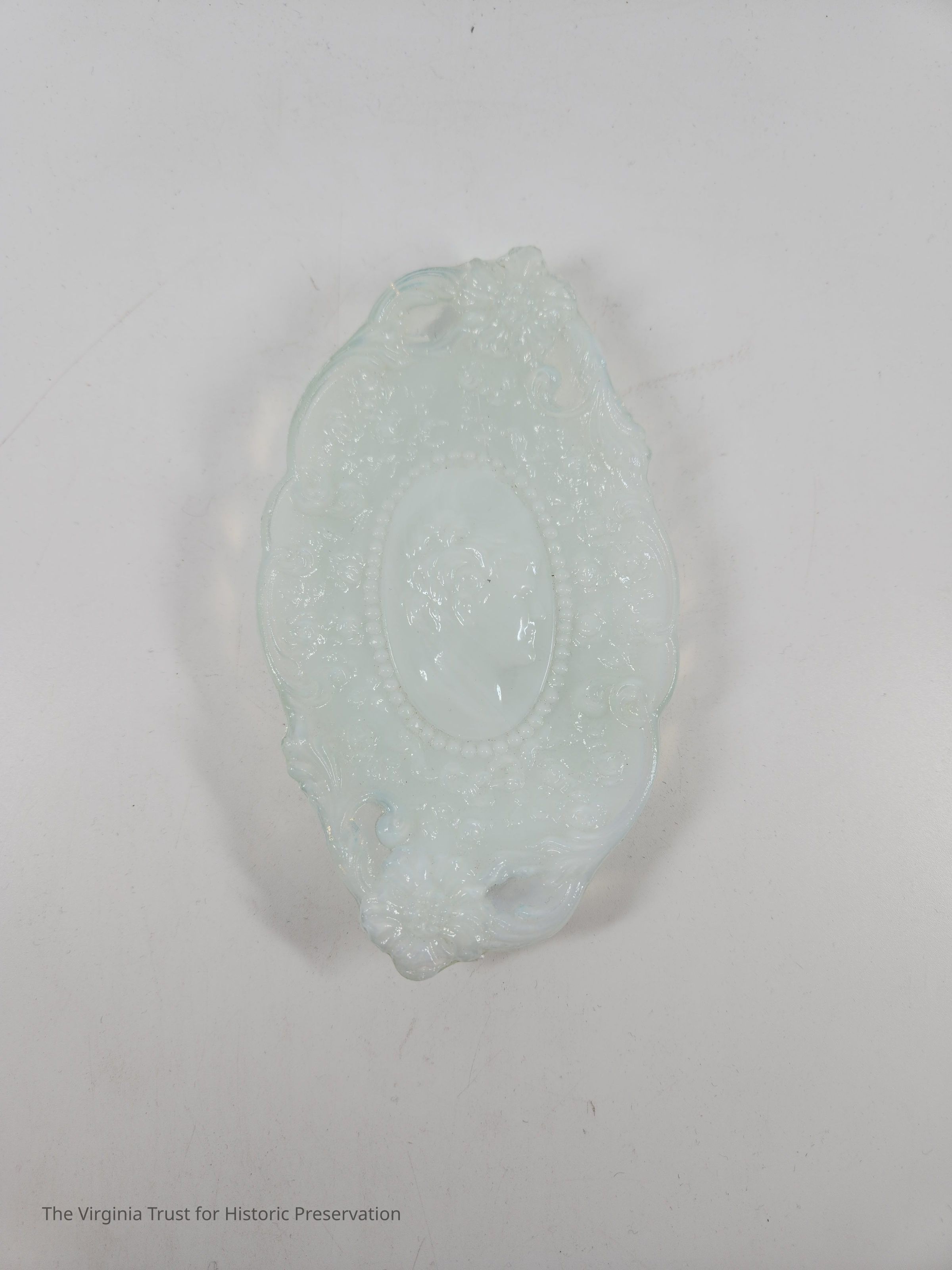 Decorative oval-shaped tray with a central cameo medallion of Jenny Lind's profile and embossed floral pattern all around the edge. Clear milk glass. Part of a six piece dresser set.