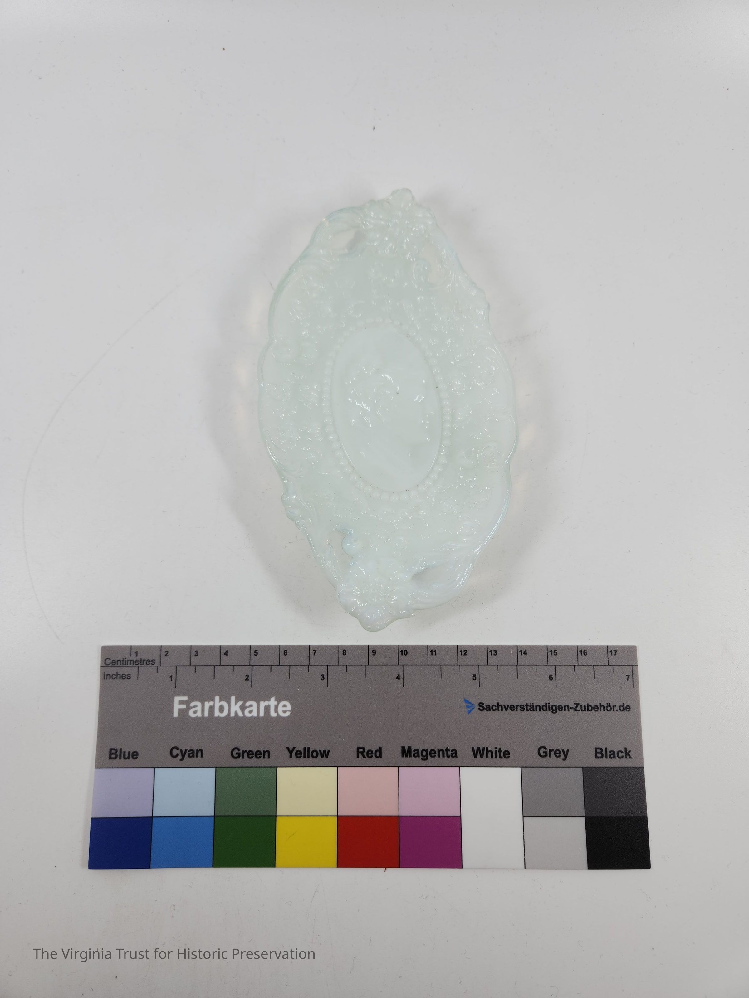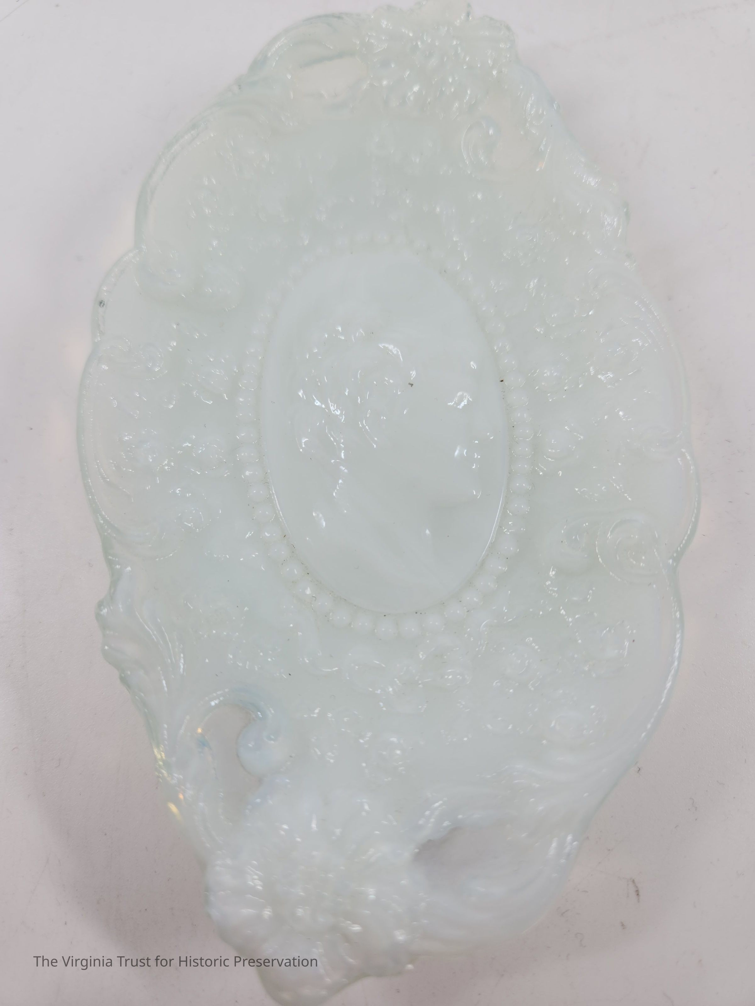 Milk glass tray embossed with floral pattern surrounding a woman's profile