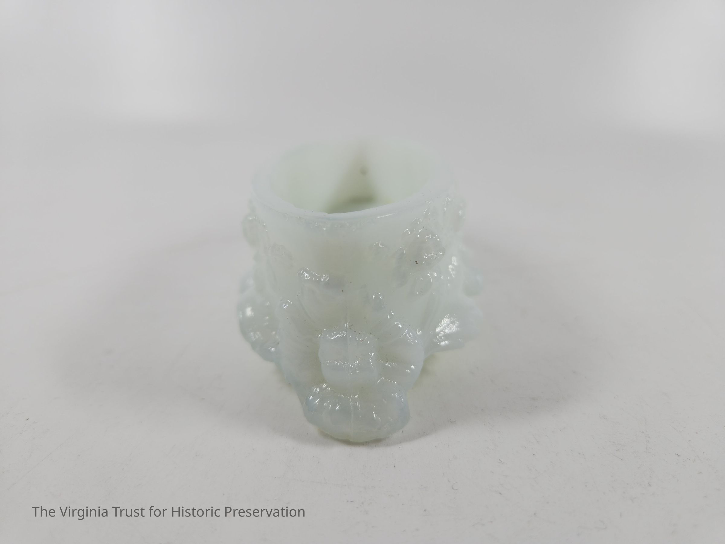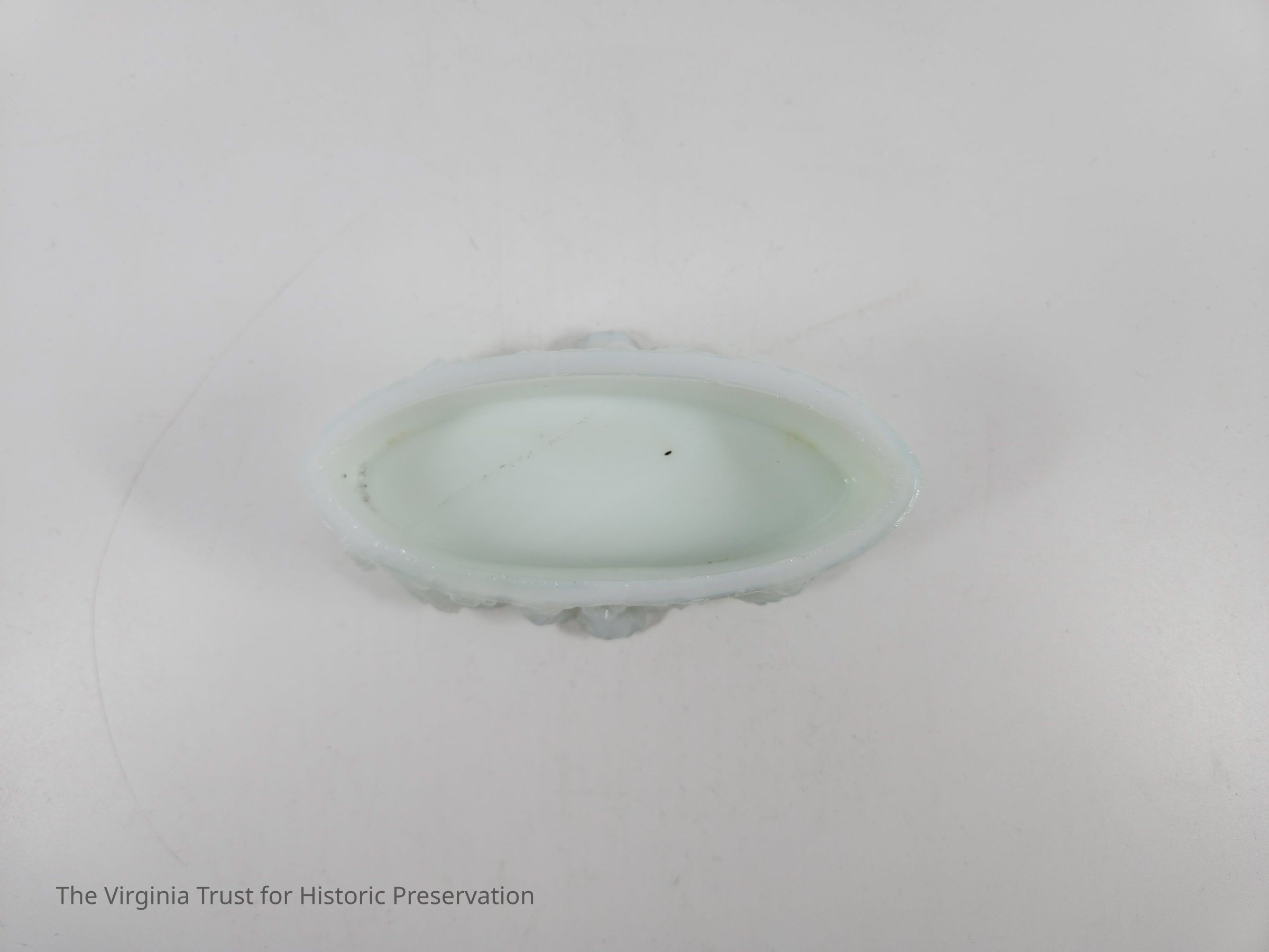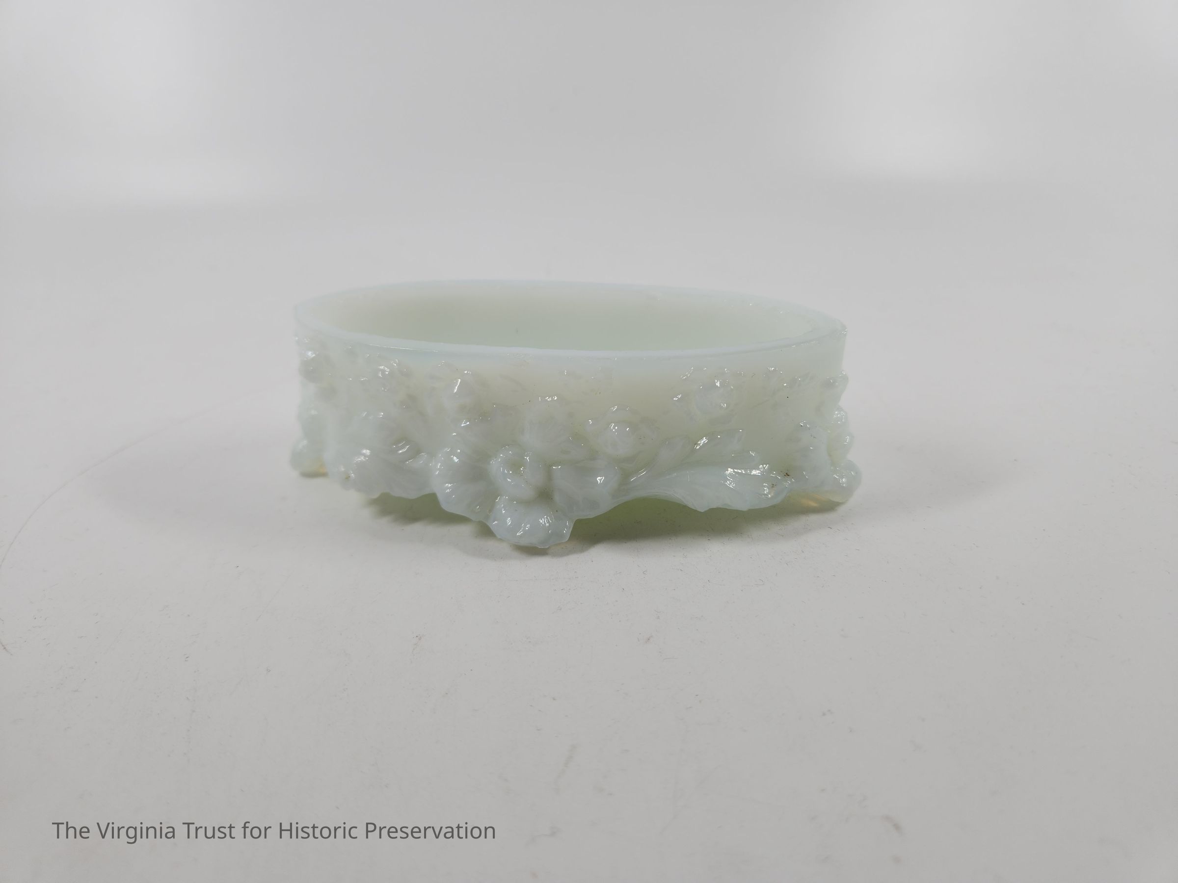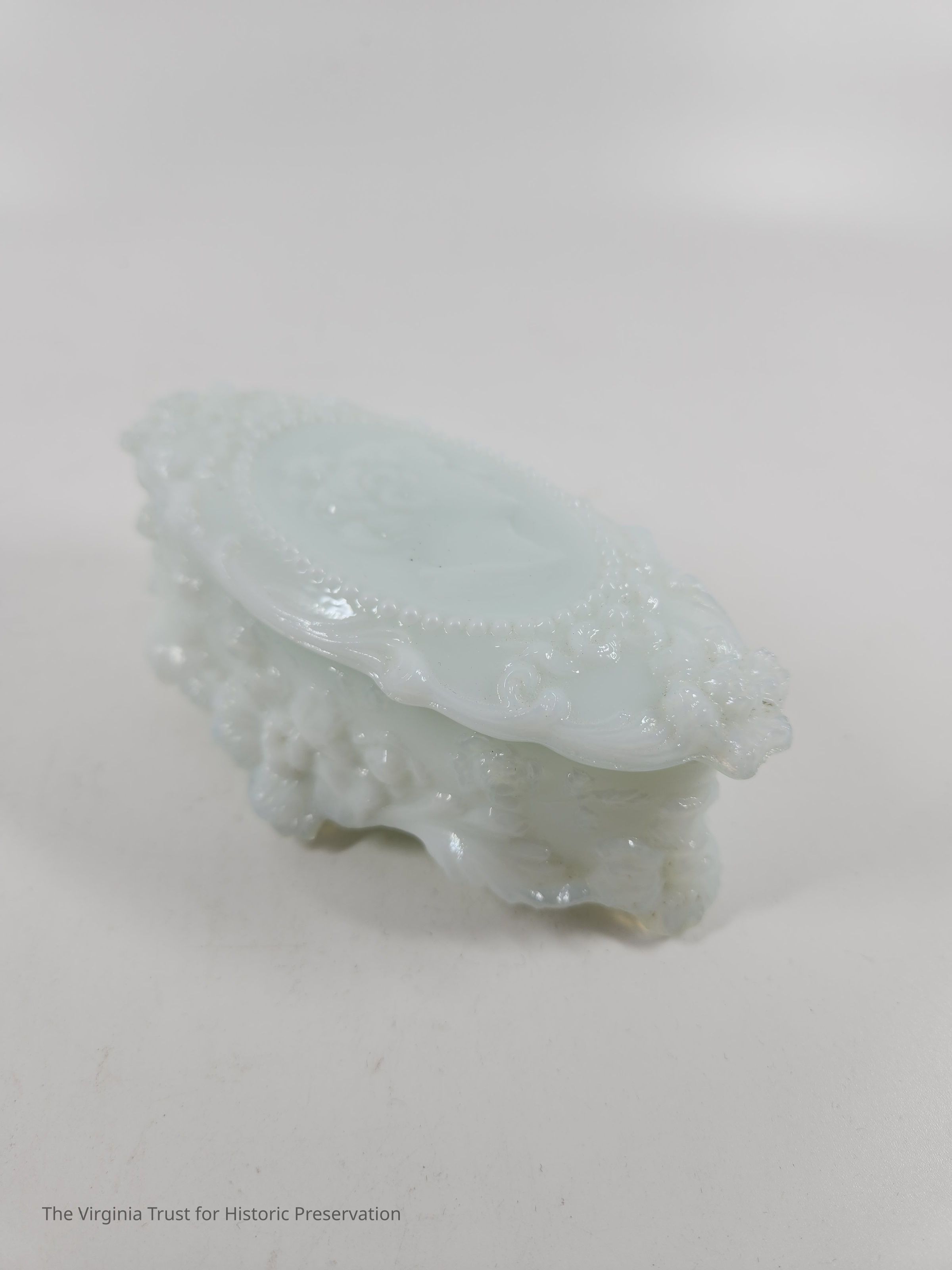 Small oval pin box. Molded milk glass that is highly ornate with floral decoration. Rests on four small feet. Part of a six piece dresser set.