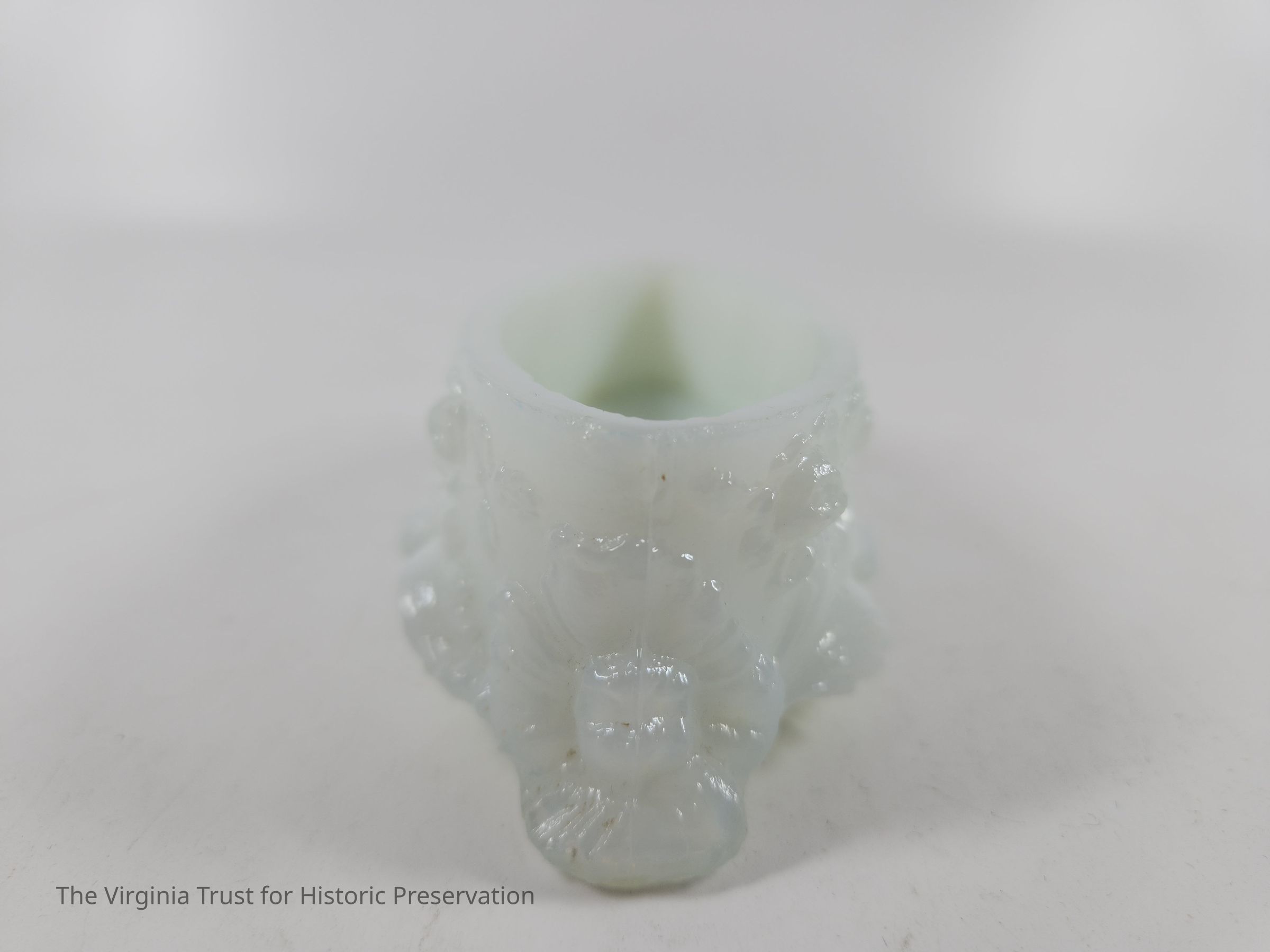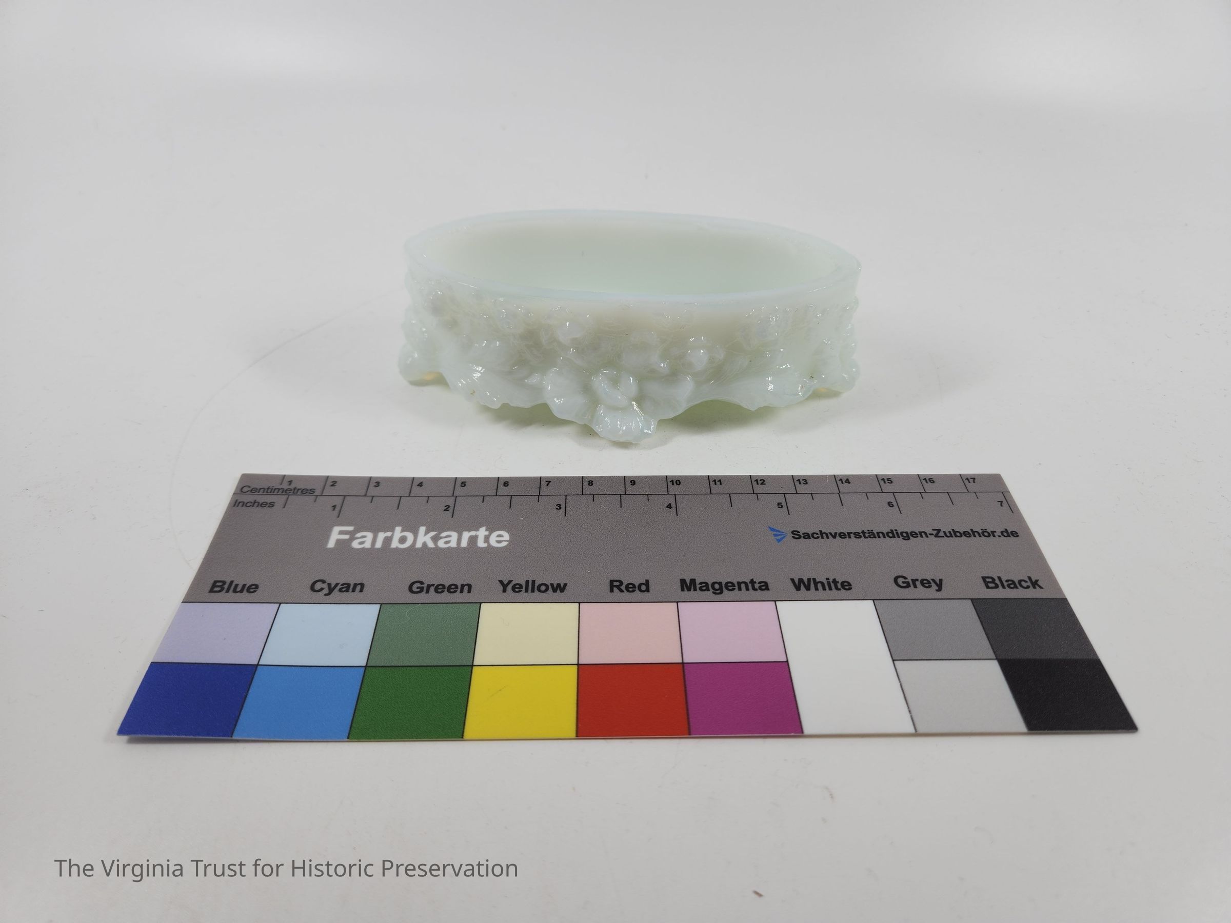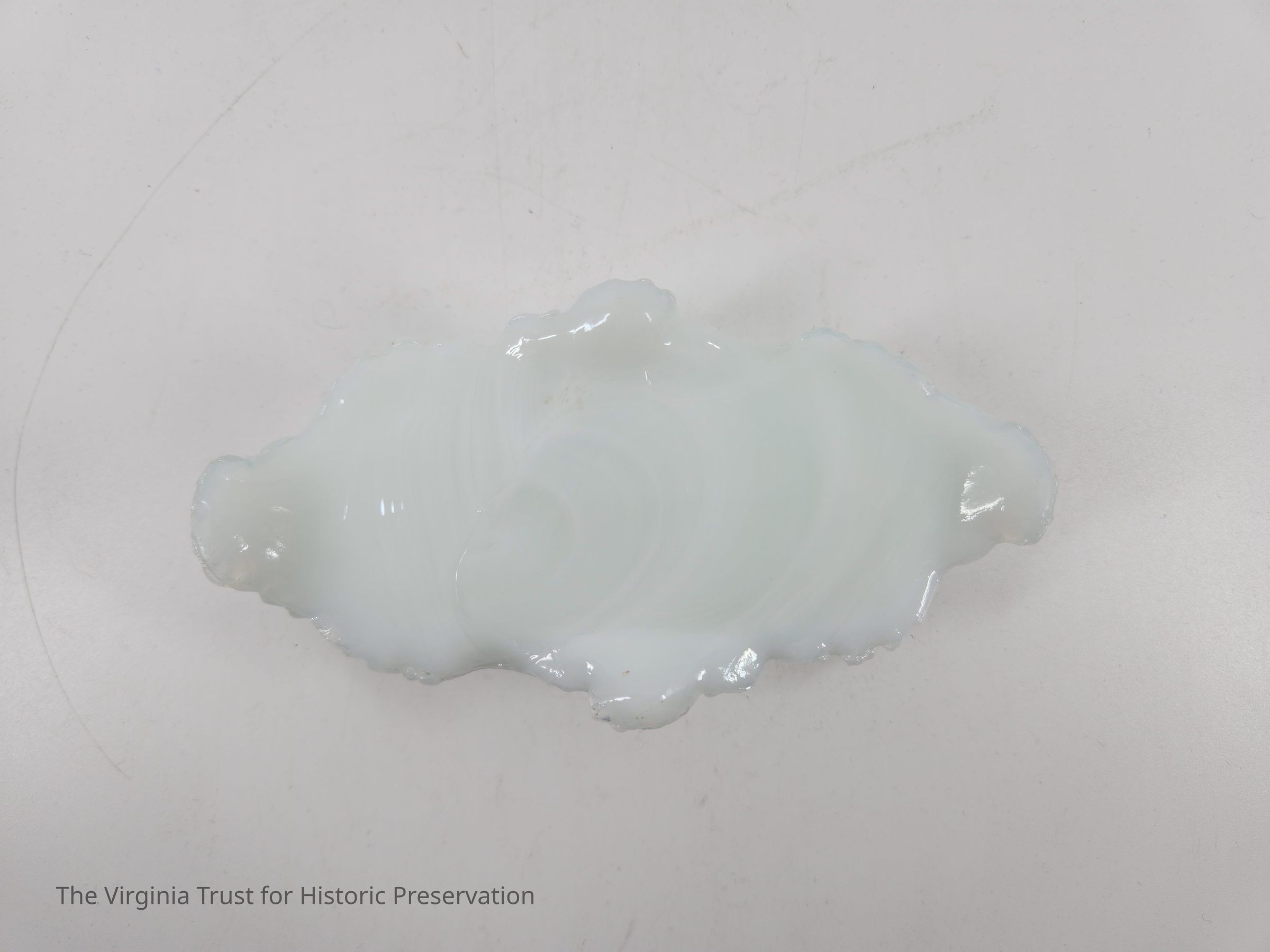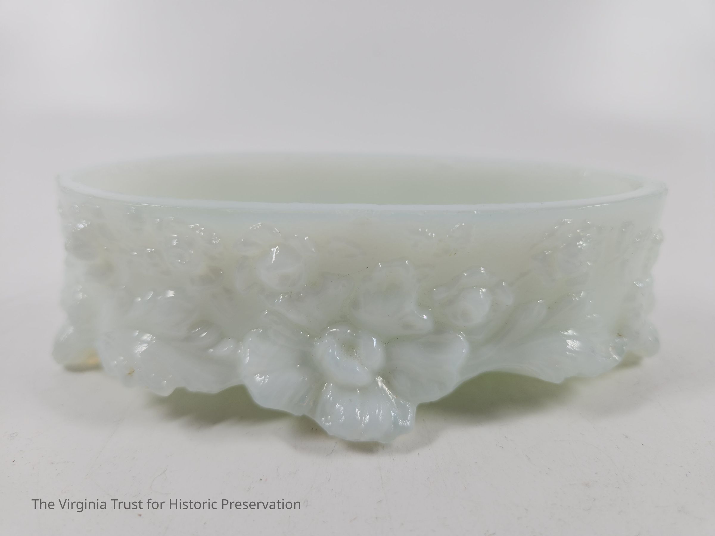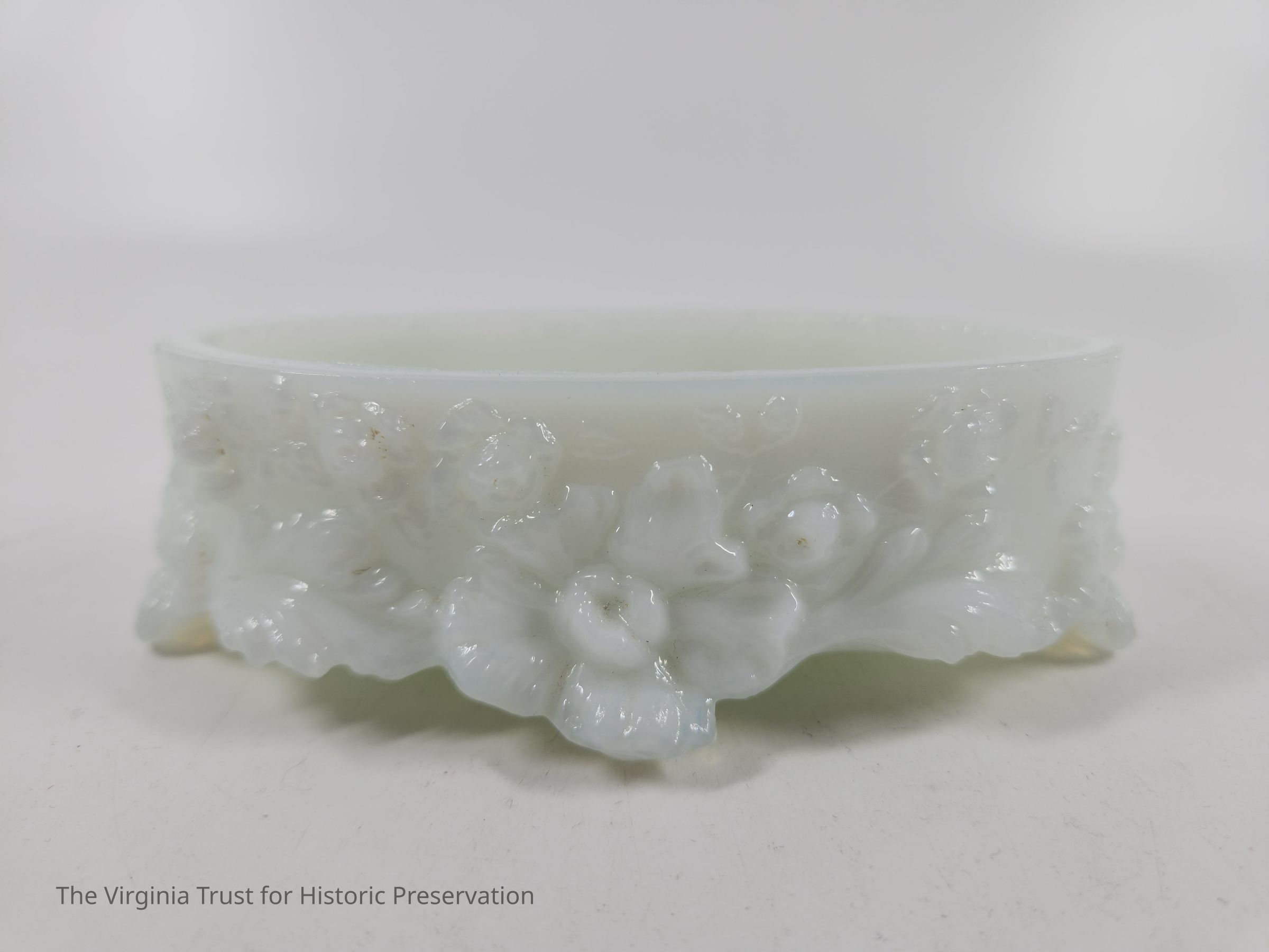 Small oval pin box. Molded milk glass that is highly ornate with floral decoration. Rests on four small feet. Part of a six piece dresser set.