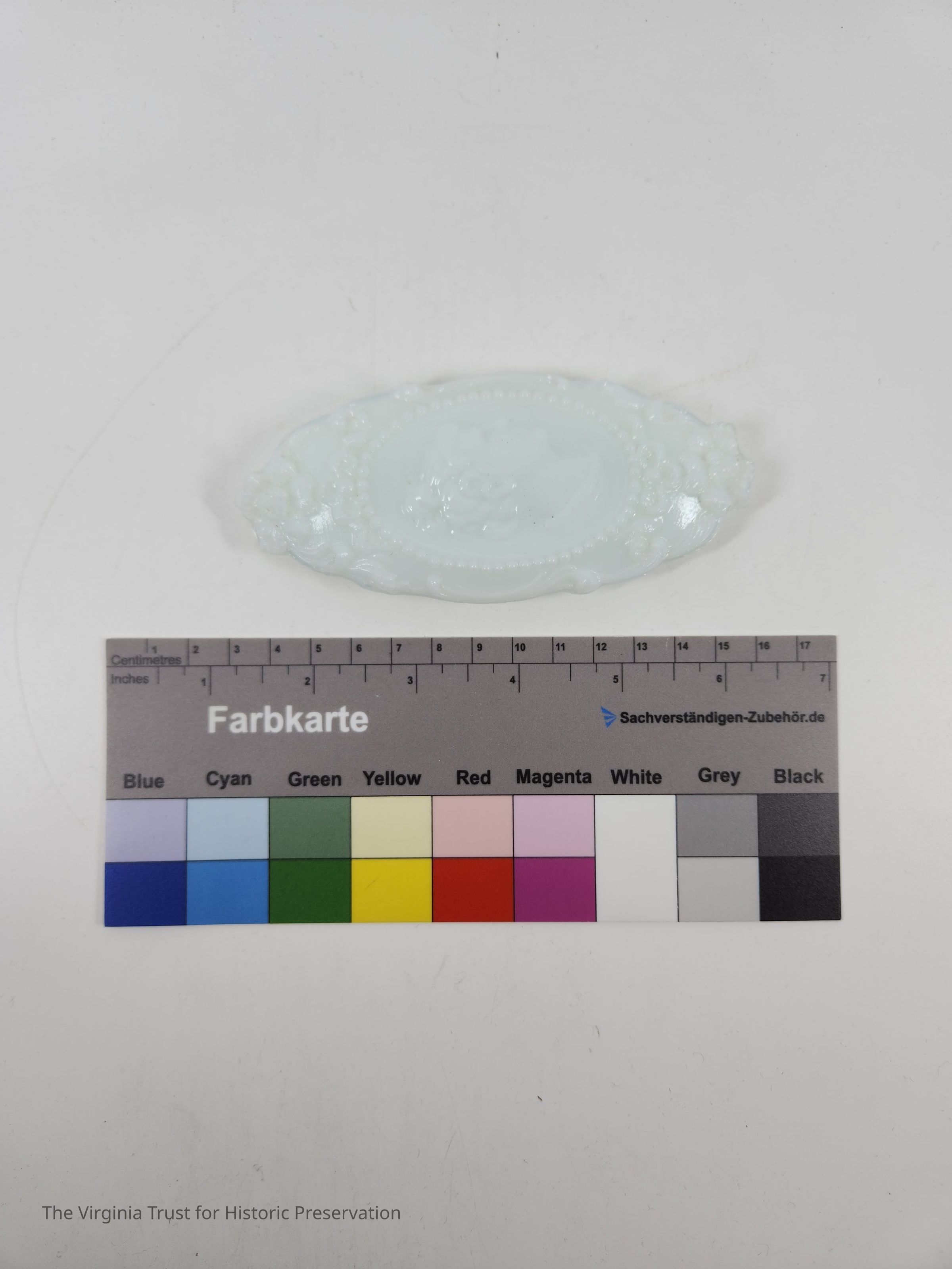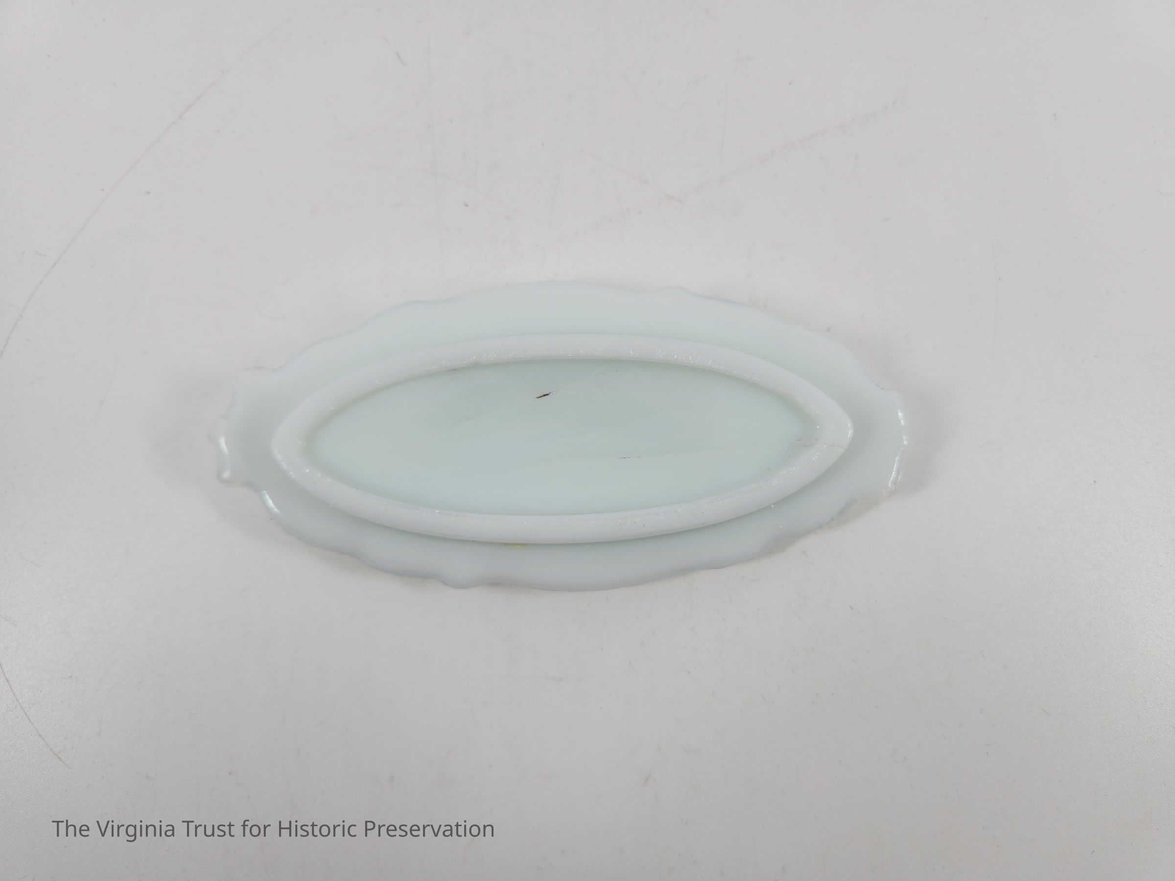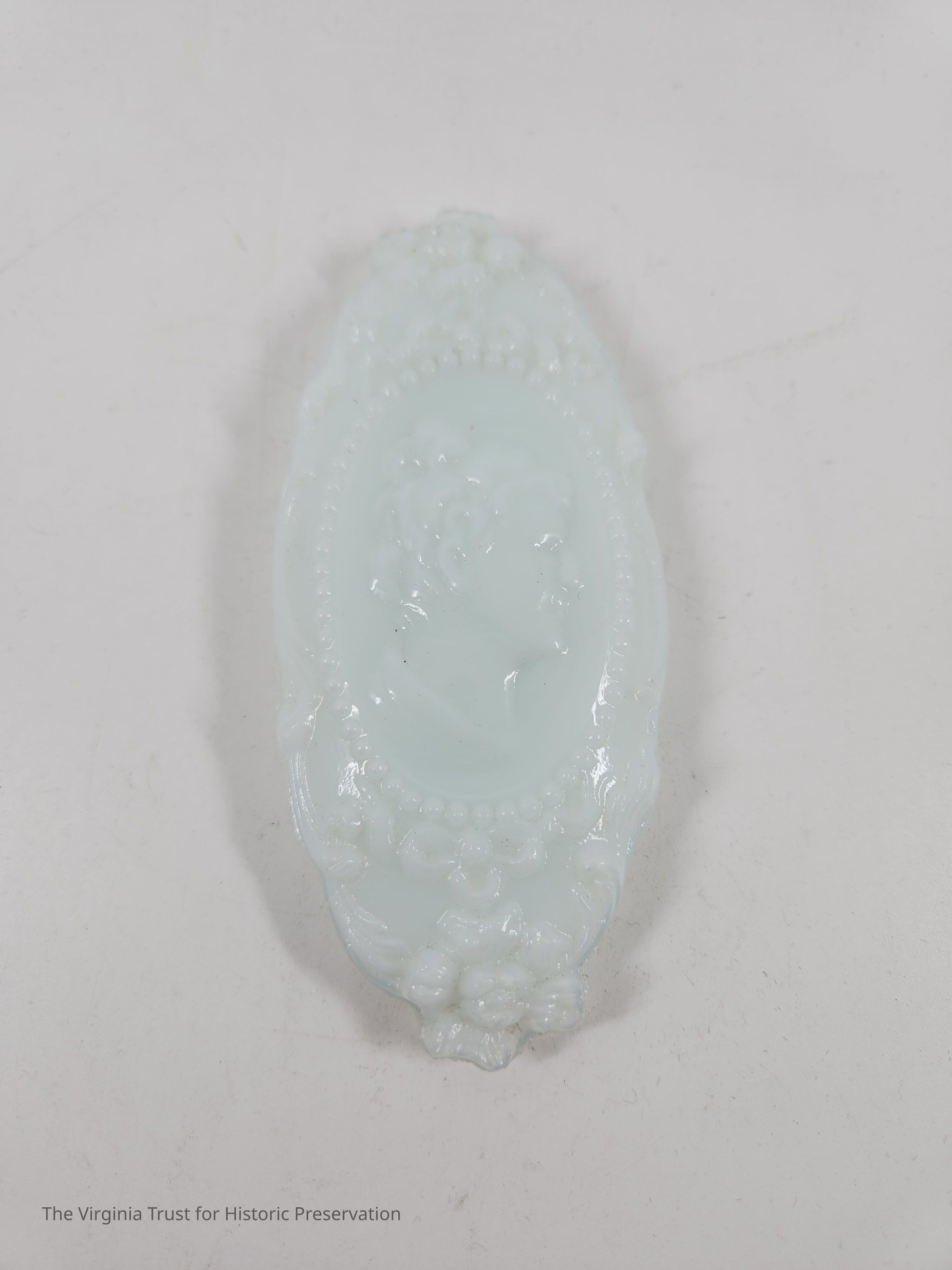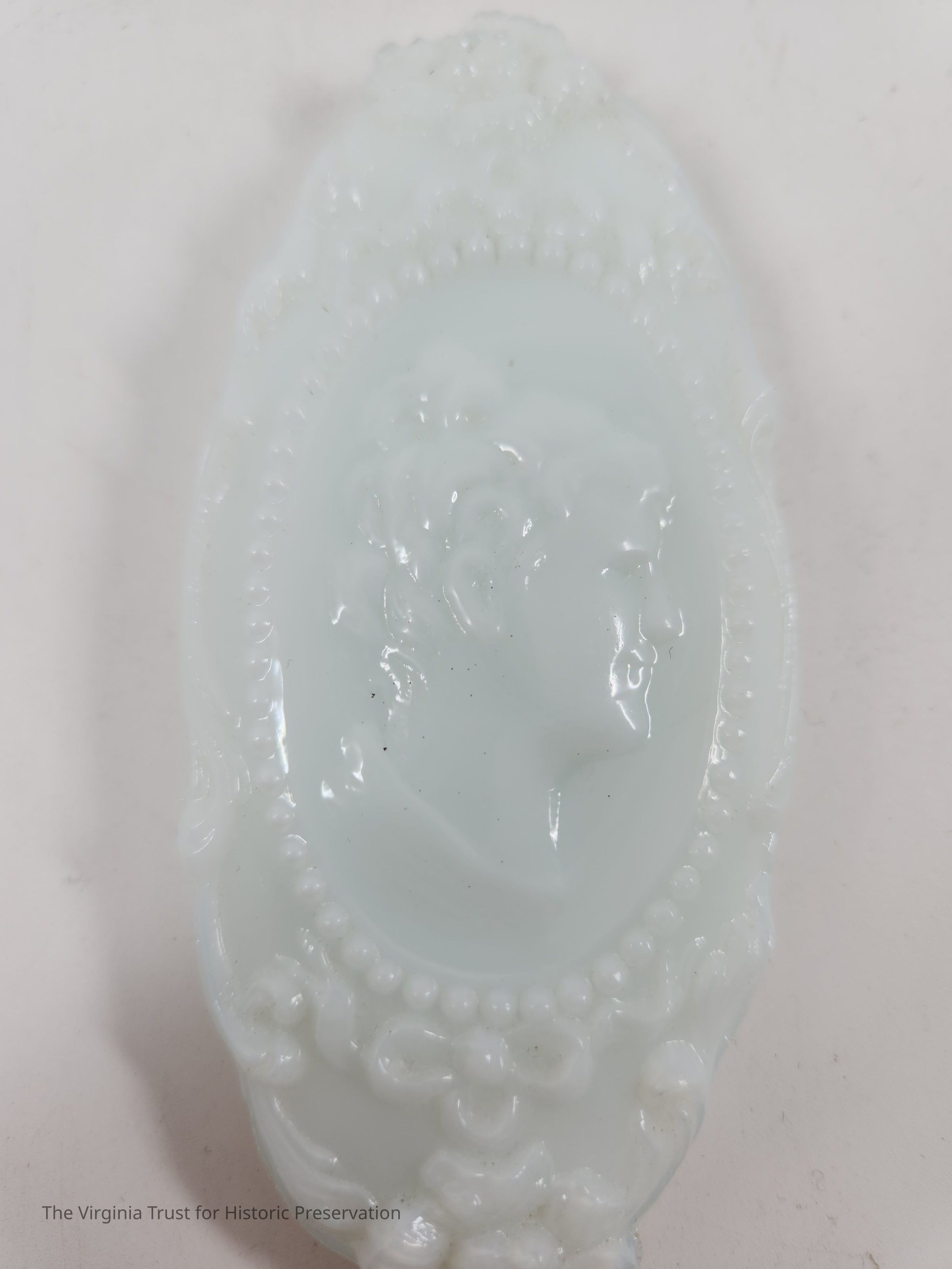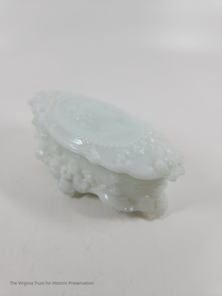 Milk glass oval lid to cover pin box 2015.005 G. Embossed floral decoration with central cameo medallion of Jenny Lind's profile. Part of a six piece dresser set.