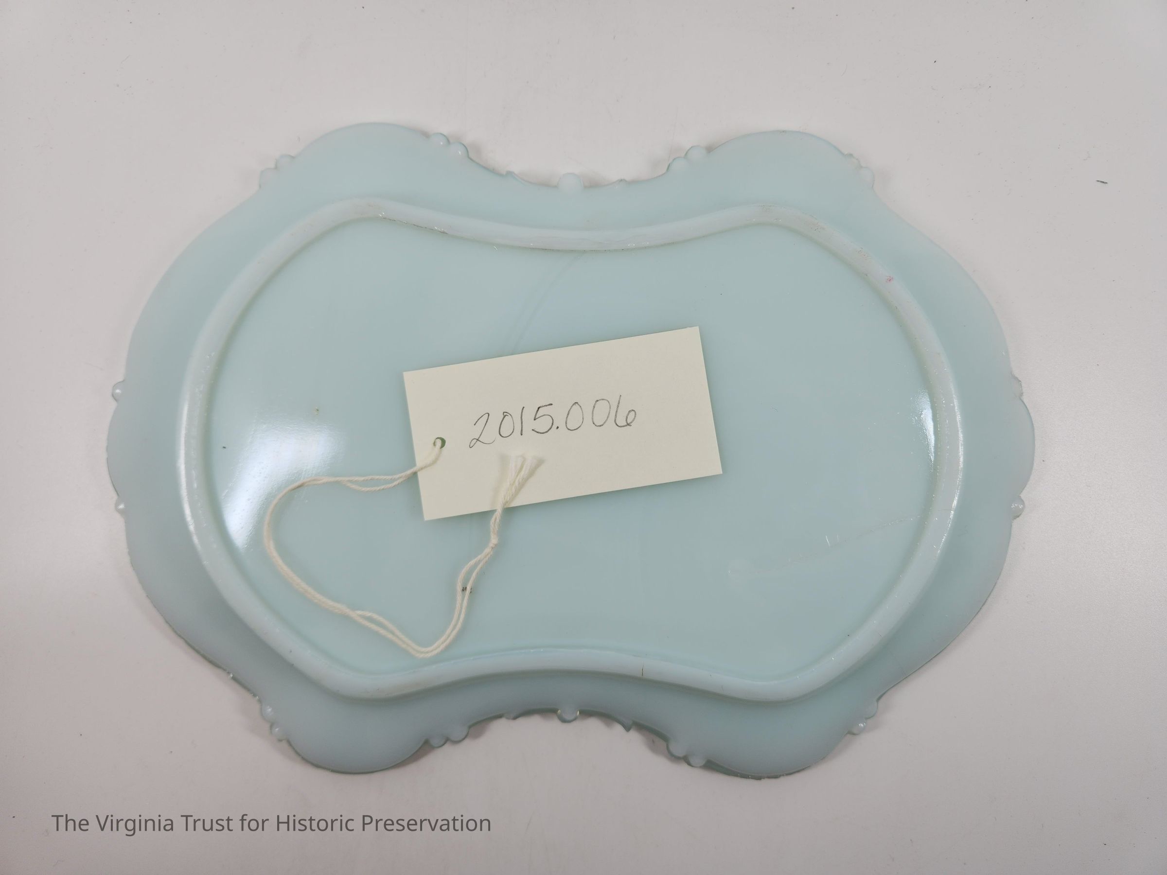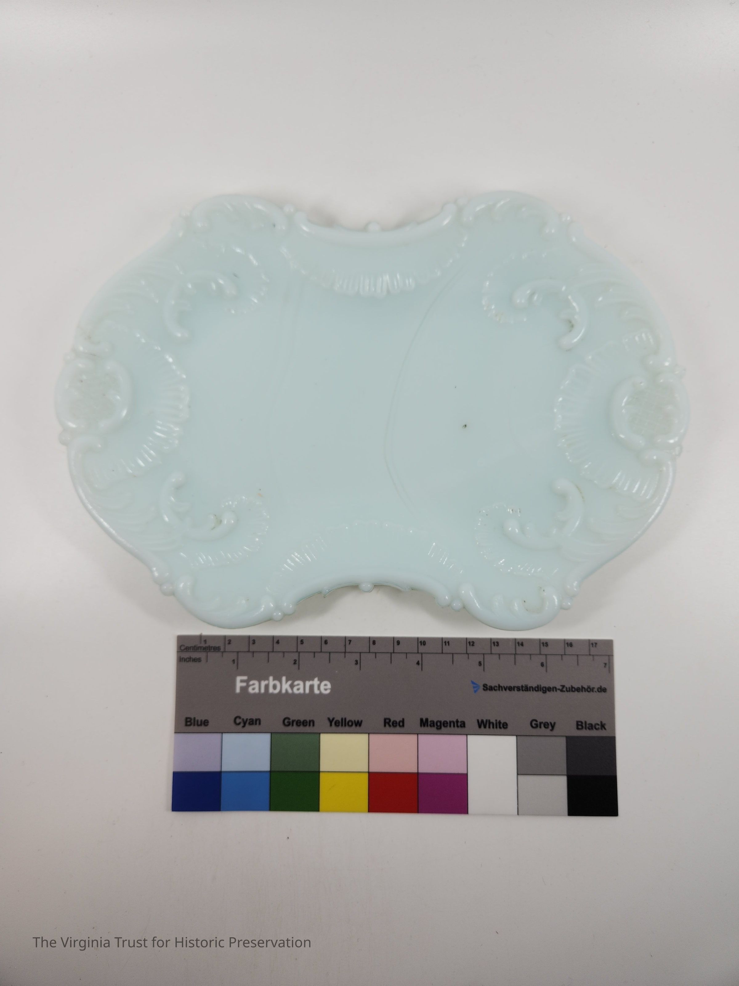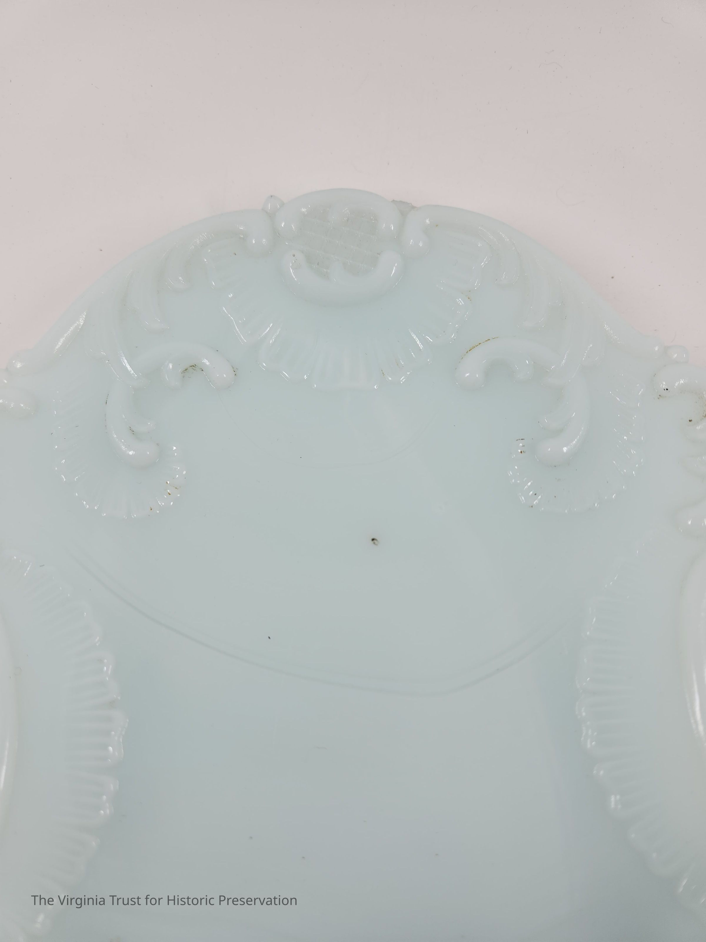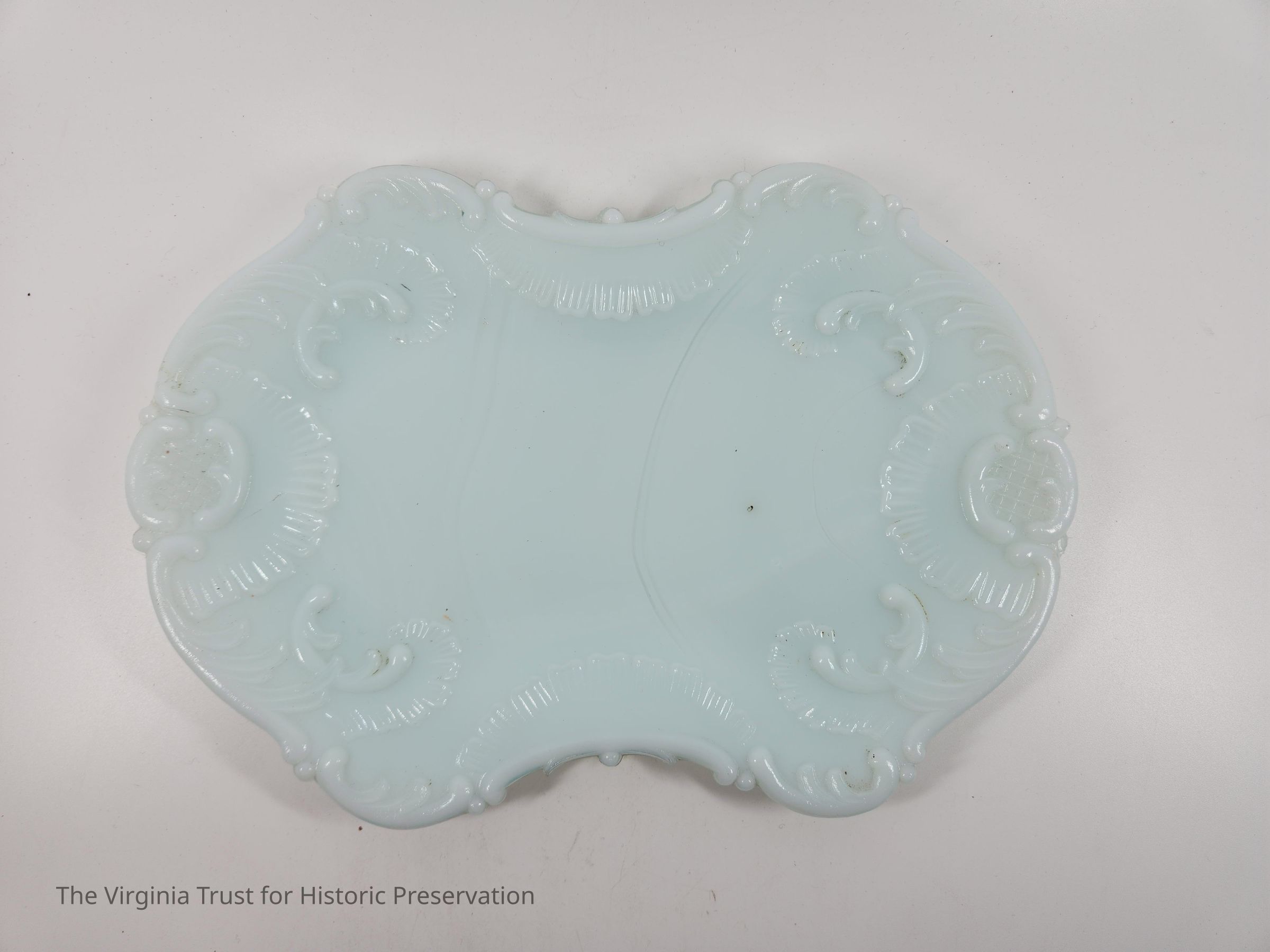 Milk glass tray. Blue-ish tint of the glass. Foliage scroll decoration as border. Undecorated central area.