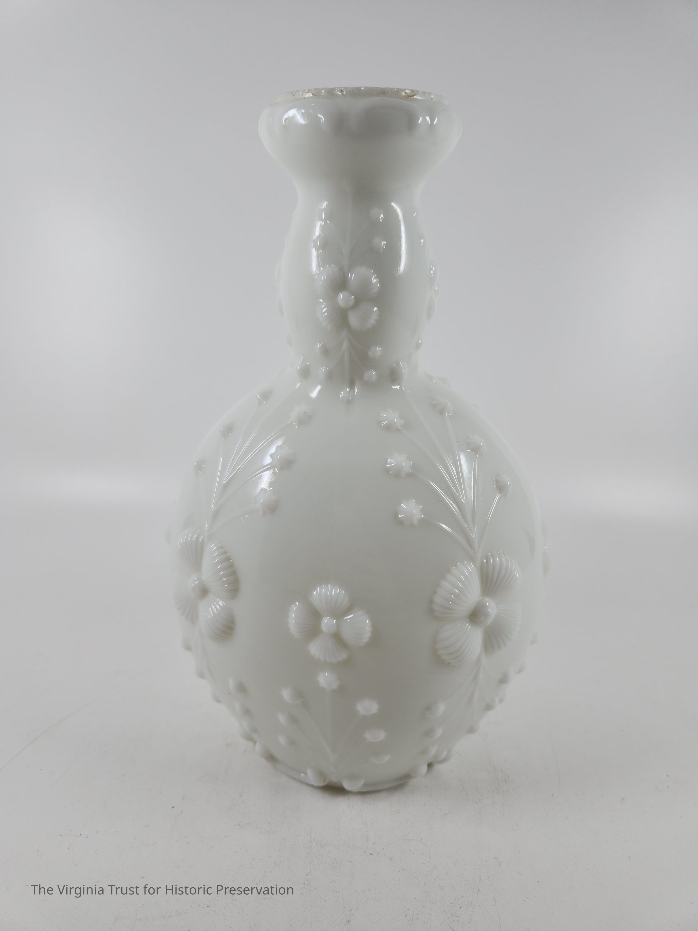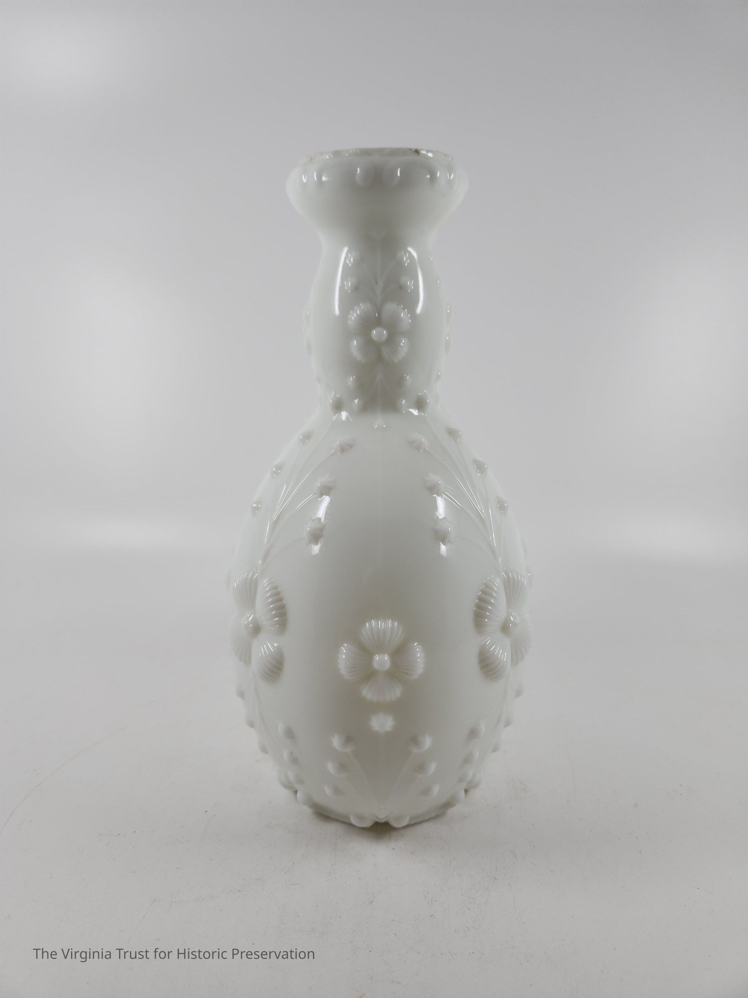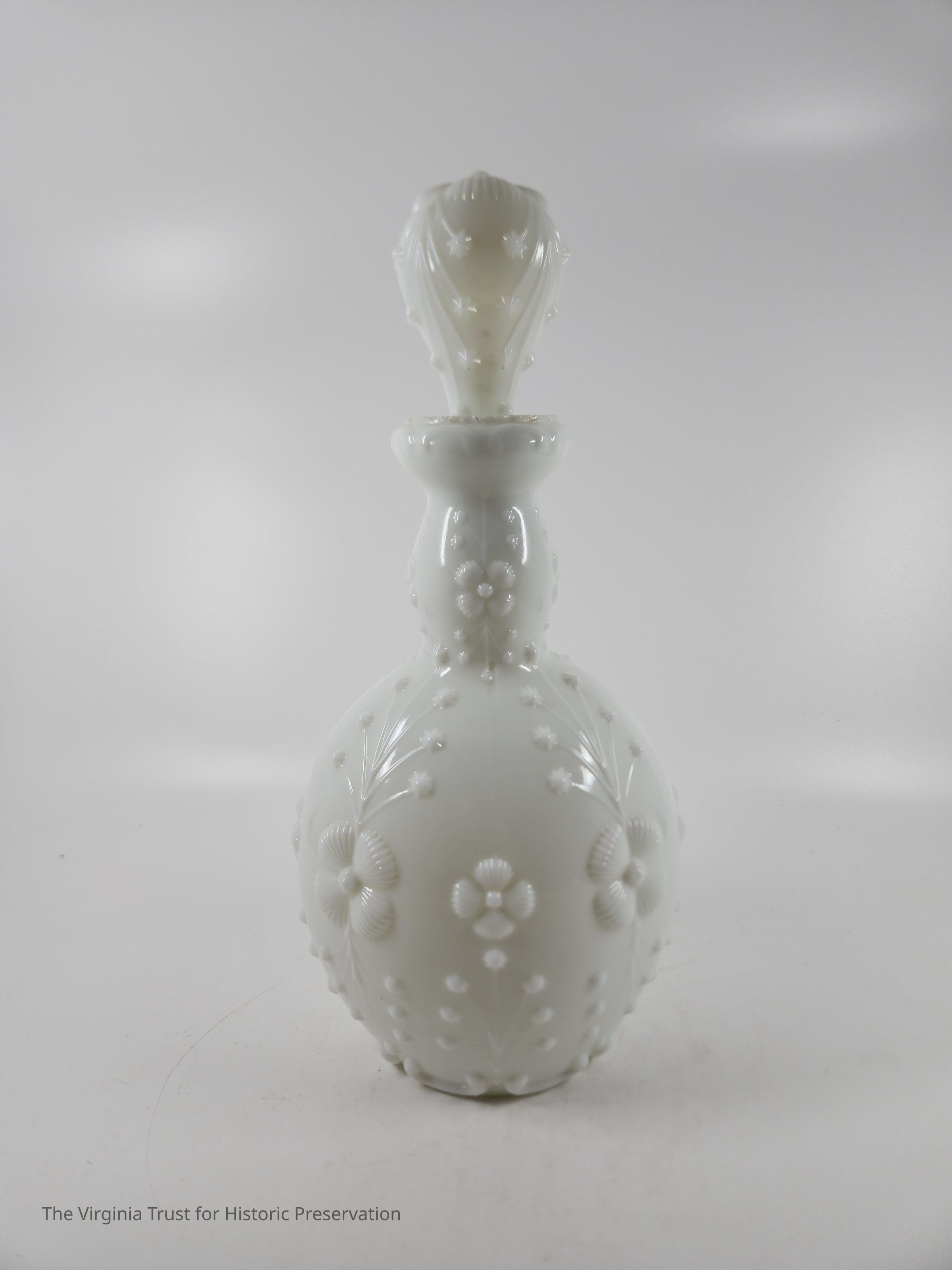 White milk glass bottle with floral pattern. Paired with stopper (2015.007 B)