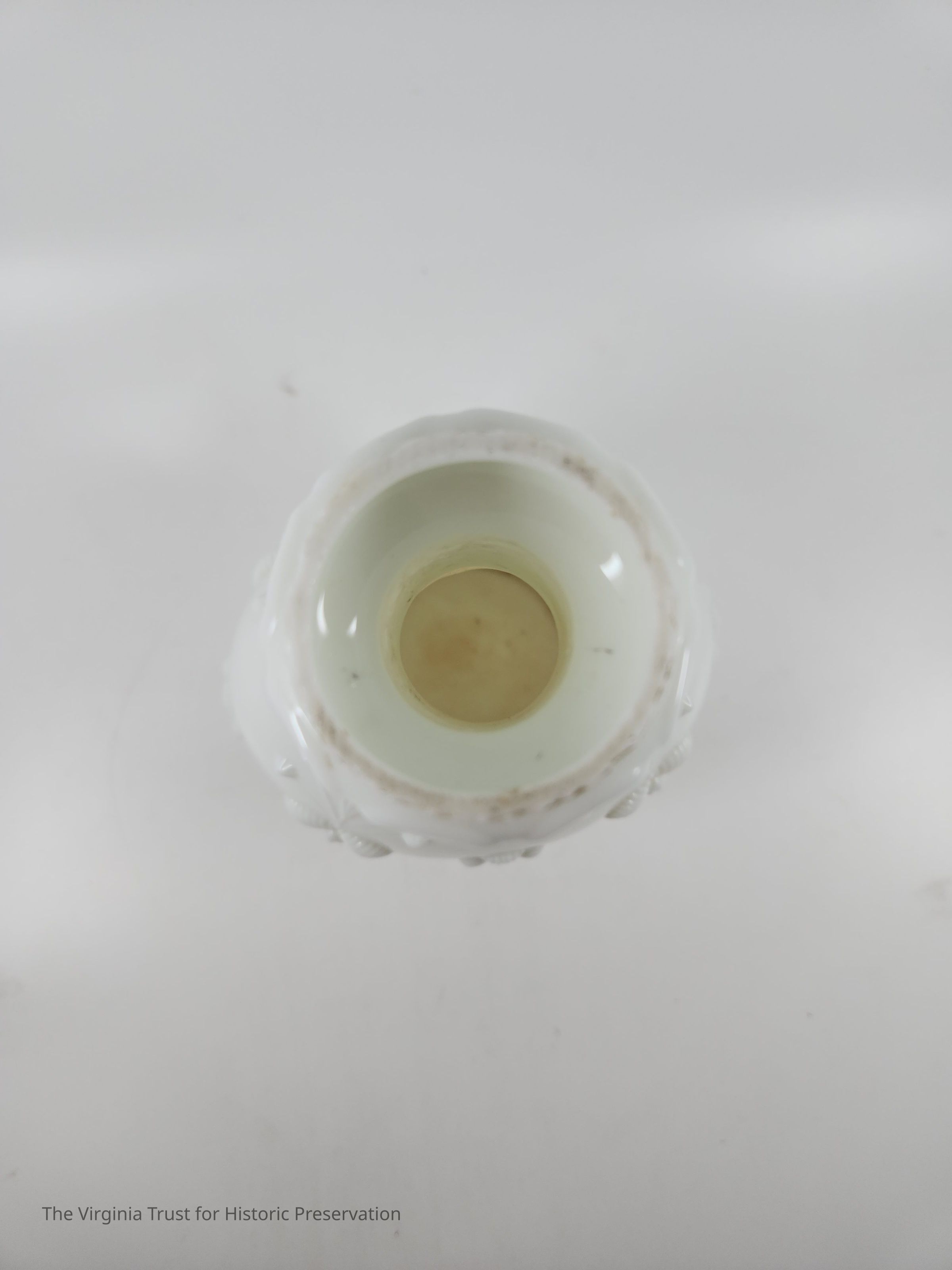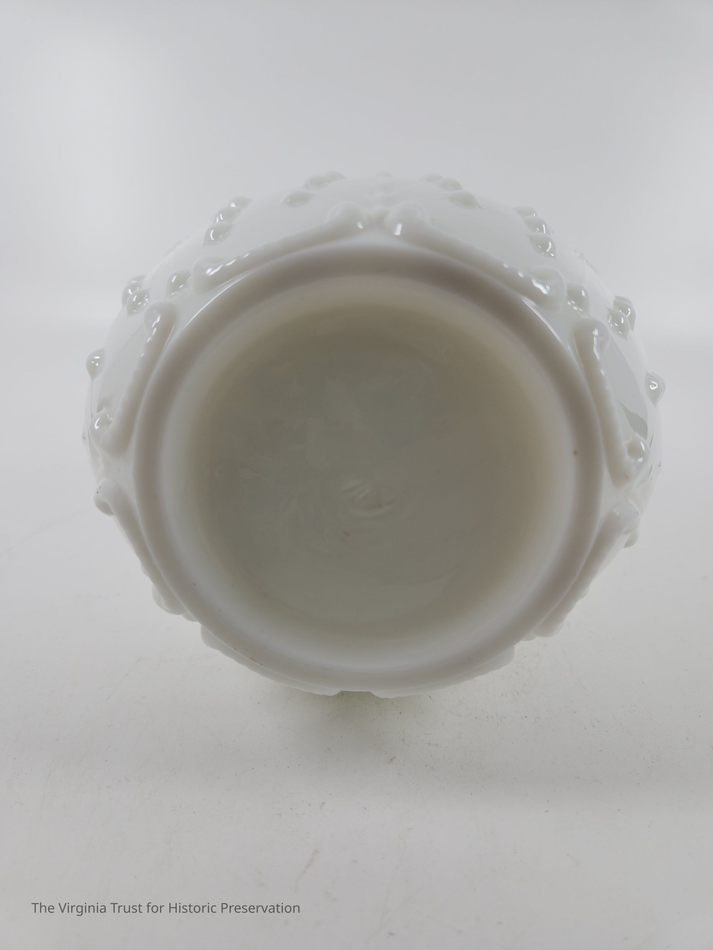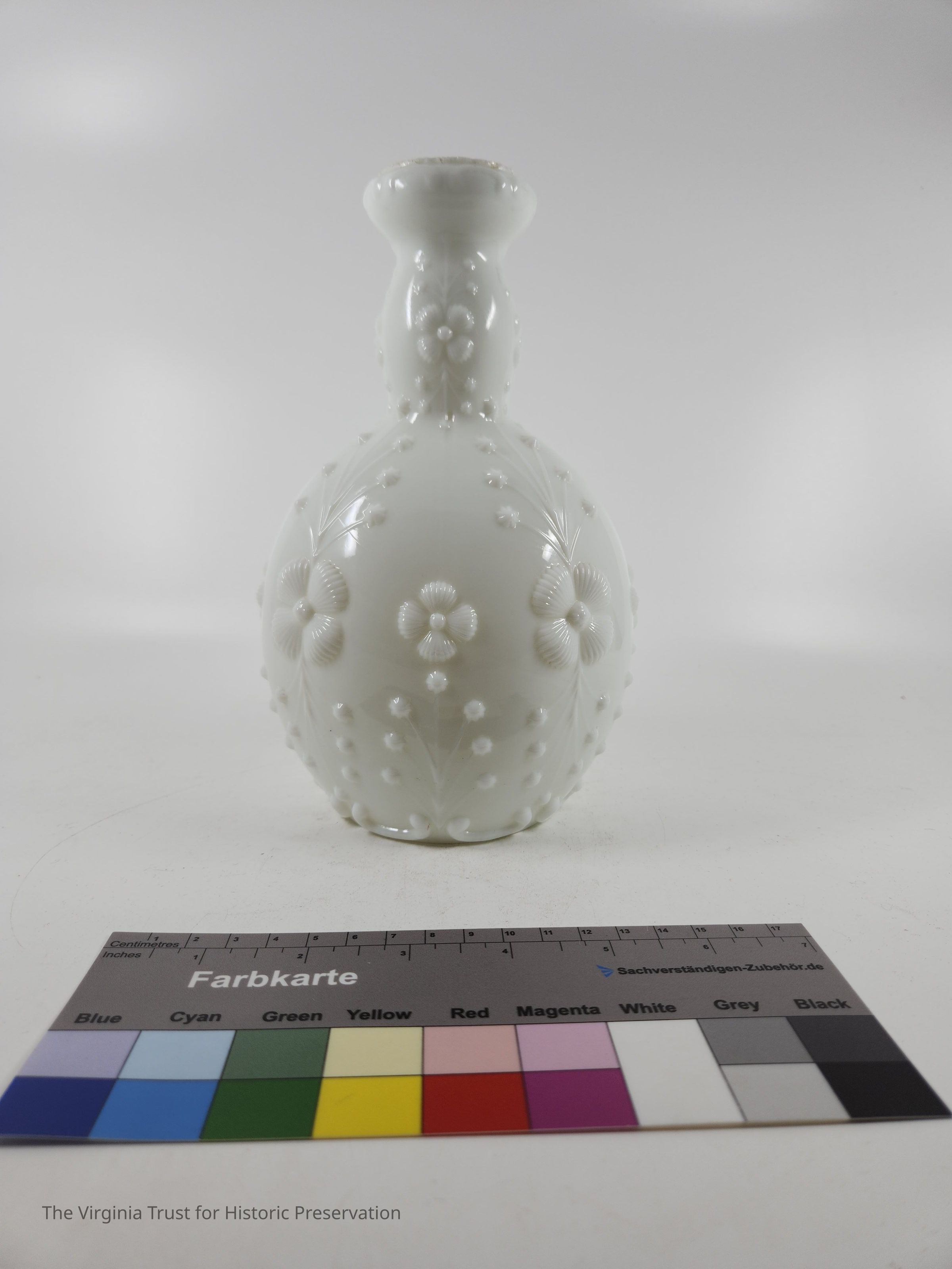 White milk glass bottle with floral pattern. Paired with stopper (2015.007 B)