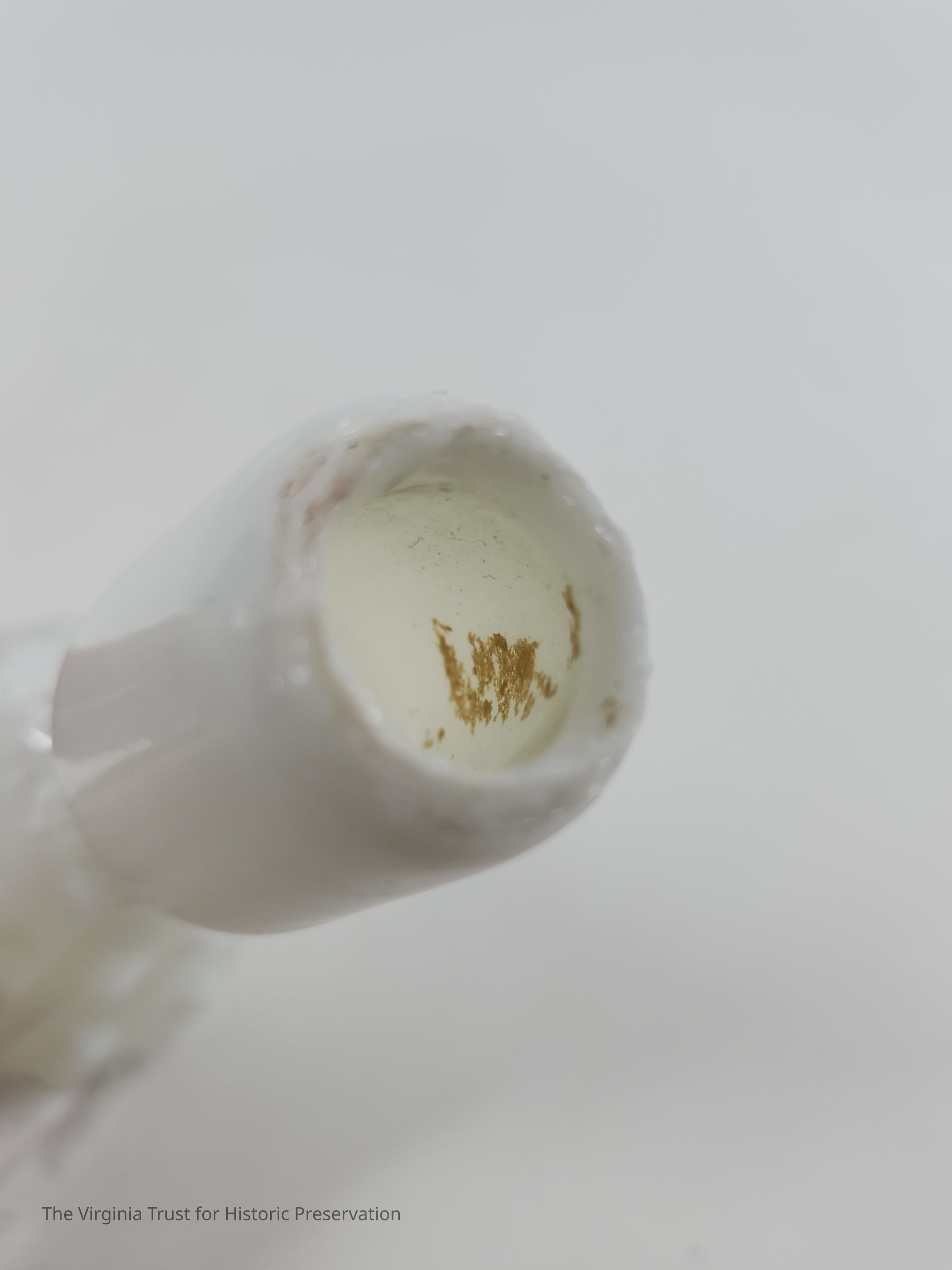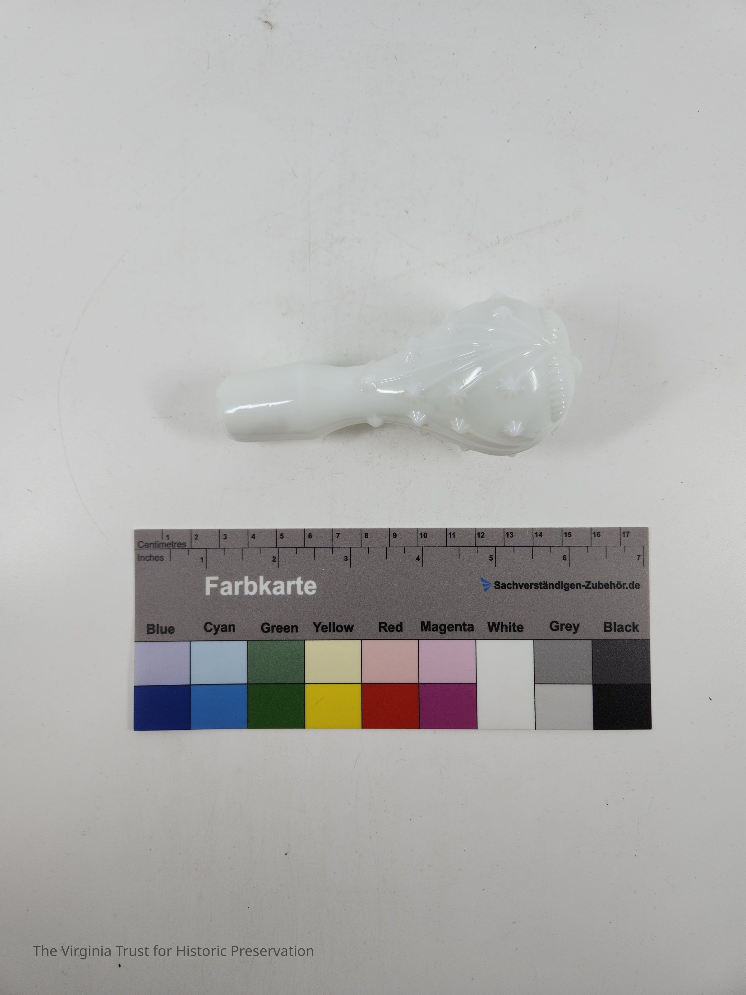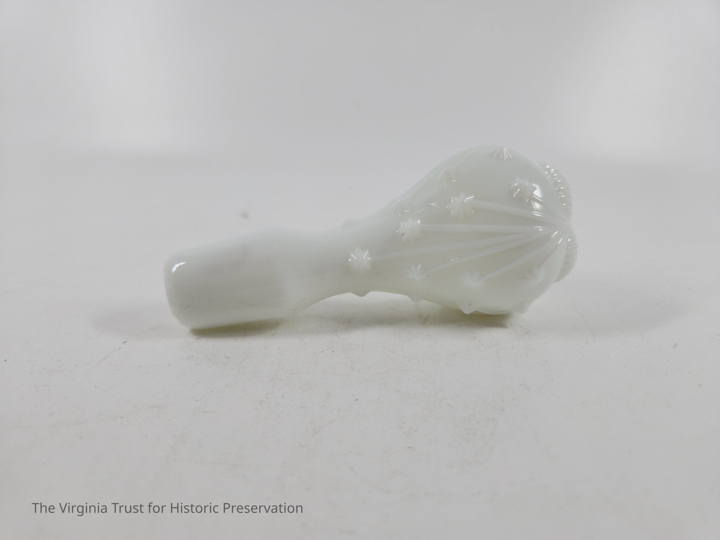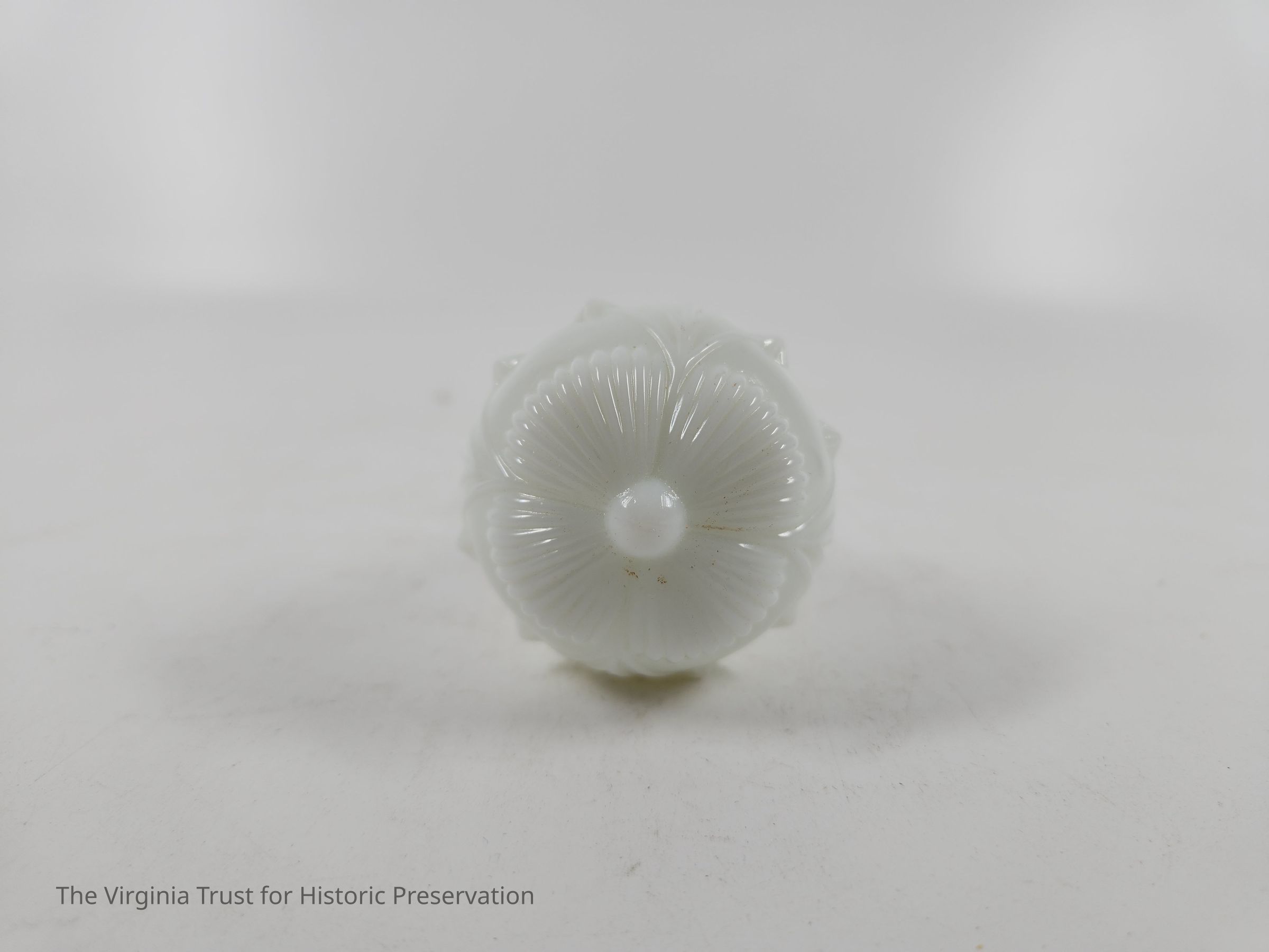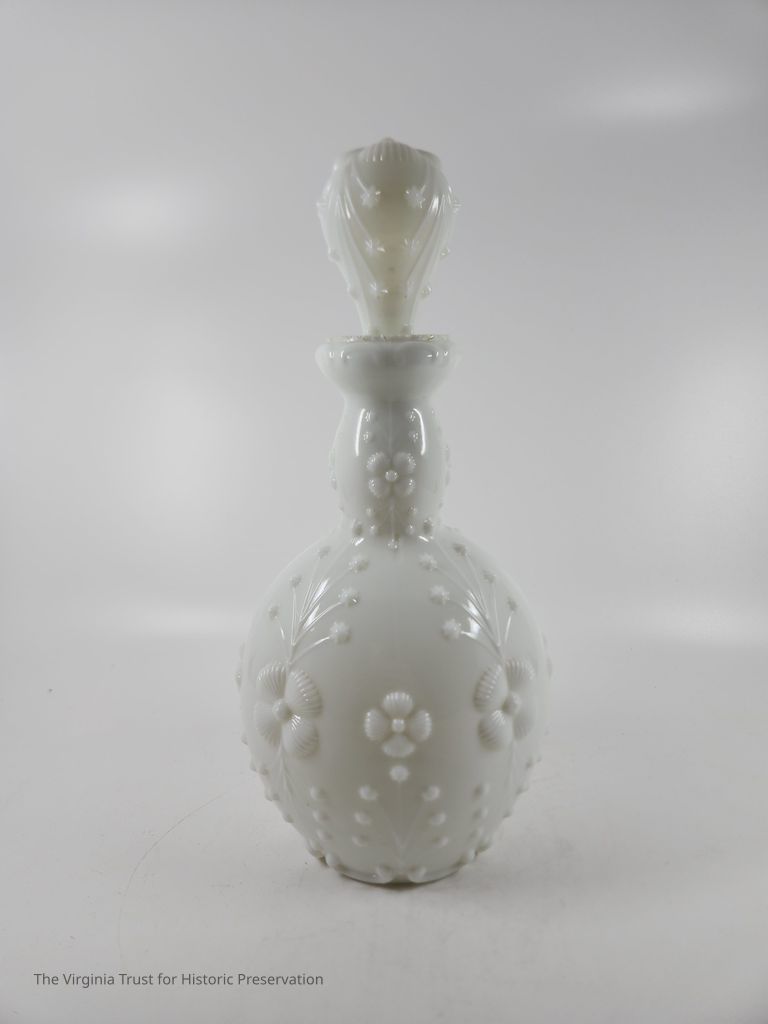 White milk glass stopper with floral design. Paired with bottle of matching floral design (2015.007 A)