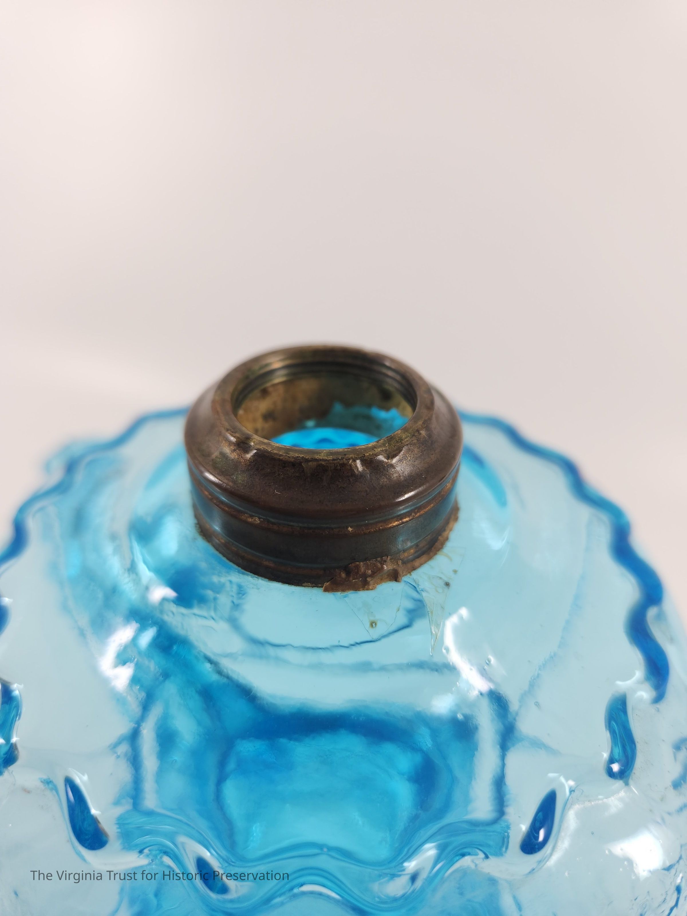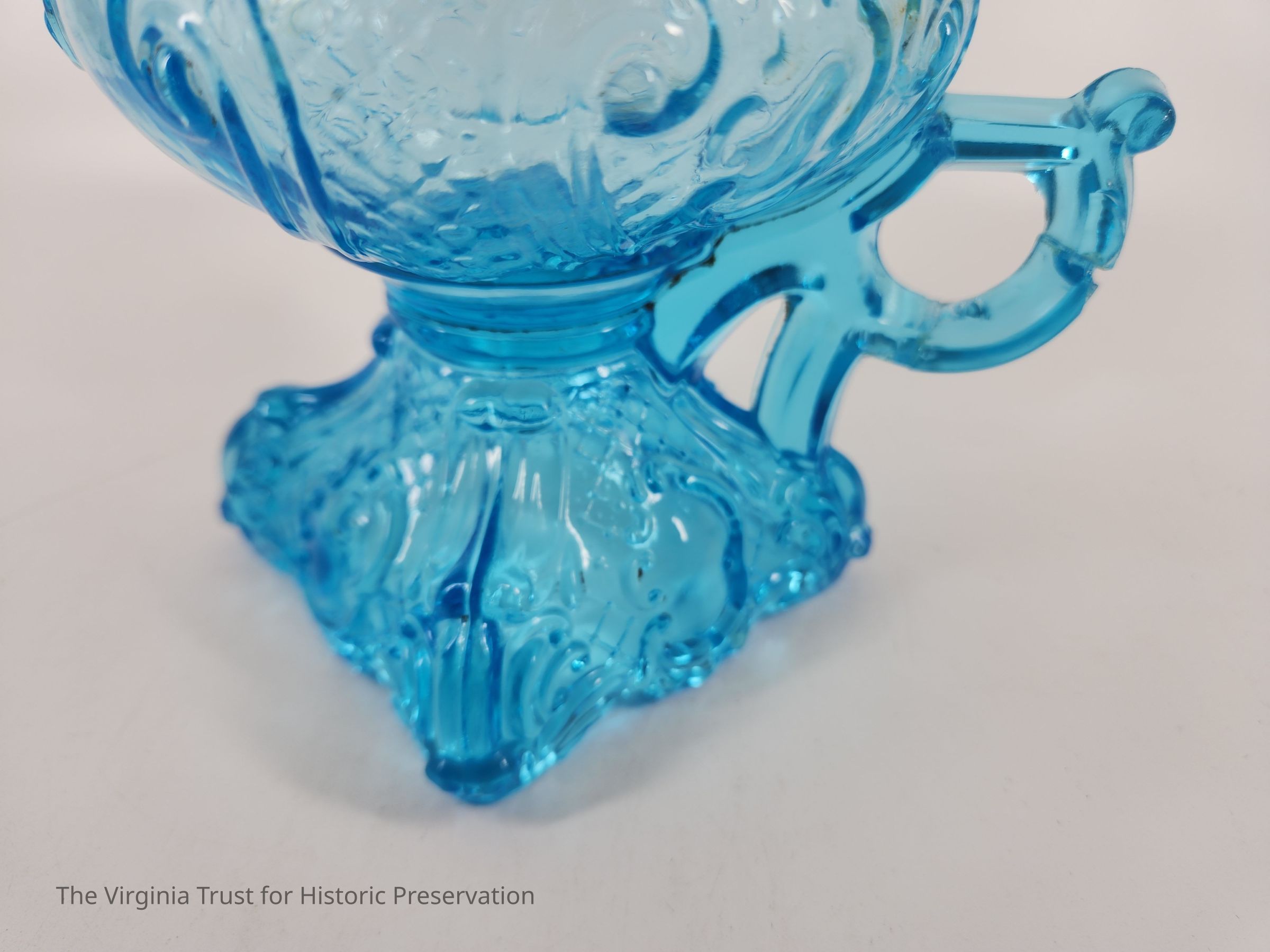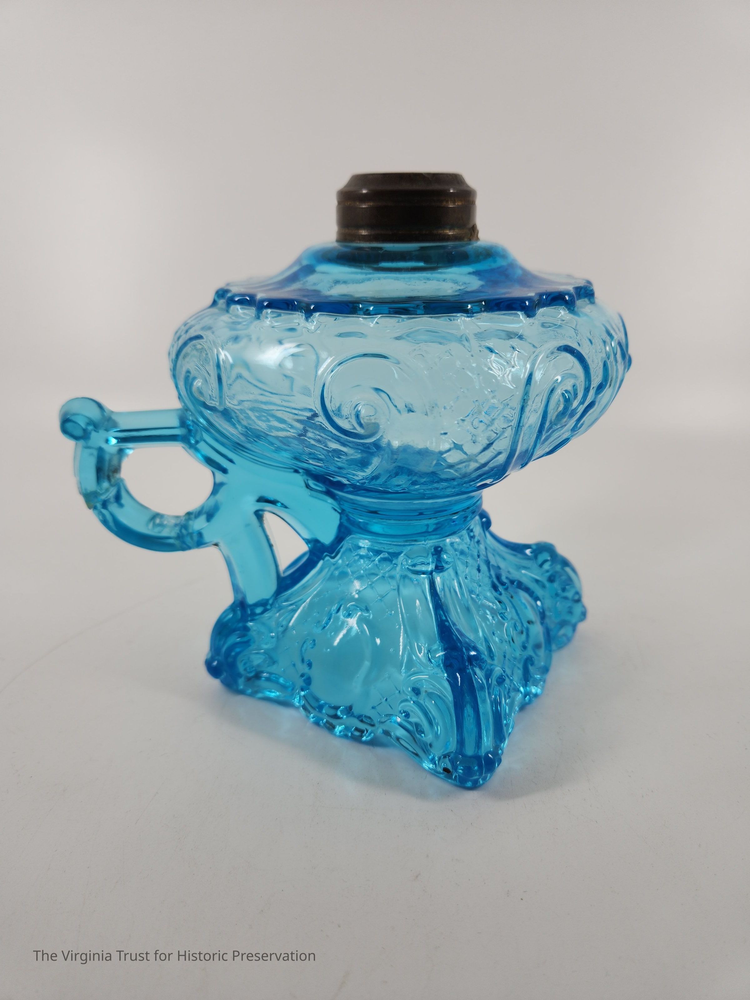 One of a pair of blue pressed glass finger oil lamps. Molded and pressed glass. Decorative foot. Rococo decorations including shields, crosshatching, and scrolls. Metal mount at top, missing lid.