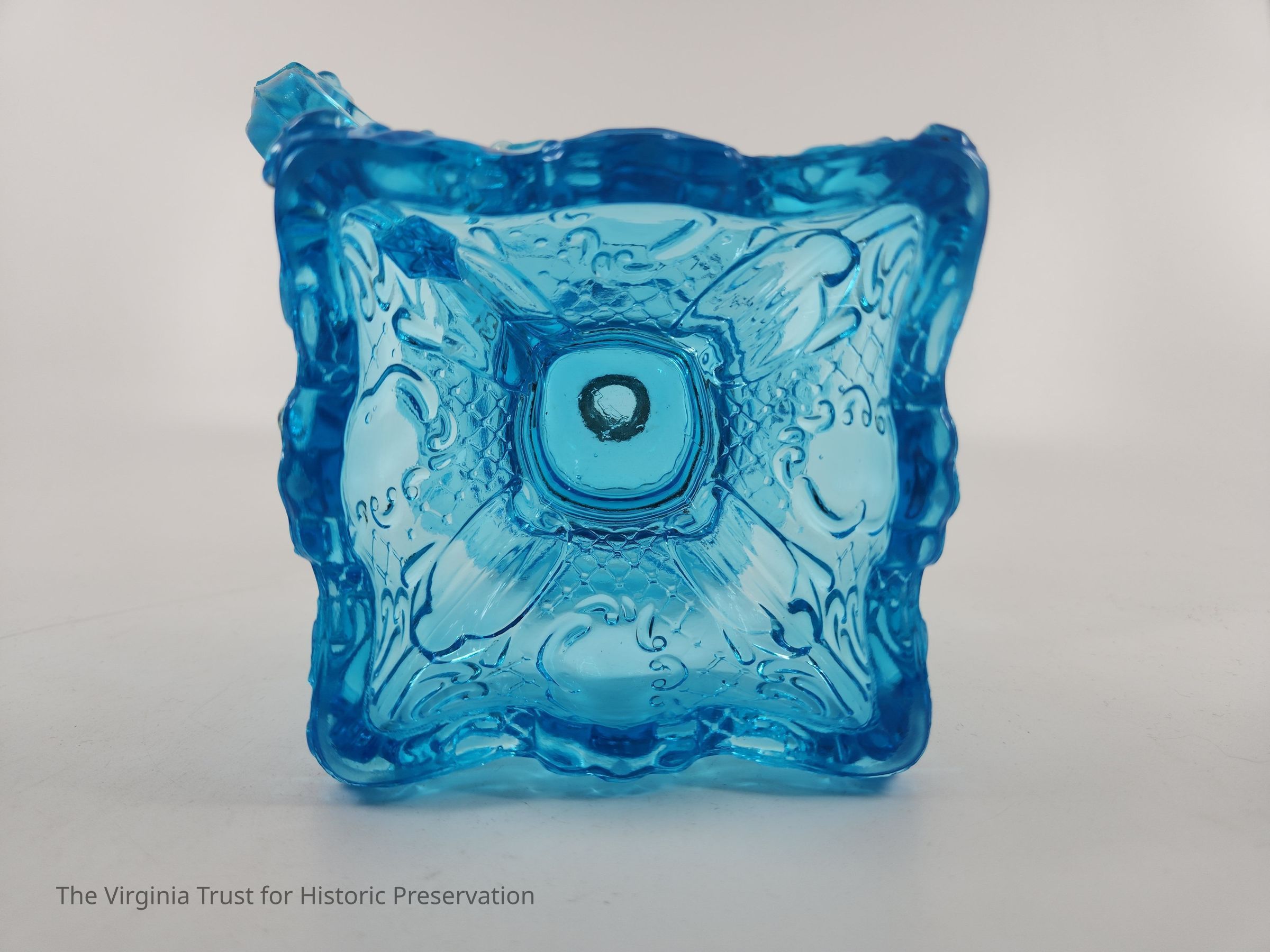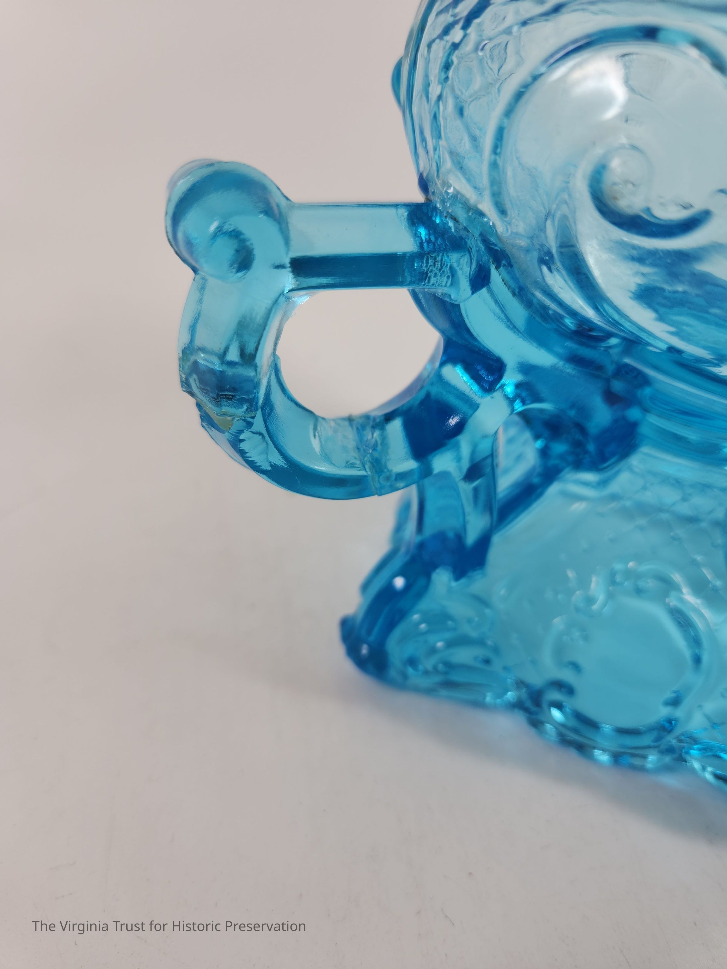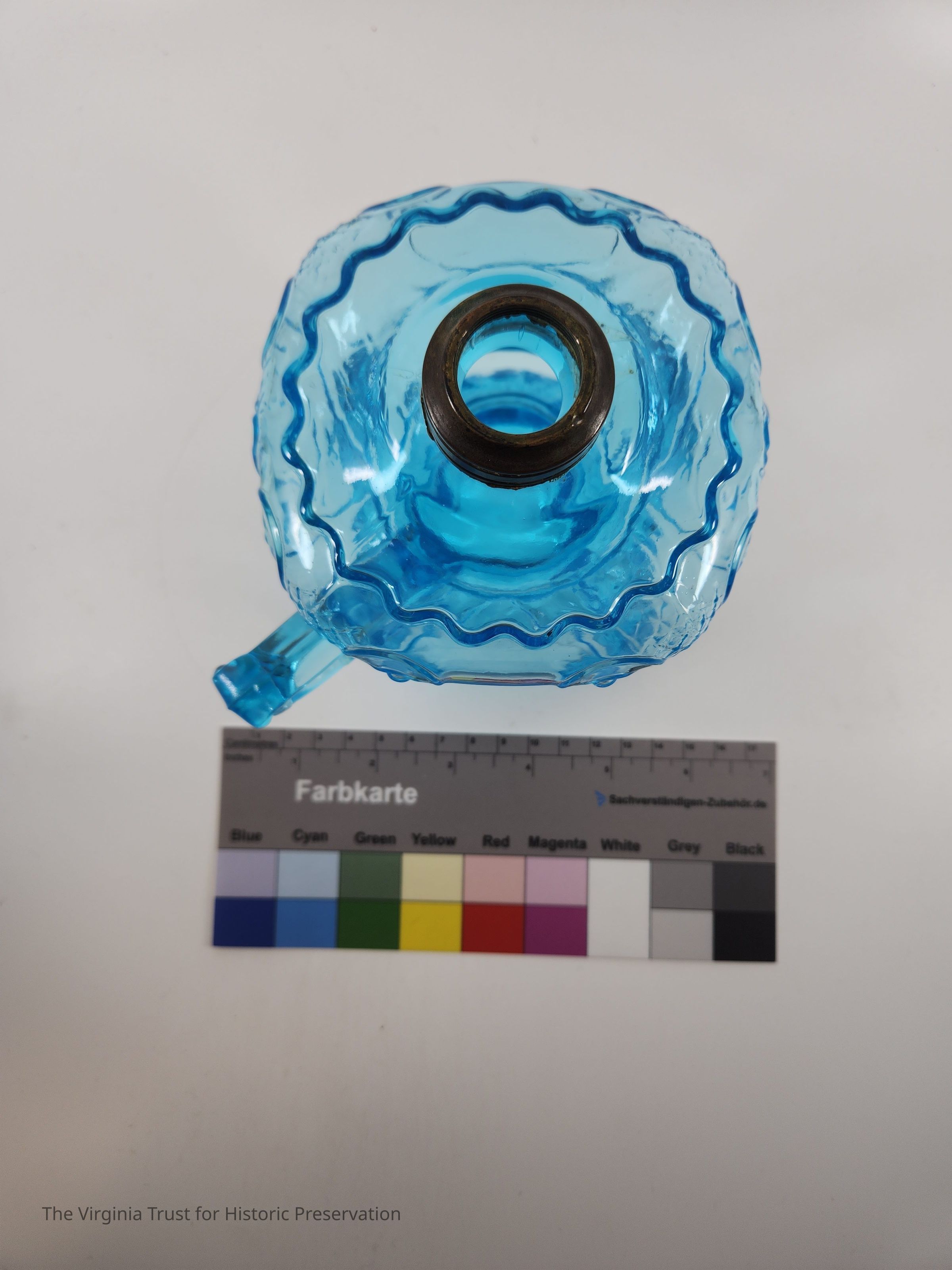 One of a pair of blue pressed glass finger oil lamps. Molded and pressed glass. Decorative foot. Rococo decorations including shields, crosshatching, and scrolls. Metal mount at top, missing lid.