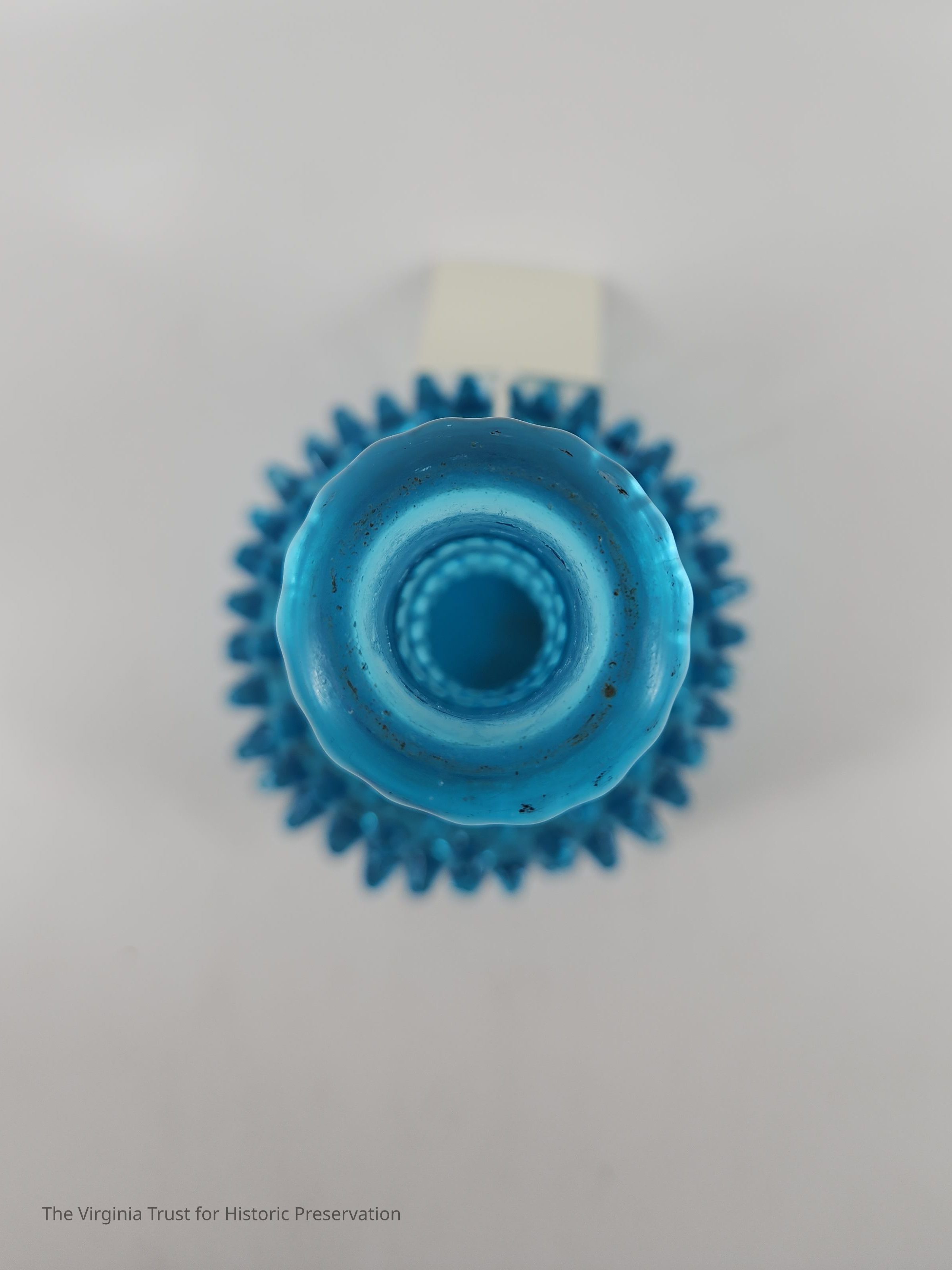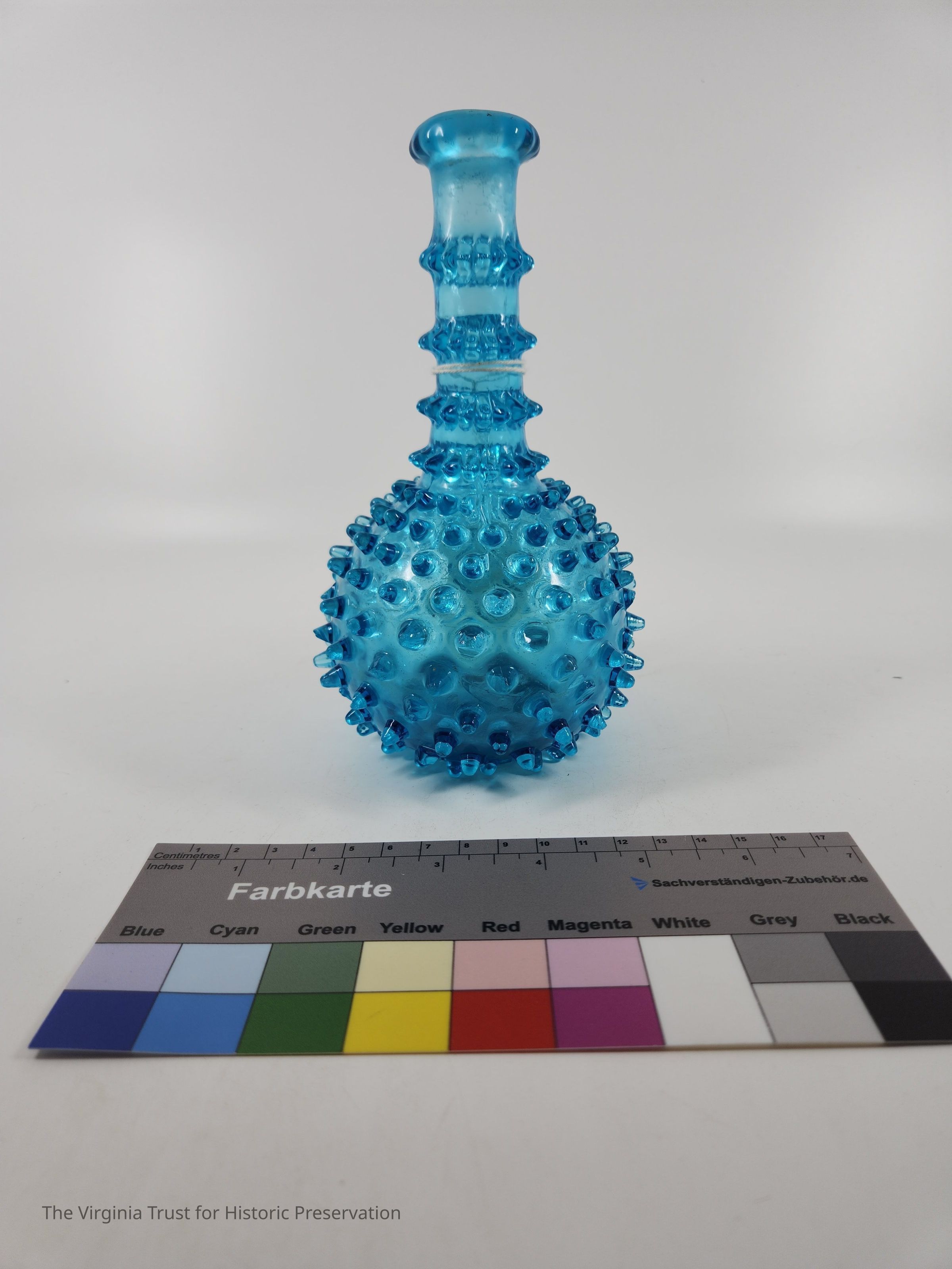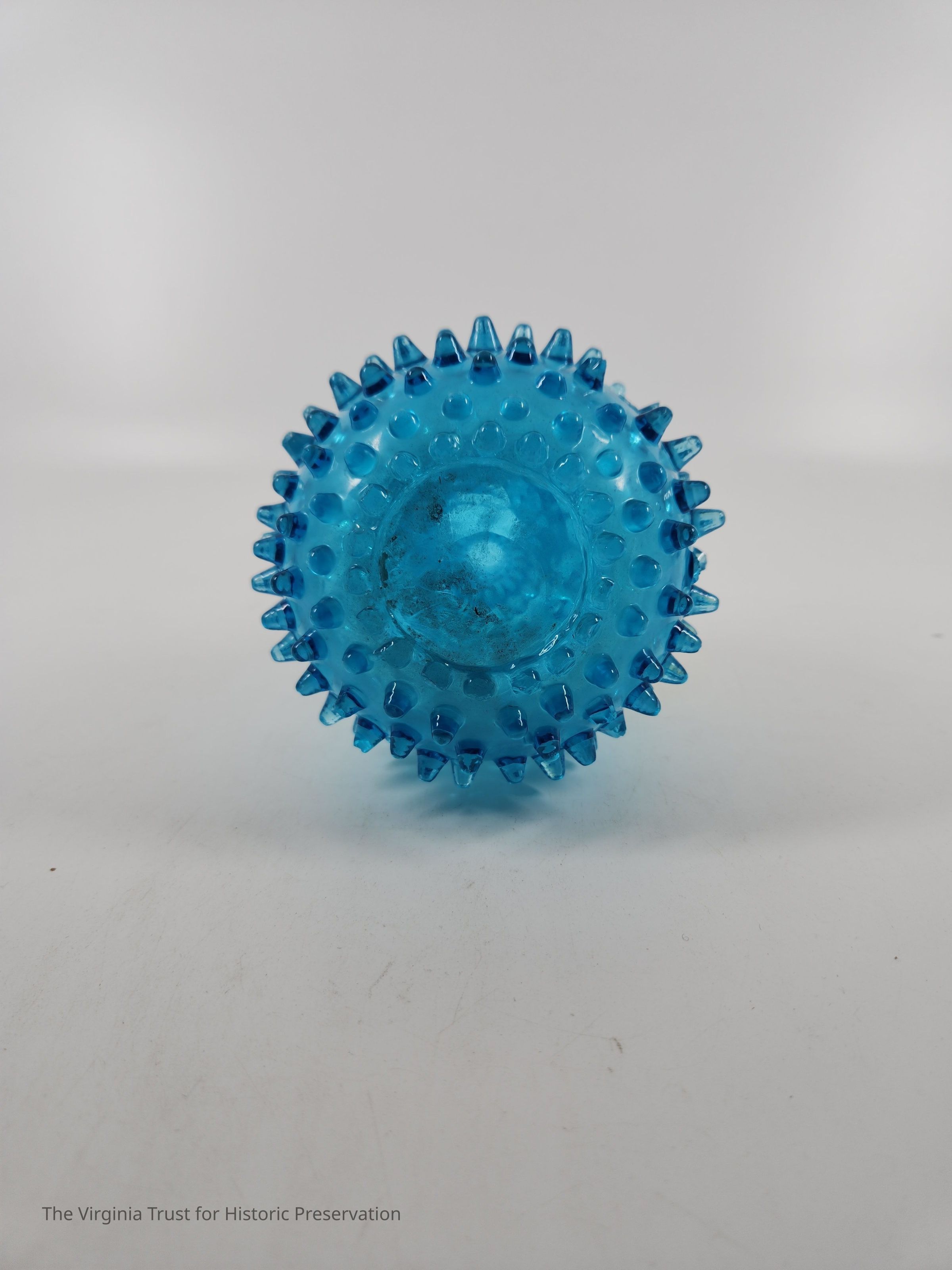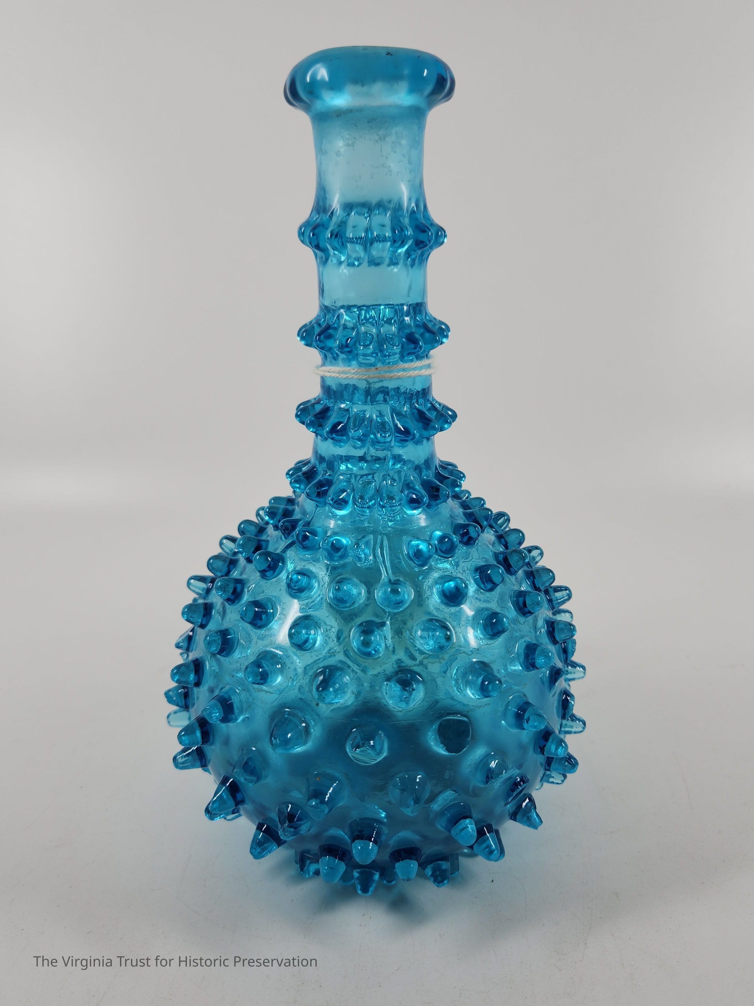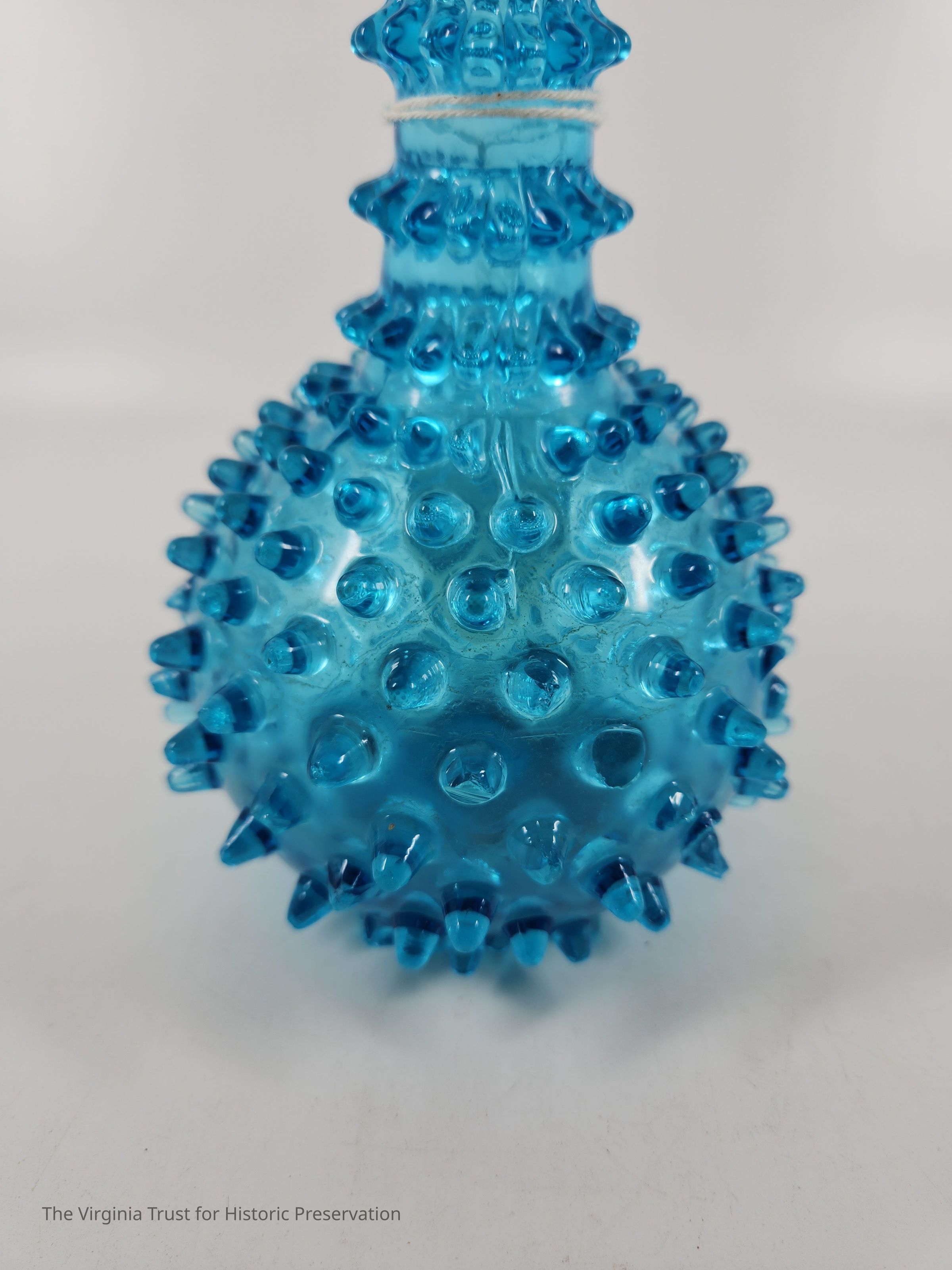 One of a pair of blue pressed glass vases. Bulbous form with decorative protrusions. Neck of bottle has three decorative bands. Molded glass. Thick fringed lip. Pair with 2015.010.Dimensions