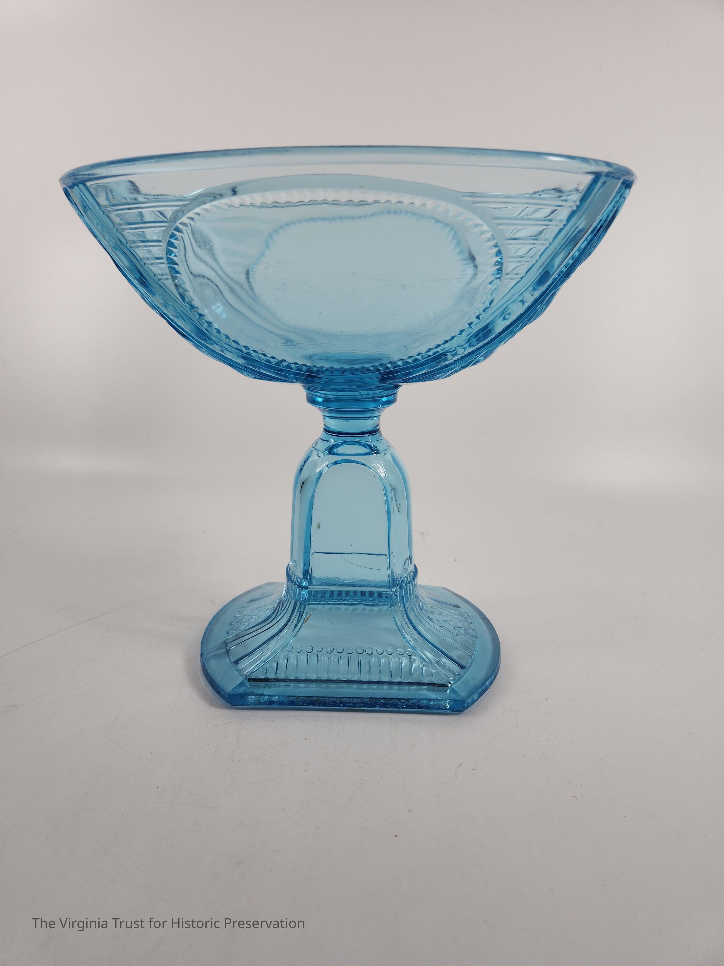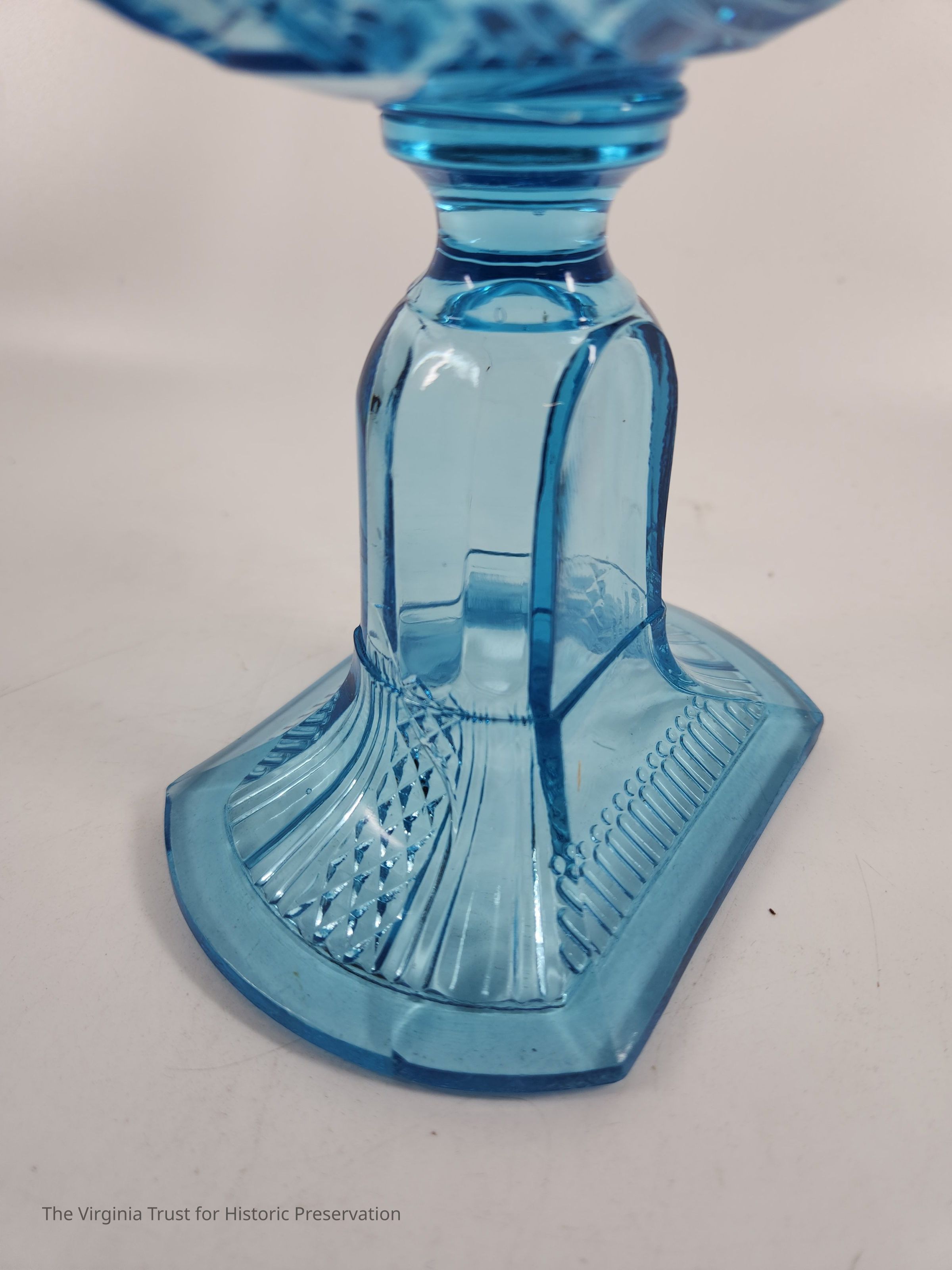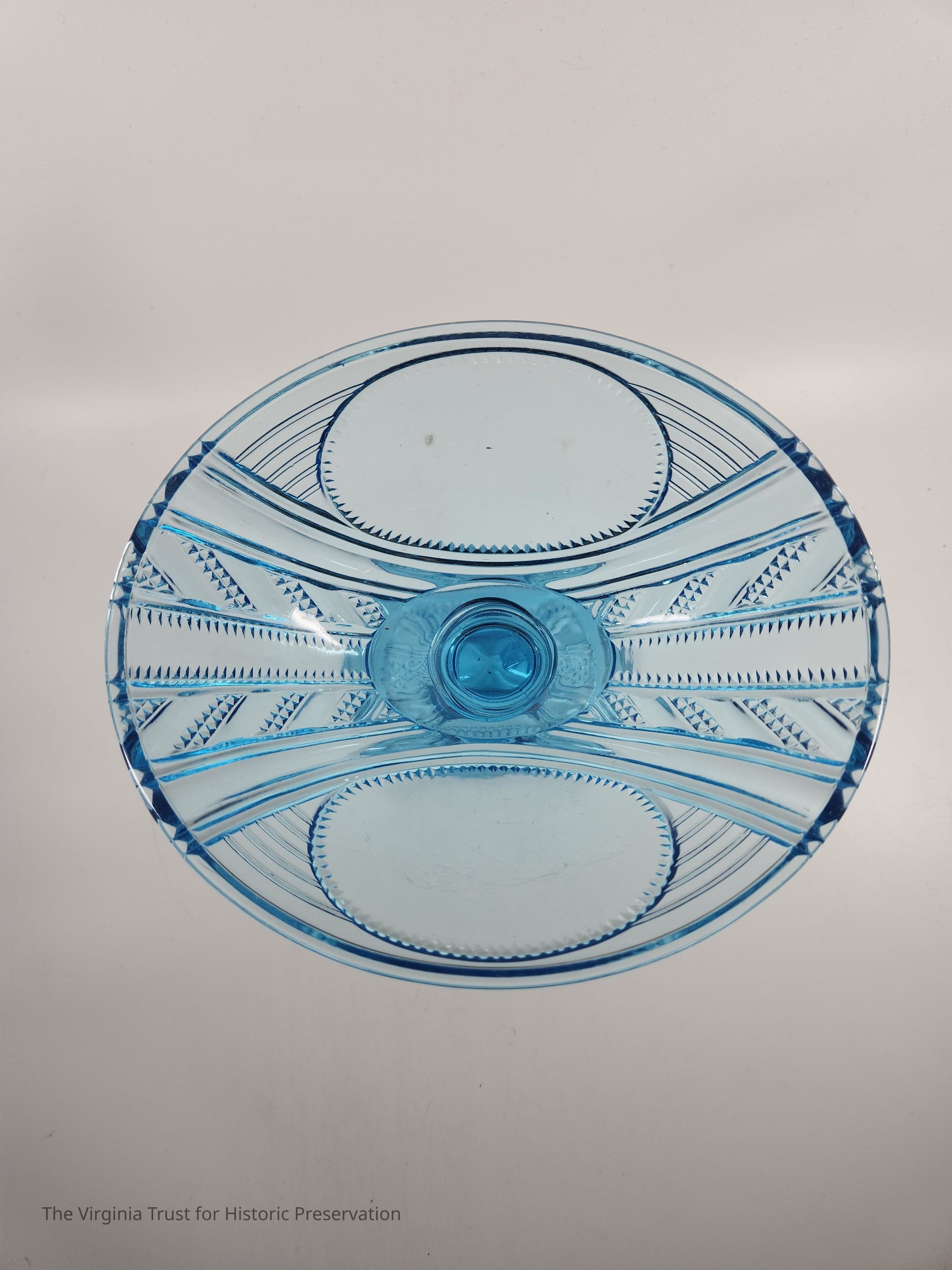Blue glass compote with a molded base and pressed bowl. Bowl has a blank central medallion surrounded by linear decorative line patterns. Base has diamond and line patterns for decoration. Flared foot.Dimensions