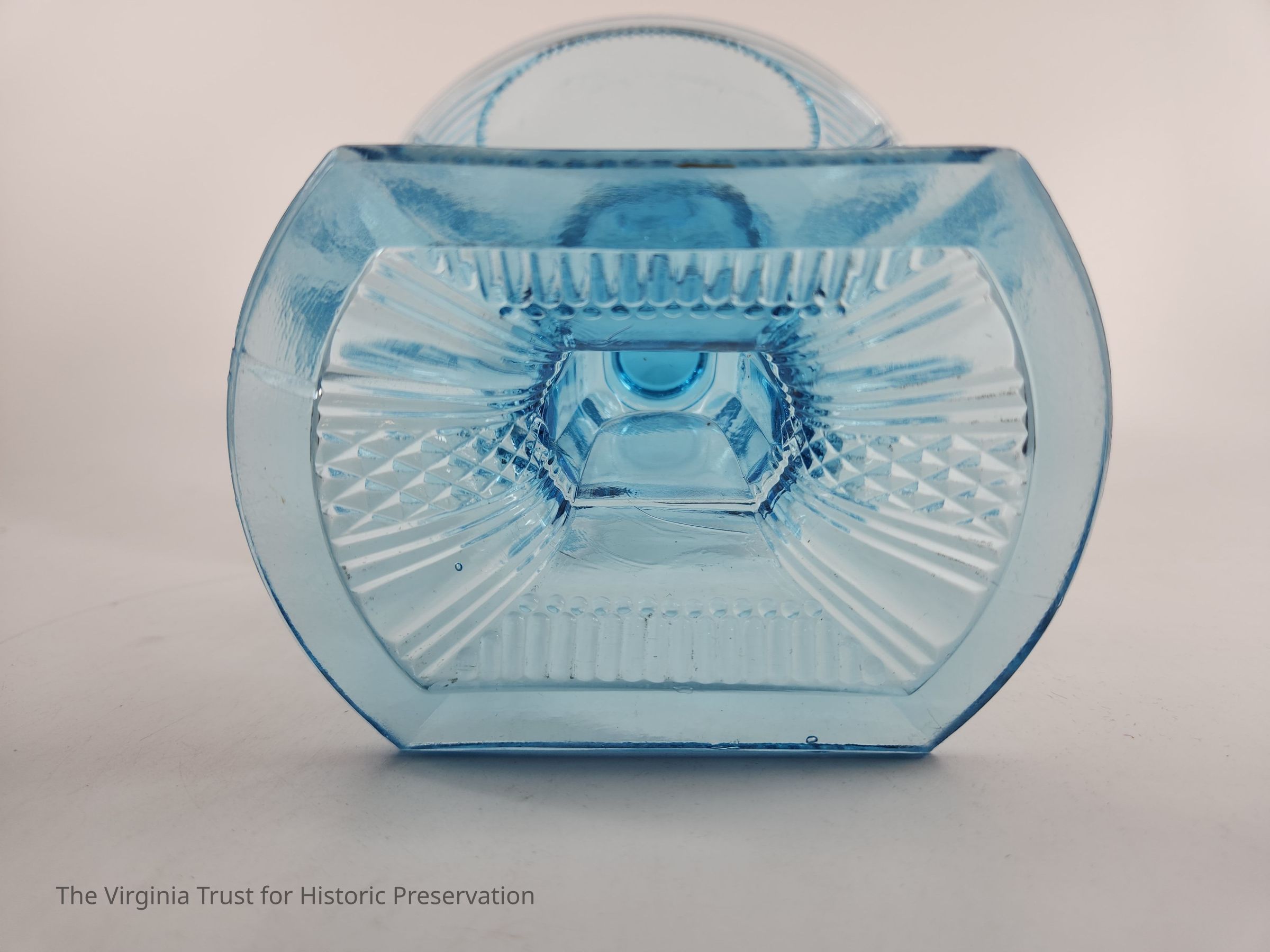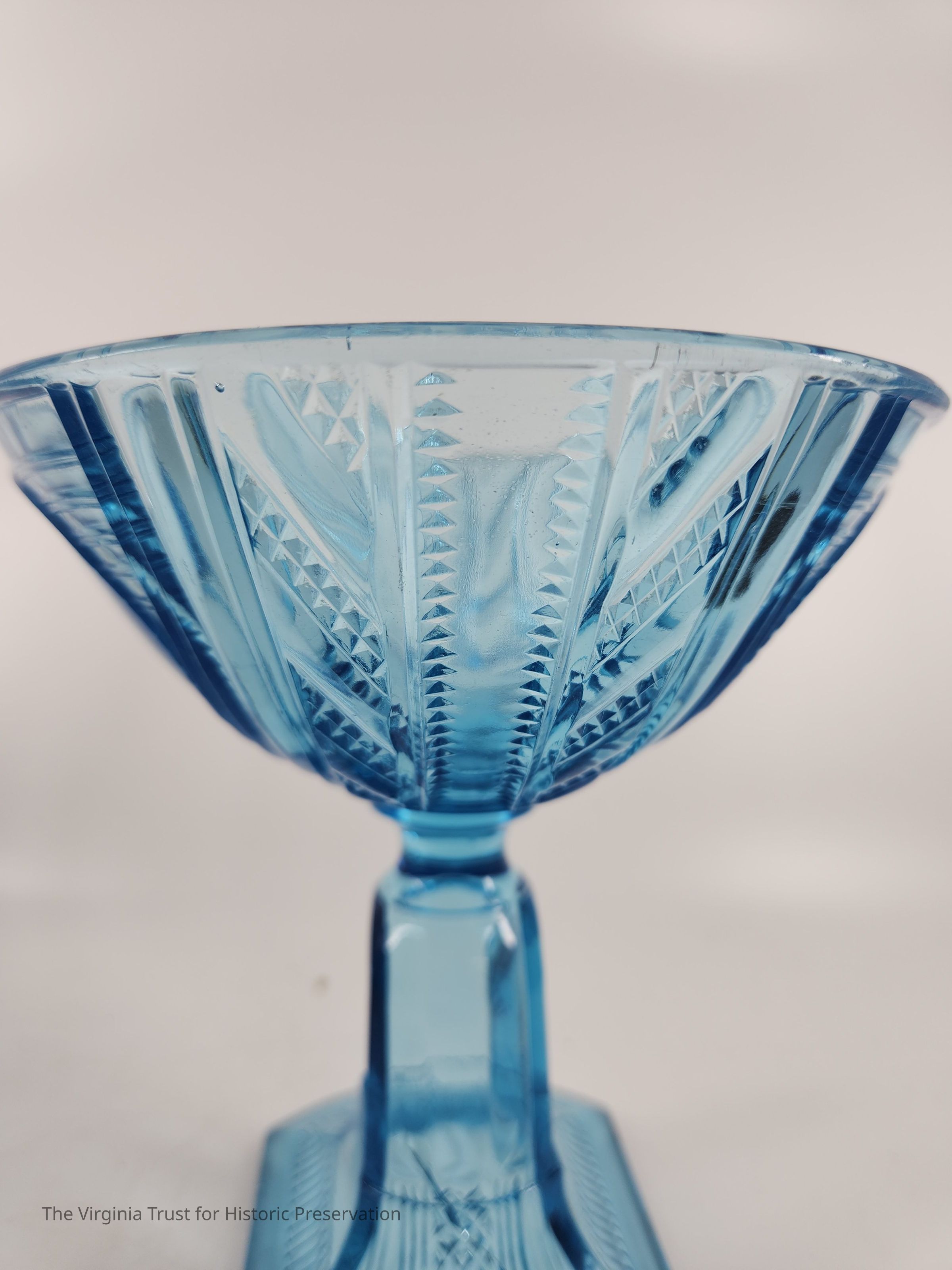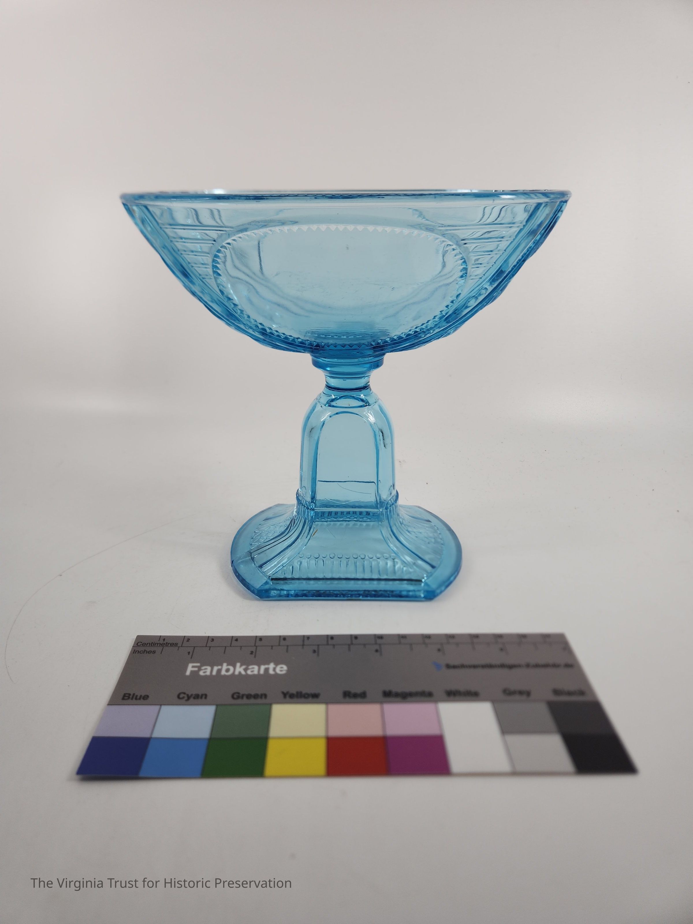 Blue glass compote with a molded base and pressed bowl. Bowl has a blank central medallion surrounded by linear decorative line patterns. Base has diamond and line patterns for decoration. Flared foot.Dimensions