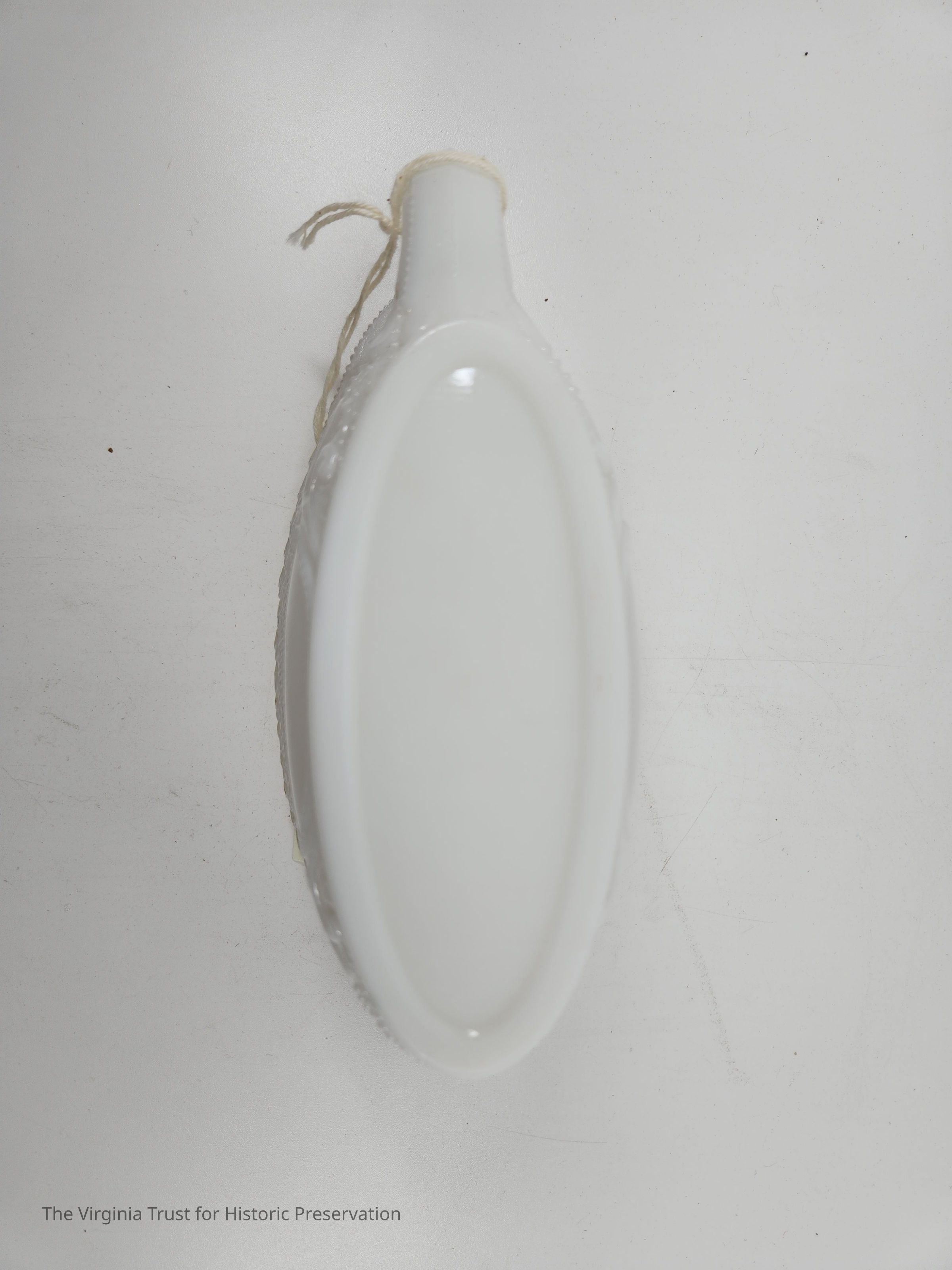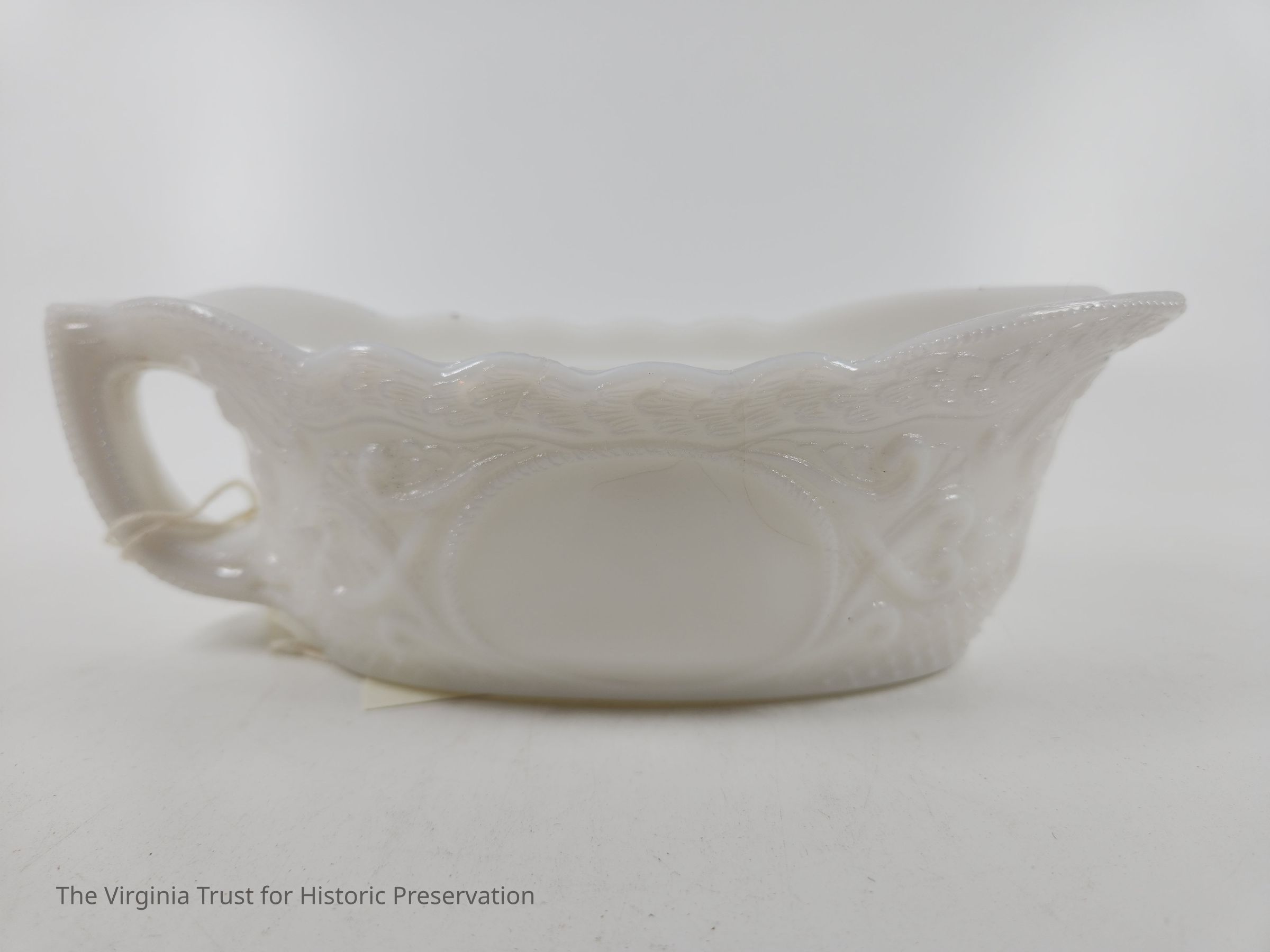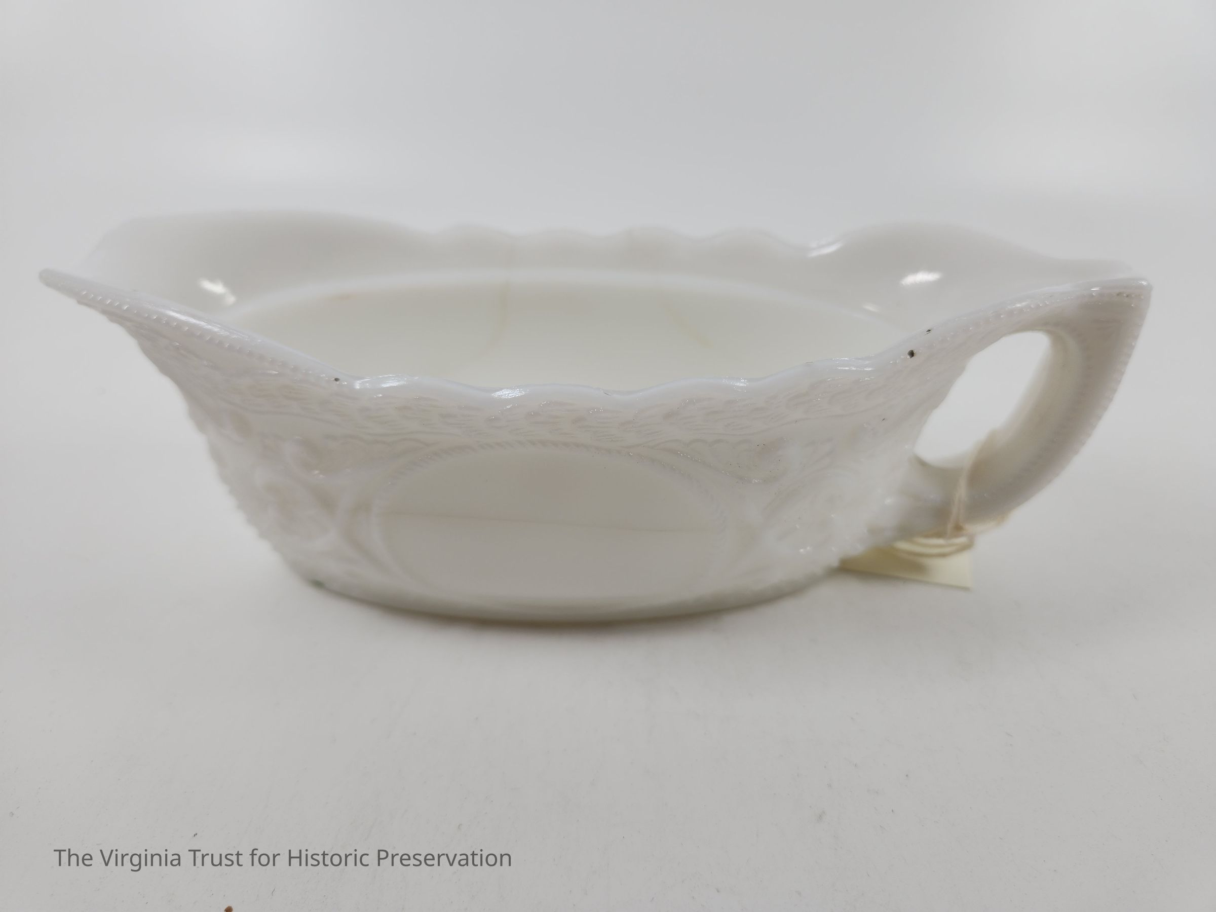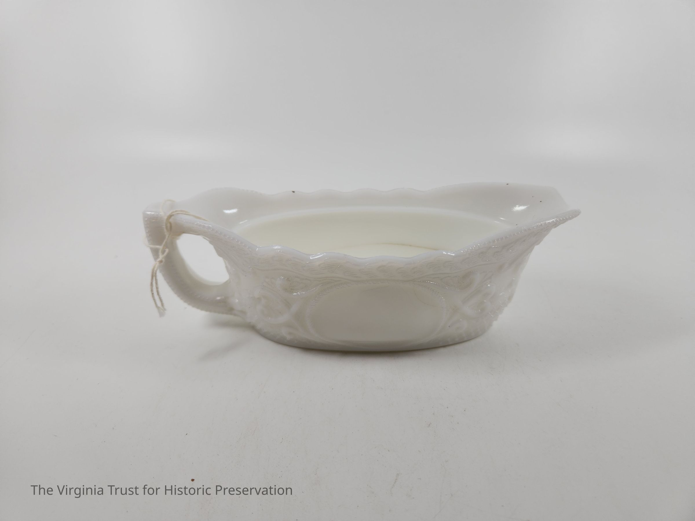 Milk glass. Central blank medallion. Crosshatching, scroll work, and decorative top border (possibly waves). Pressed and molded glass. Matched with 2015.013 B (lid).Dimensions
