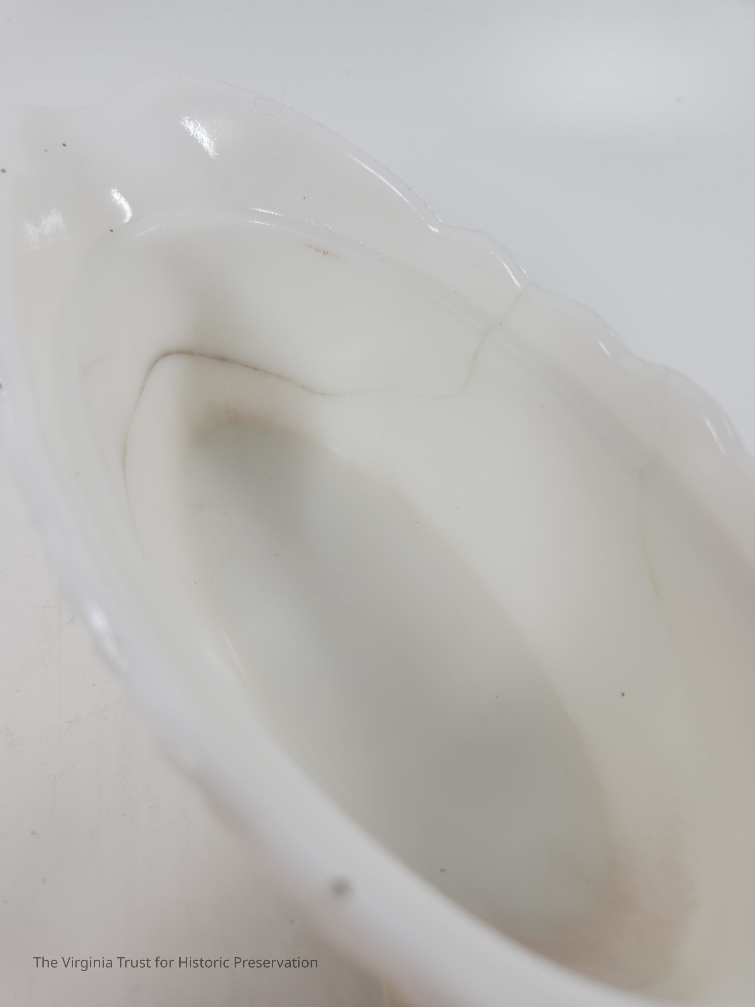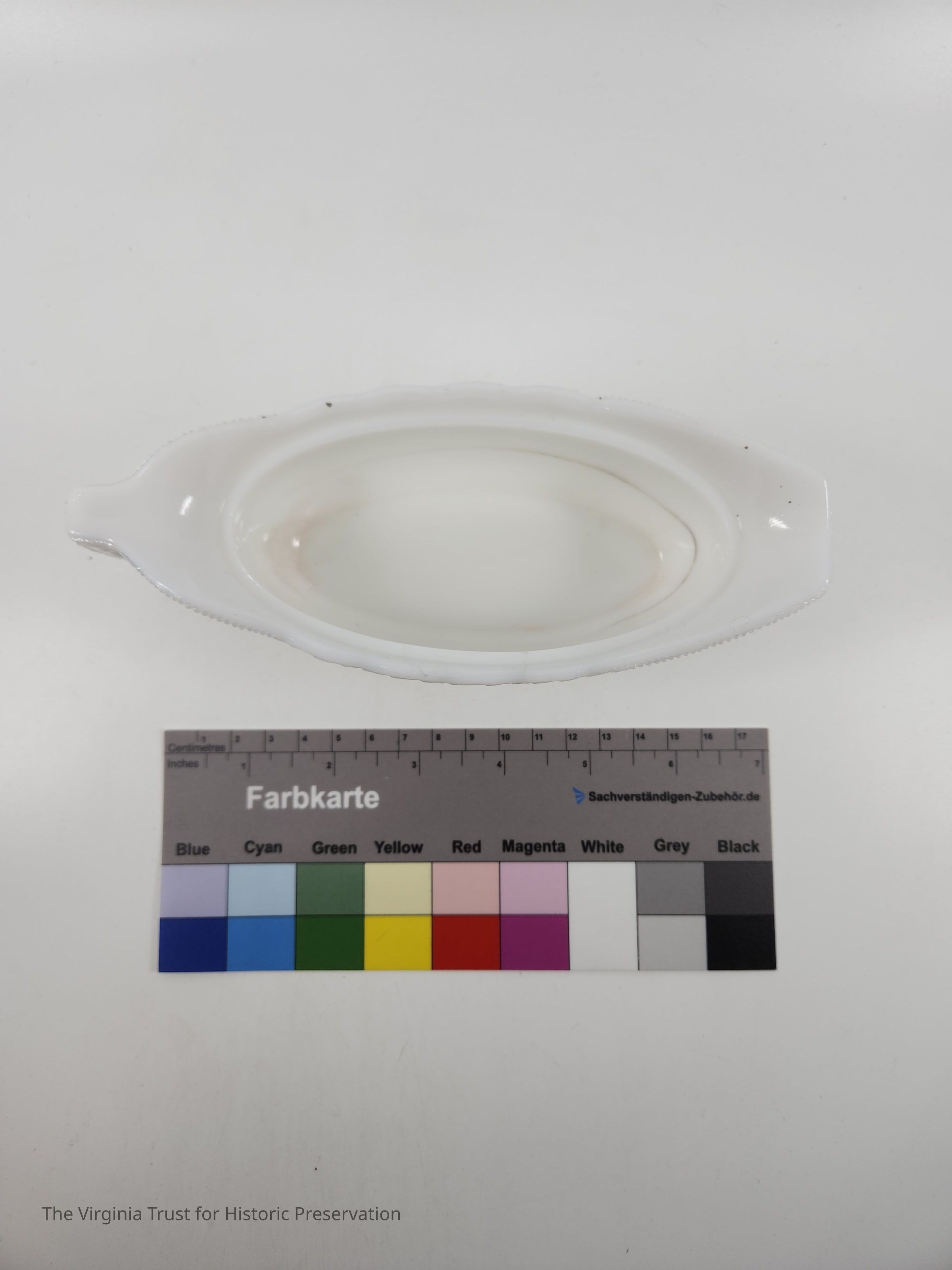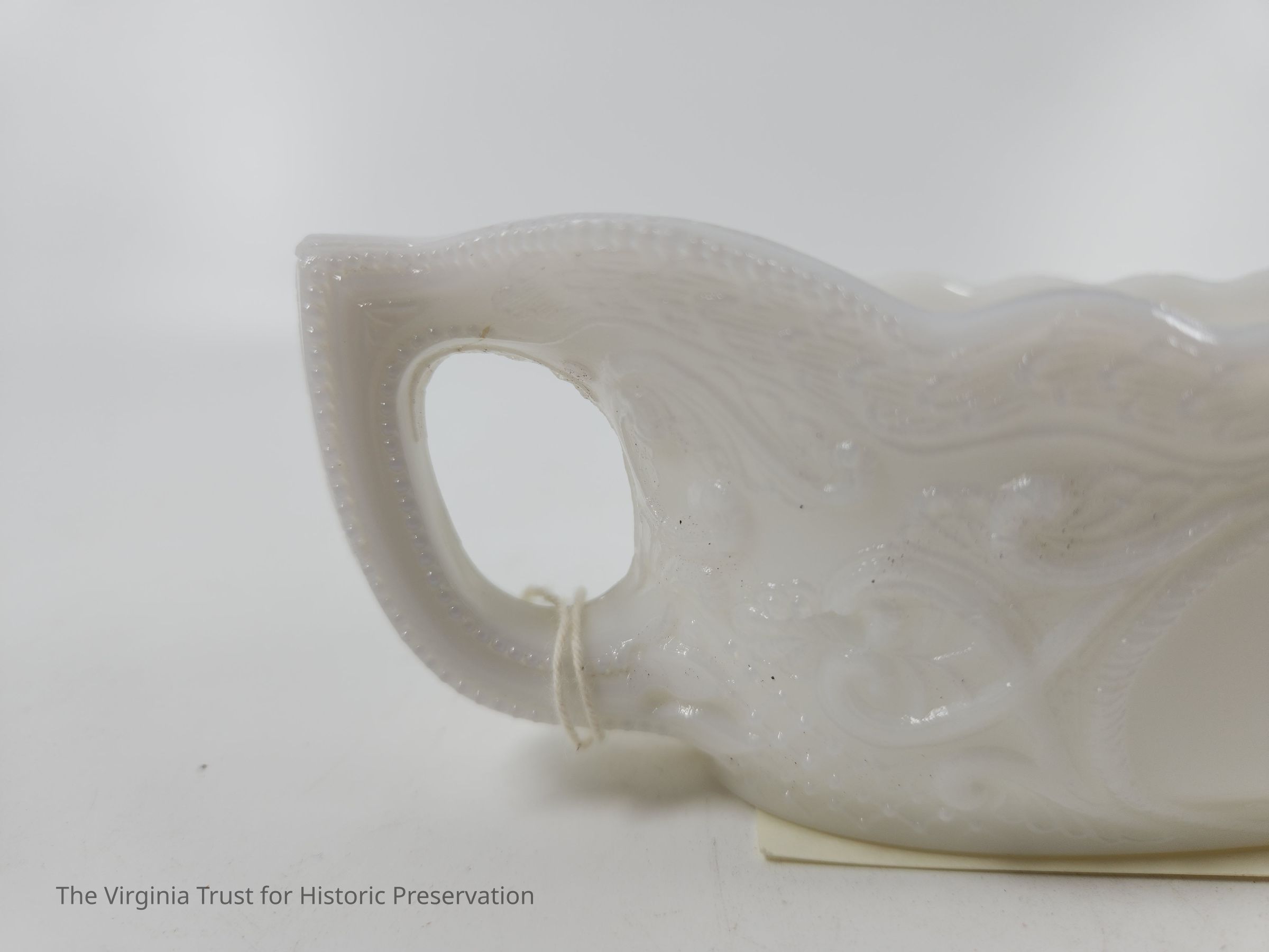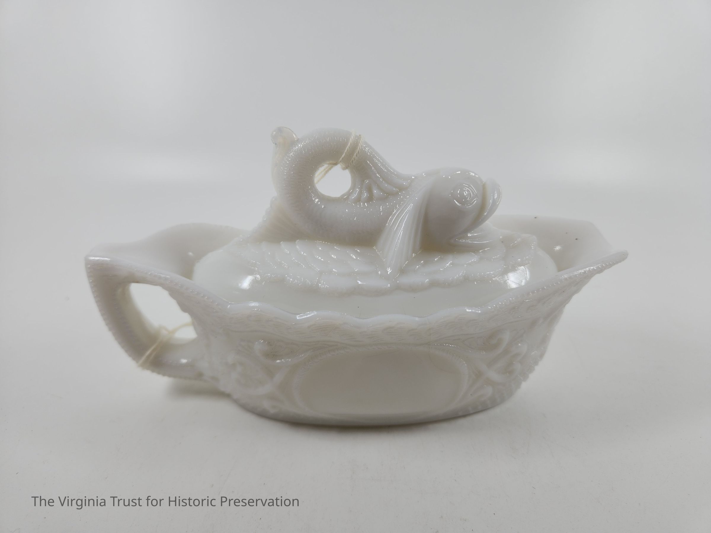 Milk glass. Central blank medallion. Crosshatching, scroll work, and decorative top border (possibly waves). Pressed and molded glass. Matched with 2015.013 B (lid).Dimensions