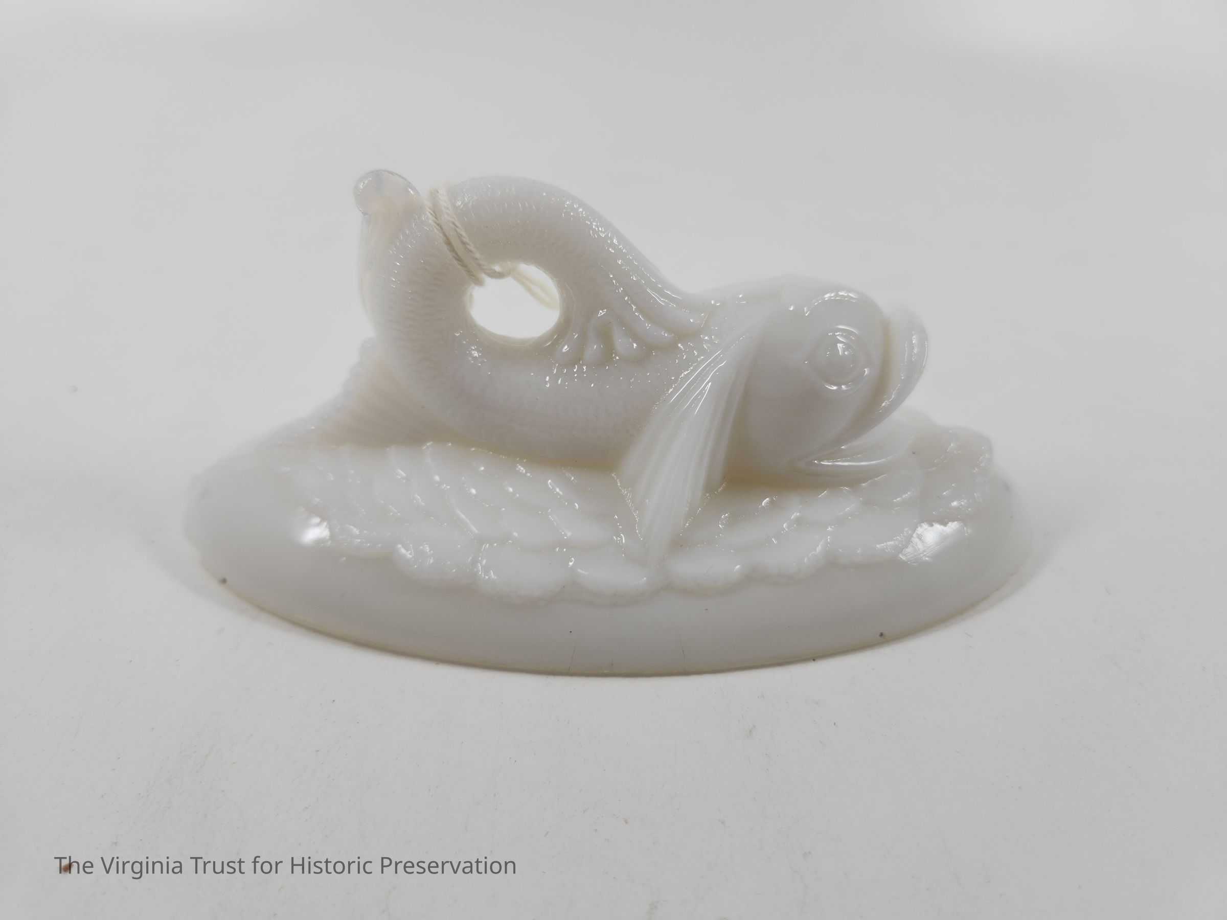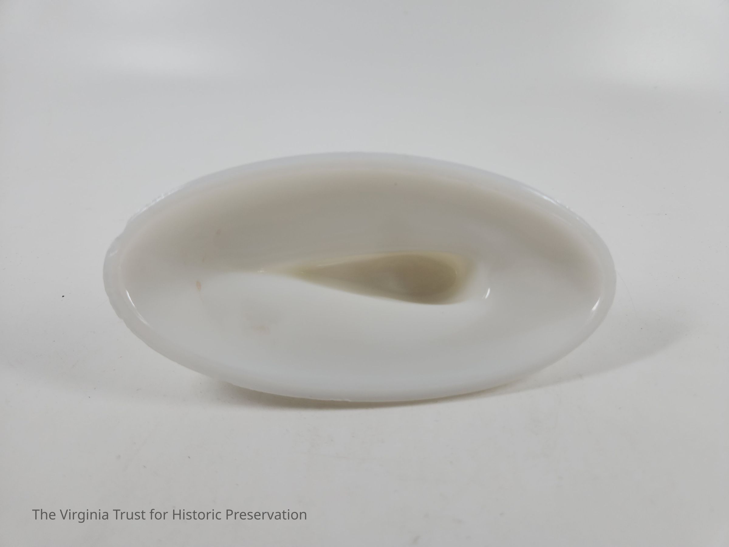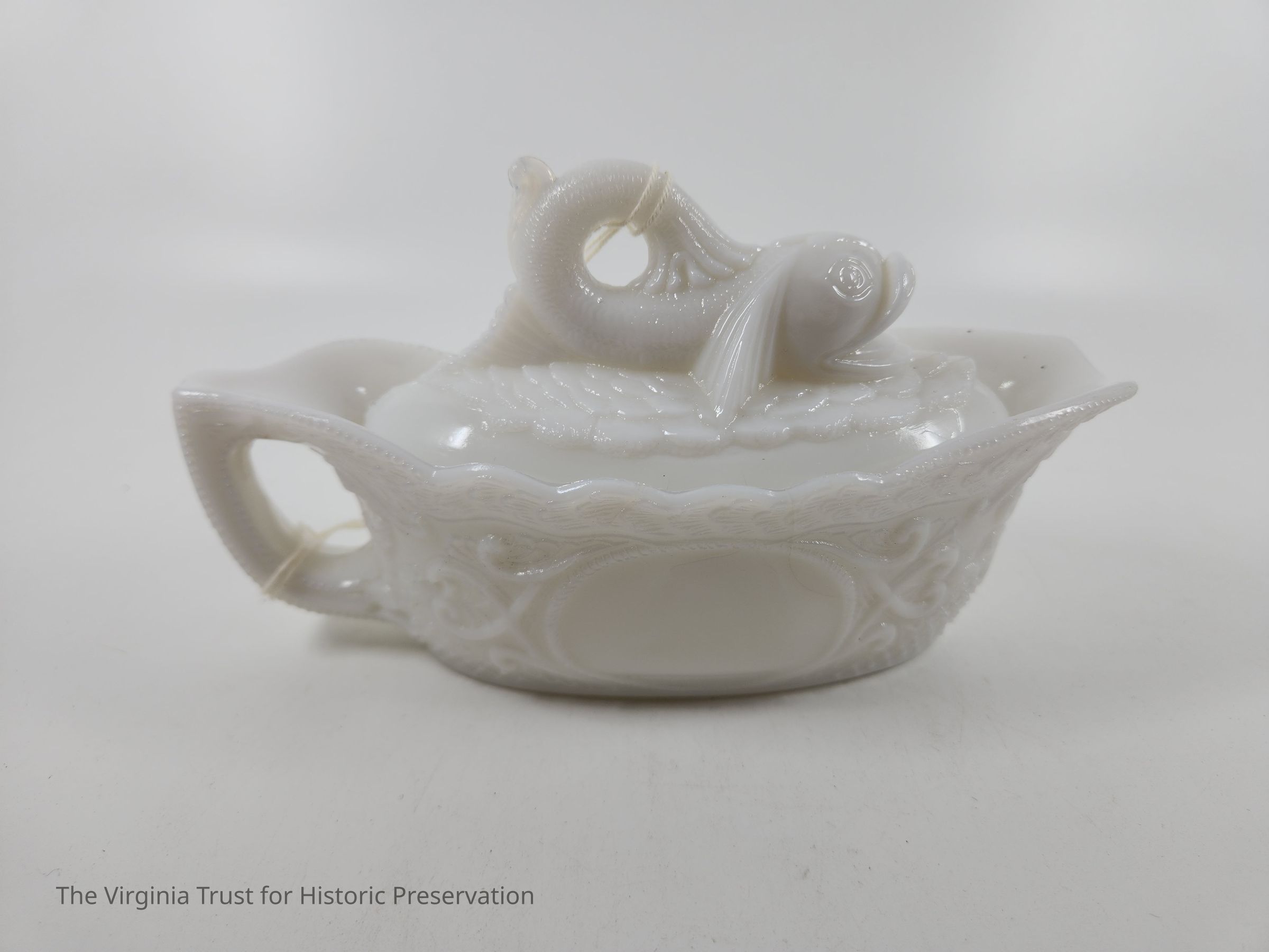 Milk glass, pressed glass. Oval shaped. Renaissance dolphin with wave pattern underneath. Matched with object 2015.013 A (sauceboat). Falkor.