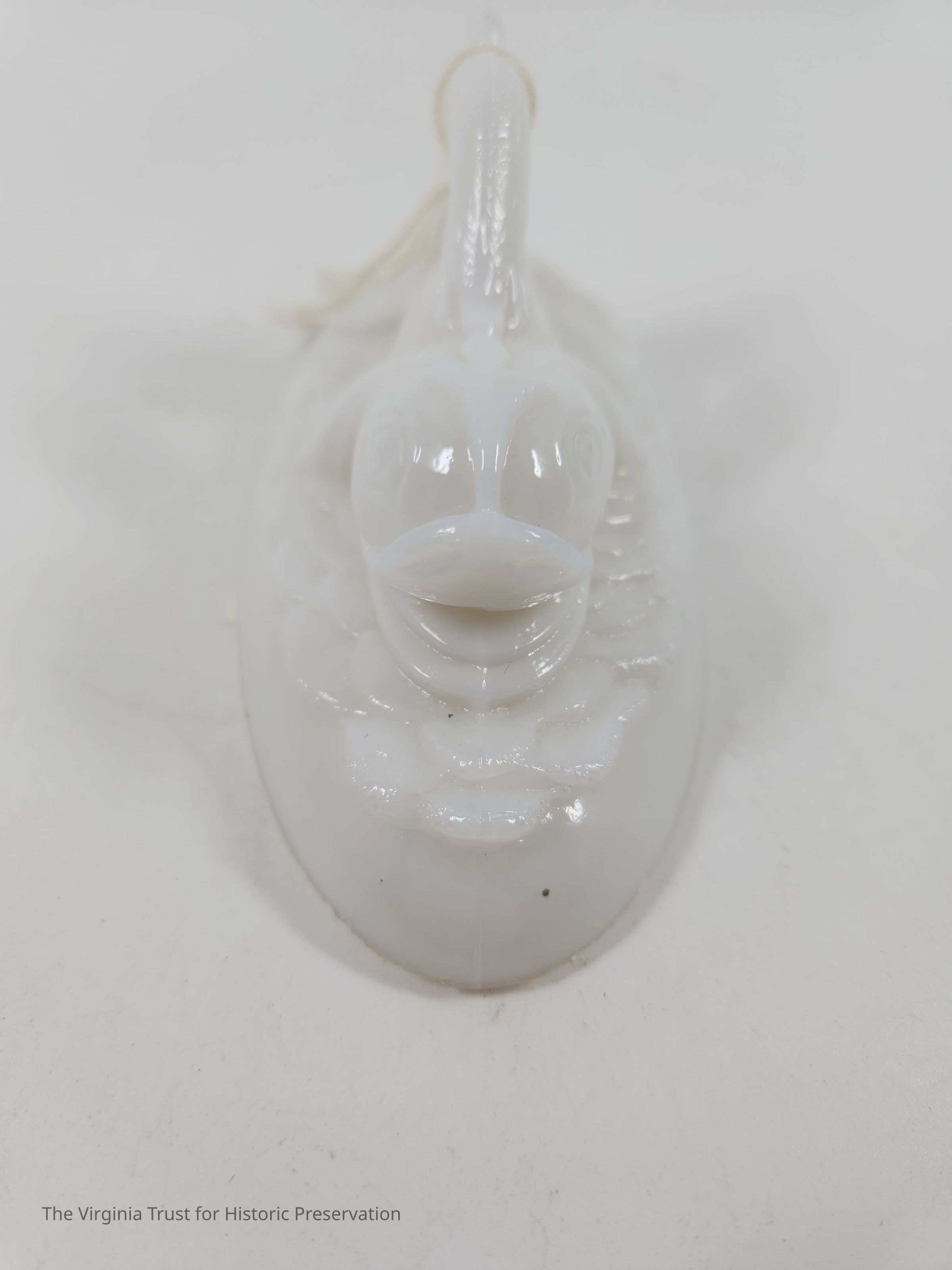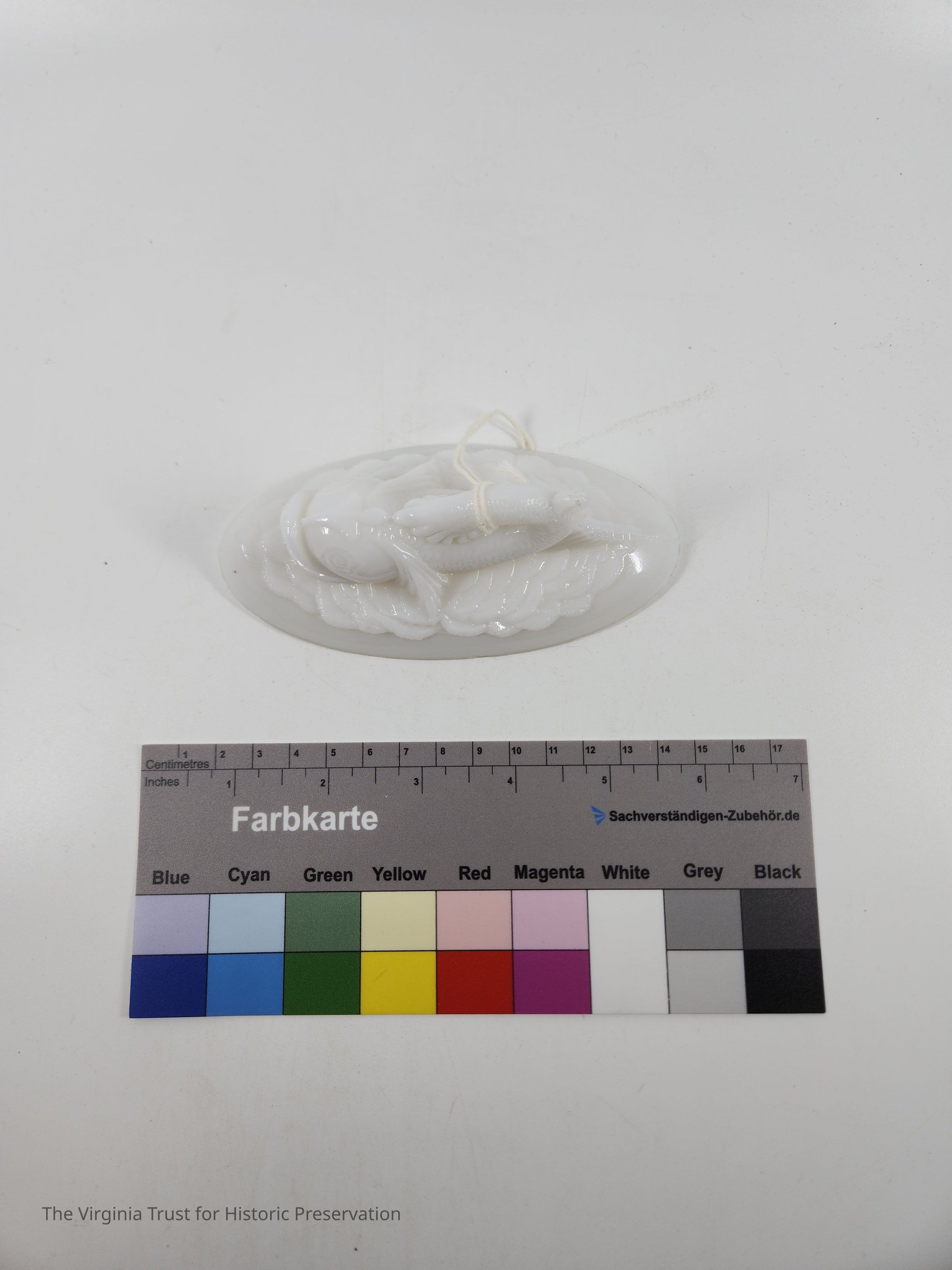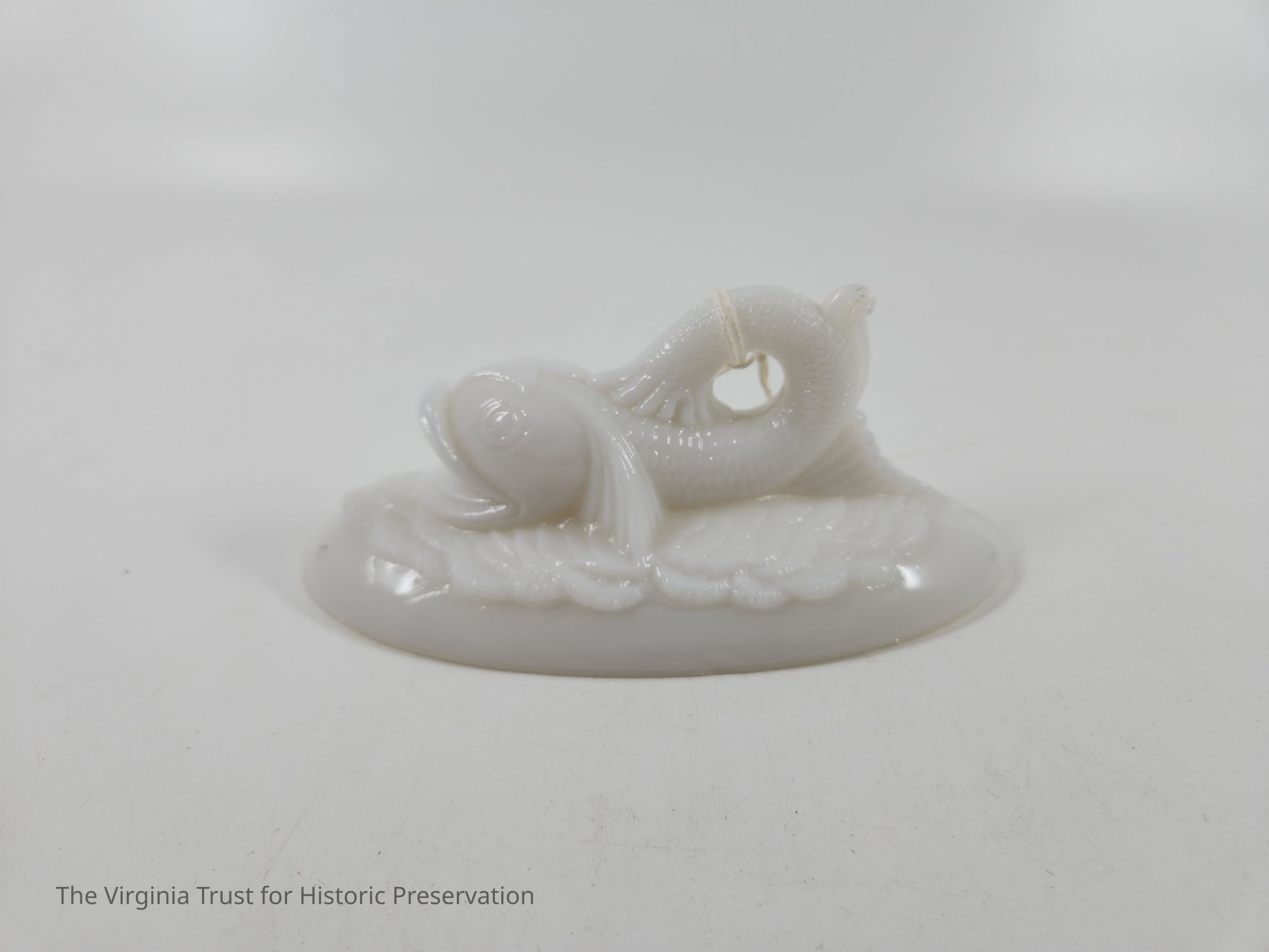 Milk glass, pressed glass. Oval shaped. Renaissance dolphin with wave pattern underneath. Matched with object 2015.013 A (sauceboat). Falkor.