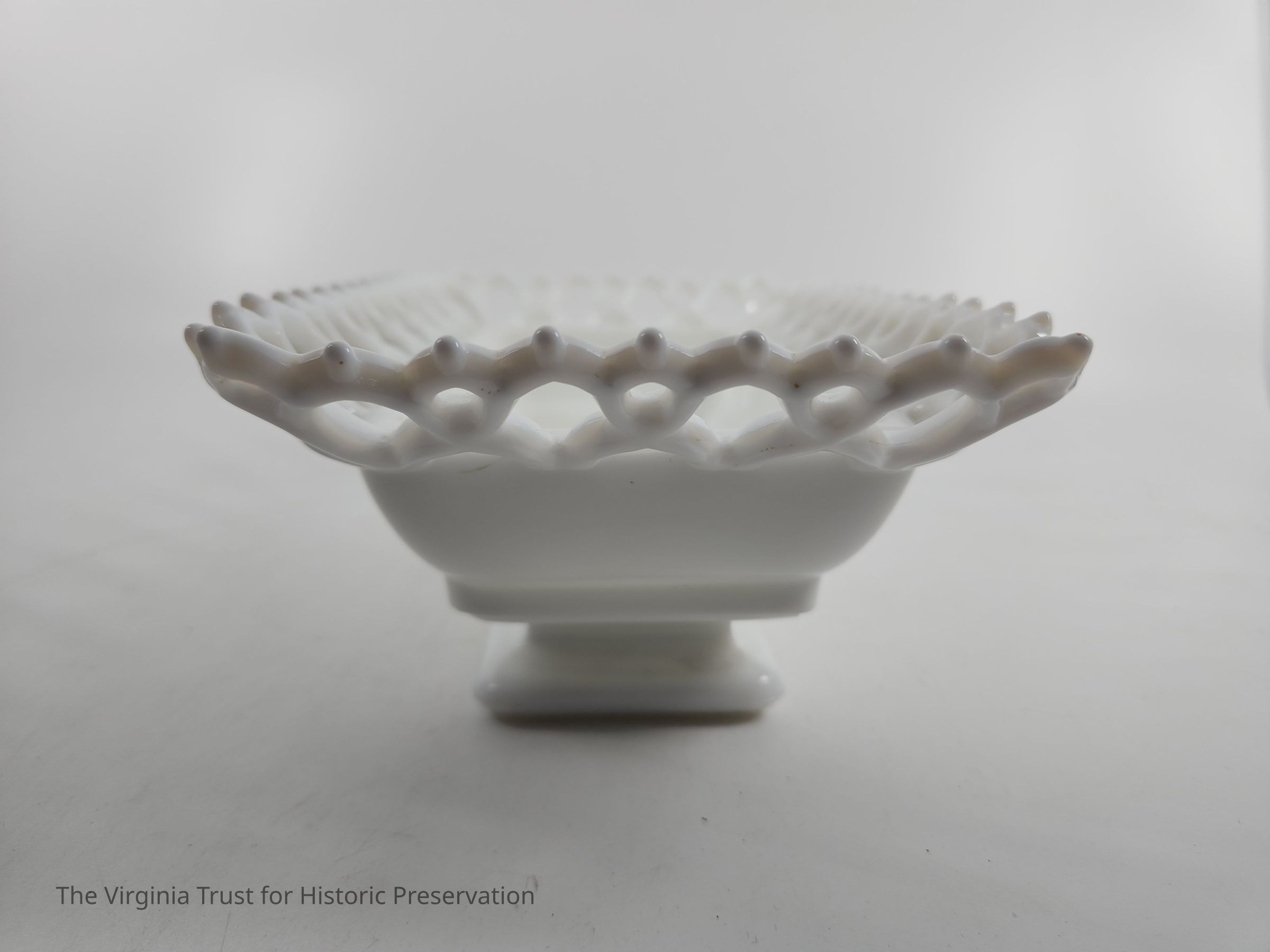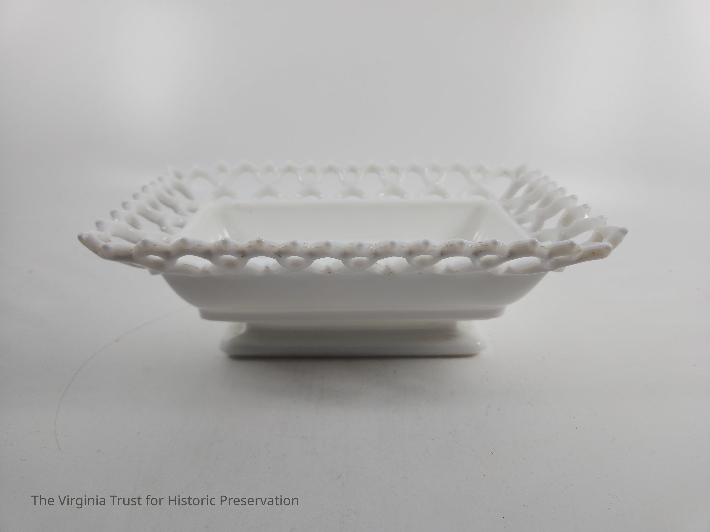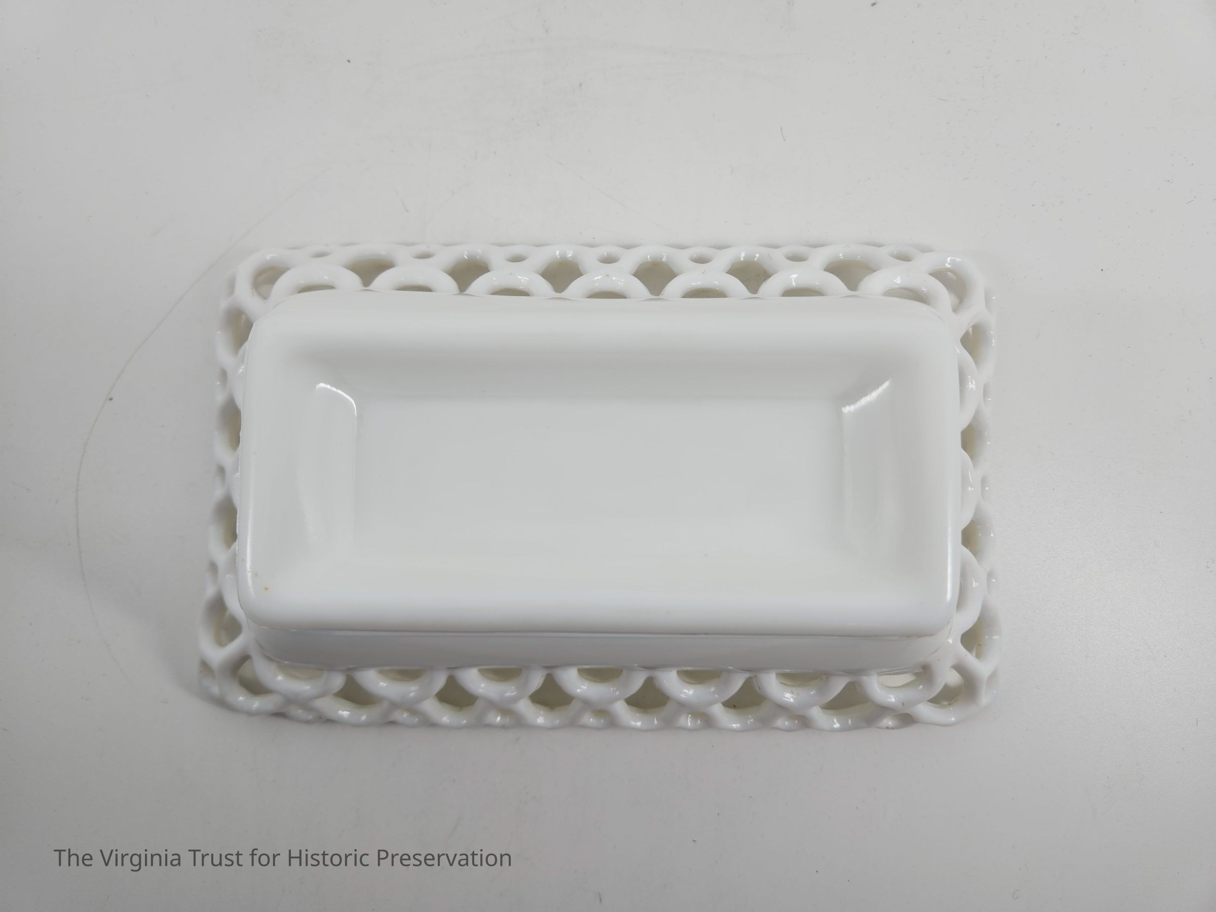 White milk glass footed square tray. Lacey edge basket design around the edge. Corresponding lid (2015.016 A).