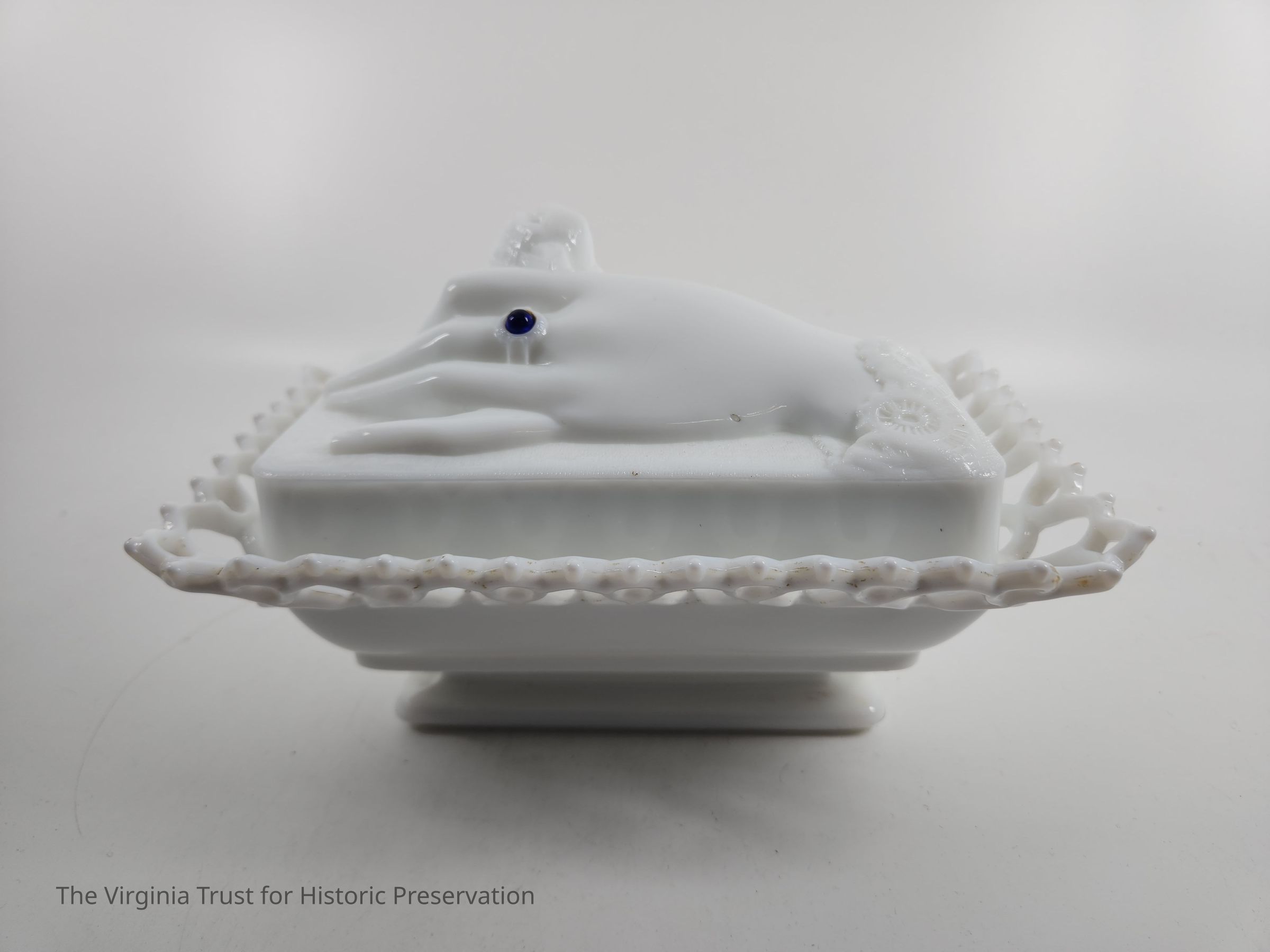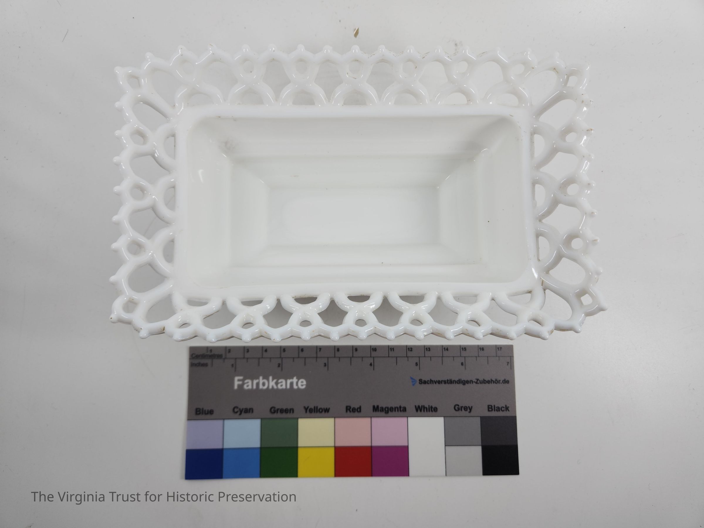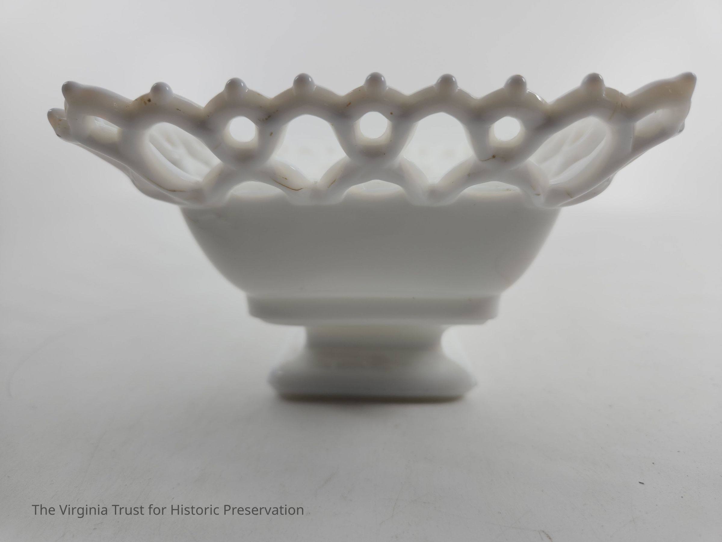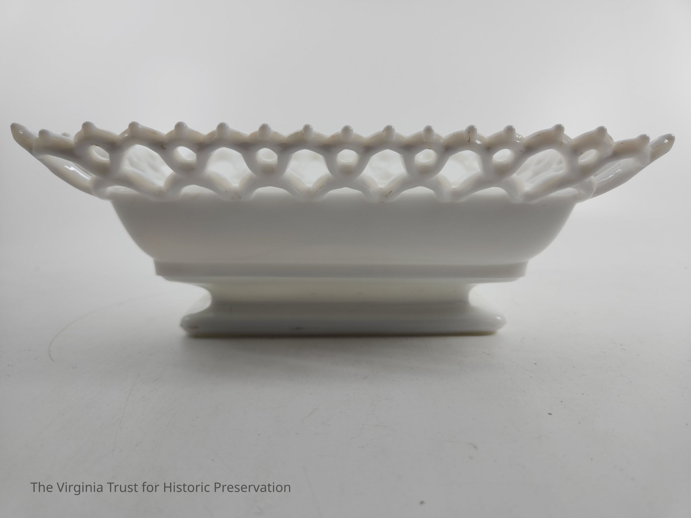 White milk glass footed square tray. Lacey edge basket design around the edge. Corresponding lid (2015.016 A).