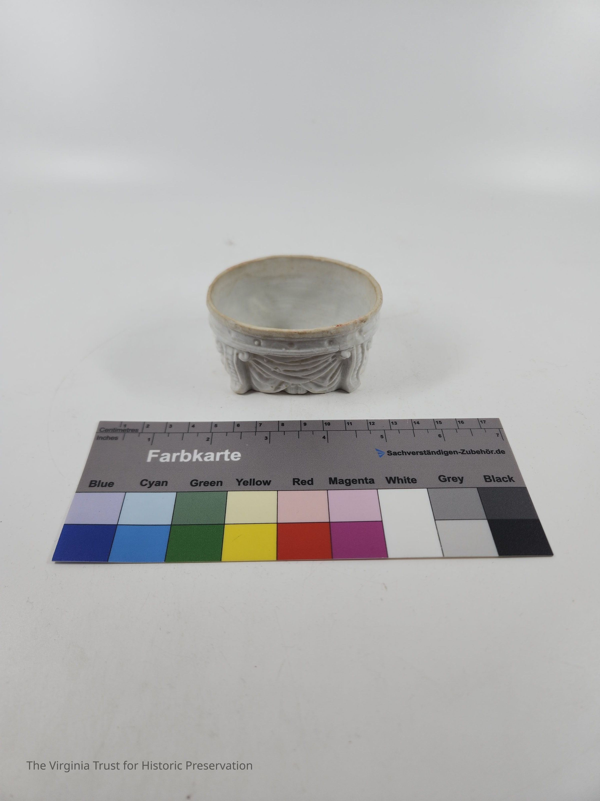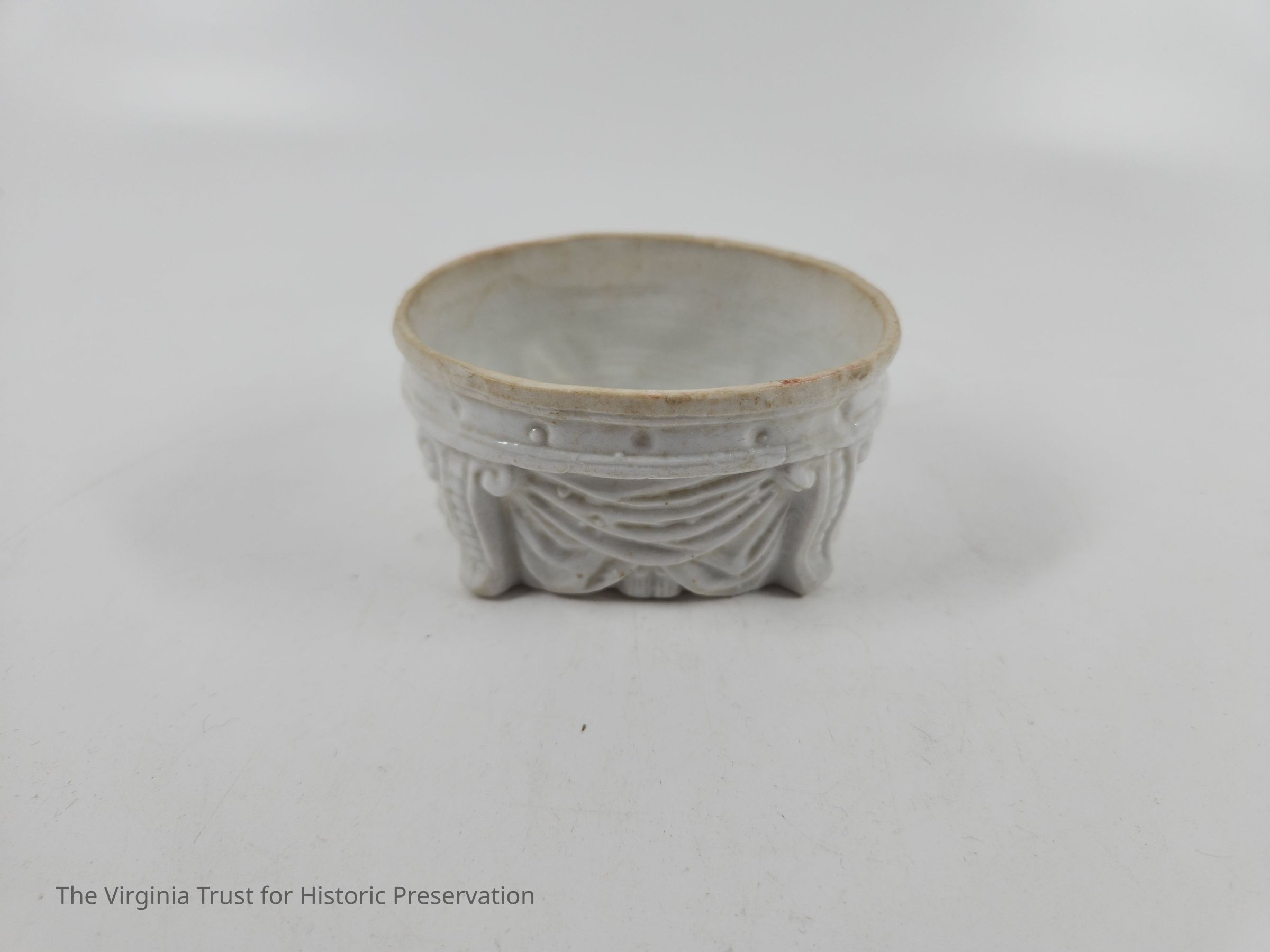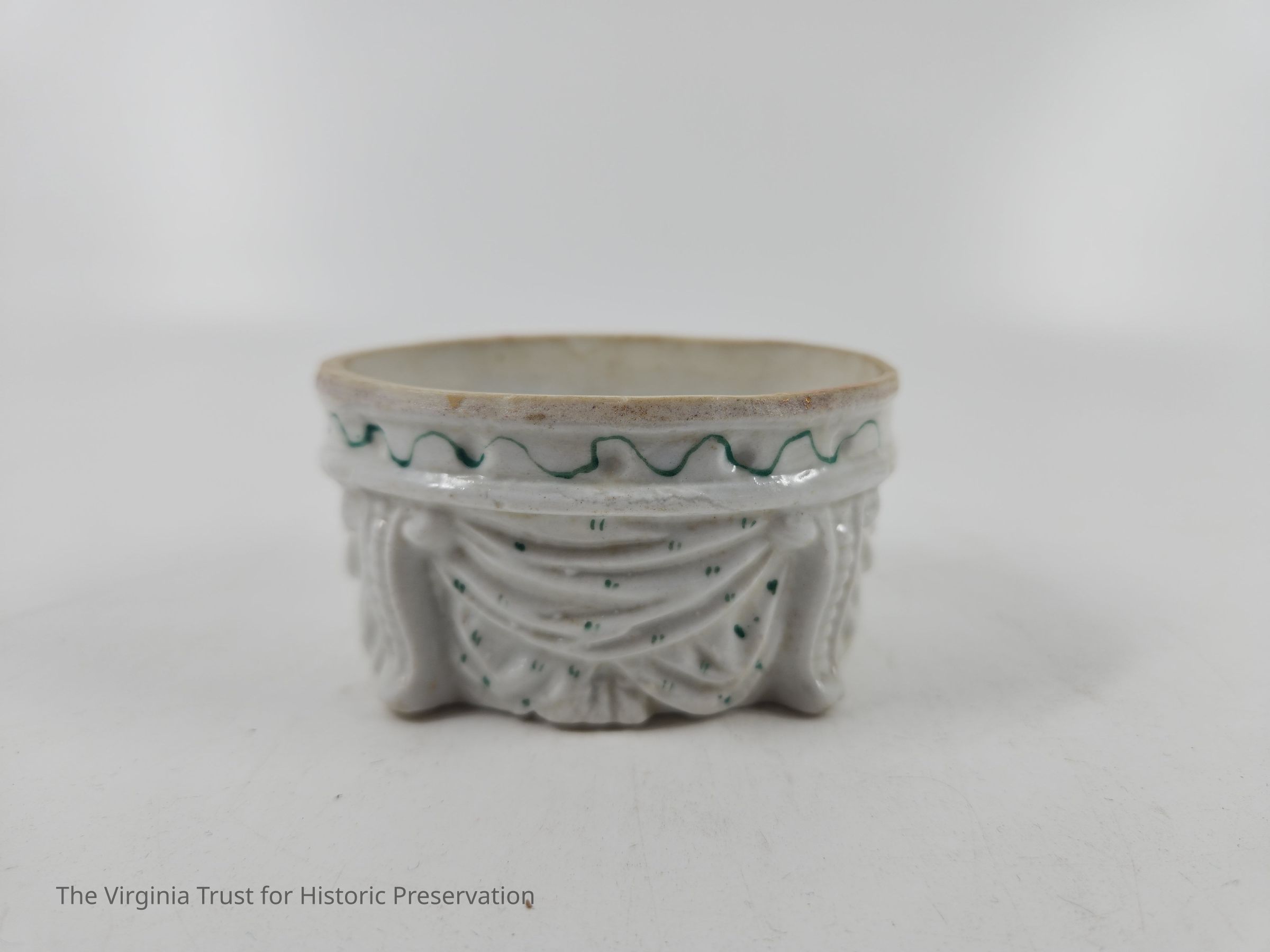Molded milk glass salt cellar. Four beaded legs with draped textile decoration in between with tassles. Though there are green markings on the form, it is unlikely this is original. Rim retains traces of gilding.Dimensions